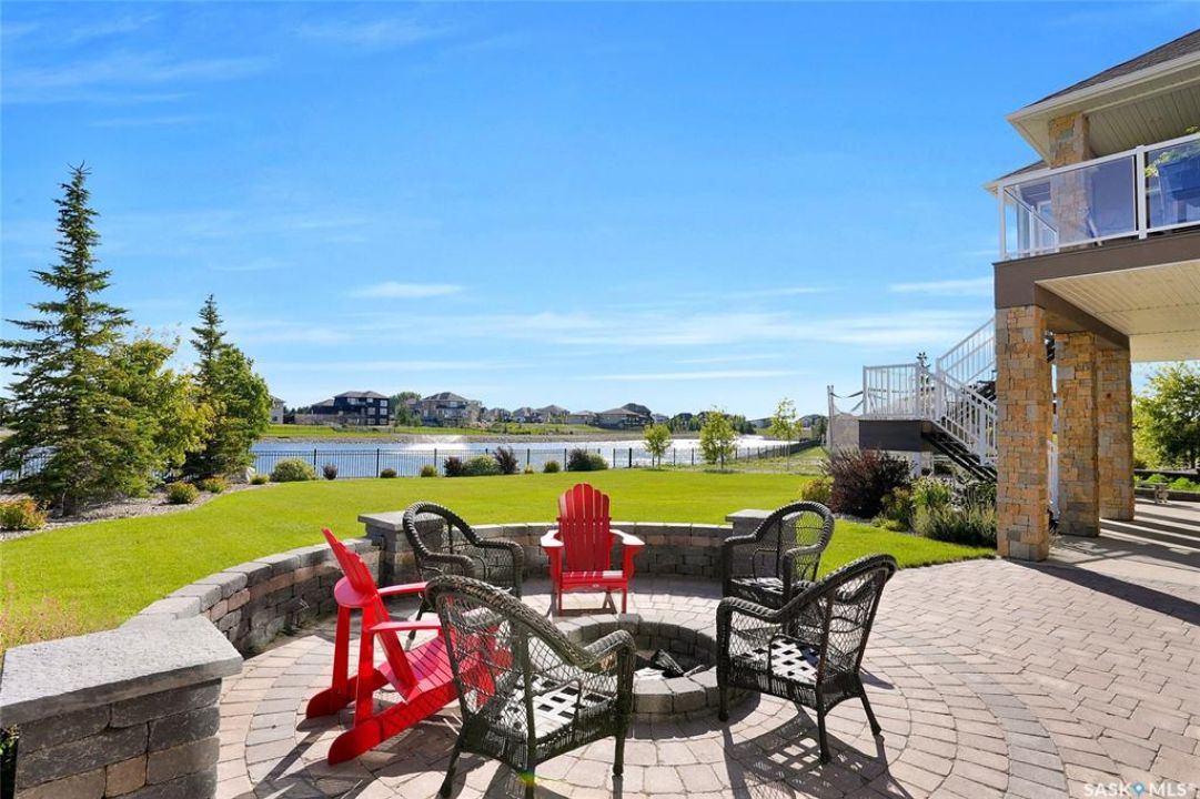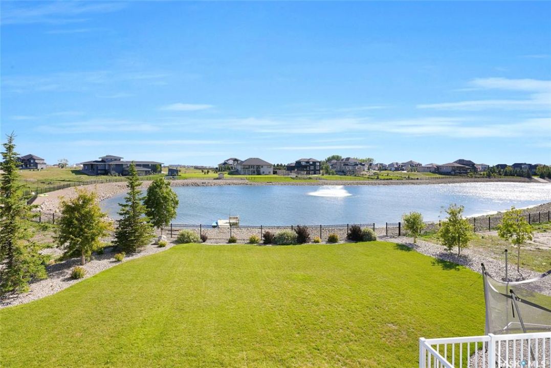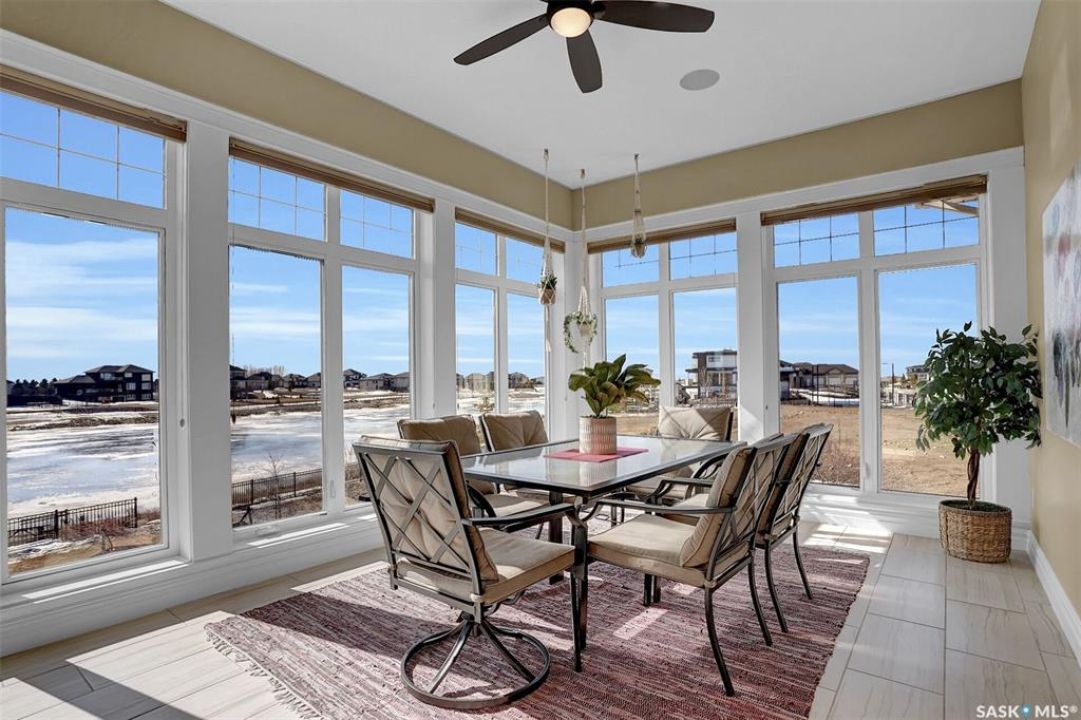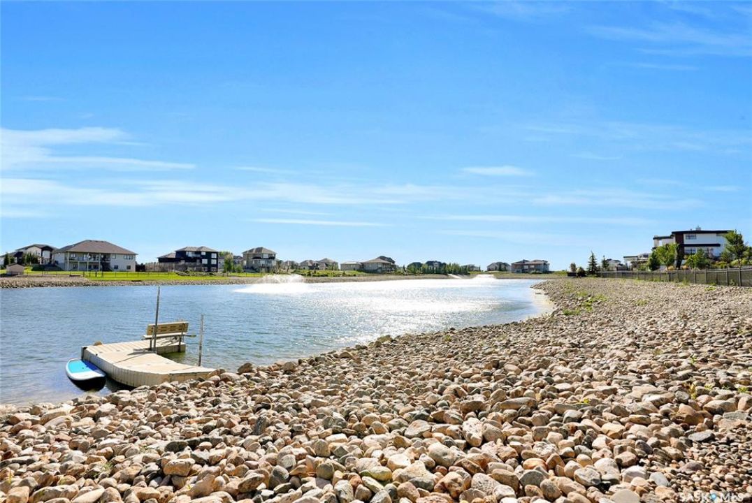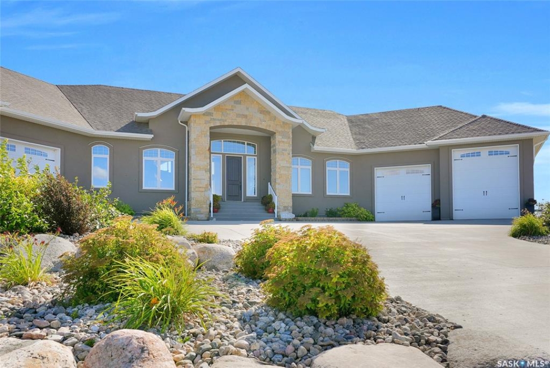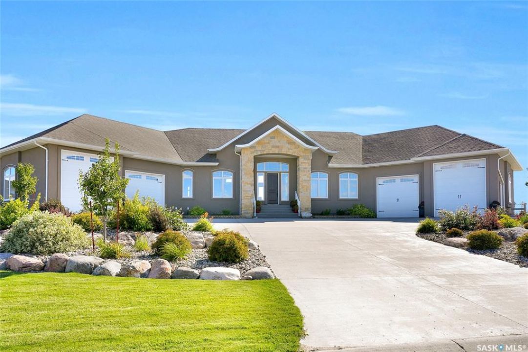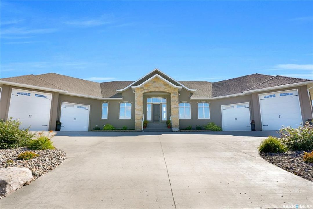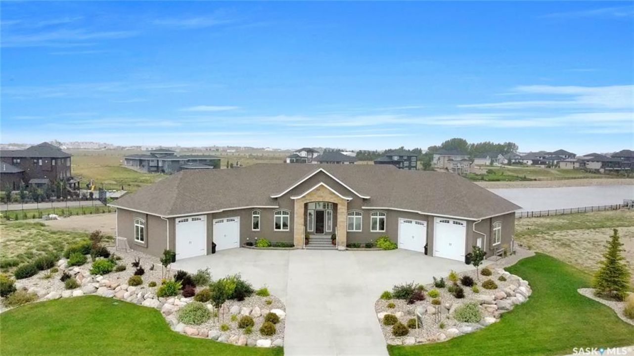 This extraordinary custom built walkout bungalow in Spruce Creek Estates has 6,096 sq' of living space, including a 2,926 sq' walkout basement & 244 sq' 3-season sunroom. The grand foyer features herringbone pattern tile and leads to the great room with 19' vaulted ceiling, Tyndall stone gas fireplace and huge southwest-facing windows that showcase stunning views of the professionally landscaped yard and community lake. Hickory hardwoods lead into the dream kitchen with a coffered ceiling, loads of cabinetry, quartz countertops, and a sit-around island with prep sink. Home chefs will adore the Wolf dual fuel 6 burner range and steam oven, Sub-Zero fridge and freezer drawers, 2 Bosch dishwashers, pot filler, & huge walk-in pantry. The sunroom is perfect for relaxing and is connected to the covered deck. The master suite is a private getaway with a separate covered deck, lake view and a spa-like ensuite. The walk-in closet features an island and is conveniently located next to the laundry room. Completing the main level are 2 more bedrooms, a 4-piece bath, a ½ bath (all baths with in-floor heat), a large mudroom with custom lockers and a music room. The walkout level is bright with continuation of the 10' ceilings from upstairs, large windows, in-floor heat, and a gas fireplace. Watch a game while enjoying the walk-up wet bar and beautiful wine room. You'll enjoy doing work in the office with built-in cabinetry and more lake views. When your gym workout is done you can exit directly to the covered patio with space for a future hot tub. Two large bedrooms, a 4-piece bath, play room, and more complete this amazing walkout level. Garage enthusiasts will love the two 28x32' garages with large overhead doors perfect for boat/RV storage, in-floor heat, hot & cold water, and drain pits to the outside. Also featured throughout the home are Hunter Douglas blinds and Savant home automation. Your oasis awaits, and it's only 22 minutes from downtown Regina.
