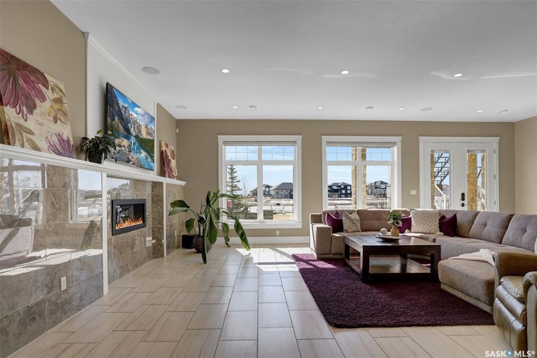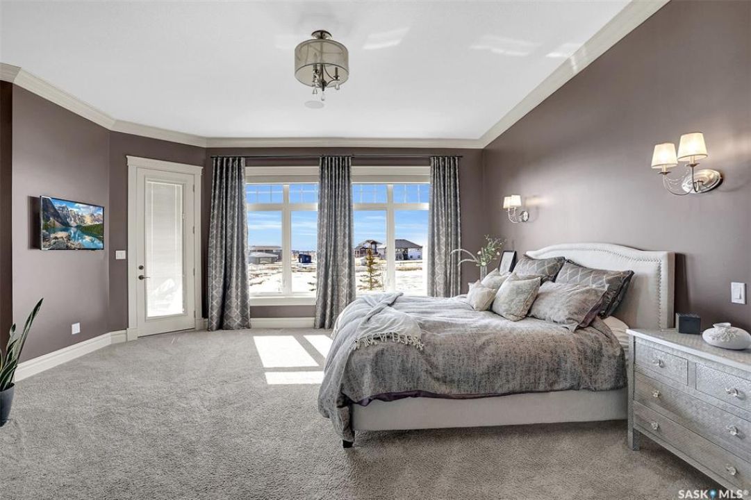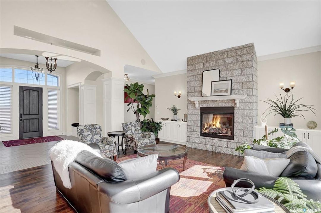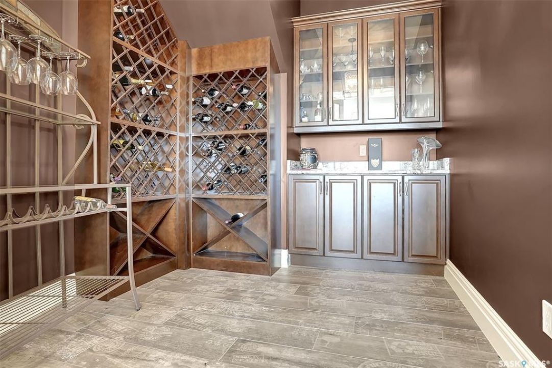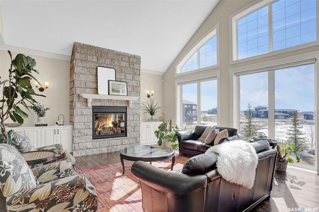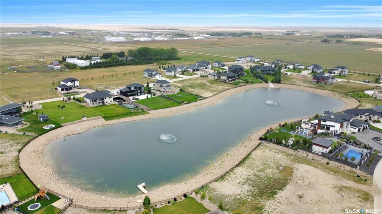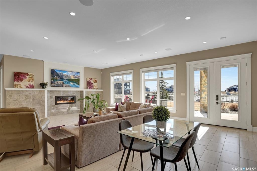 This extraordinary custom built walkout bungalow in Spruce Creek Estates has 6,096 sq' of living space, including a 2,926 sq' walkout basement & 244 sq' 3-season sunroom. The grand foyer features herringbone pattern tile and leads to the great room with 19' vaulted ceiling, Tyndall stone gas fireplace and huge southwest-facing windows that showcase stunning views of the professionally landscaped yard and community lake. Hickory hardwoods lead into the dream kitchen with a coffered ceiling, loads of cabinetry, quartz countertops, and a sit-around island with prep sink. Home chefs will adore the Wolf dual fuel 6 burner range and steam oven, Sub-Zero fridge and freezer drawers, 2 Bosch dishwashers, pot filler, & huge walk-in pantry. The sunroom is perfect for relaxing and is connected to the covered deck. The master suite is a private getaway with a separate covered deck, lake view and a spa-like ensuite. The walk-in closet features an island and is conveniently located next to the laundry room. Completing the main level are 2 more bedrooms, a 4-piece bath, a ½ bath (all baths with in-floor heat), a large mudroom with custom lockers and a music room. The walkout level is bright with continuation of the 10' ceilings from upstairs, large windows, in-floor heat, and a gas fireplace. Watch a game while enjoying the walk-up wet bar and beautiful wine room. You'll enjoy doing work in the office with built-in cabinetry and more lake views. When your gym workout is done you can exit directly to the covered patio with space for a future hot tub. Two large bedrooms, a 4-piece bath, play room, and more complete this amazing walkout level. Garage enthusiasts will love the two 28x32' garages with large overhead doors perfect for boat/RV storage, in-floor heat, hot & cold water, and drain pits to the outside. Also featured throughout the home are Hunter Douglas blinds and Savant home automation. Your oasis awaits, and it's only 22 minutes from downtown Regina.