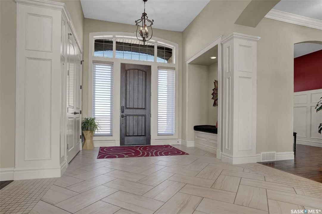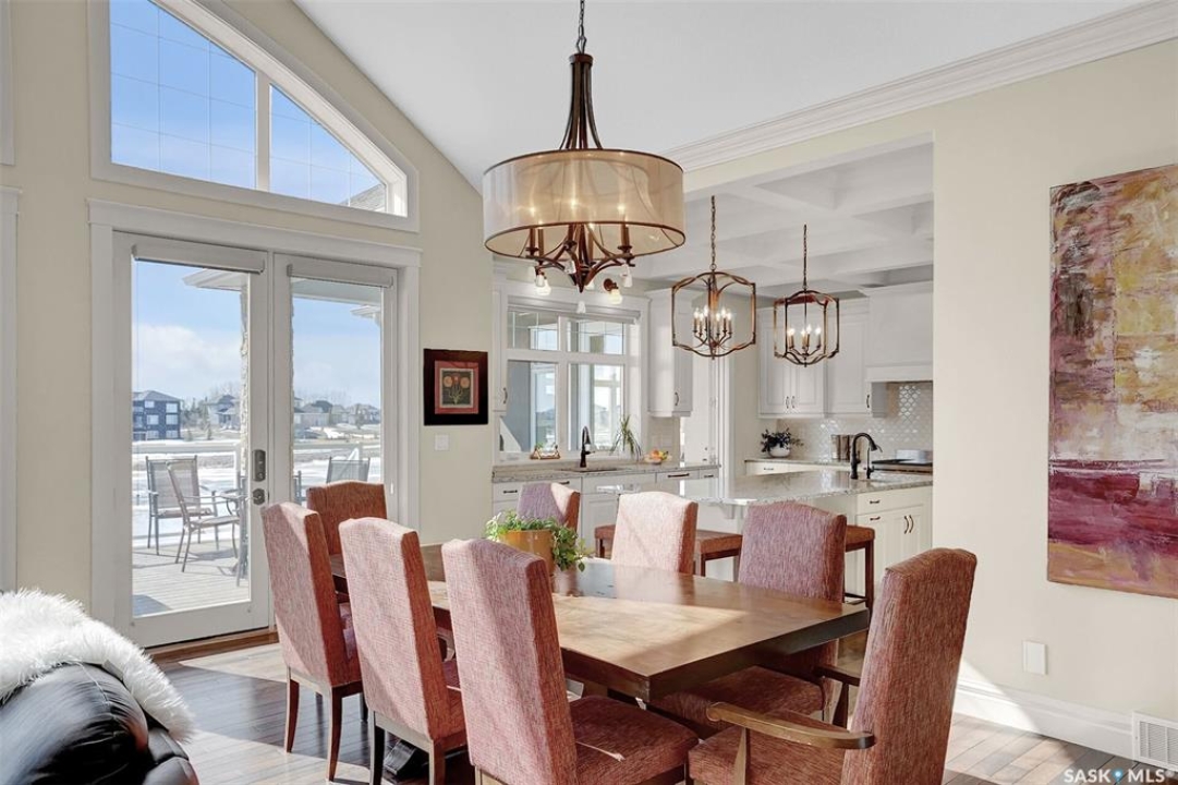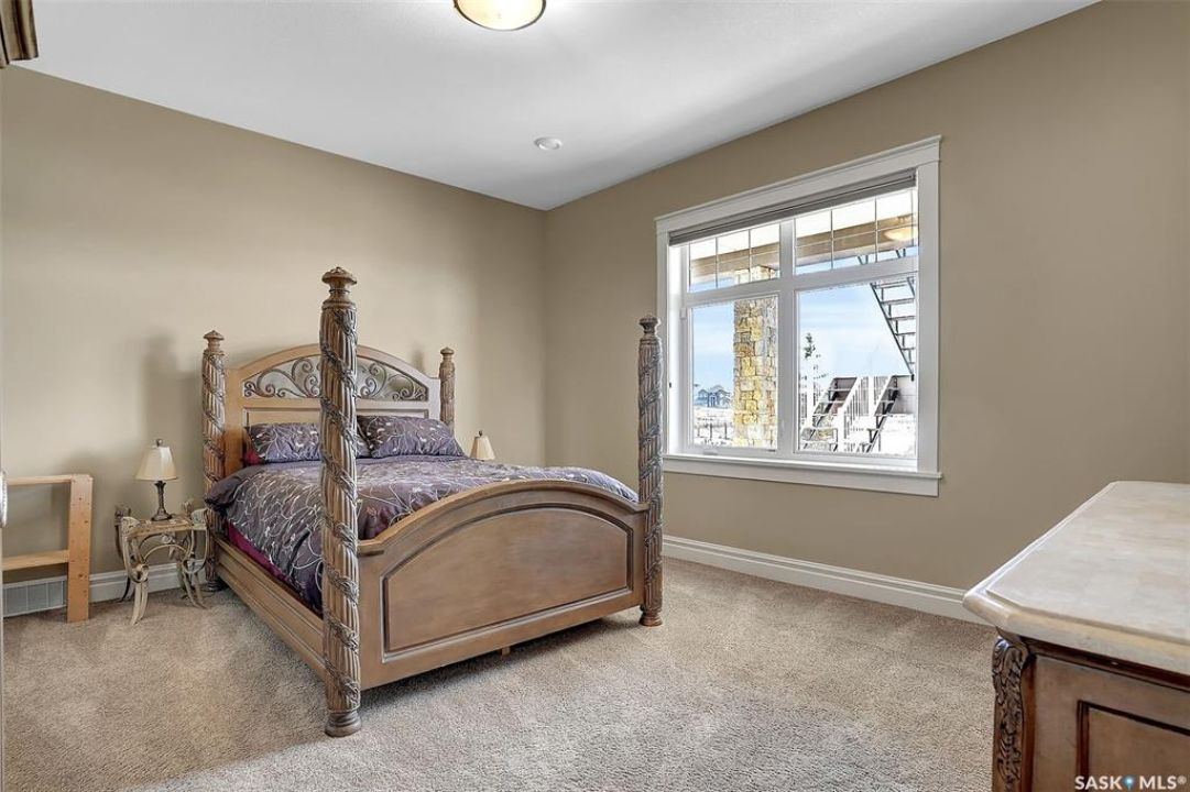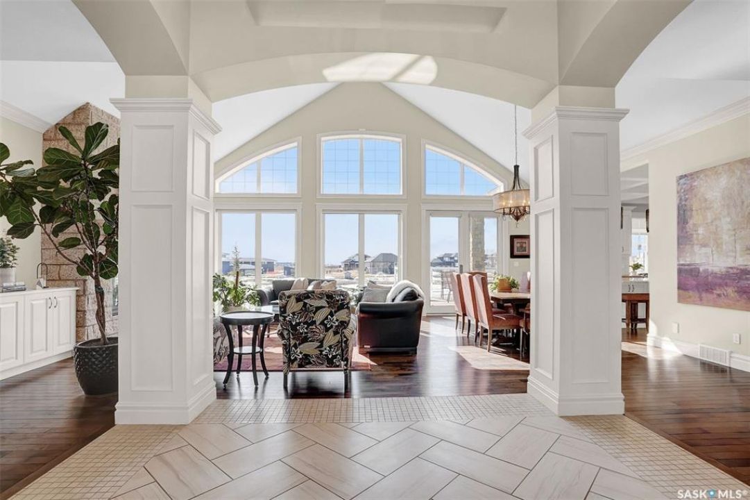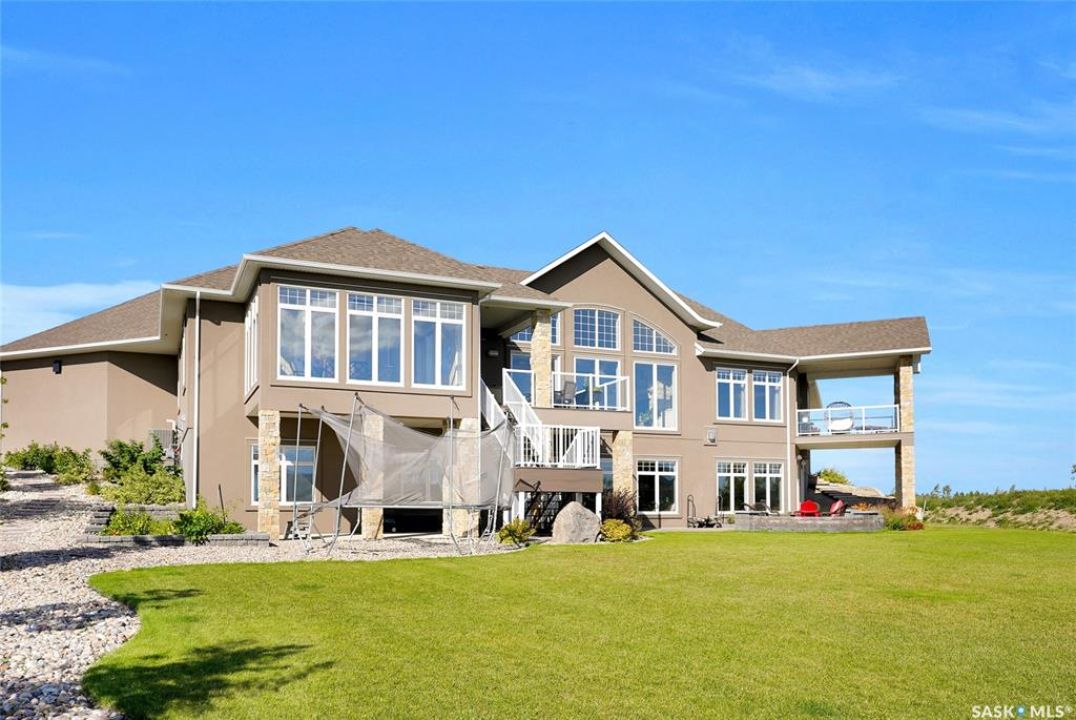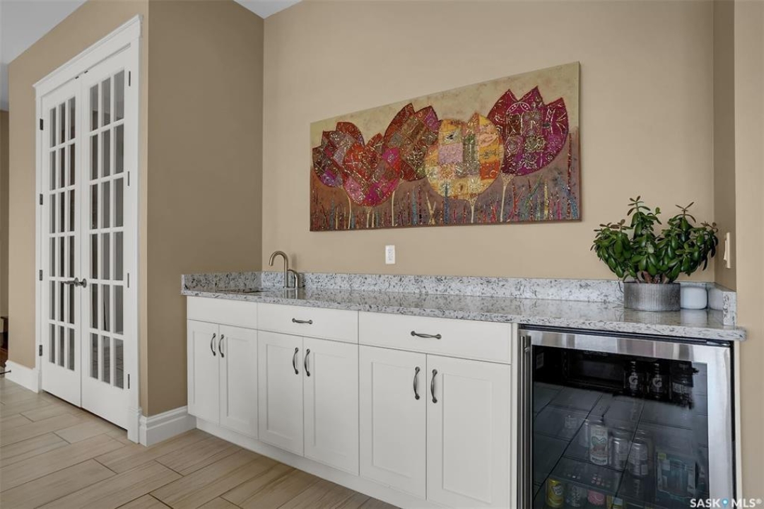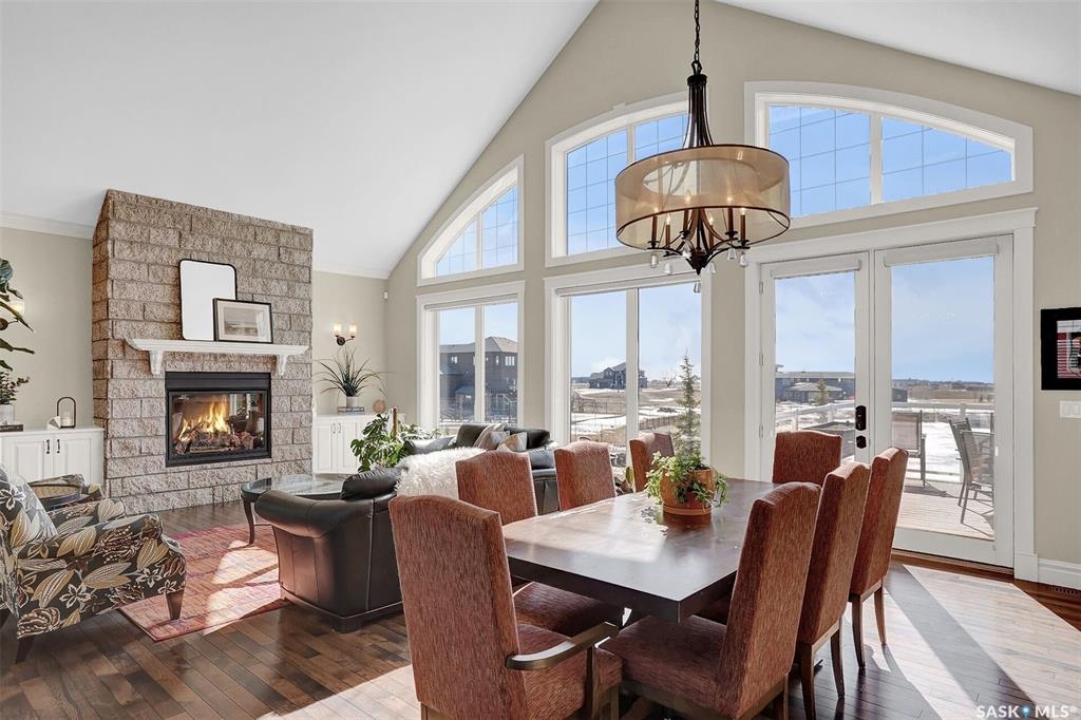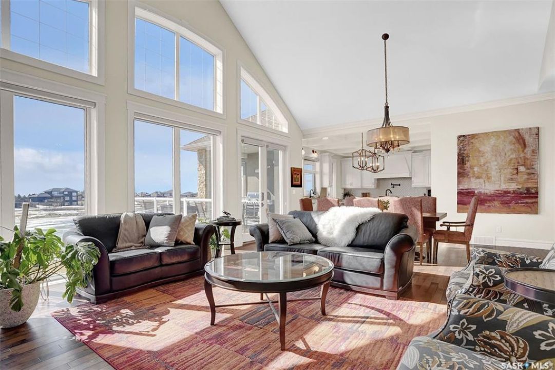 This extraordinary custom built walkout bungalow in Spruce Creek Estates has 6,096 sq' of living space, including a 2,926 sq' walkout basement & 244 sq' 3-season sunroom. The grand foyer features herringbone pattern tile and leads to the great room with 19' vaulted ceiling, Tyndall stone gas fireplace and huge southwest-facing windows that showcase stunning views of the professionally landscaped yard and community lake. Hickory hardwoods lead into the dream kitchen with a coffered ceiling, loads of cabinetry, quartz countertops, and a sit-around island with prep sink. Home chefs will adore the Wolf dual fuel 6 burner range and steam oven, Sub-Zero fridge and freezer drawers, 2 Bosch dishwashers, pot filler, & huge walk-in pantry. The sunroom is perfect for relaxing and is connected to the covered deck. The master suite is a private getaway with a separate covered deck, lake view and a spa-like ensuite. The walk-in closet features an island and is conveniently located next to the laundry room. Completing the main level are 2 more bedrooms, a 4-piece bath, a ½ bath (all baths with in-floor heat), a large mudroom with custom lockers and a music room. The walkout level is bright with continuation of the 10' ceilings from upstairs, large windows, in-floor heat, and a gas fireplace. Watch a game while enjoying the walk-up wet bar and beautiful wine room. You'll enjoy doing work in the office with built-in cabinetry and more lake views. When your gym workout is done you can exit directly to the covered patio with space for a future hot tub. Two large bedrooms, a 4-piece bath, play room, and more complete this amazing walkout level. Garage enthusiasts will love the two 28x32' garages with large overhead doors perfect for boat/RV storage, in-floor heat, hot & cold water, and drain pits to the outside. Also featured throughout the home are Hunter Douglas blinds and Savant home automation. Your oasis awaits, and it's only 22 minutes from downtown Regina.