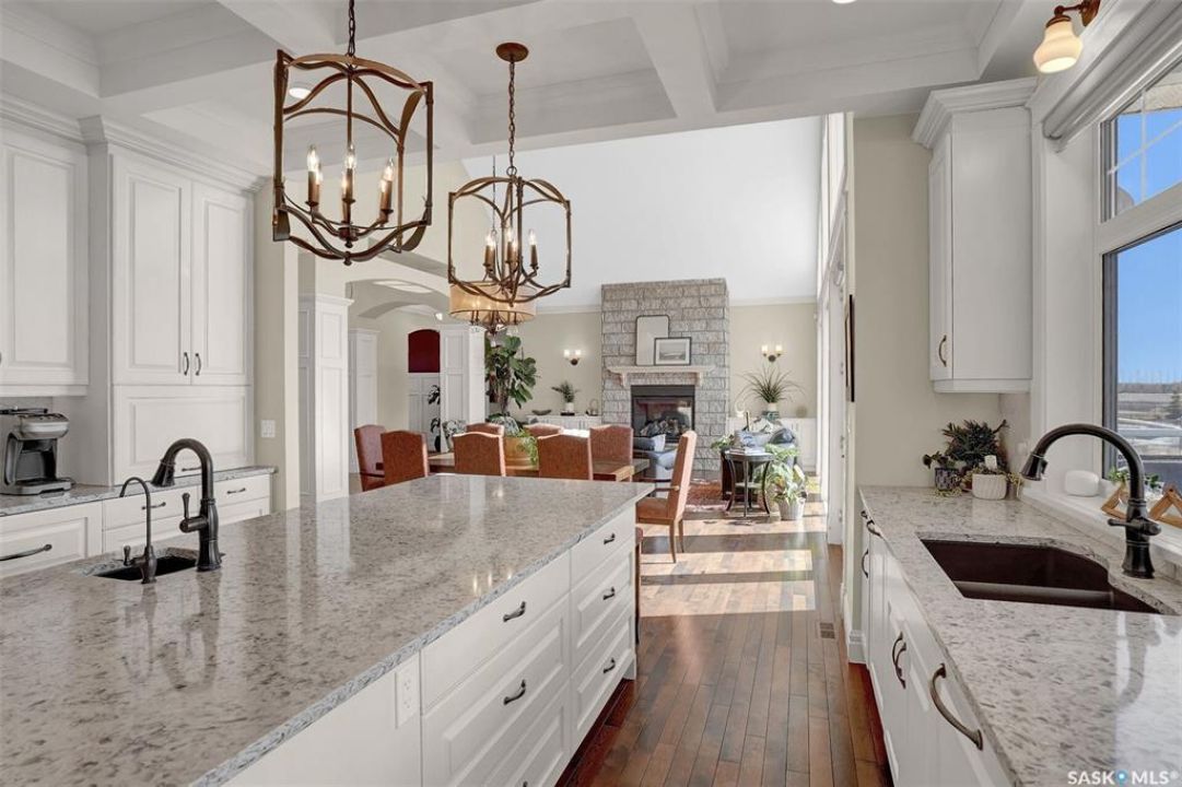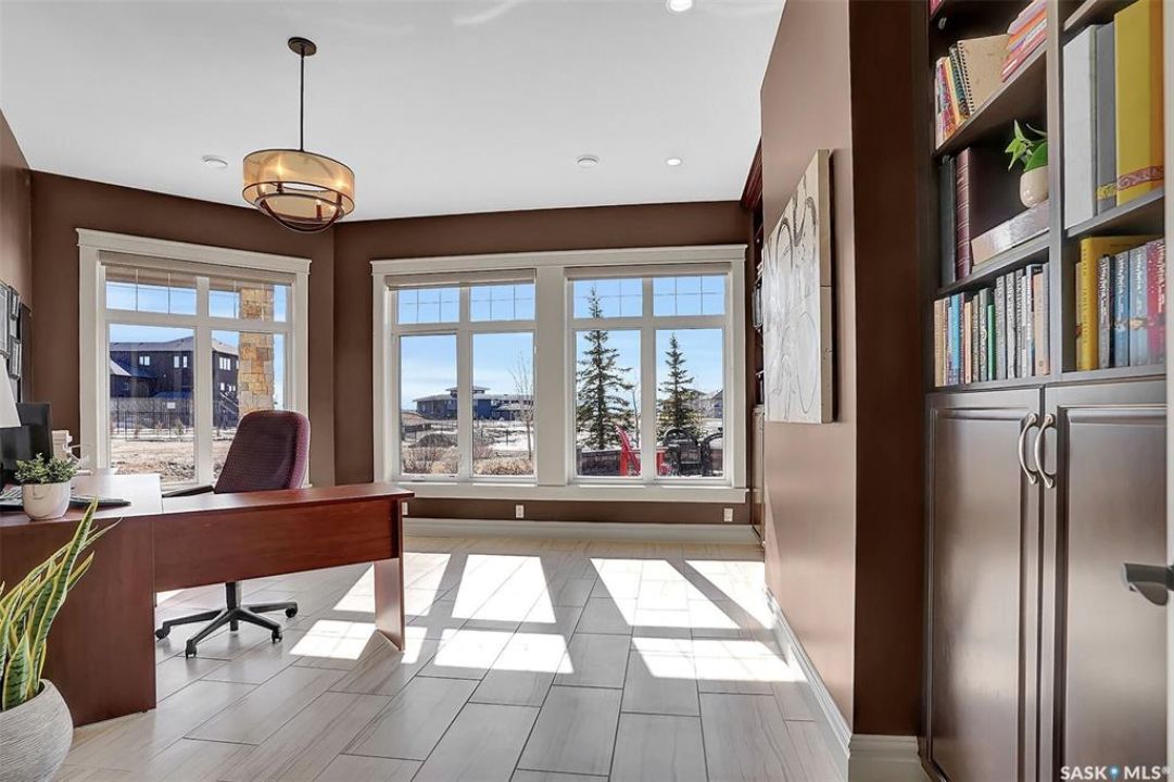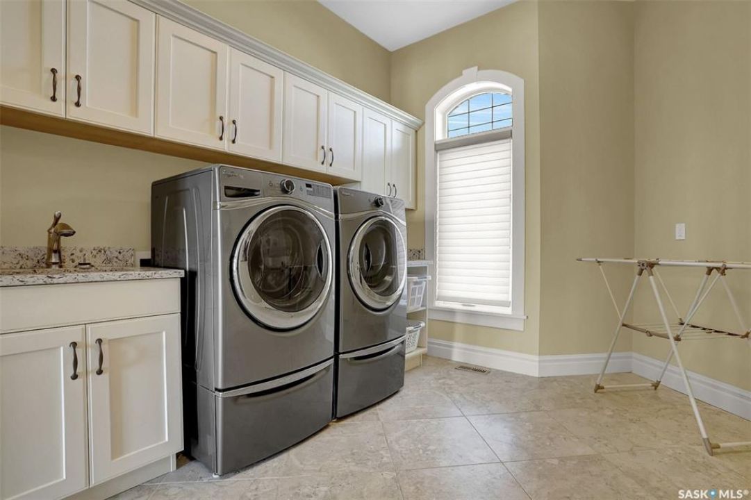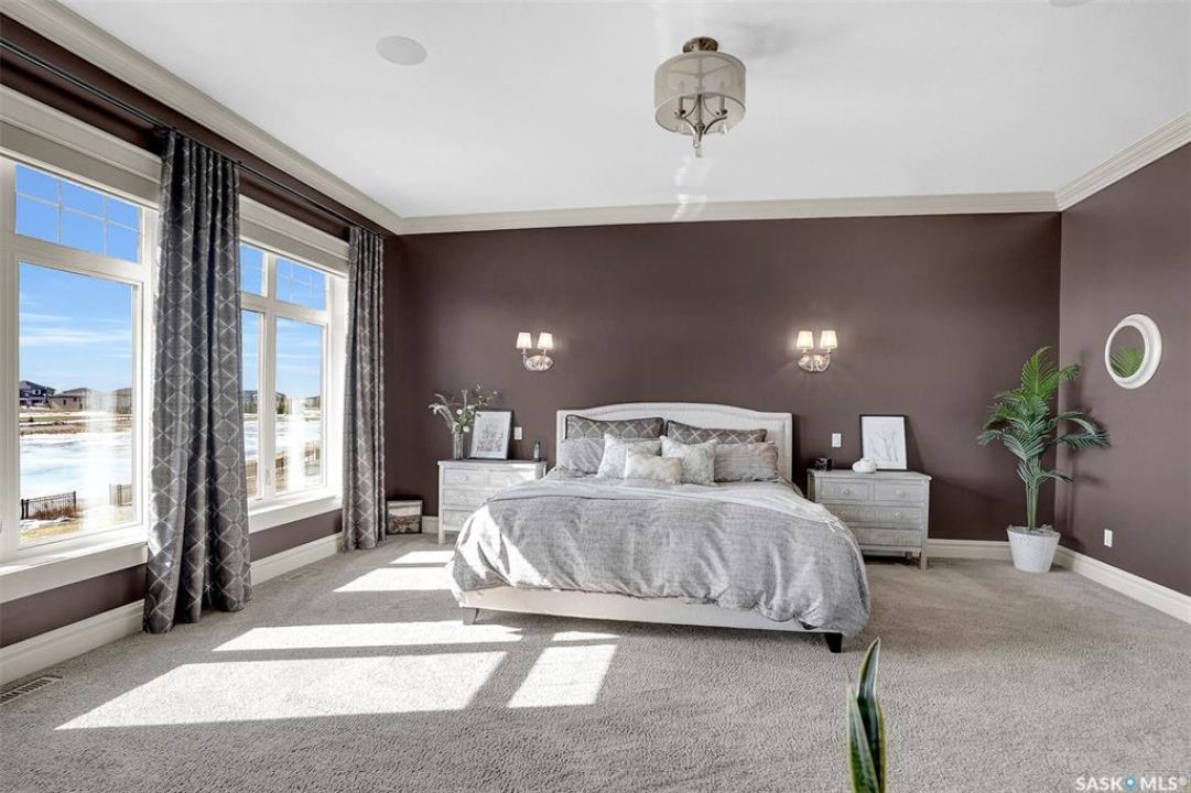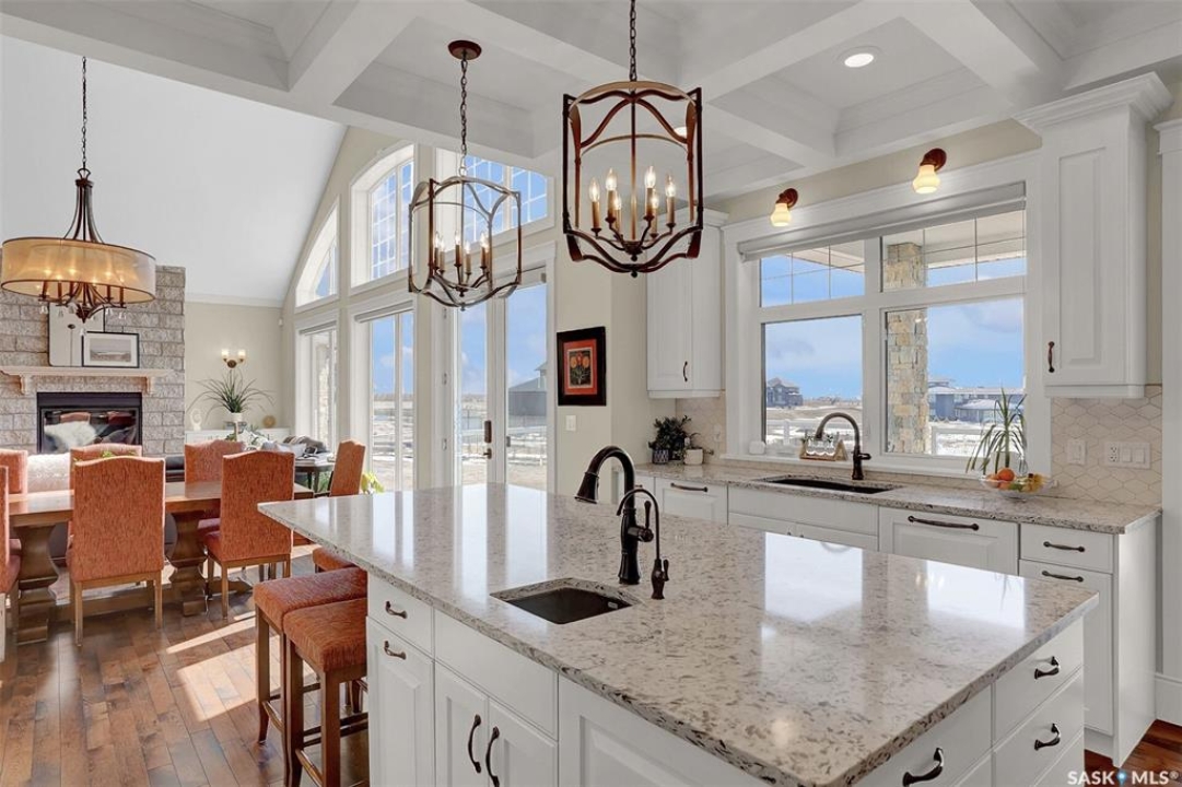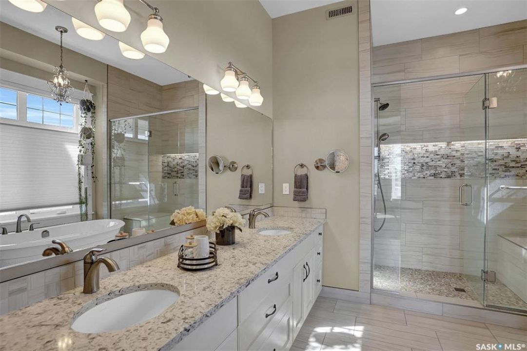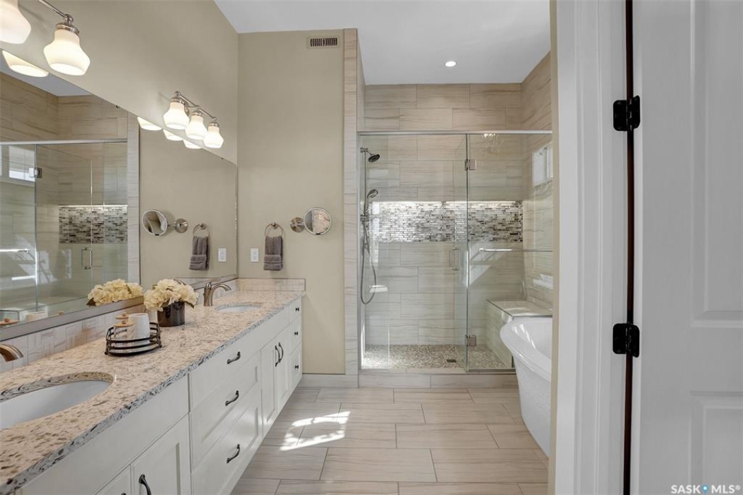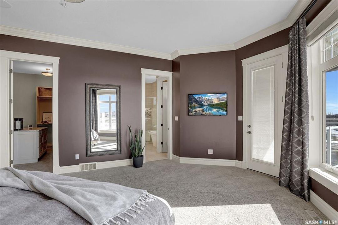This extraordinary custom built walkout bungalow in Spruce Creek Estates has 6,096 sq' of living space, including a 2,926 sq' walkout basement & 244 sq' 3-season sunroom. The grand foyer features herringbone pattern tile and leads to the great room with 19' vaulted ceiling, Tyndall stone gas fireplace and huge southwest-facing windows that showcase stunning views of the professionally landscaped yard and community lake. Hickory hardwoods lead into the dream kitchen with a coffered ceiling, loads of cabinetry, quartz countertops, and a sit-around island with prep sink. Home chefs will adore the Wolf dual fuel 6 burner range and steam oven, Sub-Zero fridge and freezer drawers, 2 Bosch dishwashers, pot filler, & huge walk-in pantry. The sunroom is perfect for relaxing and is connected to the covered deck. The master suite is a private getaway with a separate covered deck, lake view and a spa-like ensuite. The walk-in closet features an island and is conveniently located next to the laundry room. Completing the main level are 2 more bedrooms, a 4-piece bath, a ½ bath (all baths with in-floor heat), a large mudroom with custom lockers and a music room. The walkout level is bright with continuation of the 10' ceilings from upstairs, large windows, in-floor heat, and a gas fireplace. Watch a game while enjoying the walk-up wet bar and beautiful wine room. You'll enjoy doing work in the office with built-in cabinetry and more lake views. When your gym workout is done you can exit directly to the covered patio with space for a future hot tub. Two large bedrooms, a 4-piece bath, play room, and more complete this amazing walkout level. Garage enthusiasts will love the two 28x32' garages with large overhead doors perfect for boat/RV storage, in-floor heat, hot & cold water, and drain pits to the outside. Also featured throughout the home are Hunter Douglas blinds and Savant home automation. Your oasis awaits, and it's only 22 minutes from downtown Regina.