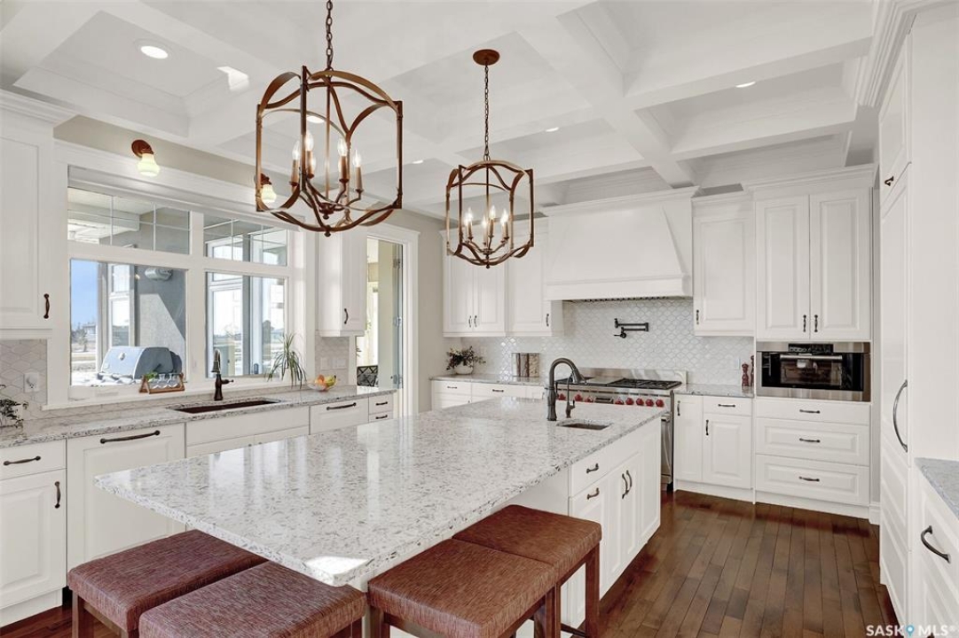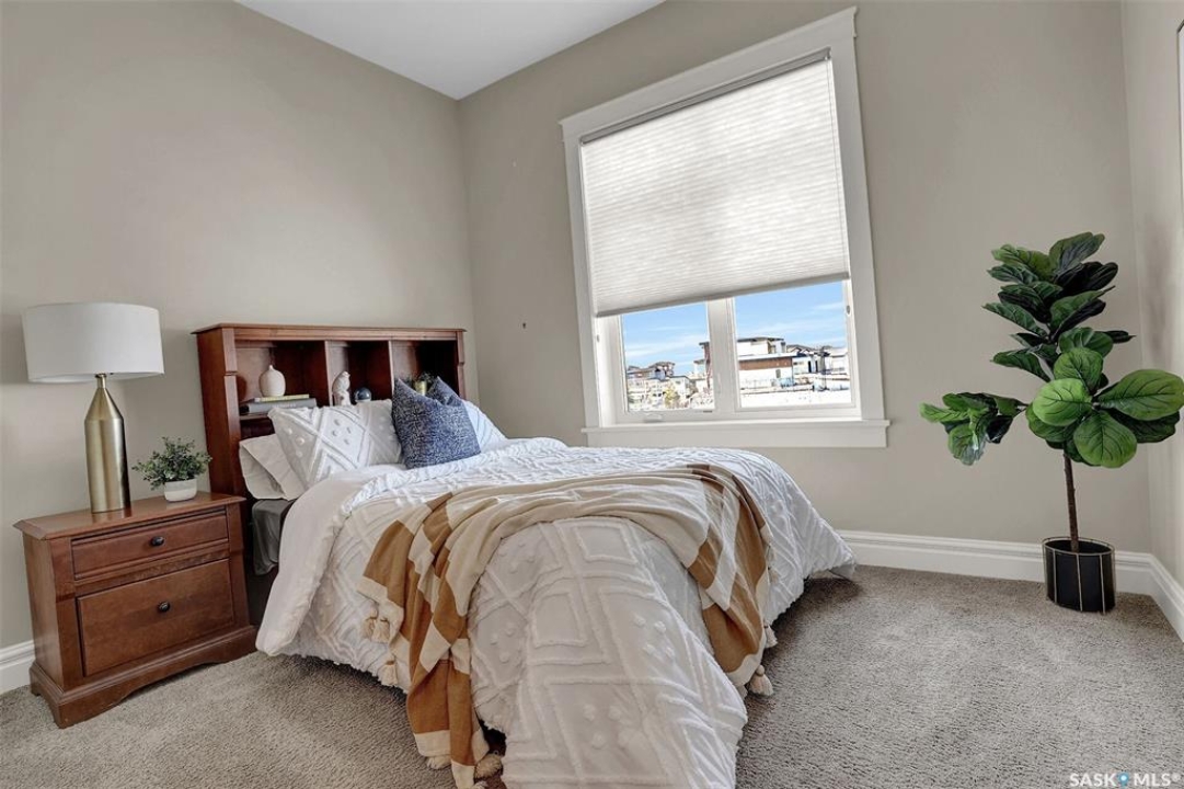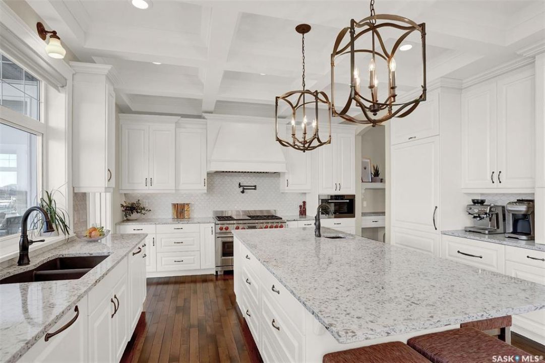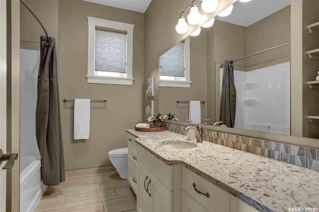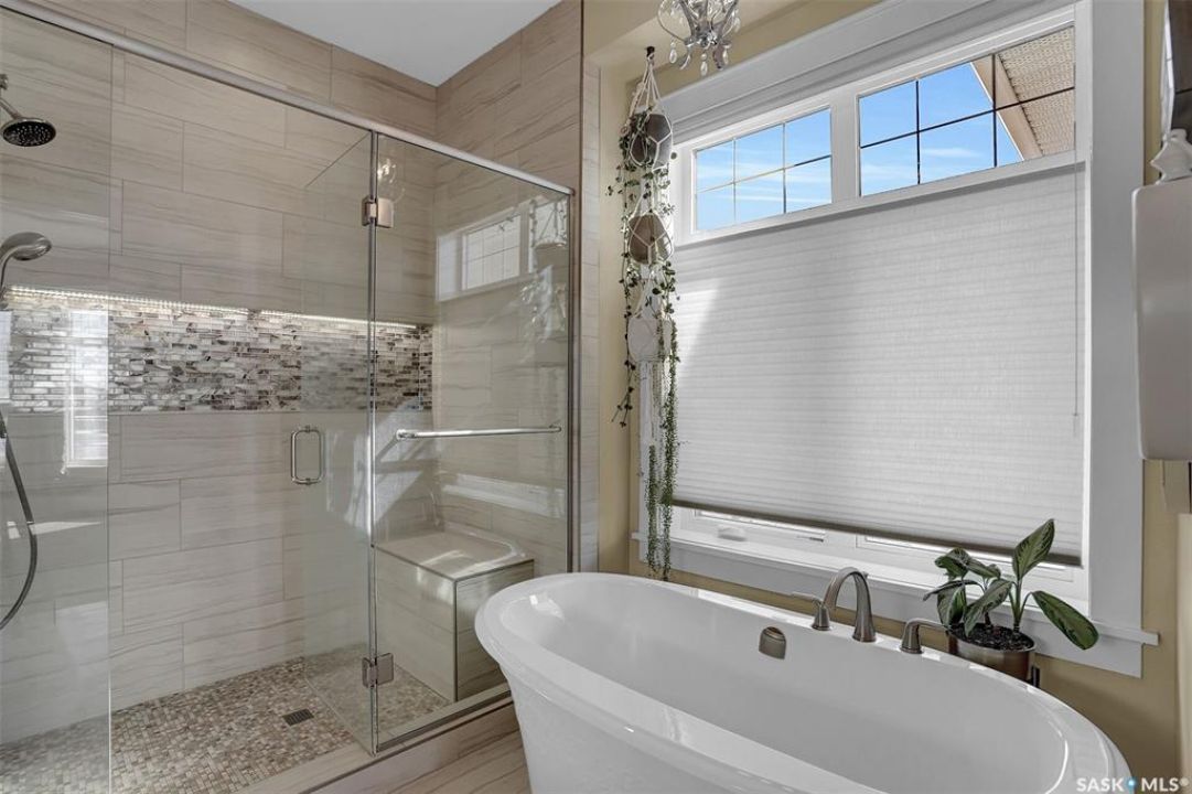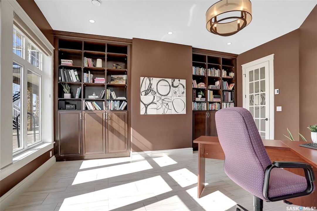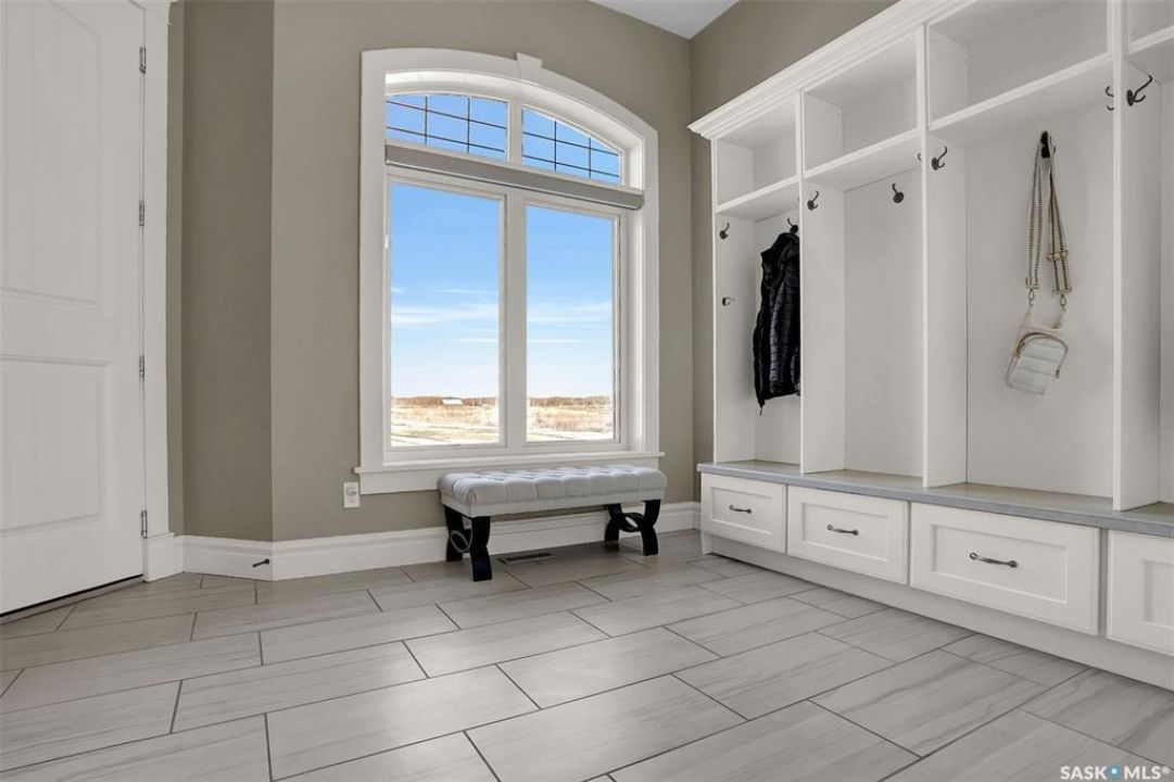 This extraordinary custom built walkout bungalow in Spruce Creek Estates has 6,096 sq' of living space, including a 2,926 sq' walkout basement & 244 sq' 3-season sunroom. The grand foyer features herringbone pattern tile and leads to the great room with 19' vaulted ceiling, Tyndall stone gas fireplace and huge southwest-facing windows that showcase stunning views of the professionally landscaped yard and community lake. Hickory hardwoods lead into the dream kitchen with a coffered ceiling, loads of cabinetry, quartz countertops, and a sit-around island with prep sink. Home chefs will adore the Wolf dual fuel 6 burner range and steam oven, Sub-Zero fridge and freezer drawers, 2 Bosch dishwashers, pot filler, & huge walk-in pantry. The sunroom is perfect for relaxing and is connected to the covered deck. The master suite is a private getaway with a separate covered deck, lake view and a spa-like ensuite. The walk-in closet features an island and is conveniently located next to the laundry room. Completing the main level are 2 more bedrooms, a 4-piece bath, a ½ bath (all baths with in-floor heat), a large mudroom with custom lockers and a music room. The walkout level is bright with continuation of the 10' ceilings from upstairs, large windows, in-floor heat, and a gas fireplace. Watch a game while enjoying the walk-up wet bar and beautiful wine room. You'll enjoy doing work in the office with built-in cabinetry and more lake views. When your gym workout is done you can exit directly to the covered patio with space for a future hot tub. Two large bedrooms, a 4-piece bath, play room, and more complete this amazing walkout level. Garage enthusiasts will love the two 28x32' garages with large overhead doors perfect for boat/RV storage, in-floor heat, hot & cold water, and drain pits to the outside. Also featured throughout the home are Hunter Douglas blinds and Savant home automation. Your oasis awaits, and it's only 22 minutes from downtown Regina.