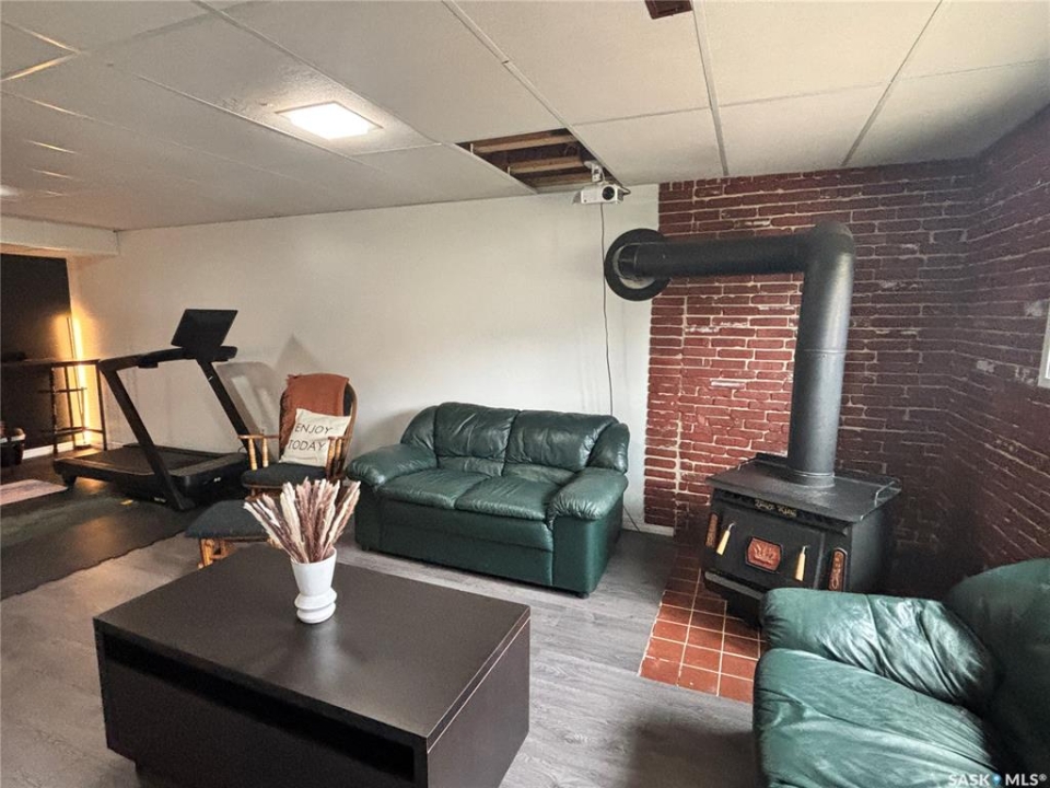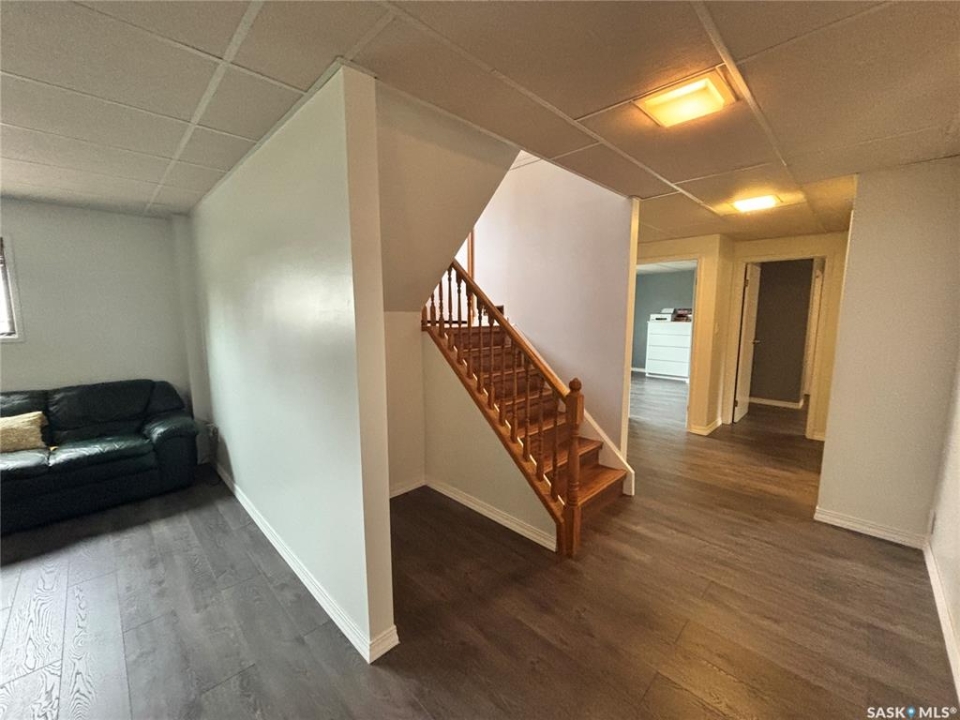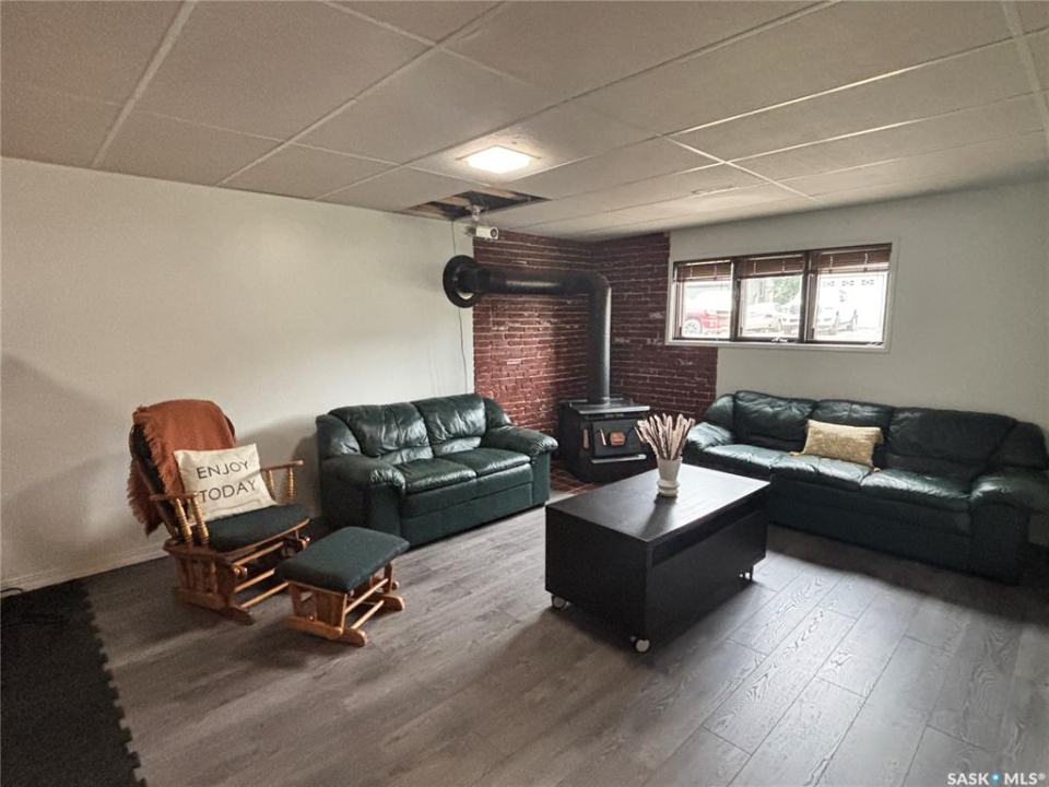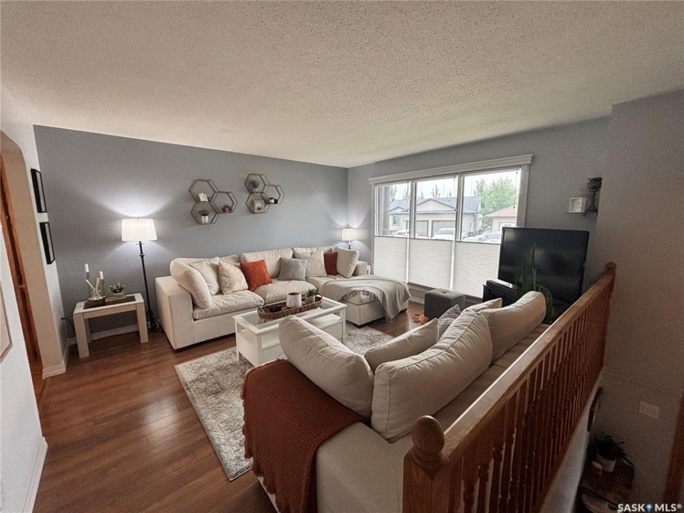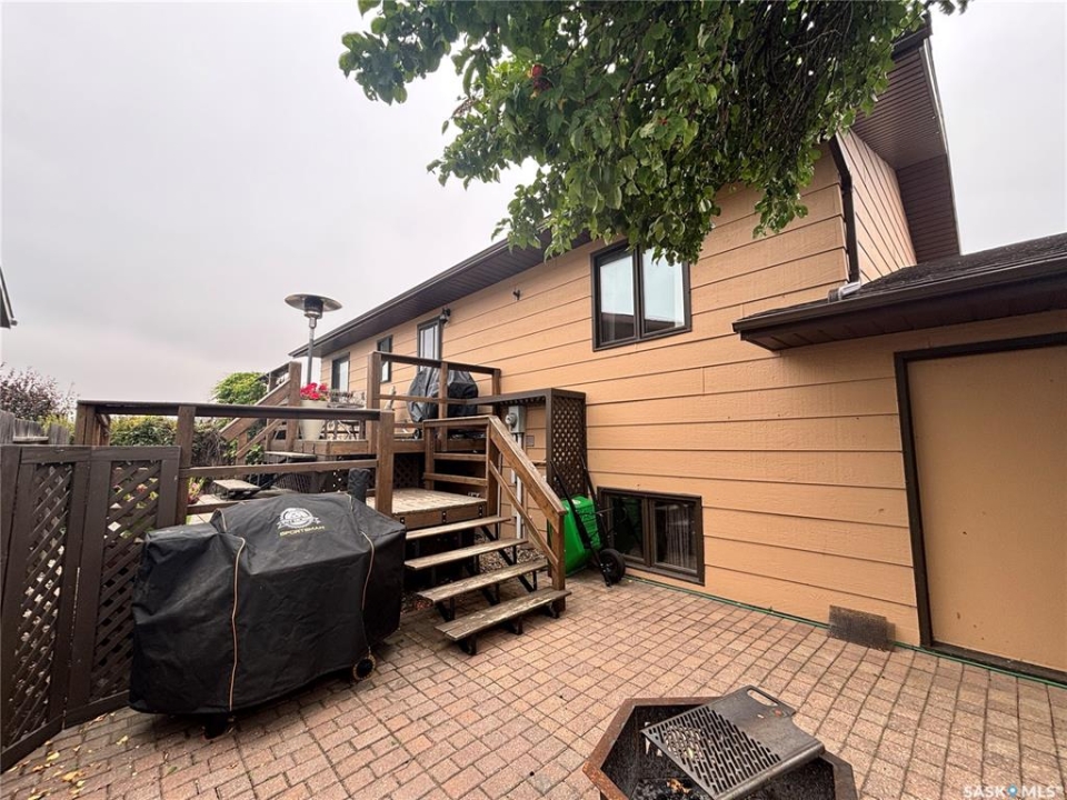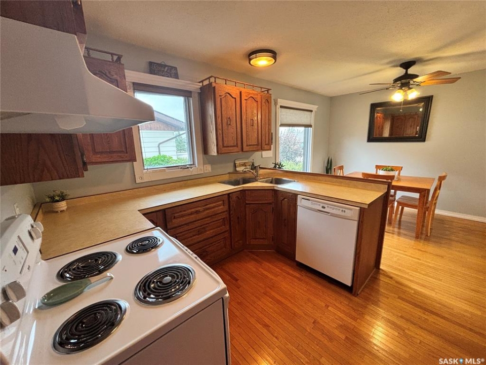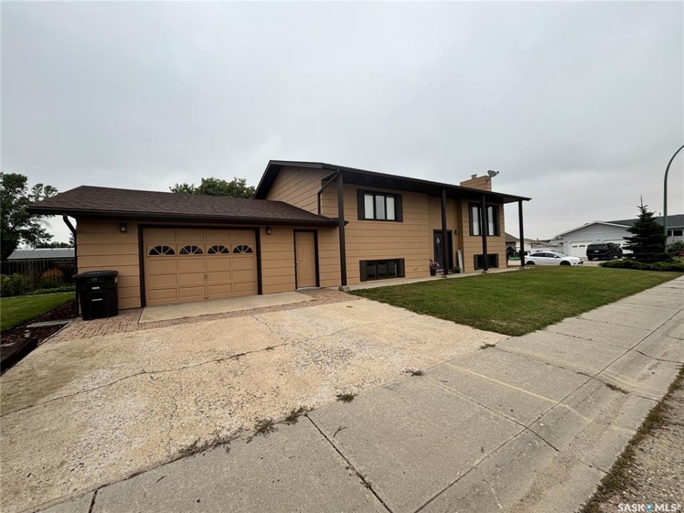 Welcome to this well-maintained bi-level home located in the growing community of Lanigan, Saskatchewan. Nestled on a quiet crescent, this property sits on a desirable corner lot within walking distance to schools and parks—an ideal spot for families. The exterior boasts attractive street appeal with a single attached garage, surrounding green space, a small garden area, and a three-tier deck at the back—perfect for entertaining or enjoying the outdoors. Inside, you're greeted with a spacious entrance that offers the option to go up or downstairs. The main level features a bright living room with large windows, flowing seamlessly into the dining room and kitchen. The kitchen provides plenty of counter and cupboard space with classic oak cabinetry, along with a convenient storage closet off the rear entry—large enough to house a stand-up freezer. Two generously sized bedrooms and a four-piece bath complete the main floor. The primary bedroom includes a unique makeup area that could easily be converted back into a two-piece ensuite for added convenience. A handy laundry chute connects the main bath directly to the basement laundry area. The lower level is designed for comfortable living with large windows that bring in natural light, a spacious family room with a cozy wood-burning fireplace, two additional bedrooms, a three-piece bath, and a laundry/utility room with ample storage. With a thoughtful layout, plenty of storage, and a welcoming neighborhood, this home offers comfort and functionality for a growing family.