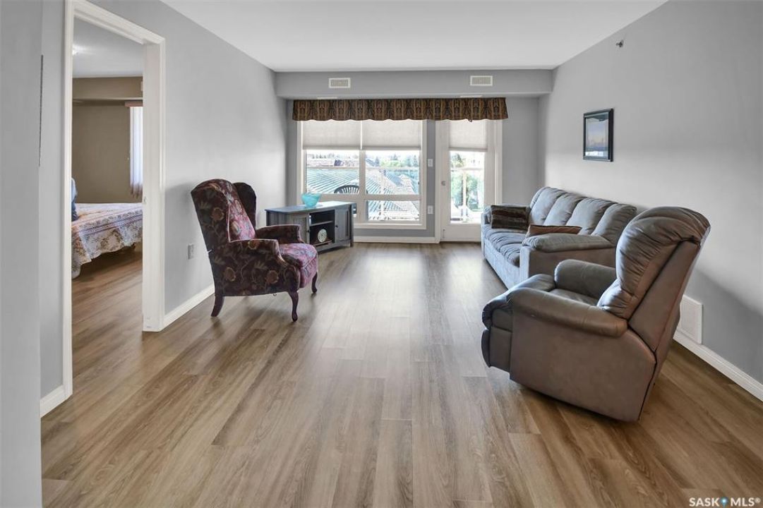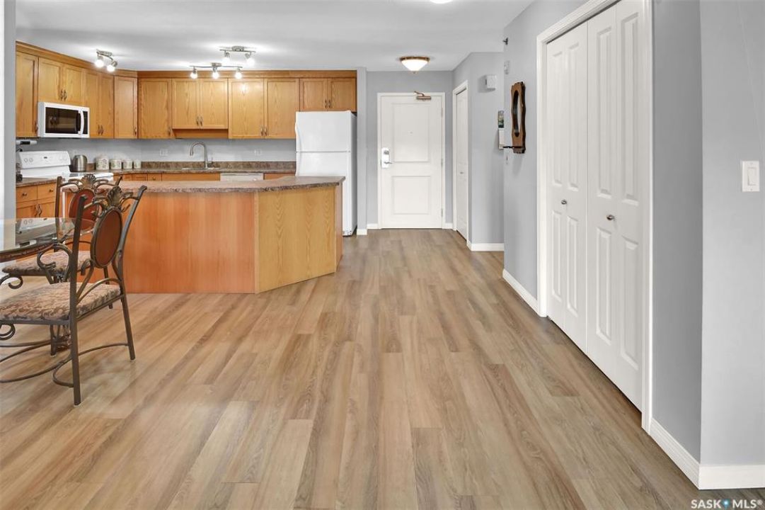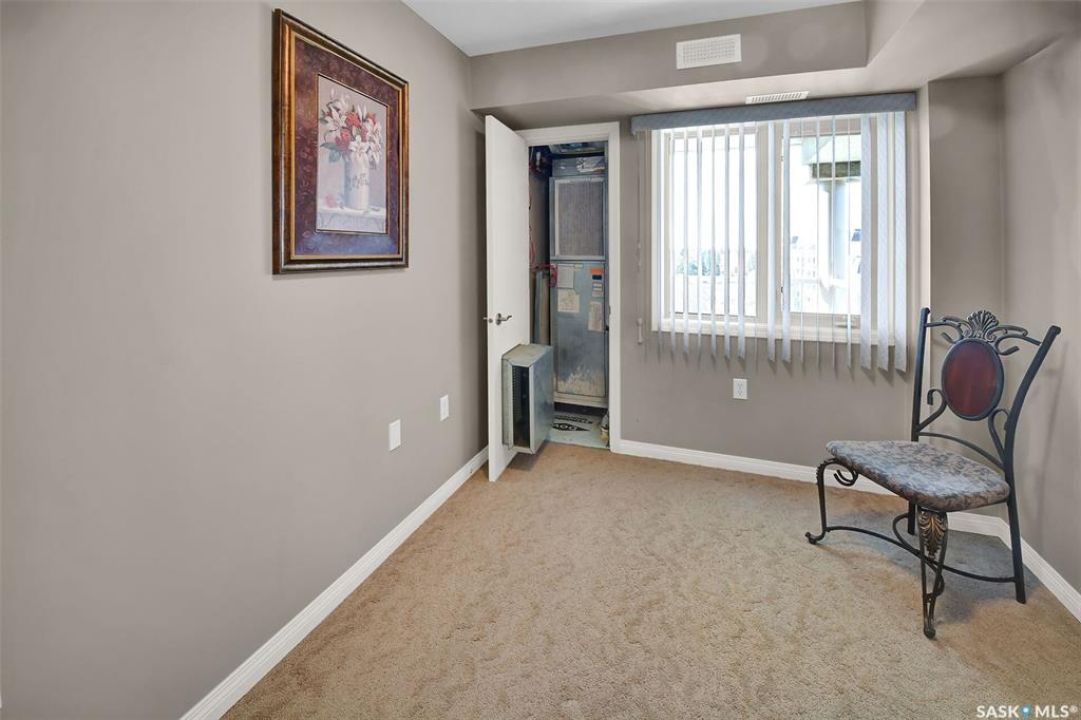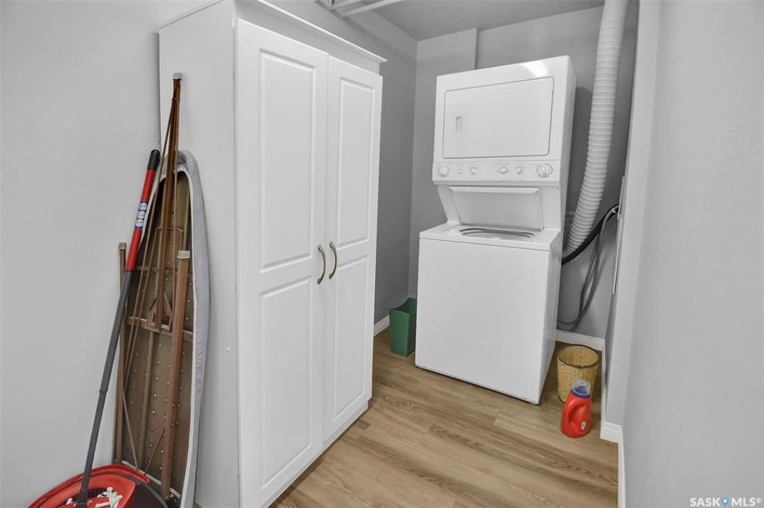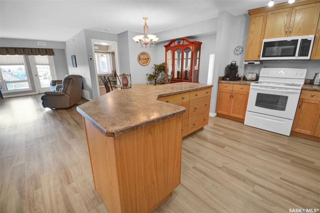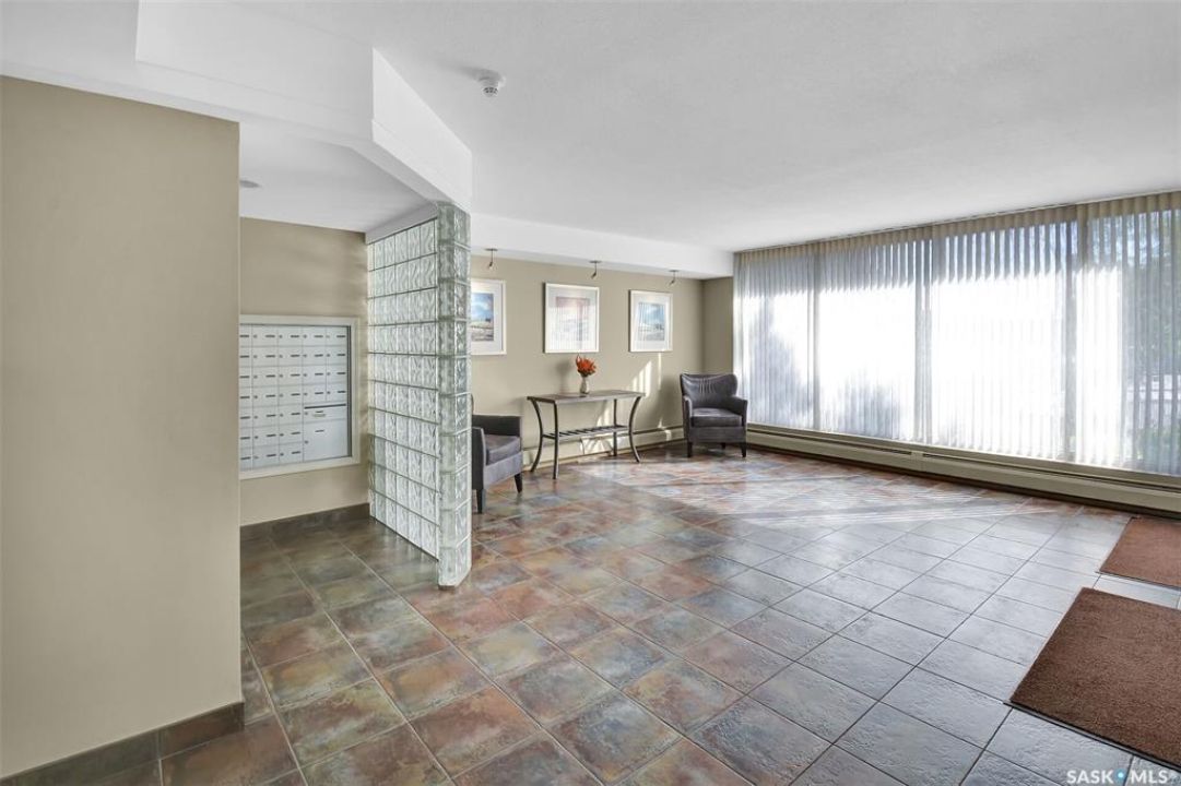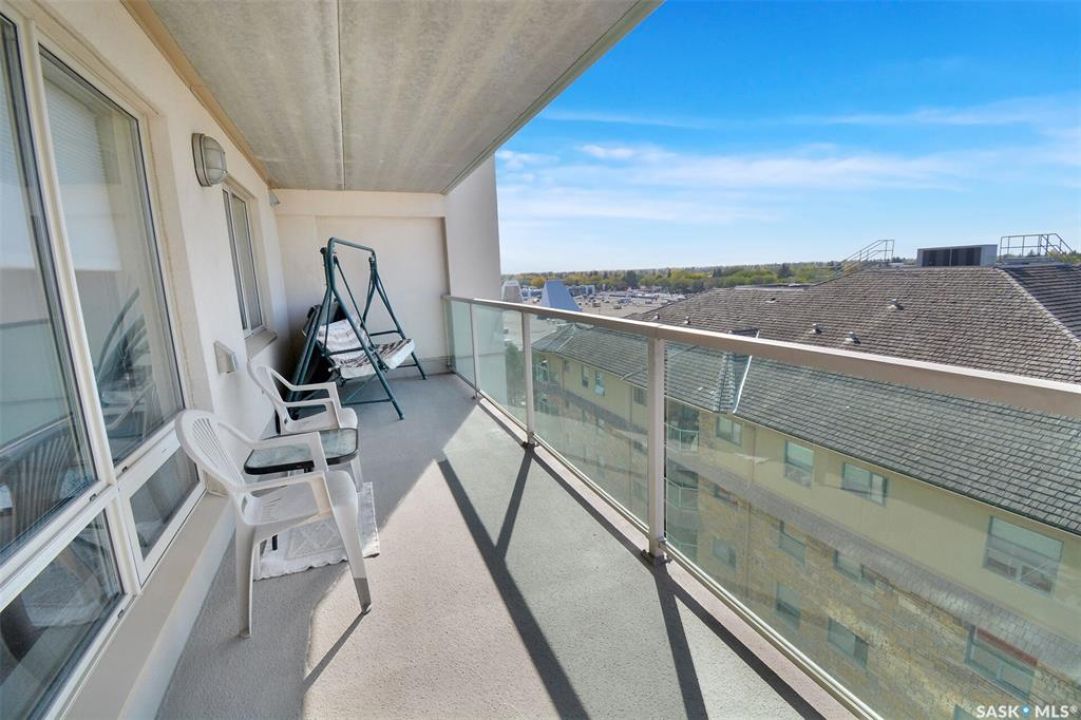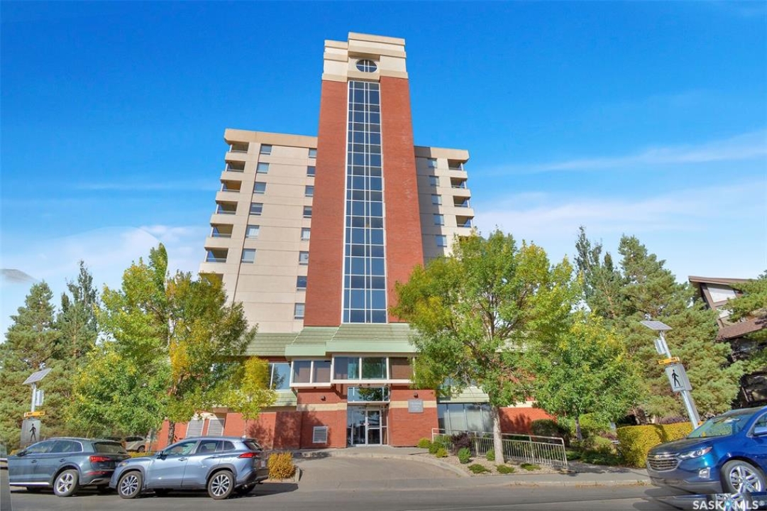 This bright, west facing, move-in ready corner unit condo boasts and exceptional view of the city, which can be enjoyed from the large balcony. Fremai Tower is a concrete building across from Market Mall. 1098 sq ft open concept with large kitchen with oak cabinets, large island, appliances, lots of pot drawers and cabinets to the ceiling. Overlooking the dining area and living room opens to the balcony. The primary bedroom offers room for a king bed and has a large walk-in closet and 3-piece ensuite. Vinyl plank flooring is throughout except for the one bedroom. Spacious laundry area has lots of storage. This condo includes a storage unit on the 12th floor and one underground parking stall, which is close to the elevator. Common areas include an amenities room and an exercise room. Ideal for socializing, this prime location within the complex is truly exceptional- offering a private, quiet, and secure west direction.