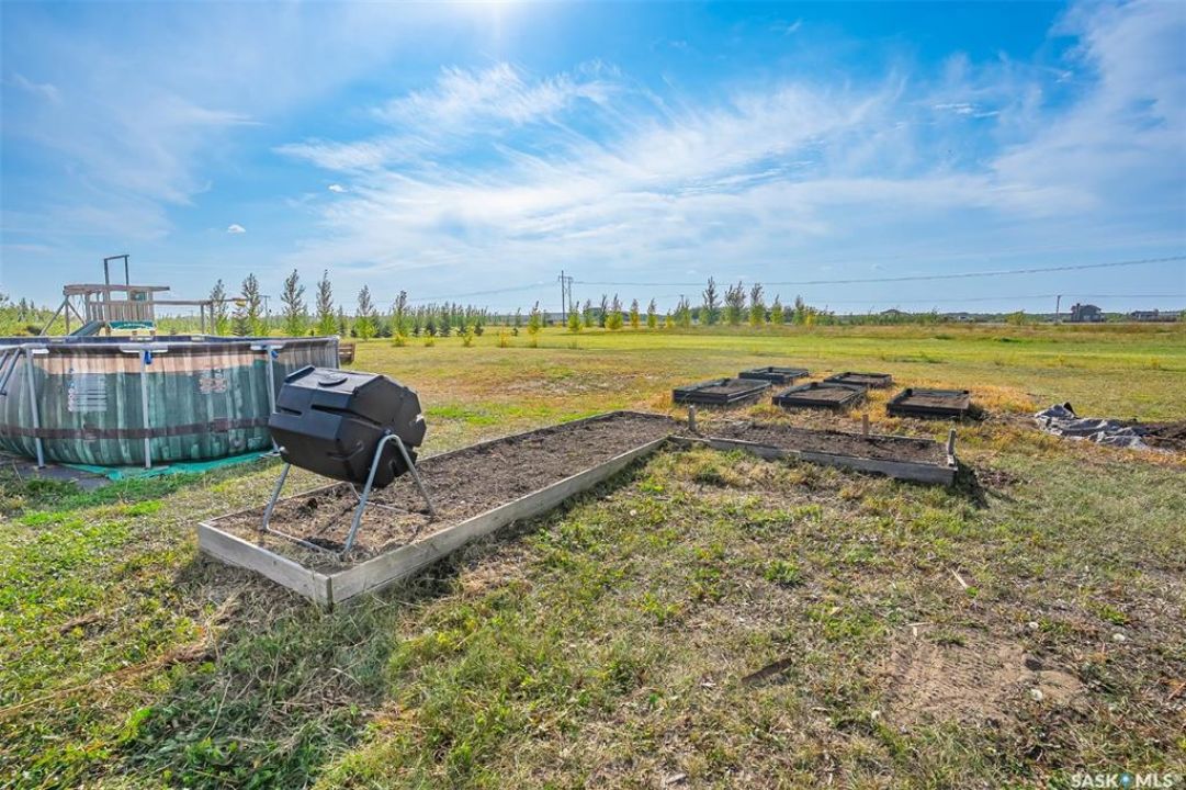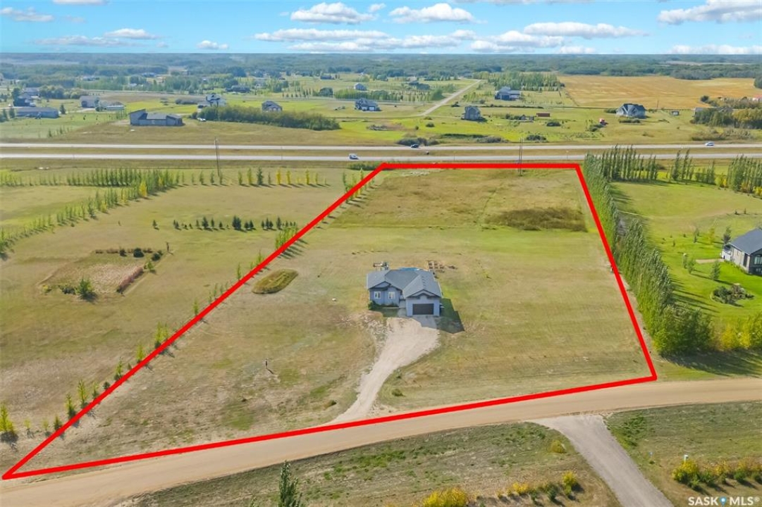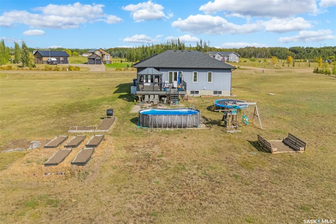 Welcome to this South Country Estates acreage, just 10 minutes south of Saskatoon off HWY 11 in the RM of Dundurn. This 1,348sqft custom bungalow blends modern comfort with country charm. The main floor boasts an open layout with a bright living room, cozy fireplace, and stylish kitchen featuring granite counters, island, and walk-in pantry. The dining area leads to a west-facing deck with gazebo and natural gas hookup—ideal for entertaining. The primary suite includes a walk-in closet and 4-pc ensuite, with two more bedrooms completing the main floor. The basement offers excellent potential, with a family room, games area, 4-pc bath, laundry, den, and 4th bedroom awaiting your finishing touches to the ceiling. A heated 24x26 garage with 8-ft door provides ample storage. Outdoors, enjoy the above-ground pool, play structure, garden beds, and wide-open space. Fibre internet, natural gas, and public water line add convenience, while Clavet School bus pickup is right at the driveway. Perfect for a growing family seeking a peaceful acreage lifestyle with an easy commute to the city.