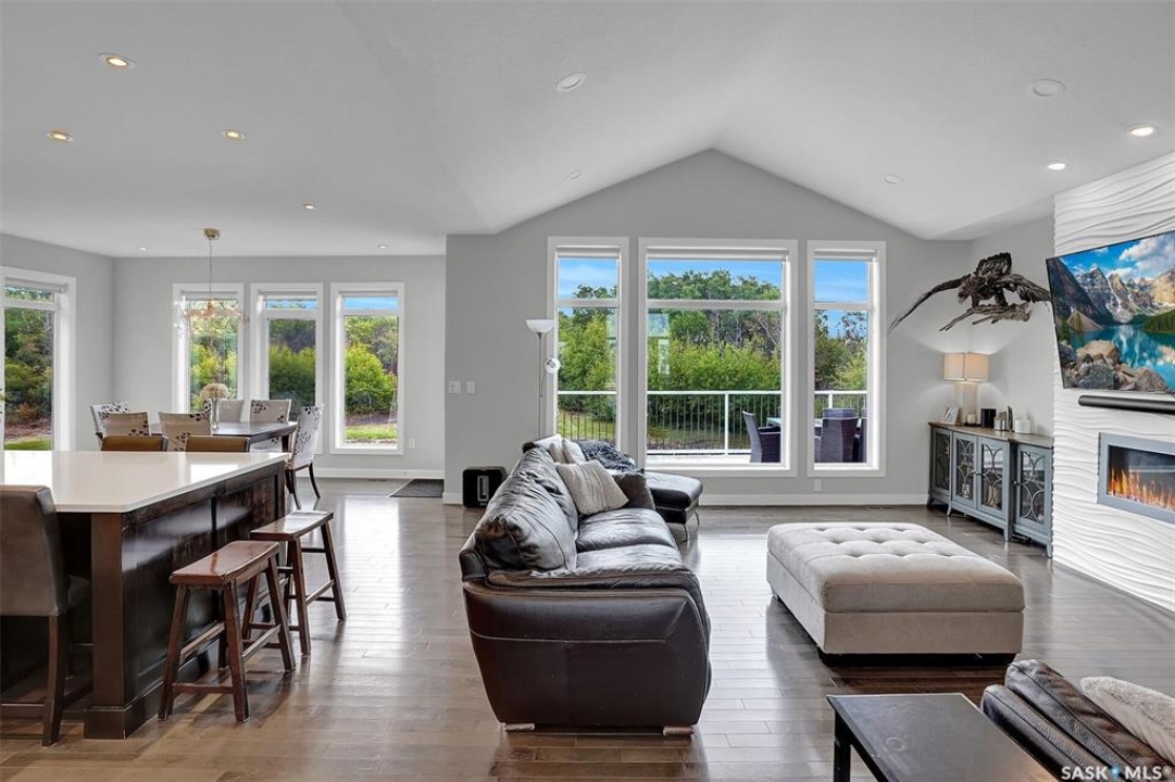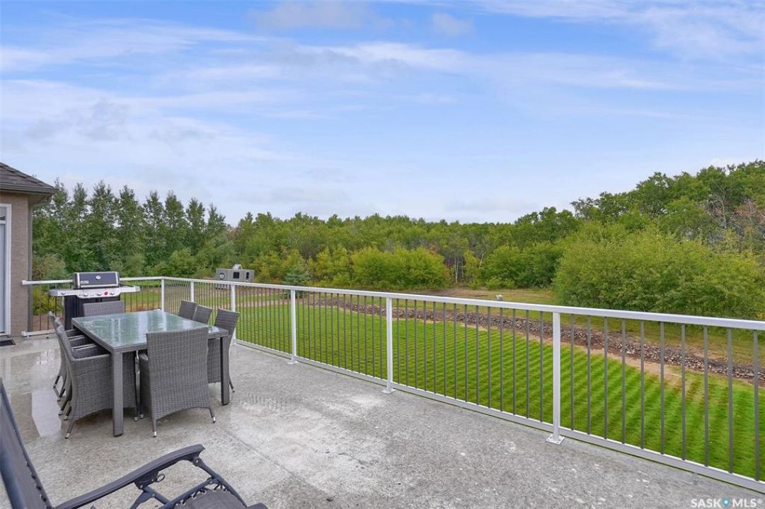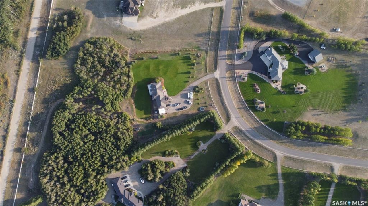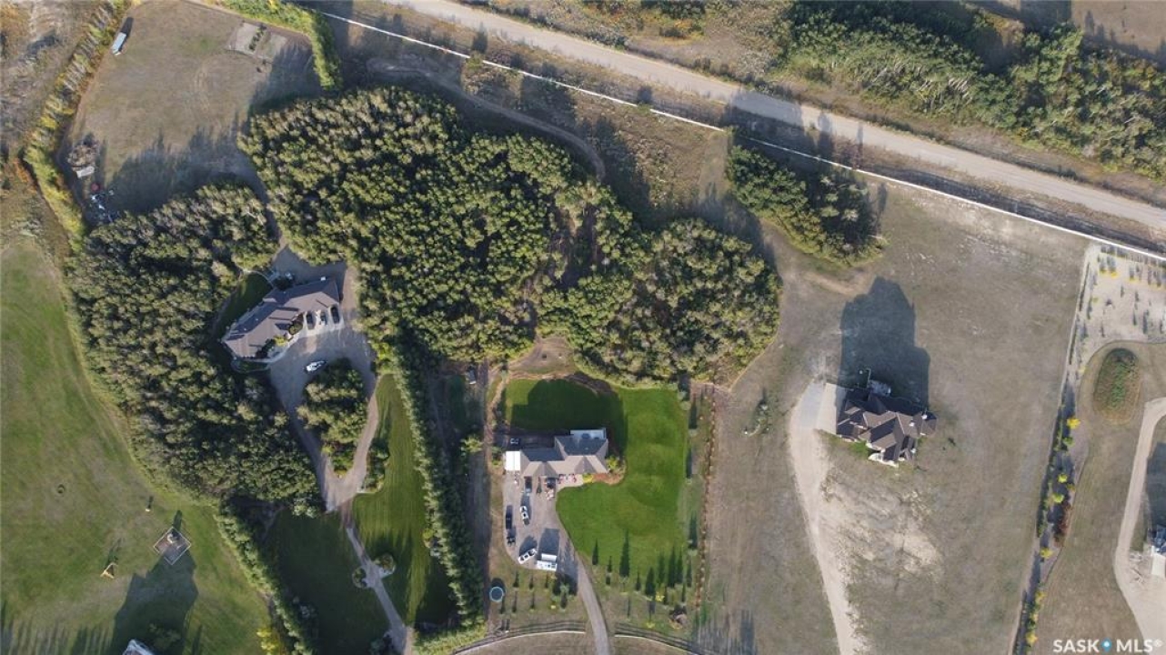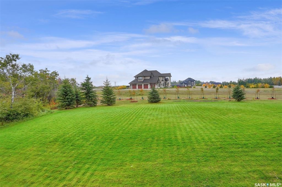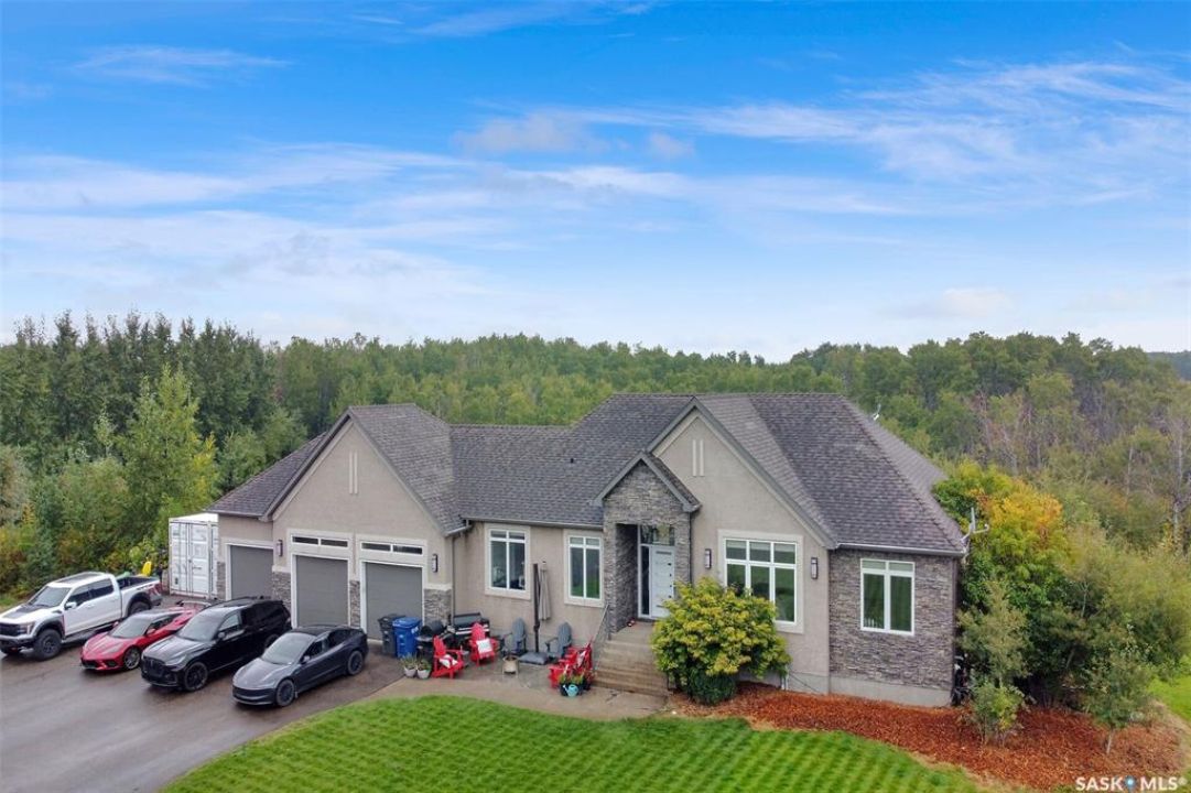 Don't miss this stunning walkout bungalow nestled on a prime 4.9-acre lot, highlighted by over 2 acres of mature trees complete with private walking and biking paths, a rare retreat just minutes from the city and walking distance to White Butte trails. This 1840 sq ft bungalow offers over 3,600 sq ft of beautifully developed living space with 5 bedrooms, a den, and 3 bathrooms, designed for both family living and entertaining. The exterior showcases stucco and stone finishes with a triple attached heated garage, with gemstone lighting, in ground sprinklers attached to well. A fully paved driveway provides ample parking for guests, trailers, and toys. Step inside to a bright, open foyer with tile floors that lead into the expansive main level. The living room features vaulted ceilings, hardwood flooring, and a striking floor to ceiling fireplace, with large windows that flood the space with natural light and frame picturesque views of your private acreage. The kitchen is both stylish and functional, complete with quartz countertops, a large island, stainless steel appliances, and abundant cabinetry. A convenient walk-through pantry connects to the laundry/mudroom with direct access to the heated garage. The dining area, surrounded by windows, opens onto a wrap-around deck with a gas BBQ hookup, the perfect spot for summer entertaining. The main floor offers 3 bedrooms, including a spacious primary suite with a walk-in closet and a 3-pc ensuite. A garden door off the ensuite leads to the deck, offering a private outdoor escape. A full bathroom with a tiled soaker tub serves the additional bedrooms. The fully developed walkout basement extends your living space with a large recreation room featuring a second fireplace, French doors to a versatile den, 2 additional bedrooms, and a 3-pc bathroom. Walkout access opens onto a covered aggregate patio featuring gemstone lighting and the beautifully landscaped backyard, where the treed acreage and private trails await.