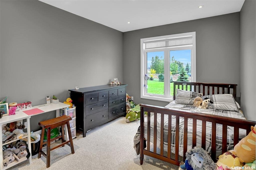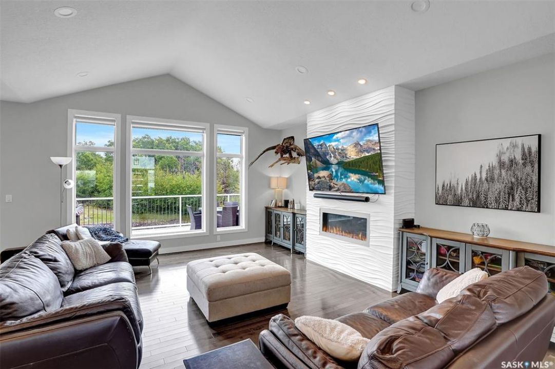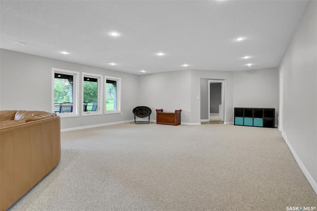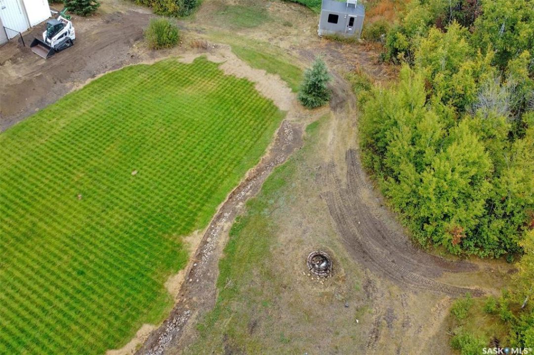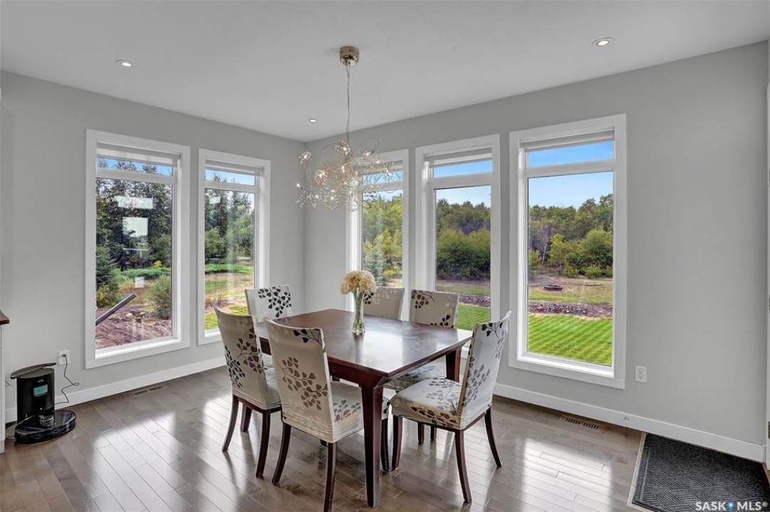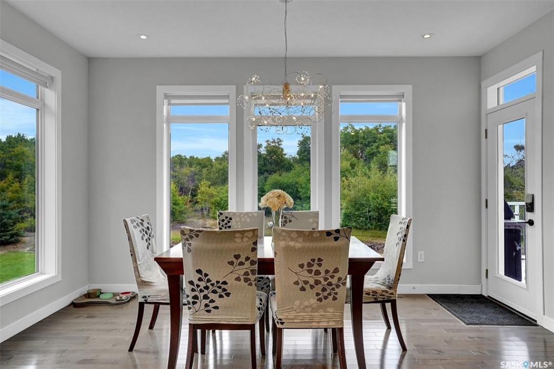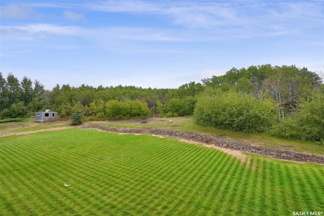 Don't miss this stunning walkout bungalow nestled on a prime 4.9-acre lot, highlighted by over 2 acres of mature trees complete with private walking and biking paths, a rare retreat just minutes from the city and walking distance to White Butte trails. This 1840 sq ft bungalow offers over 3,600 sq ft of beautifully developed living space with 5 bedrooms, a den, and 3 bathrooms, designed for both family living and entertaining. The exterior showcases stucco and stone finishes with a triple attached heated garage, with gemstone lighting, in ground sprinklers attached to well. A fully paved driveway provides ample parking for guests, trailers, and toys. Step inside to a bright, open foyer with tile floors that lead into the expansive main level. The living room features vaulted ceilings, hardwood flooring, and a striking floor to ceiling fireplace, with large windows that flood the space with natural light and frame picturesque views of your private acreage. The kitchen is both stylish and functional, complete with quartz countertops, a large island, stainless steel appliances, and abundant cabinetry. A convenient walk-through pantry connects to the laundry/mudroom with direct access to the heated garage. The dining area, surrounded by windows, opens onto a wrap-around deck with a gas BBQ hookup, the perfect spot for summer entertaining. The main floor offers 3 bedrooms, including a spacious primary suite with a walk-in closet and a 3-pc ensuite. A garden door off the ensuite leads to the deck, offering a private outdoor escape. A full bathroom with a tiled soaker tub serves the additional bedrooms. The fully developed walkout basement extends your living space with a large recreation room featuring a second fireplace, French doors to a versatile den, 2 additional bedrooms, and a 3-pc bathroom. Walkout access opens onto a covered aggregate patio featuring gemstone lighting and the beautifully landscaped backyard, where the treed acreage and private trails await.