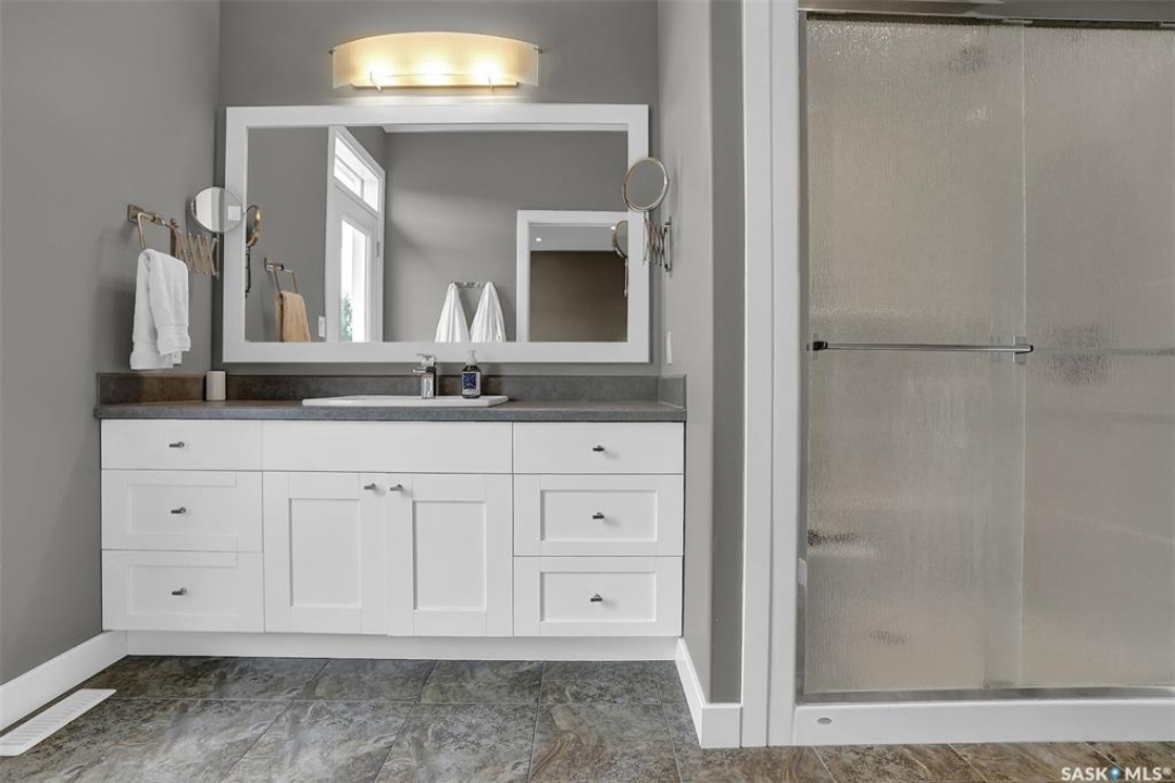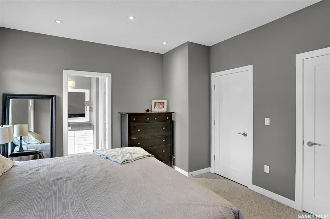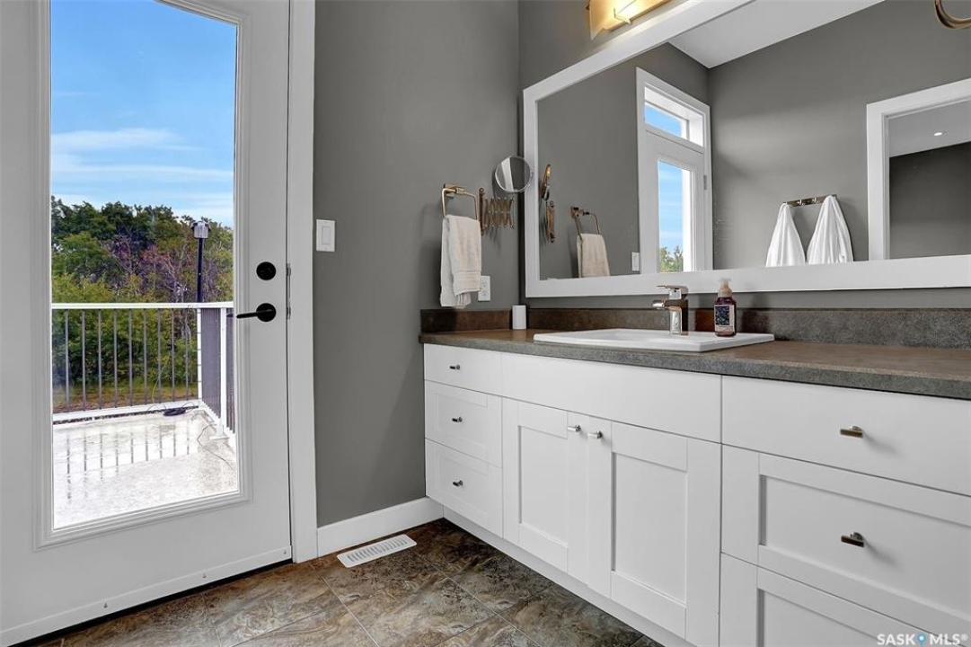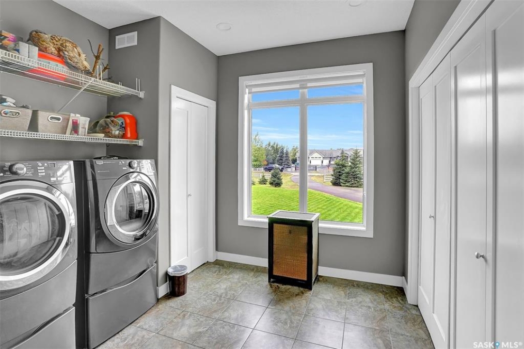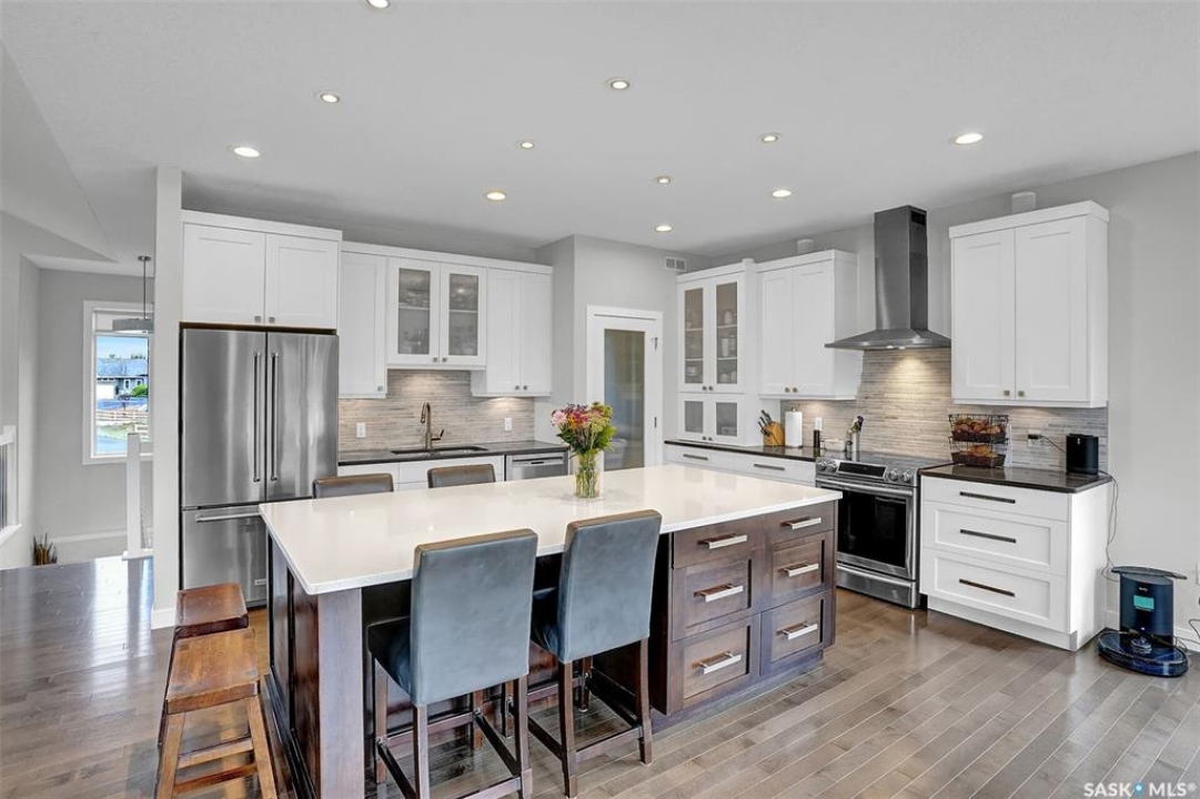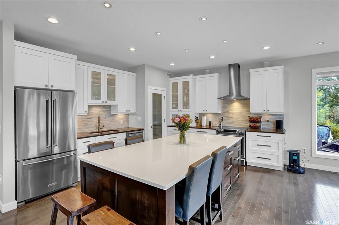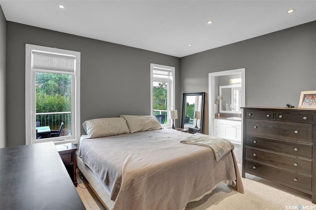 Don't miss this stunning walkout bungalow nestled on a prime 4.9-acre lot, highlighted by over 2 acres of mature trees complete with private walking and biking paths, a rare retreat just minutes from the city and walking distance to White Butte trails. This 1840 sq ft bungalow offers over 3,600 sq ft of beautifully developed living space with 5 bedrooms, a den, and 3 bathrooms, designed for both family living and entertaining. The exterior showcases stucco and stone finishes with a triple attached heated garage, with gemstone lighting, in ground sprinklers attached to well. A fully paved driveway provides ample parking for guests, trailers, and toys. Step inside to a bright, open foyer with tile floors that lead into the expansive main level. The living room features vaulted ceilings, hardwood flooring, and a striking floor to ceiling fireplace, with large windows that flood the space with natural light and frame picturesque views of your private acreage. The kitchen is both stylish and functional, complete with quartz countertops, a large island, stainless steel appliances, and abundant cabinetry. A convenient walk-through pantry connects to the laundry/mudroom with direct access to the heated garage. The dining area, surrounded by windows, opens onto a wrap-around deck with a gas BBQ hookup, the perfect spot for summer entertaining. The main floor offers 3 bedrooms, including a spacious primary suite with a walk-in closet and a 3-pc ensuite. A garden door off the ensuite leads to the deck, offering a private outdoor escape. A full bathroom with a tiled soaker tub serves the additional bedrooms. The fully developed walkout basement extends your living space with a large recreation room featuring a second fireplace, French doors to a versatile den, 2 additional bedrooms, and a 3-pc bathroom. Walkout access opens onto a covered aggregate patio featuring gemstone lighting and the beautifully landscaped backyard, where the treed acreage and private trails await.