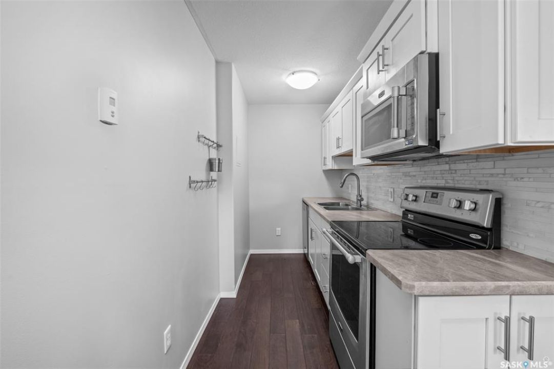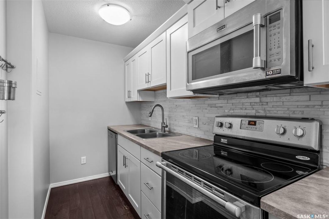 Cute, cozy and safety matters put in place! This affordable, newly painted one-bedroom condo, not only offers affordability but also a quiet building with a modern feel. Enjoy an open kitchen/dining/living room area and a large bedroom with a walk in closet. This sweet little condo is completely turn-key and offers a parking space directly under the south-facing deck, so you can keep an eye on your vehicle. The condo board takes your safety seriously with exterior door locking policies in place and cameras for a watchful eye. This condo is in a convenient location; walking trails along the river, amenities in the Cornerstone business district and the Sask Polytech building is all nearby. Whether you are a student or looking for a revenue property, this condo might just be the perfect place for you.