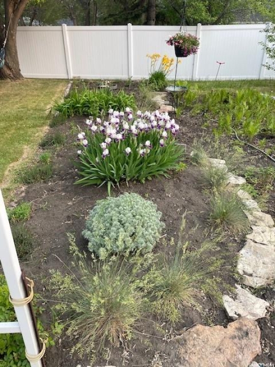Outdoor: Fenced, Garden Area, Lawn Back, Lawn Front, Partially Fenced, Patio, Trees/shrubs