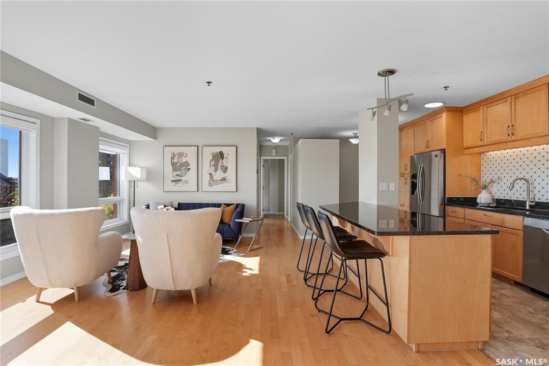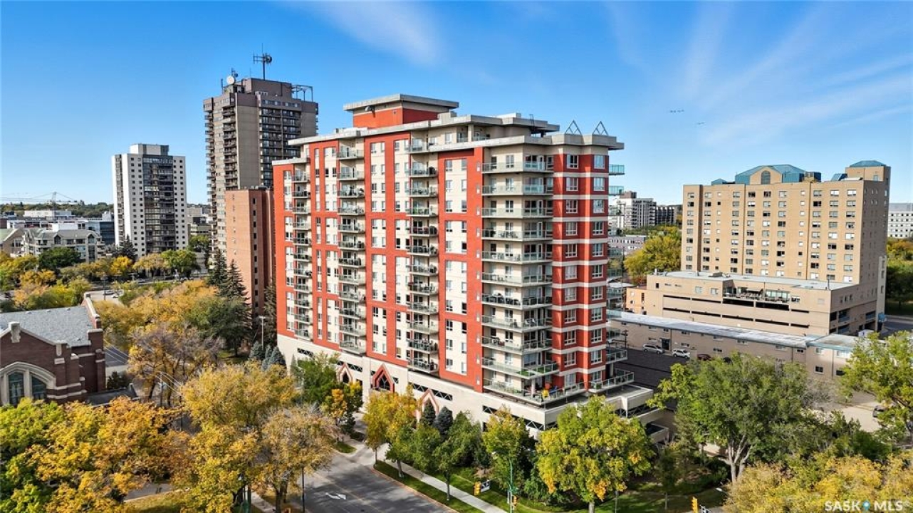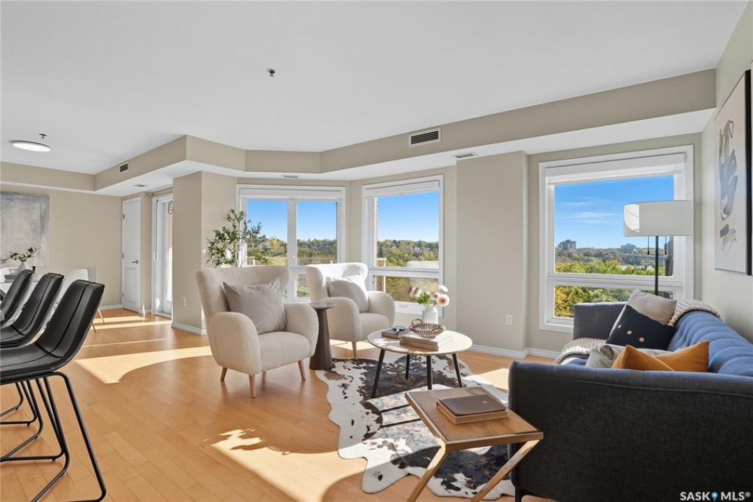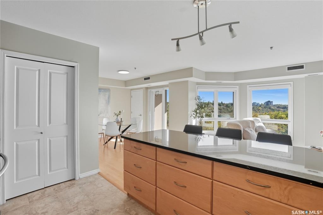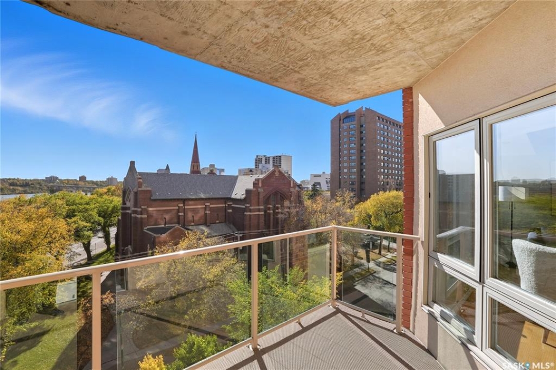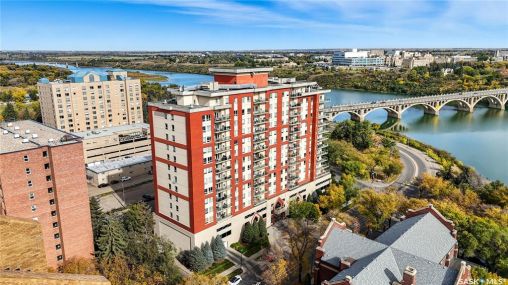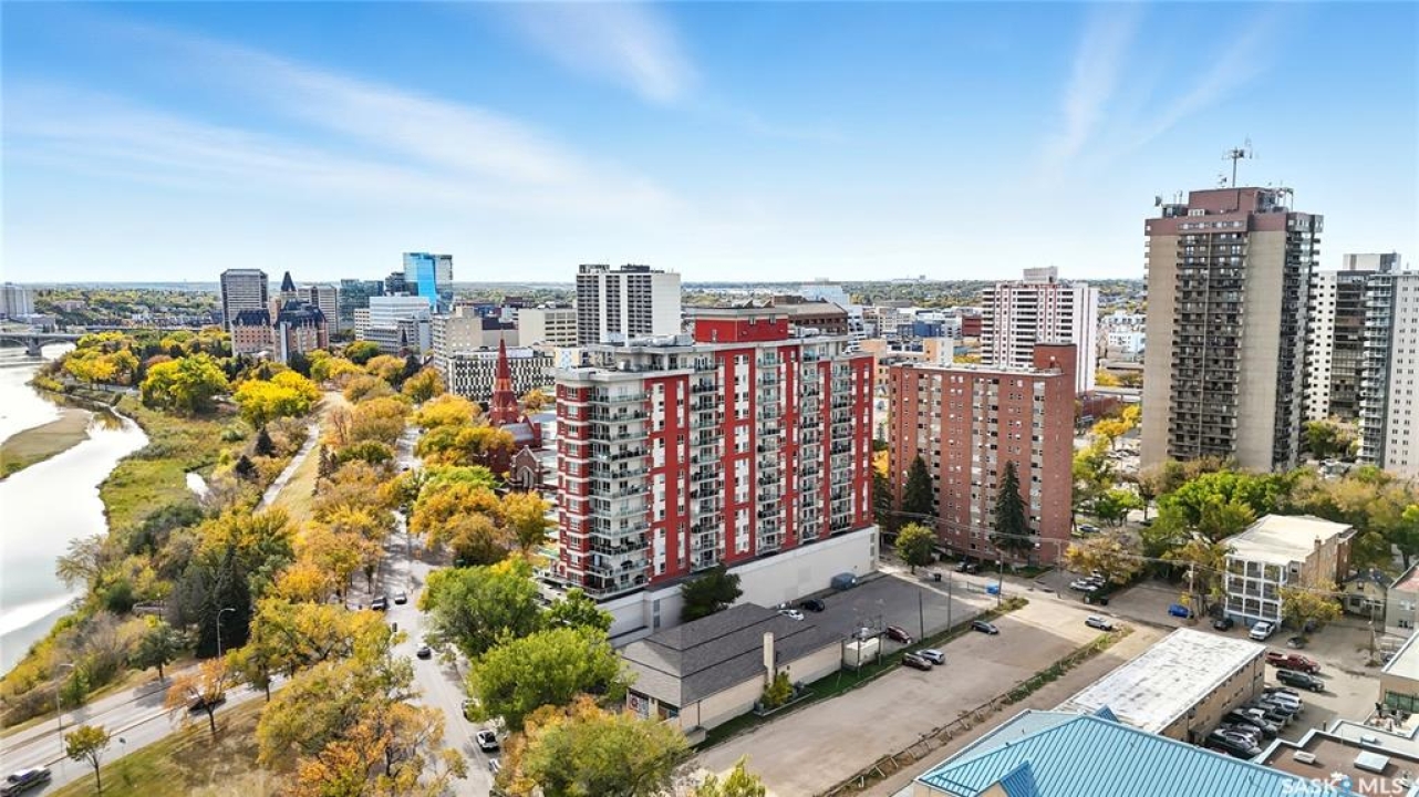 This beautifully maintained downtown condo offers one of the most desirable views in the building, overlooking the scenic river from its south-facing position. Perfectly situated to avoid harsh winds, it sits high enough to offer a stunning perspective above the treetops while remaining closely connected to the vibrant riverbank atmosphere. From your oversized balcony, enjoy a front-row seat to community events like runs, walk-a-thons, and fireworks, and soak in the sounds of live music during the Jazz Festival. Just under 1,200 square feet, the layout includes two spacious bedrooms and two full bathrooms. The bright, open-concept living space is ideal for both everyday comfort and entertaining, anchored by a large kitchen that features granite countertops, a tiled backsplash, and a massive island with additional seating. The adjoining dining area is bright and airy, while the expansive living room benefits from abundant natural light pouring in through the many windows. The generous primary bedroom includes a walk-in closet and a four-piece ensuite, while a second bedroom and additional four-piece bathroom provide ample space for guests or family. The laundry room adds convenience and the independent heating and central air personalized comfort year-round. Step outside your front door and onto the Meewasin River Trail, with direct access to walking and biking paths. Within walking distance of the University of Saskatchewan, Royal University Hospital, City Hospital, and Jim Pattison Children's Hospital. Living downtown means you're surrounded by some of the city's best restaurants, shops, entertainment, and cultural venues—all just steps away. One heated underground parking stall and a heated storage locker are included. Residents also enjoy access to a large amenities room complete with a kitchenette, pool table, lounge area, and a deck with BBQ. Exercise room is included in the condo fees, and for visiting friends or family, guest suites are available to rent.