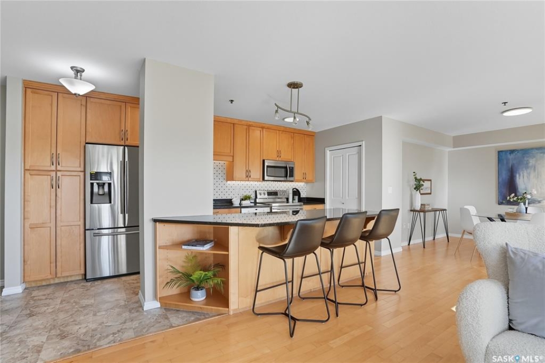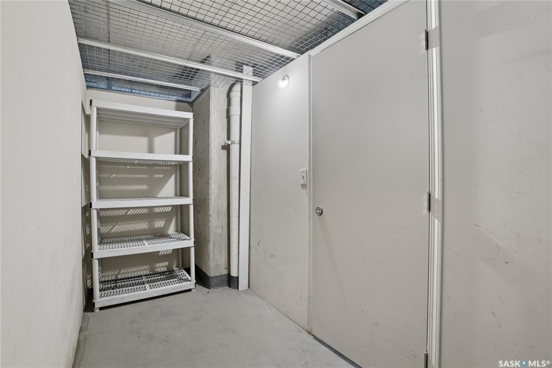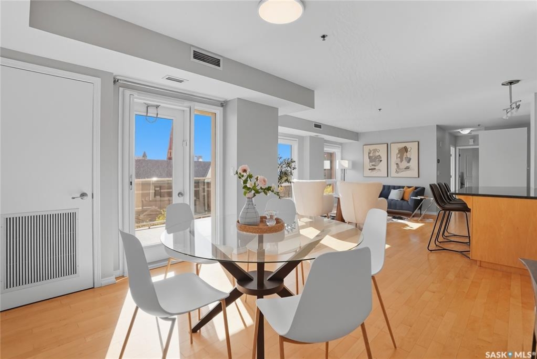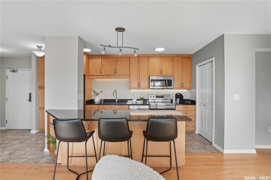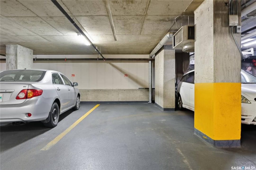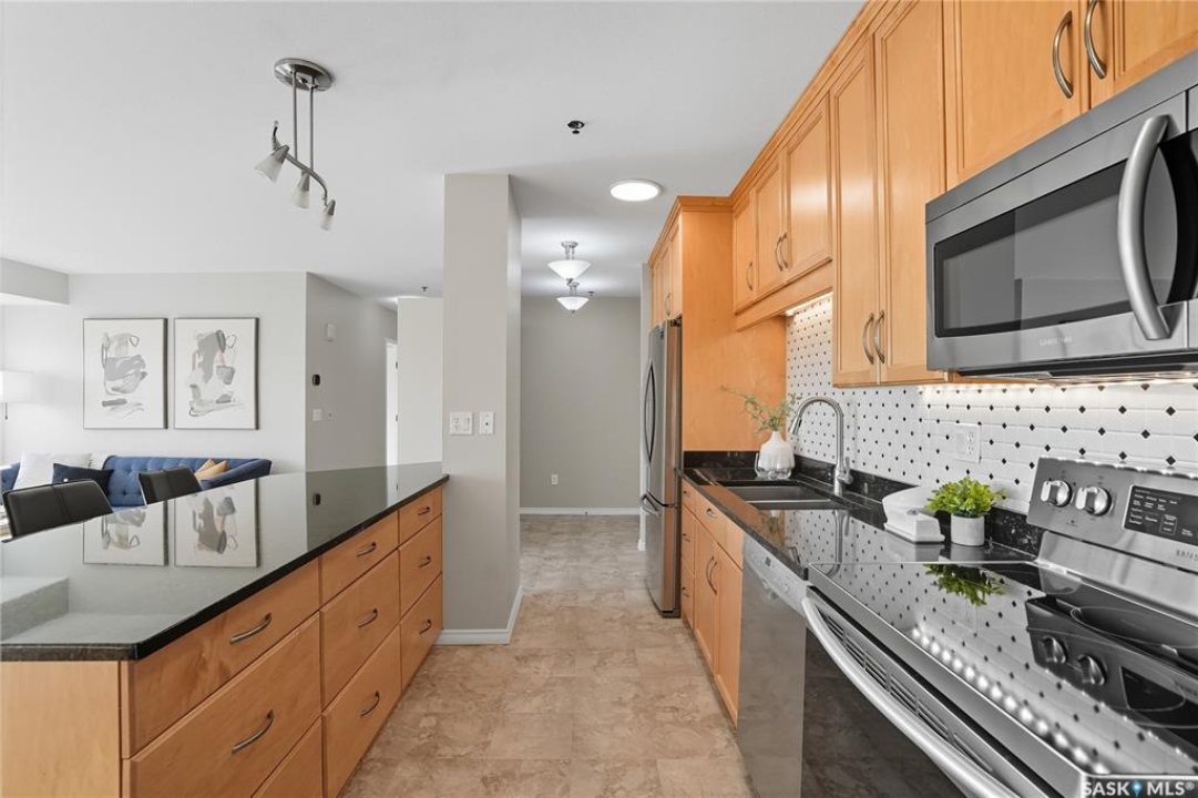 This beautifully maintained downtown condo offers one of the most desirable views in the building, overlooking the scenic river from its south-facing position. Perfectly situated to avoid harsh winds, it sits high enough to offer a stunning perspective above the treetops while remaining closely connected to the vibrant riverbank atmosphere. From your oversized balcony, enjoy a front-row seat to community events like runs, walk-a-thons, and fireworks, and soak in the sounds of live music during the Jazz Festival. Just under 1,200 square feet, the layout includes two spacious bedrooms and two full bathrooms. The bright, open-concept living space is ideal for both everyday comfort and entertaining, anchored by a large kitchen that features granite countertops, a tiled backsplash, and a massive island with additional seating. The adjoining dining area is bright and airy, while the expansive living room benefits from abundant natural light pouring in through the many windows. The generous primary bedroom includes a walk-in closet and a four-piece ensuite, while a second bedroom and additional four-piece bathroom provide ample space for guests or family. The laundry room adds convenience and the independent heating and central air personalized comfort year-round. Step outside your front door and onto the Meewasin River Trail, with direct access to walking and biking paths. Within walking distance of the University of Saskatchewan, Royal University Hospital, City Hospital, and Jim Pattison Children's Hospital. Living downtown means you're surrounded by some of the city's best restaurants, shops, entertainment, and cultural venues—all just steps away. One heated underground parking stall and a heated storage locker are included. Residents also enjoy access to a large amenities room complete with a kitchenette, pool table, lounge area, and a deck with BBQ. Exercise room is included in the condo fees, and for visiting friends or family, guest suites are available to rent.