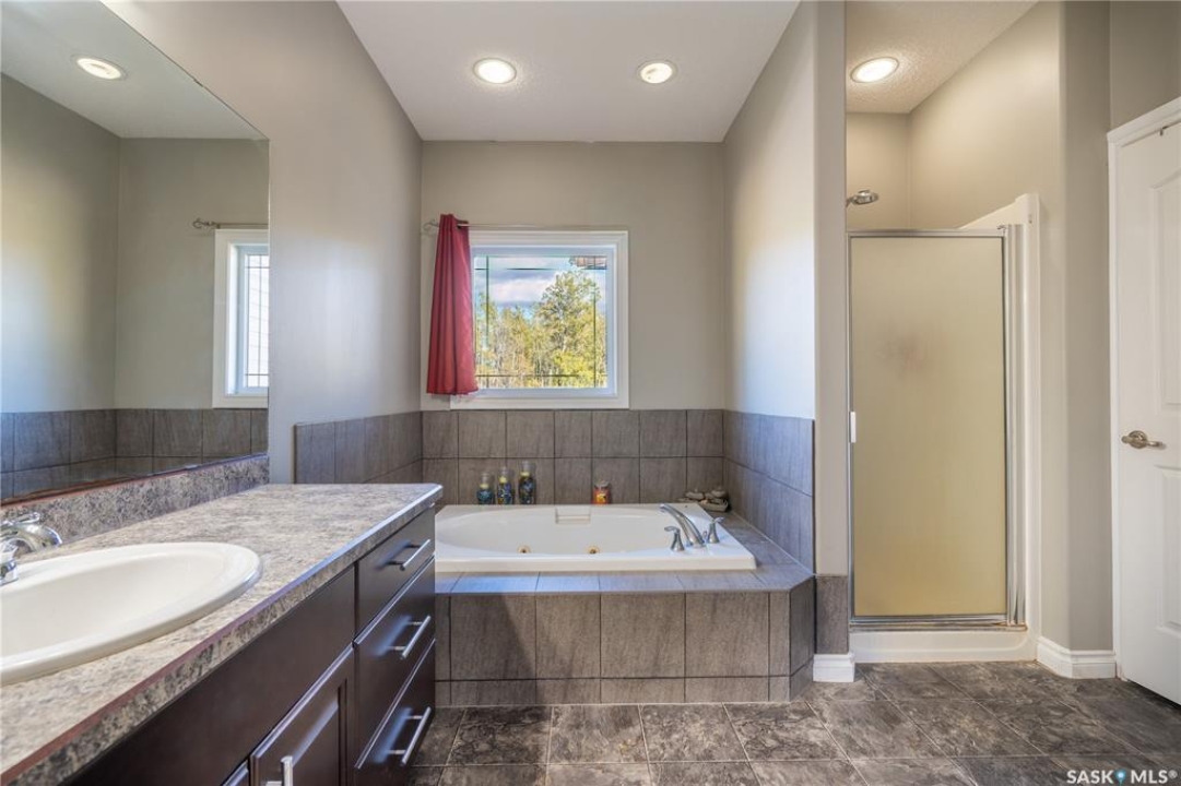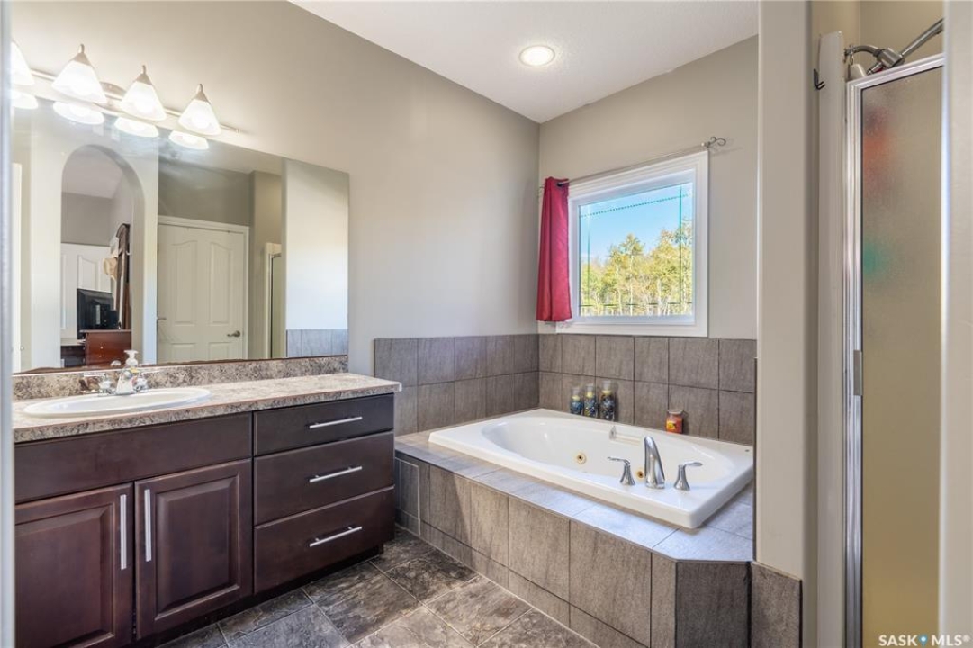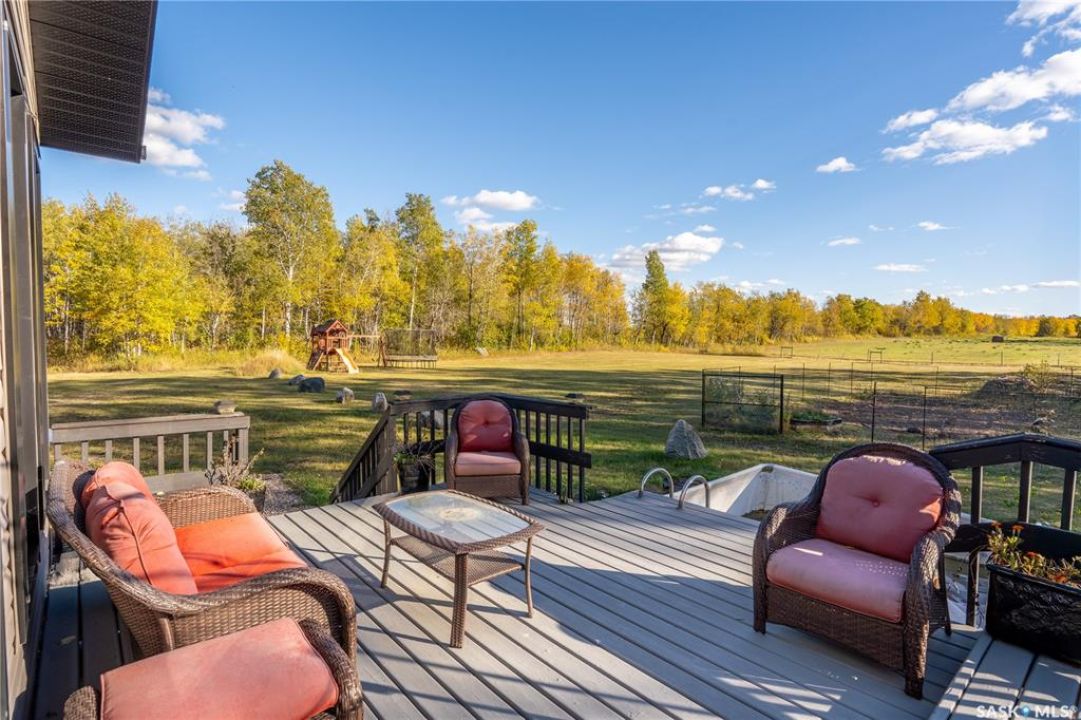 This 2008 home, boasting almost 1700sqft of main-floor living space and held by its original owner, is perfectly situated on ten acres of unparalleled privacy. With three bedrooms and two full bathrooms (plus two more bedrooms and another bathroom roughed in downstairs), step inside to an expansive open-concept layout designed for both effortless family gatherings and grand entertaining. The thoughtfully designed kitchen features sleek stainless steel appliances, rich maple espresso cabinets, and copious storage, with garden doors leading to a generous deck two tired deck. The main level hosts the tranquil primary bedroom with a walk-in closet and a large ensuite showcasing a luxurious jetted tub, along with two additional bright bedrooms, and a practical main-floor laundry room/mudroom. The basement offers exciting potential with two bedrooms and a bathroom roughed-in, ready for your custom touches making this home have the potential of a 5 bedroom/3 bathroom home. You will be impressed by the massive, dedicated hot tub room that has access from the house, featuring 20-foot ceilings, which also provides access to the attached three-car heated garage. Comfort is guaranteed year-round with in-floor heating in the garage, hot tub room, and basement, plus central air conditioning, all efficiently supported by propane heat, a septic tank and open discharge, a drilled well, and a recently installed (2023) reverse osmosis system for pristine water.