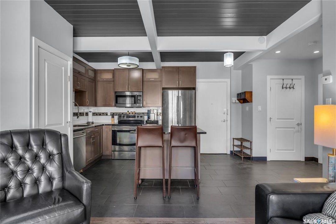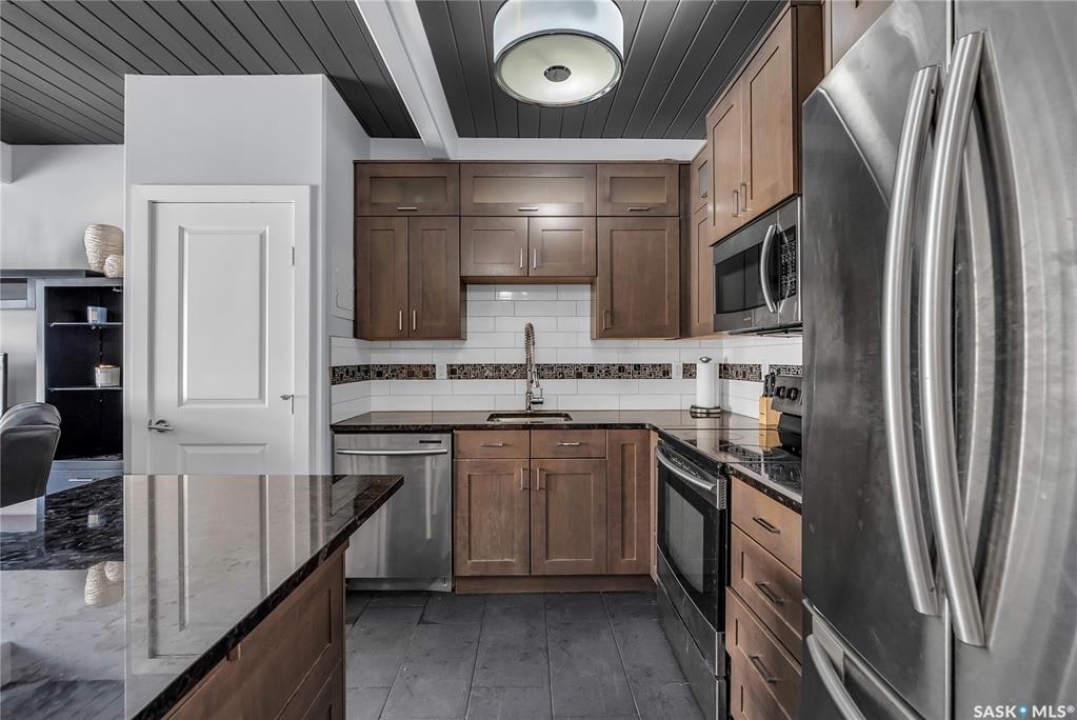 This sleek top-floor 1-bedroom, 1-bathroom condo is perfect for those seeking both style and convenience. The kitchen features beautiful granite countertops, a functional island, and ample counter space for meal prep and entertaining. With in-suite laundry, 10-foot ceilings, and an abundance of natural light, the space feels open and inviting. It also comes with one electrified parking spot. Additionally, the condo is available fully furnished, making it an ideal turn-key investment property for those looking to generate rental income.