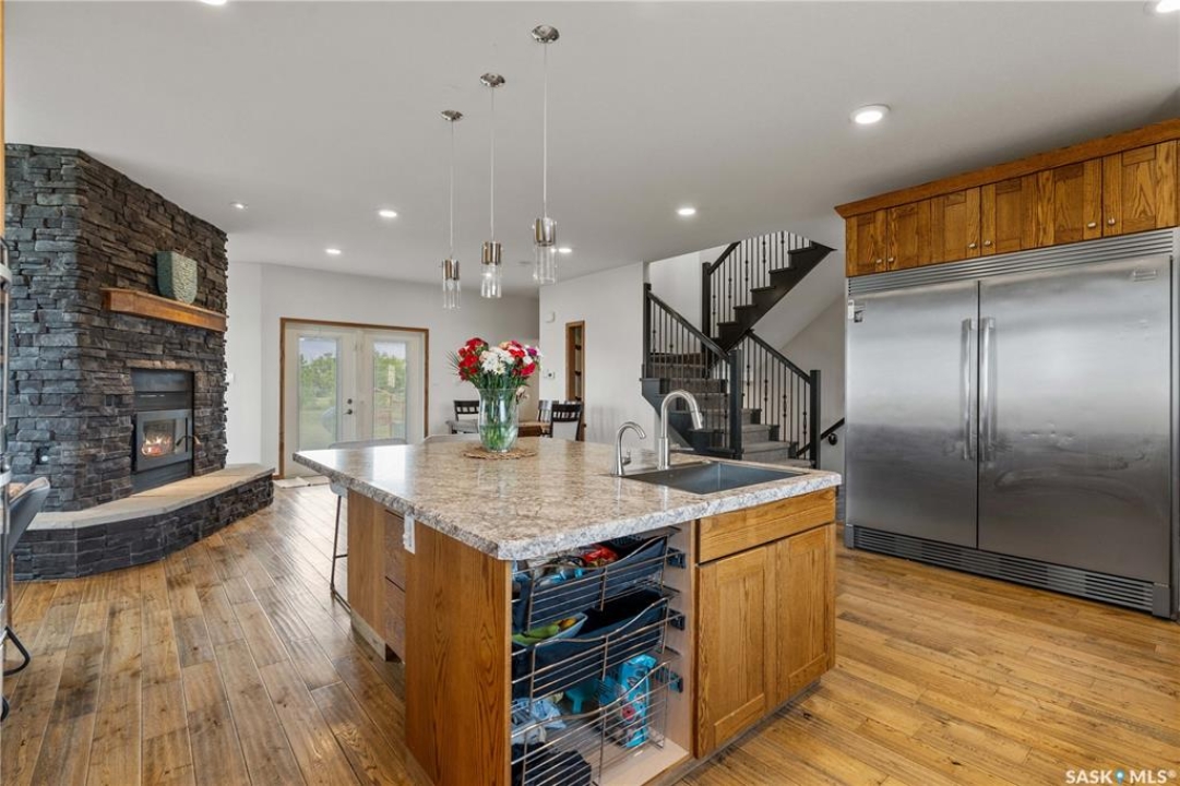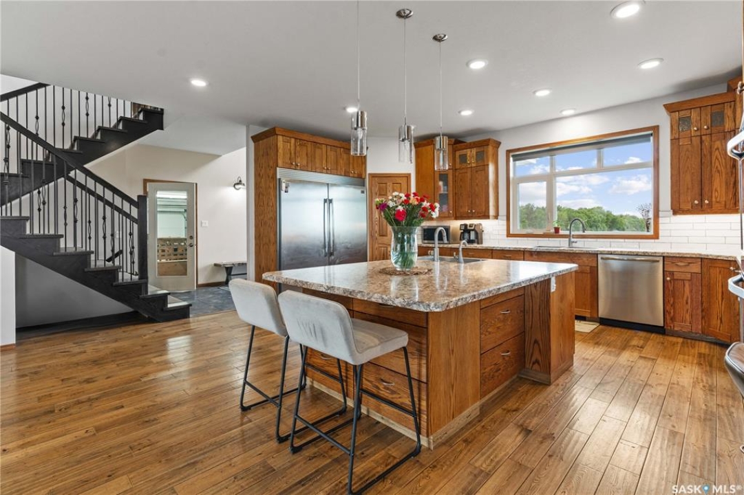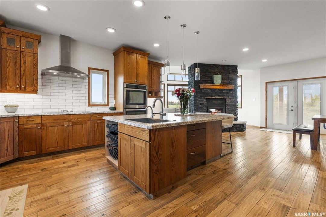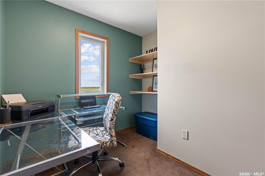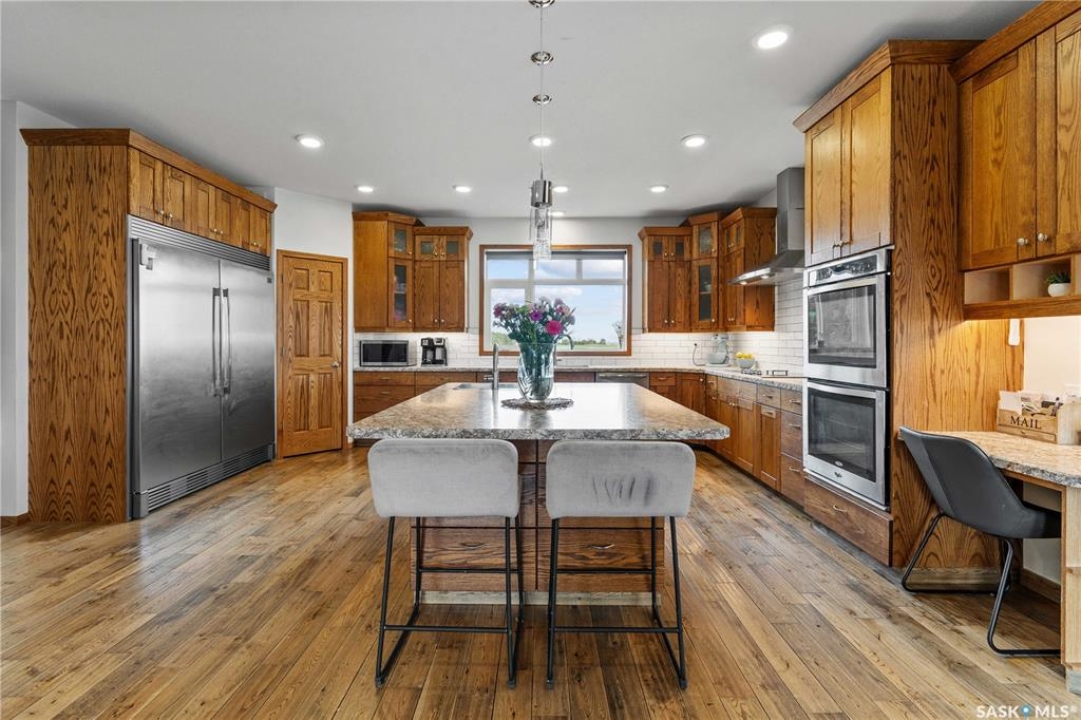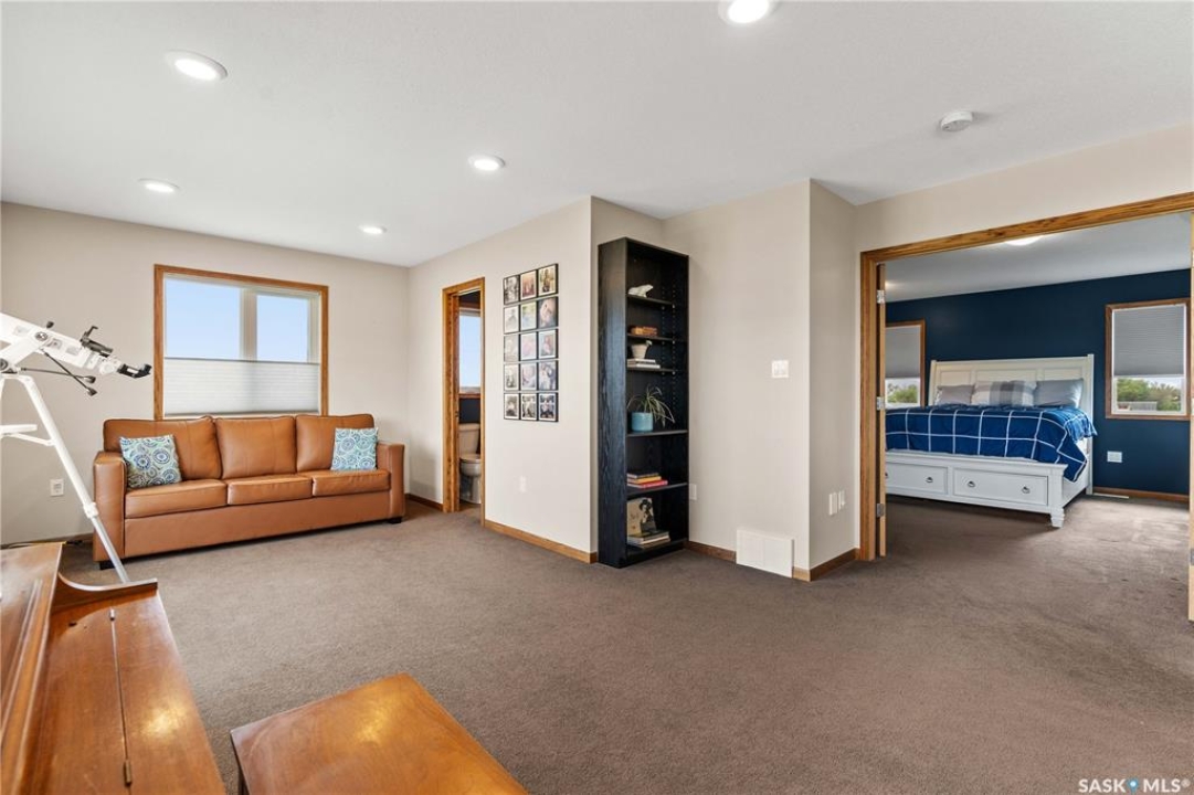 Welcome to your dream acreage! This gorgeous property offers 19.94 acres of meticulously maintained land. Whether you're looking for space, privacy, or a blend of agricultural and residential potential, this has it all. Step into the large, tiled front entry and feel right at home. Main floor showcases a spacious living room with massive windows and a striking stone fireplace, a formal dining area with rich hardwood floors, and a truly impressive kitchen. Designed for entertaining and family living, the kitchen features a large island with a second sink, stainless steel appliances, wall oven, tile backsplash, and abundant cabinetry. A convenient 2-piece bathroom also on the main level. Upstairs, double doors lead into the primary bedroom with a 3-piece ensuite featuring a stand-up shower, lots of counter space, and ample storage. You'll also find 5 more bedrooms, a 4-piece bathroom, a bonus room, a dedicated office, and laundry—all thoughtfully placed on the upper floor for comfort and functionality. The finished basement offers even more living space with a cozy family room, a recreation room currently used as a home gym, an additional 3-piece bathroom, utility room, 9 ft ceilings throughout and luxurious in-floor heating. The heated, insulated double attached garage also features in-floor heat—ideal for year-round use. There are two furnaces for the upstairs and main floor separately. A reverse osmosis system is included for the house tap. Iron filter/water softener system is in use. Property is professionally landscaped and offers an abundance of space for outdoor storage, gardening, or future development. Majority of open acres are currently rented to a local farmer. Beautifully treed backyard with the property line that extends beyond the trees. Bus comes to the front door to the wonderful K-12 school in Imperial! Land is located across from crown land/national wildlife refuge! If thinking of moving the home, sellers have the costs for that so please inquire.
