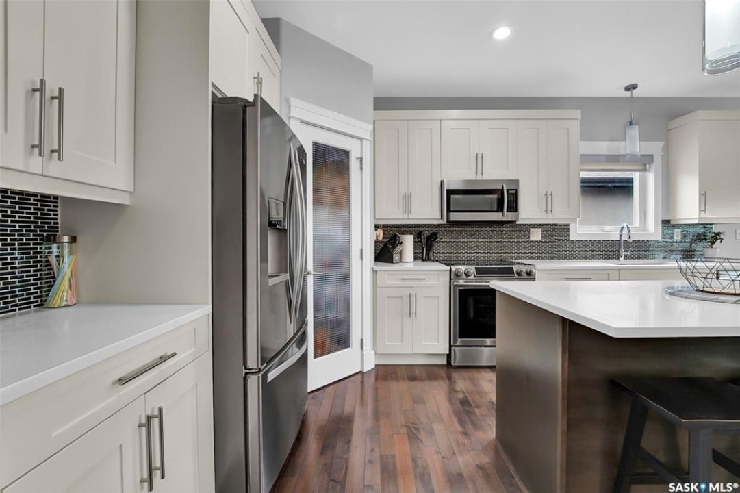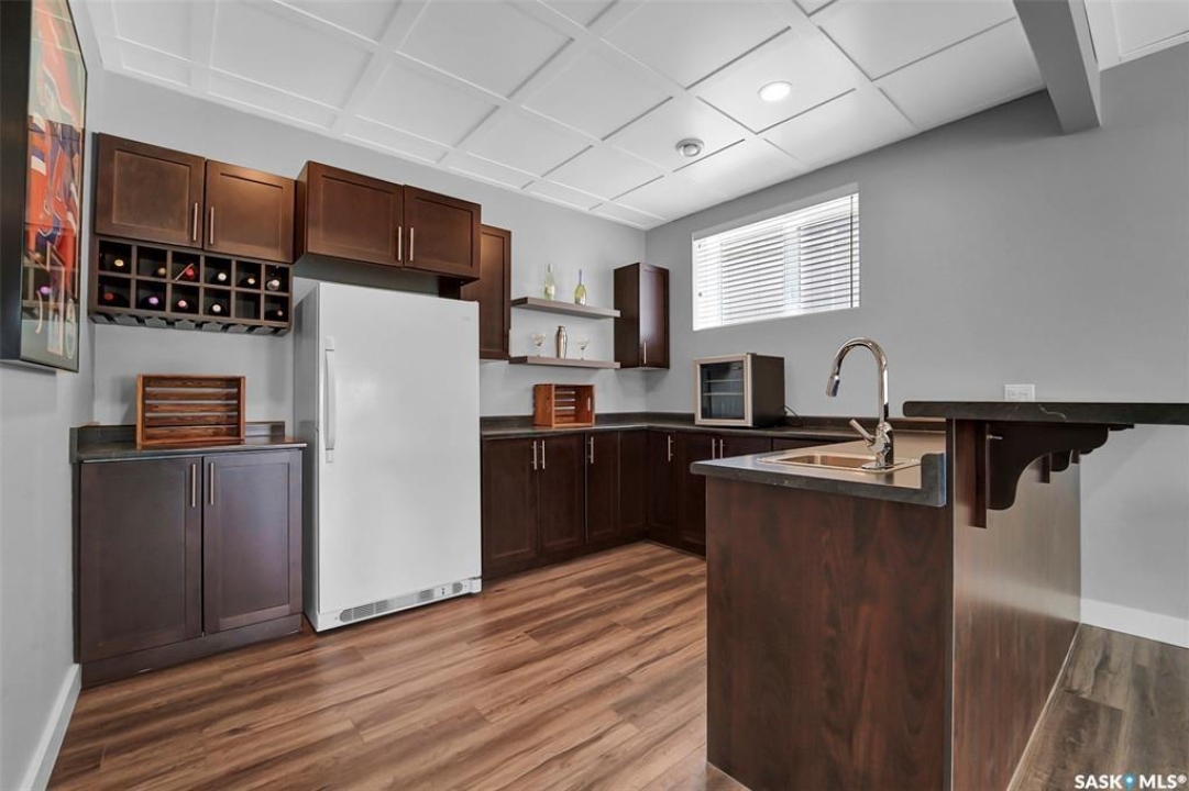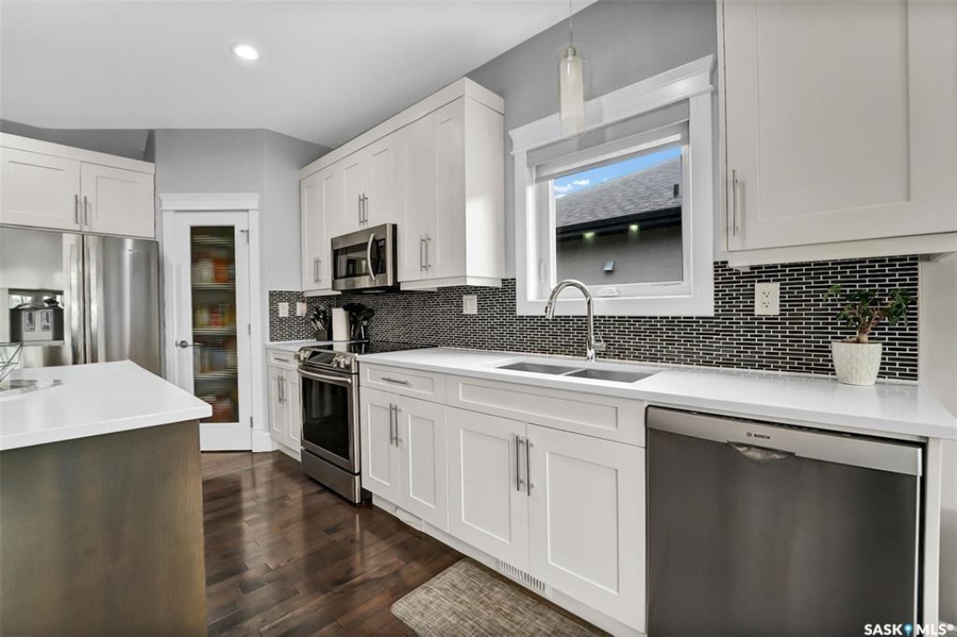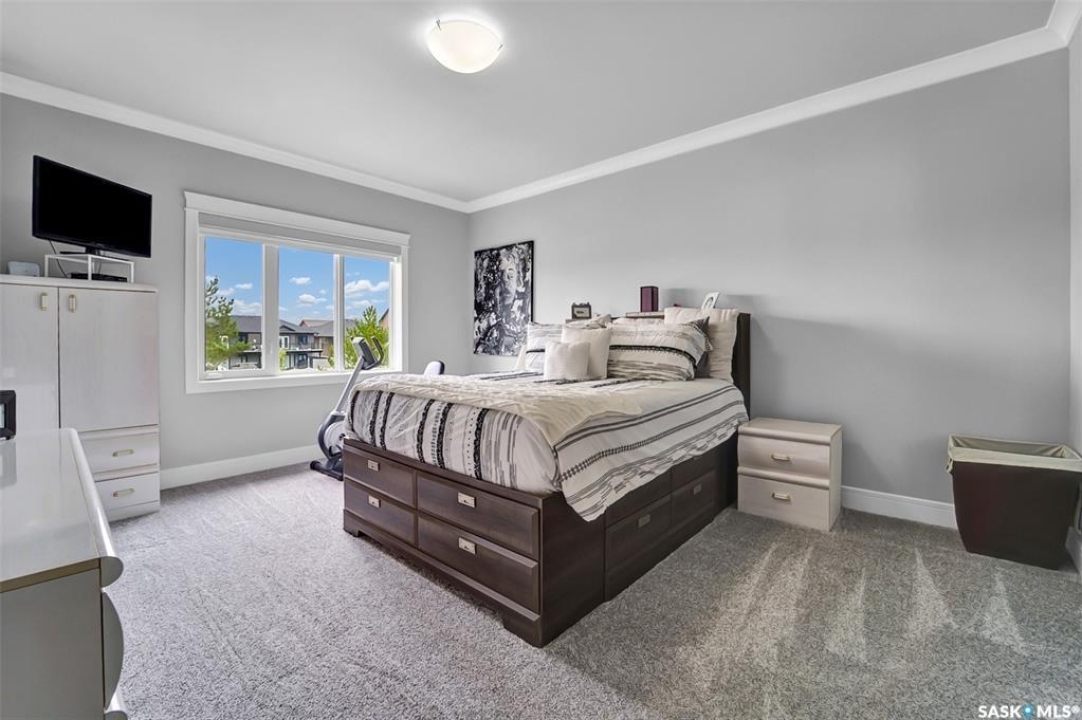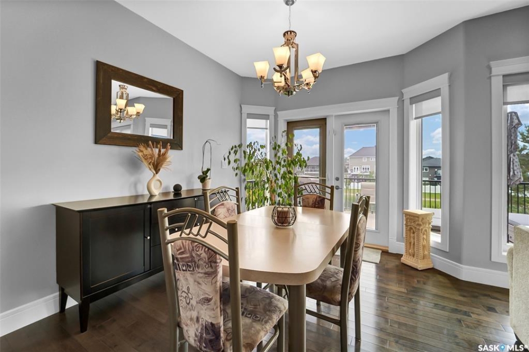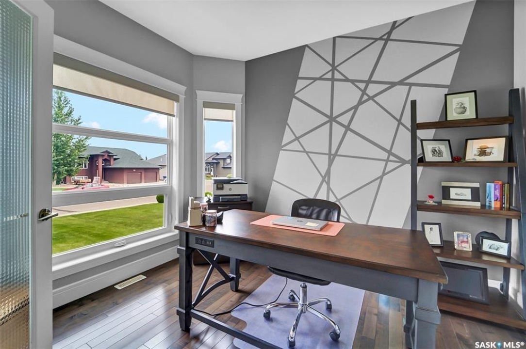 Welcome to this stunning walkout bungalow backing onto the park in Warman, where over $60,000 in recent upgrades have elevated this home into something truly special. From the moment you step inside, you'll be impressed by the spacious layout, elegant finishes, and natural light throughout. The main floor features a grand front entrance, a high-end kitchen with an oversized island, and a warm, inviting living room with a gas fireplace. The large primary bedroom includes a luxurious five-piece ensuite, while a second bedroom, dedicated office space, main floor laundry, and a breathtaking deck overlooking the park complete the level. The walkout basement offers a spacious family room, games area with a bar, two generous bedrooms, and a full bathroom. The beautifully landscaped backyard includes a lower patio, stonework, and two storage sheds. A heated double garage with 10-foot ceilings adds practicality to the home's charm. Upgrades include luxury vinyl plank flooring in the basement, new upgraded carpet on the main floor, solar-block tinted windows in the main floor living room,right side patio door as well as the basement family room right side, a custom front door, refreshed master bath with new taps and paint, front and lower decks, brick flowerbeds, and custom blinds in the basement. With its thoughtful design, serene park views, and turn-key updates, this home is the perfect blend of comfort and elegance ready for you to enjoy. This beautiful home is close to the schools, Warman community centre, and all other amenities.