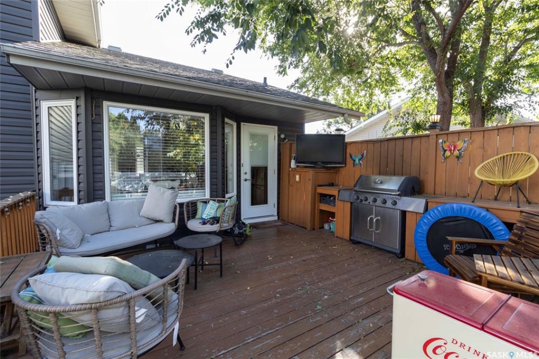 Outdoor: Deck, Fenced, Garden Area, Lawn Back, Lawn Front, Trees/shrubs