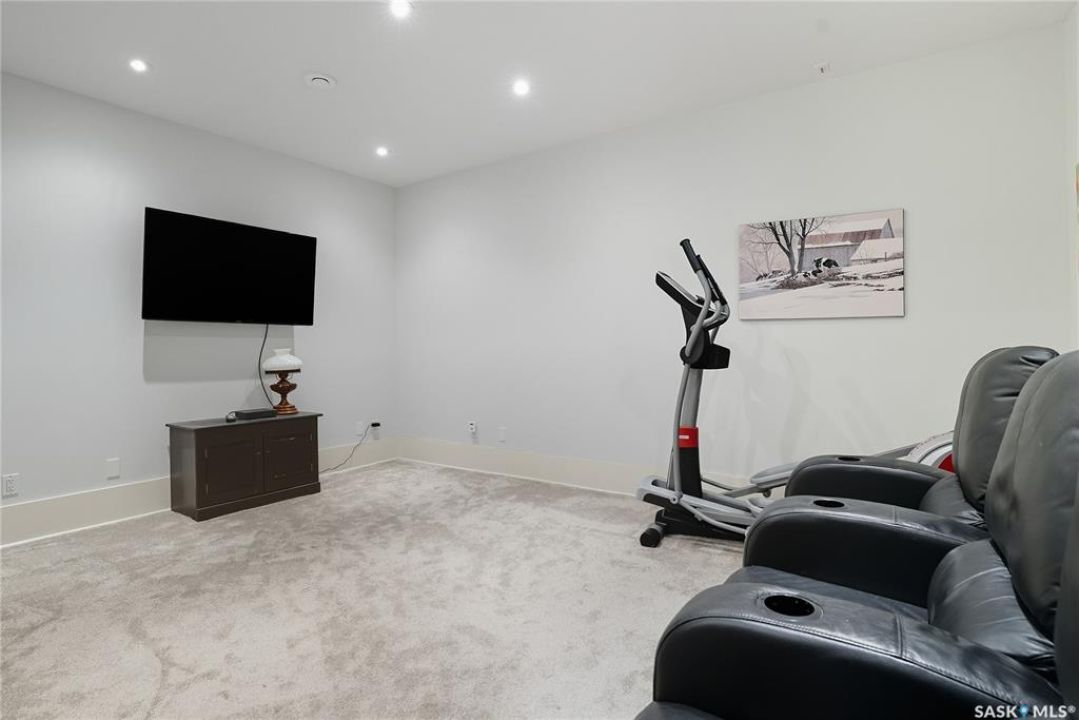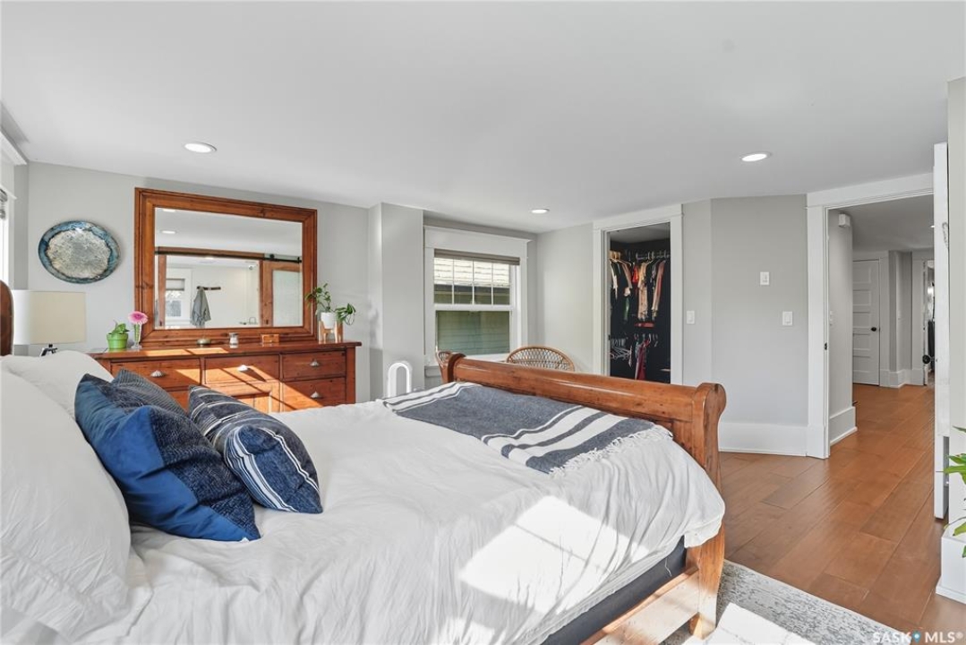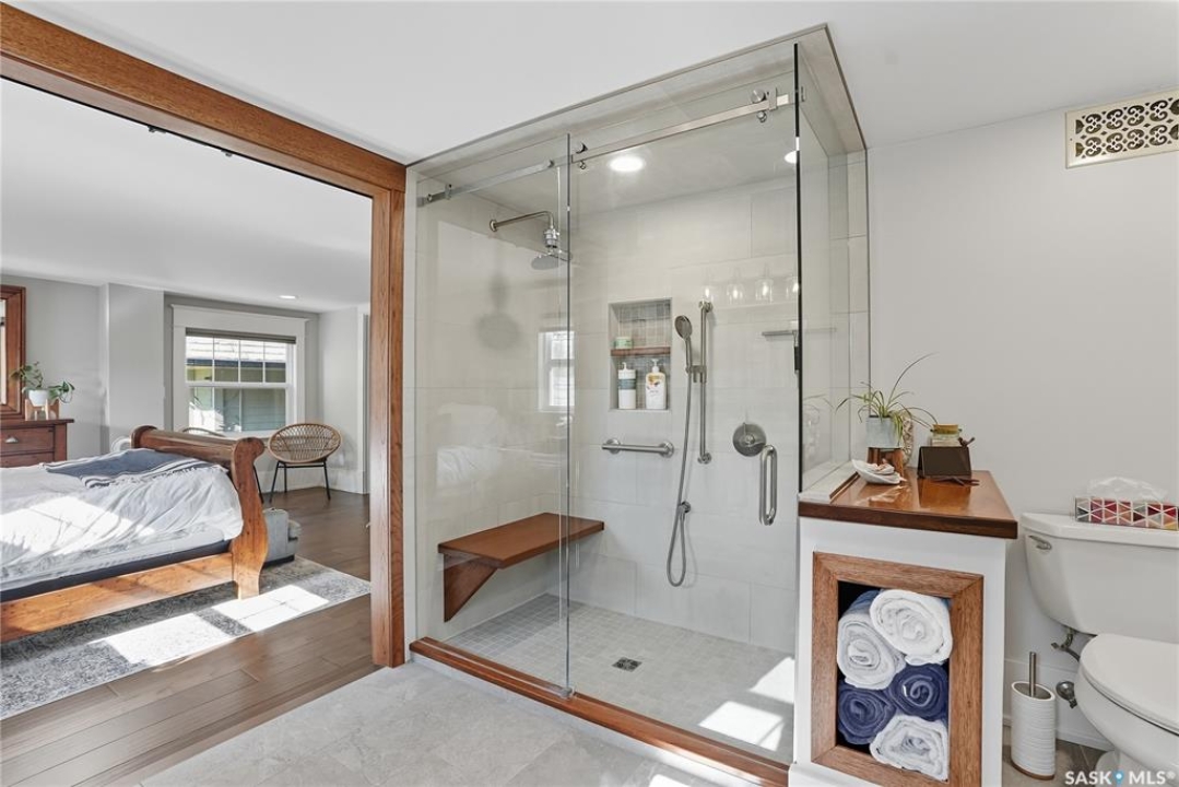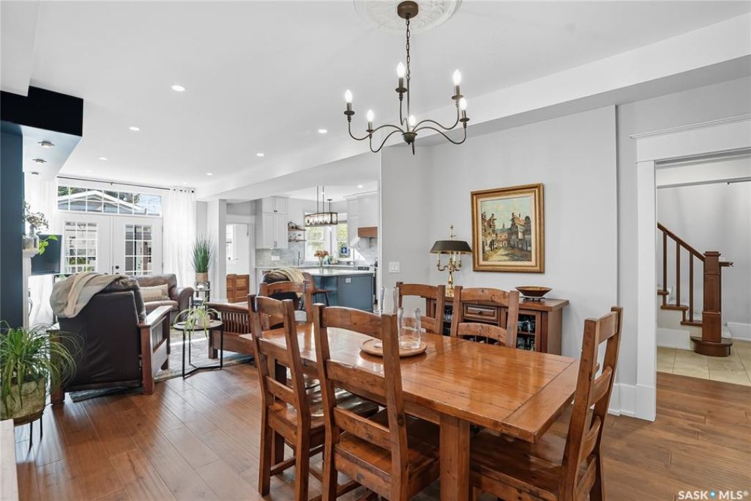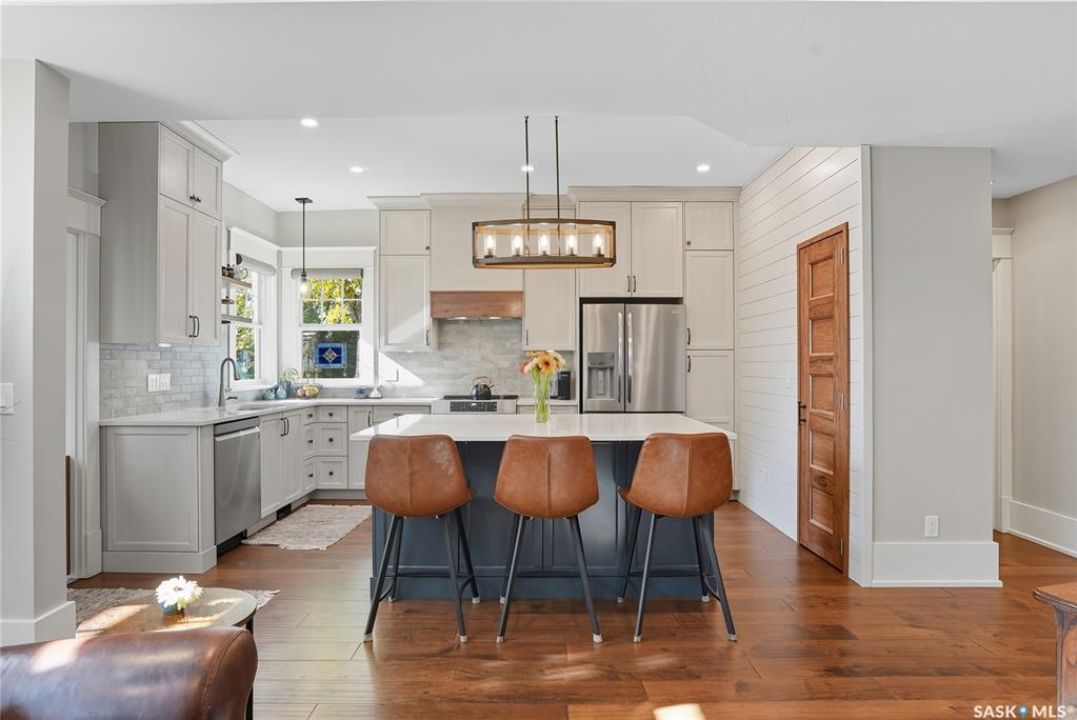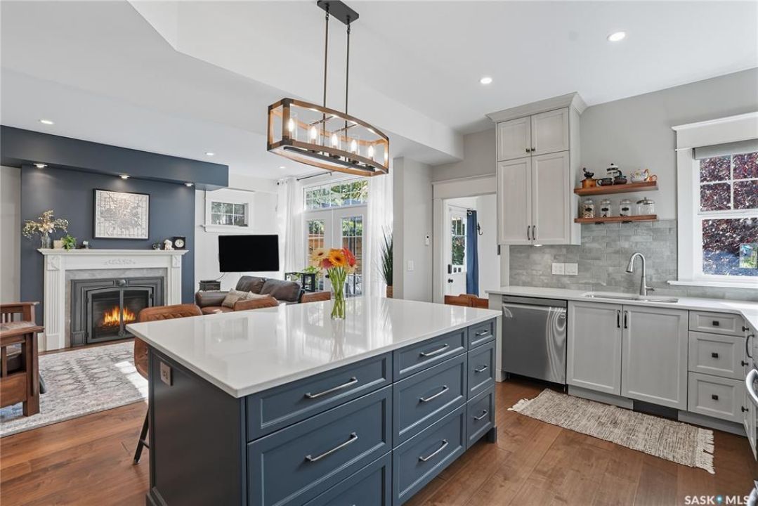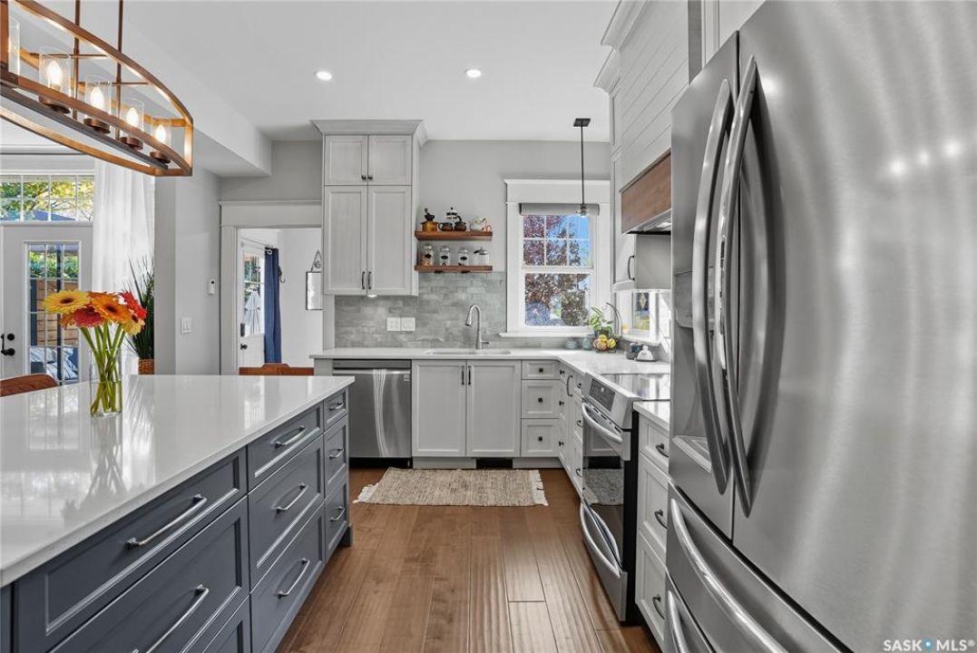 THANKSGIVING OPEN HOUSE! SATURDAY 1:00PM-2:30PM. This stunning 2-storey, 2,273 sq. ft. home is located in the highly desirable Nutana neighborhood and has been thoughtfully transformed with extensive renovations. The main floor features a completely updated custom kitchen with quartz countertops, a spacious island with double-sided storage, a custom pantry door, matching mudroom door, floating shelves, and brand-new appliances. Gorgeous hardwood floors flow throughout the main and upper levels. The living room, adjacent to the kitchen, boasts a cozy gas fireplace, while the family room, dining room, and a convenient 2-piece bathroom complete the main level. Upstairs, you'll find three bedrooms, including a remodeled primary ensuite with a luxurious walk in shower with bench, heated electric floors, updated vanity, all-new fixtures plus heated floors, an updated 4-piece bathroom, a convenient second-floor laundry room with new cabinets and countertops, and a charming sitting/reading nook. The lower level offers ample space for entertainment and hobbies with a theater room, rec room, bedroom, 4-piece bathroom, work/craft room with laundry, and a wine room. Outside, enjoy a serene retreat with a pergola on the deck, beautiful perennials, and meticulously landscaped grounds. The fully insulated and heated double detached garage adds the perfect finishing touch. Other notable features and renovations since 2022: New gas furnace (2022), all interior and exterior updated light fixtures, hardwoods and tile flooring on main and upper, window treatment on main and upper, new paint throughout, carpet on both stairs and lower level theater room, bedroom, hot tub hookup and cement pad. There are heated floors in the kitchen, mudroom and front entrance with boiler heat. With so many thoughtful updates and high-end finishes throughout, this home is truly move-in ready.