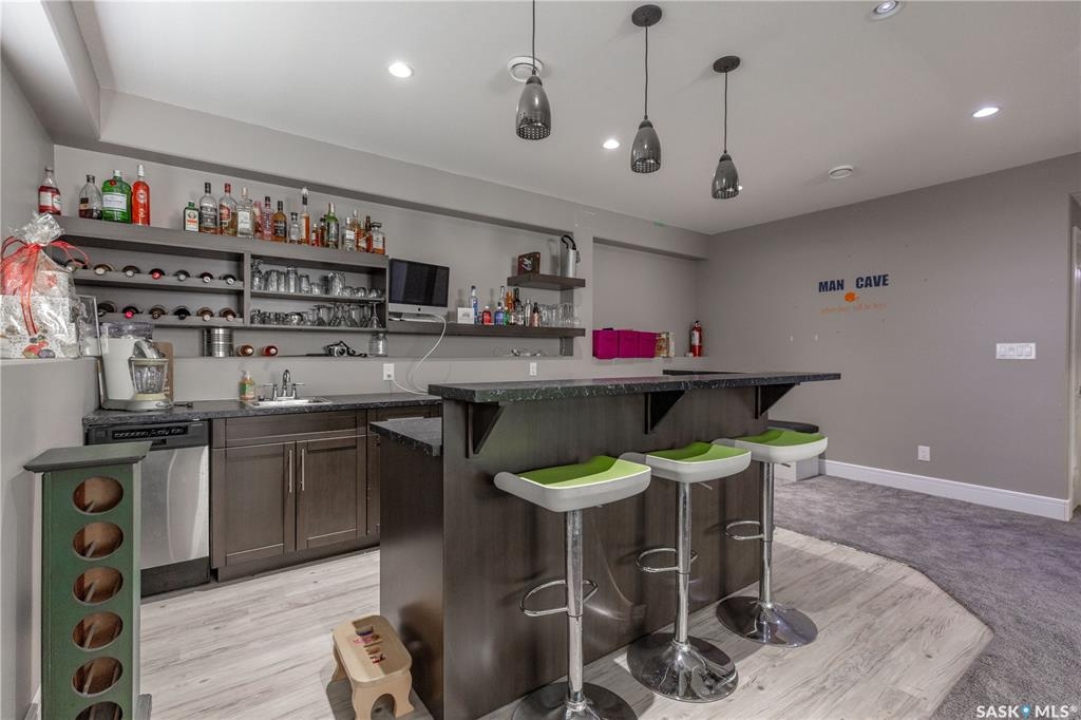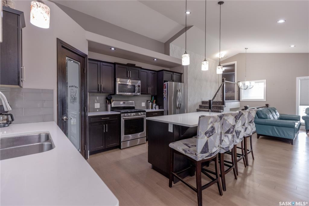Welcome to 211 Sauer Crescent in beautiful evergreen! This 1,459 sqft modified bi-level is the kind of home that balances family function with a little bit of flair. Set on a large corner lot, you'll enjoy extra outdoor space for kids, pets, or your dream garden. The fully fenced yard, deck, and heated double attached garage make everyday life just a little easier (and warmer in the winter). Inside, the open-concept main floor invites connection. The spacious kitchen boasts quartz countertops, plenty of storage, and a layout that flows right into the living and dining areas. A gas fireplace adds the perfect touch of cozy for movie nights or lazy Sundays. With 4 bedrooms and 3 bathrooms, there's room for everyone to spread out. The primary suite features a 5-piece ensuite and a walk-in closet—big enough to keep you organized, even if you're not a minimalist. Head downstairs and you'll find the ultimate hangout zone: a full wet bar complete with floating shelves, built-in fridge, dishwasher, and built-in speakers. Whether you're hosting friends, family, or just yourself and the game, this lower level is designed for good times. Evergreen is one of Saskatoon's most family-friendly neighbourhoods, with schools, parks, trails, and all the amenities you need just a short drive away. If you've been hunting for a home that's practical, stylish, and ready for your next chapter, this one might just be the perfect fit. Come take a look—you'll see why Evergreen feels like home!