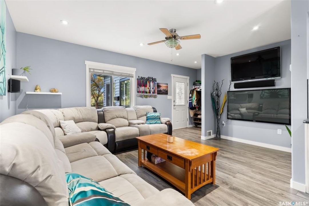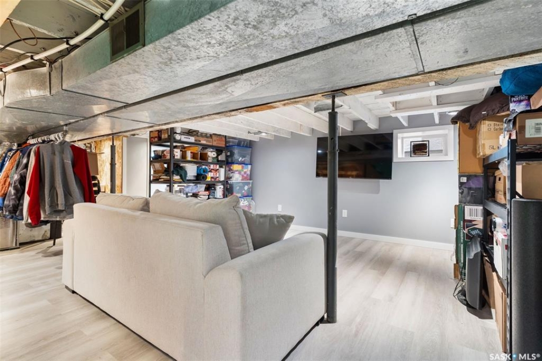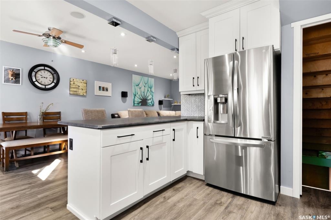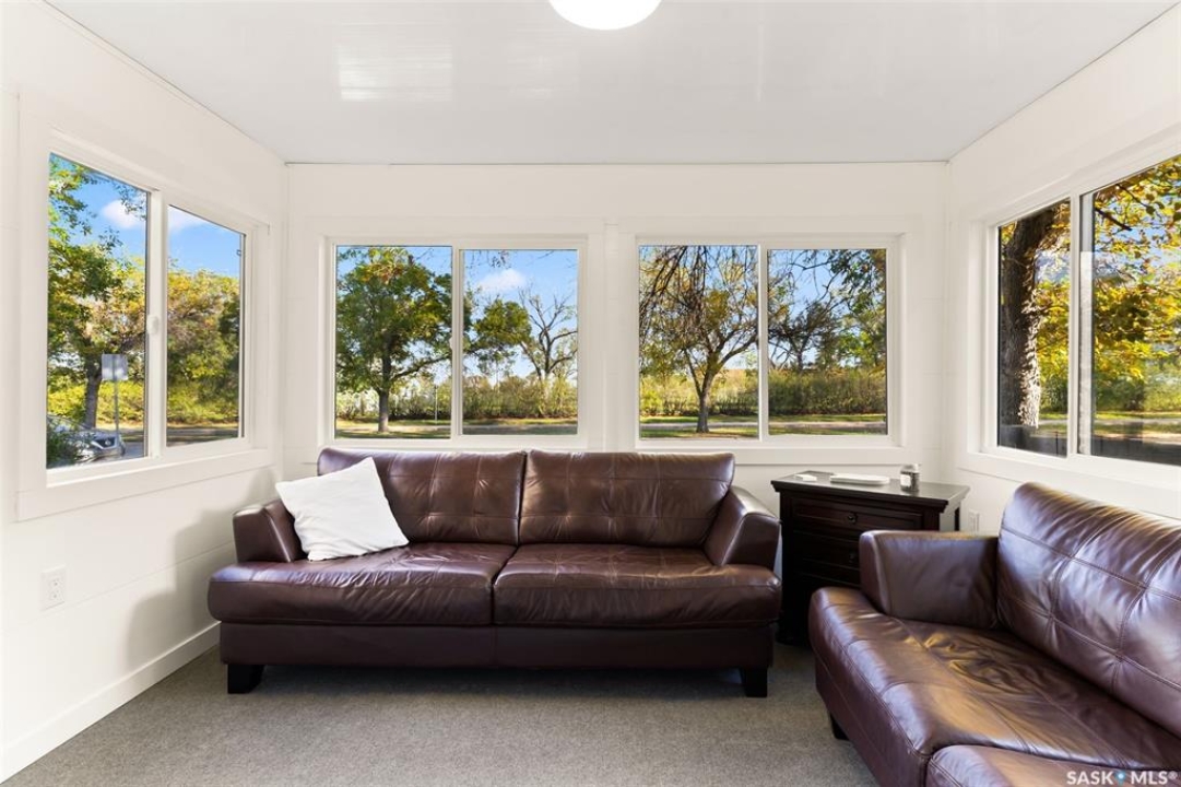 Nestled in the heart of the Historic Cathedral neighbourhood and perfectly positioned across from a lush green space, this charming and thoughtfully updated home blends character with modern convenience. Step into the bright, recently remodeled sunroom that faces the park—wired for electricity and built on screw piles—offering a cozy retreat with a view. The peninsula kitchen is a standout, featuring newer cupboards, crisp white cabinetry, a stylish herringbone tile backsplash, stainless steel appliances including a fridge with ice and water, and elegant pendant lighting. Throughout the home, you'll find all new fixtures, pot lights, fresh trims, and newer PVC windows that flood the space with natural light. Built-in speakers enhance the kitchen, dining area, and both upstairs bedrooms. The upper level hosts a spacious principal bedroom with a walk-in closet, a second bedroom, and a beautifully updated four-piece bath complete with a deep soaker tub and tile surround. Downstairs, the newly poured concrete slab is complemented by reinforced walls, and spray foam insulation throughout. The basement also features a new 100 amp panel with ample capacity, a laundry area, a cozy space ideal for a TV room, and a convenient two-piece bathroom. Outside, enjoy the expansive 14 x 20 composite deck with aluminum railing, a unique garden shed on the east side, and underground sprinklers in the backyard. The 22 x 26 heated and insulated garage, built in 2008 and finished with OSB, adds even more value, along with newer shingles on the house for peace of mind. This fine property is close to parks, bus routes, Mosaic Stadium and all Downtown amenities. Call your Relator for more information or personal tour.