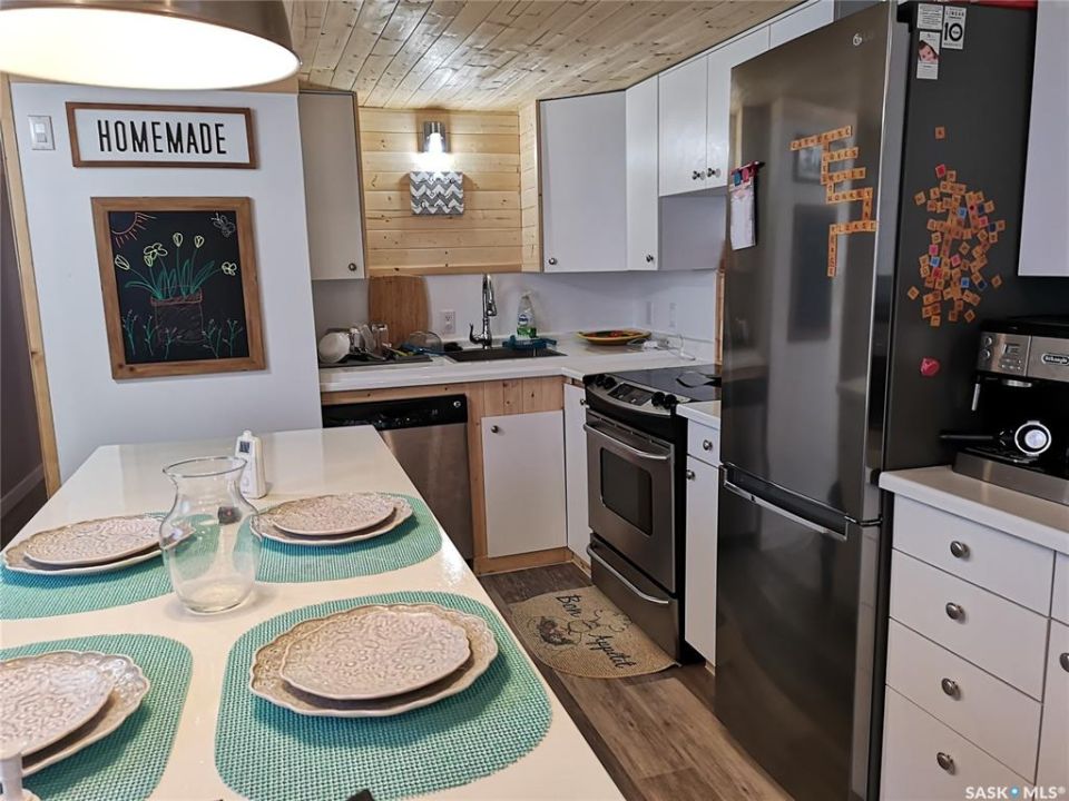 709 2nd Ave West, Kindersley. The perfect investment property is waiting for you! This cozy, fully renovated mobile home is situated on an owned lot and offers a large fully fenced yard with a heated 22x24 detached garage built in 1999. The home is a 2 bedroom, 1 bath and approximately 696 square feet. Major updates include the kitchen, drywall, furnace, water heater, windows and bathroom. The walls and ceiling have been insulated. Other features/updates include flooring, electrical, central air and all fixtures. Current tenants in place until January 2026. Take over this amazing rental and make some great income! Call today for more details and to schedule your tour.