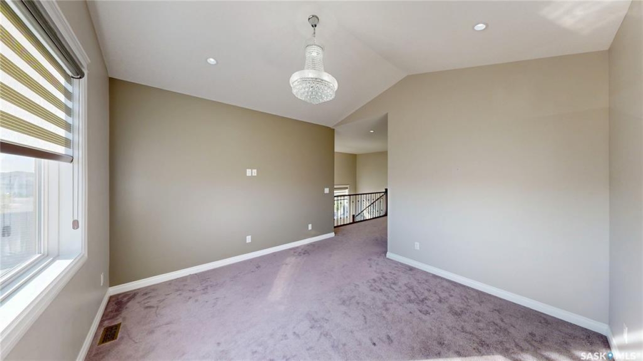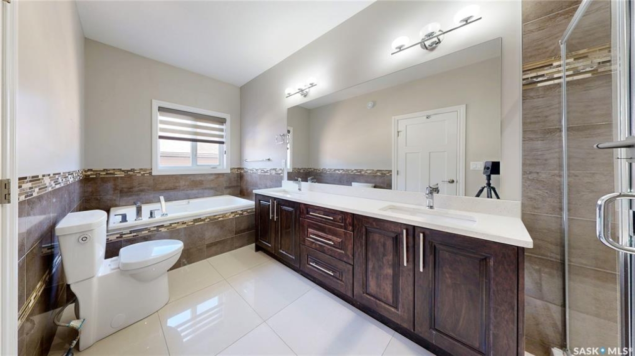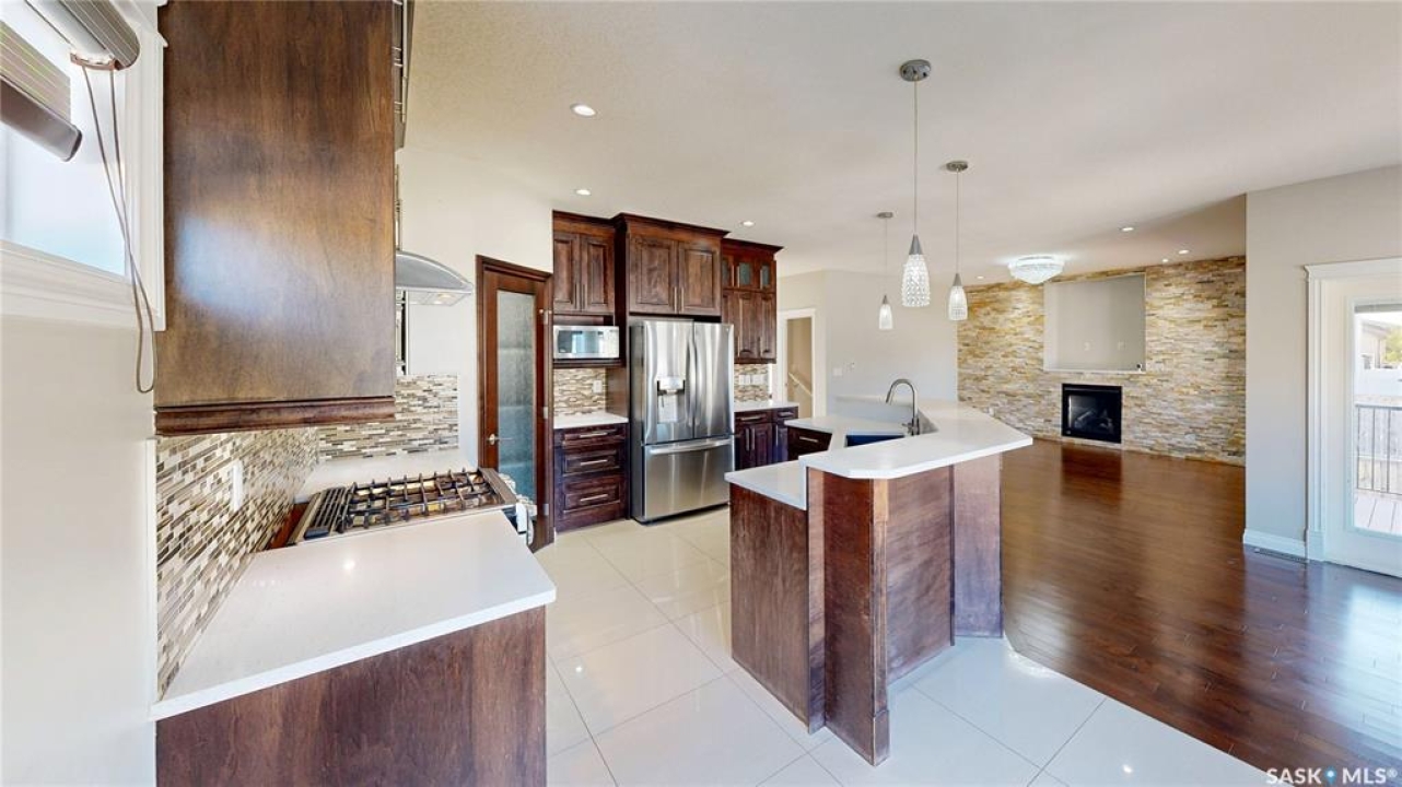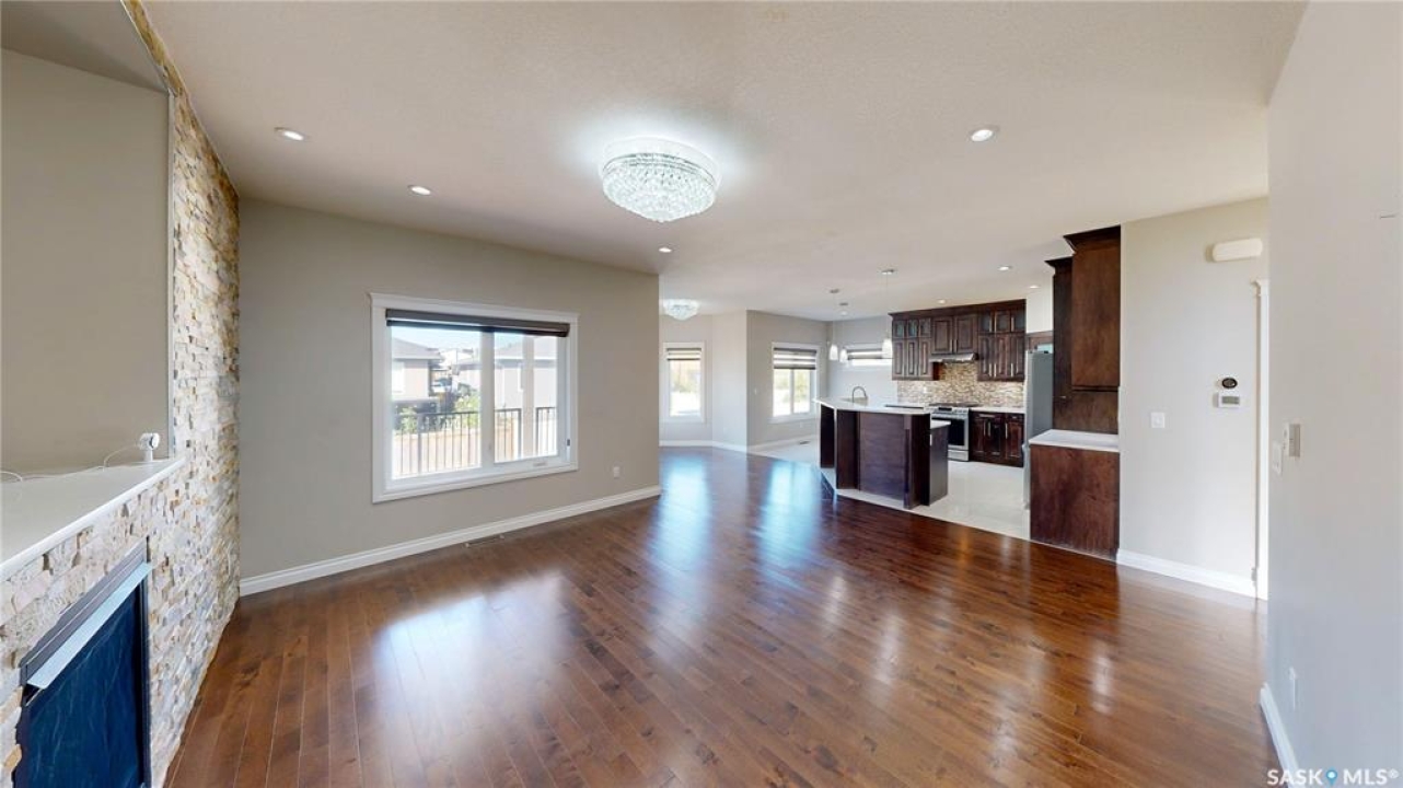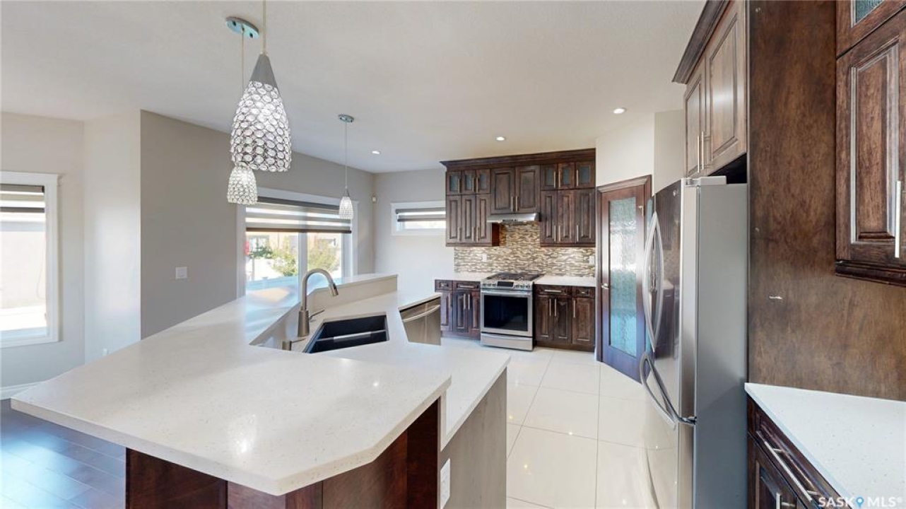 Welcome to your dream home! an elegant family home located in the vibrant Harbour Landing neighborhood. 2017 built, 2379 square foot, 5 bedroom 4 bathroom, 2 story house sits on a 40 x 115 rectangular lot. The front yard has a double concrete driveway that leads to the 24 x 24 heated and insulated double attached garage. The fully fenced backyard features a spacious deck, lush lawn, raised garden boxes, and a versatile patio area. Ideal for outdoor dining, entertaining, or evenings around a firepit. Upon entering, you are welcomed by a grand foyer embellished with an elegant chandelier, a coat closet, bench space, and convenient direct access to the garage. The main floor features a flexible first bedroom and a 4-piece bathroom, ideal for guests or as a home office. The heart of the home is the warm and inviting living room, accentuated by a striking brick feature wall, a cozy gas fireplace, and gleaming hardwood flooring. The adjoining kitchen includes an island with bar seating, a corner pantry, a modern tile backsplash, ample cupboard and drawer space, and sleek stainless steel appliances. The kitchen seamlessly transitions into the bright dining area, where three large windows frame serene views of the backyard, creating an ideal setting for family meals. On the upper level, the first stop is the 3-piece bathroom featuring a rainfall shower head, followed by a generously sized bedroom complete with its own closet. The luxurious primary suite offers a walk-in closet with built-in shelving and drawers, along with a spa-inspired 5-piece ensuite bathroom that includes a deep soaker tub, dual vanity, a spacious glass shower with a rainfall showerhead and storage space. A unique windowed nook within the primary bedroom provides a tranquil corner for reading or relaxation. The fully finished basement is designed as a private secondary suite with its own separate side entrance, making it perfect for multi-generational living or generating rental income.