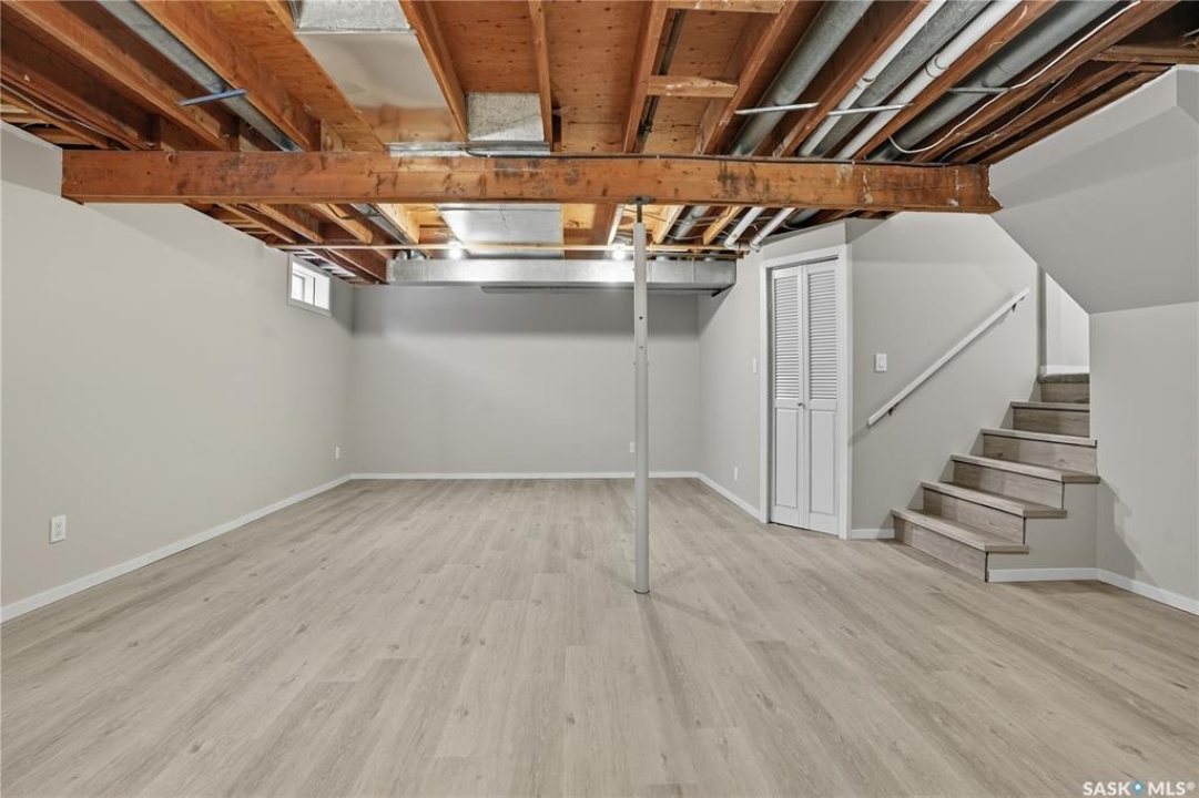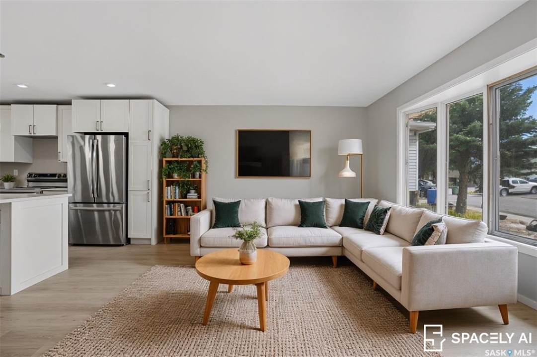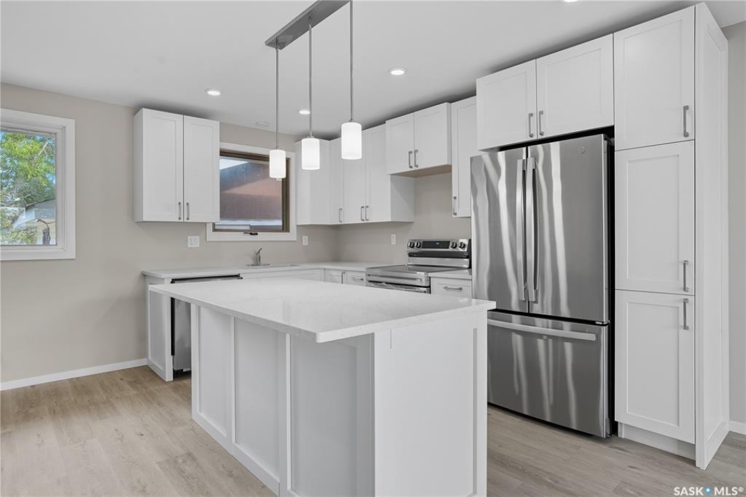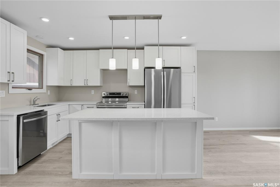 Welcome to this completely renovated 1,300 sq. ft. four-level split in Uplands, offering modern finishes, thoughtful design, and a prime location backing green space. The main floor features an inviting front foyer leading to a spacious living room with a bright bay window. The open-concept layout showcases stunning vinyl plank flooring throughout, with a beautifully updated kitchen at the heart of the home. Here you'll find a large island, white cabinetry with soft-close doors and drawers, quartz countertops, stainless steel appliances, and a pantry beside the fridge. The sink overlooks the backyard, while the dining area sits just off the kitchen, making it ideal for entertaining. Convenient main-floor laundry and direct yard access complete this level. Upstairs, the second level offers plush new carpeting, two comfortable bedrooms, and a stylish 4-piece bathroom with a tiled tub surround. The third level includes two more bedrooms with matching carpet and a convenient 2-piece bathroom. On the fourth level, you'll find the mechanical room and a spacious rec room perfect for family movie nights or a play area. Outside, the fully fenced backyard backs onto green space, offering extra privacy and room to enjoy. A single detached garage provides secure parking and additional storage. This move-in ready home combines modern updates with a functional family layout—all in a welcoming neighbourhood close to schools, parks, and amenities.