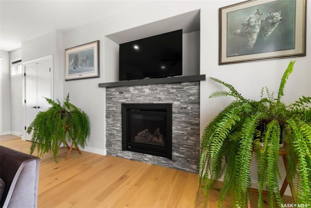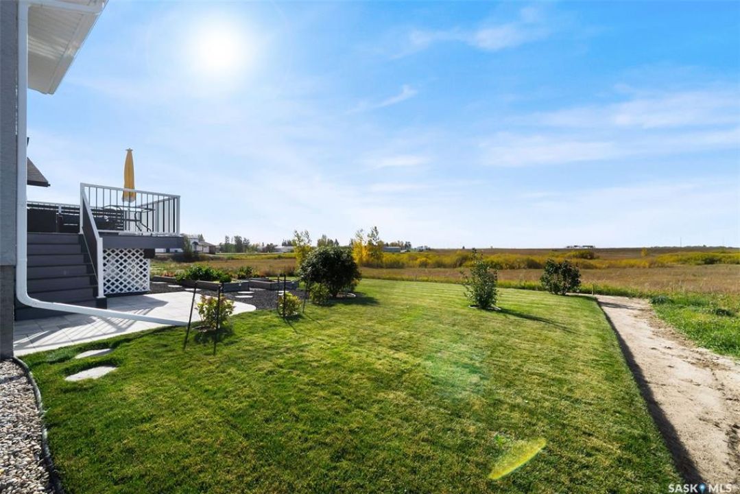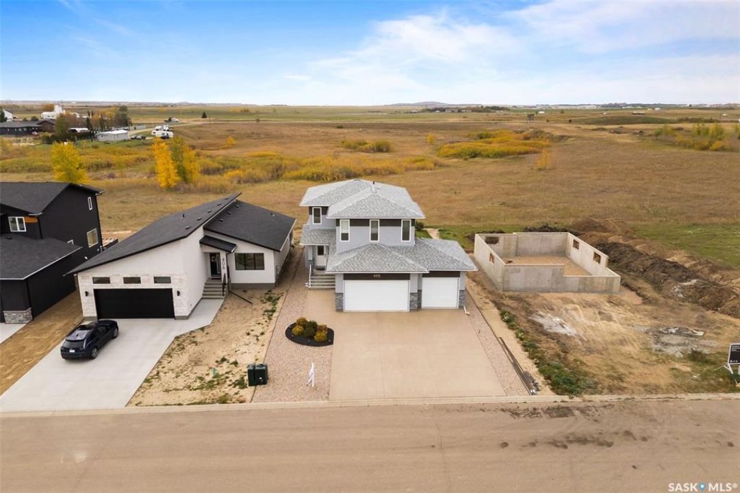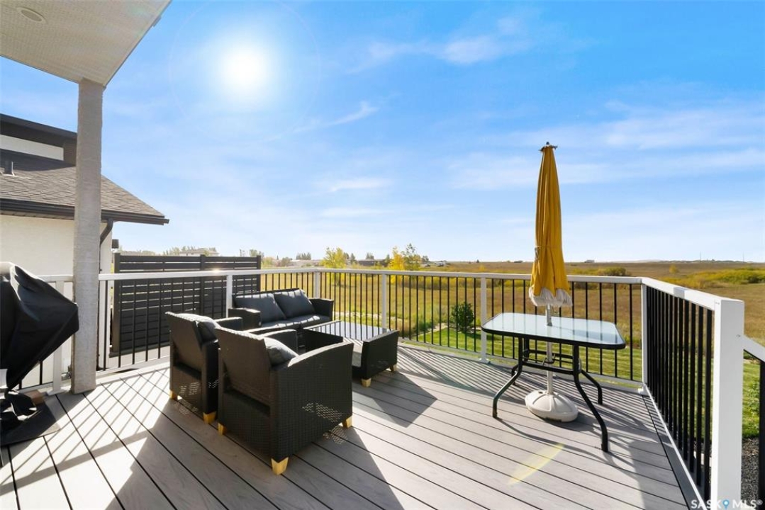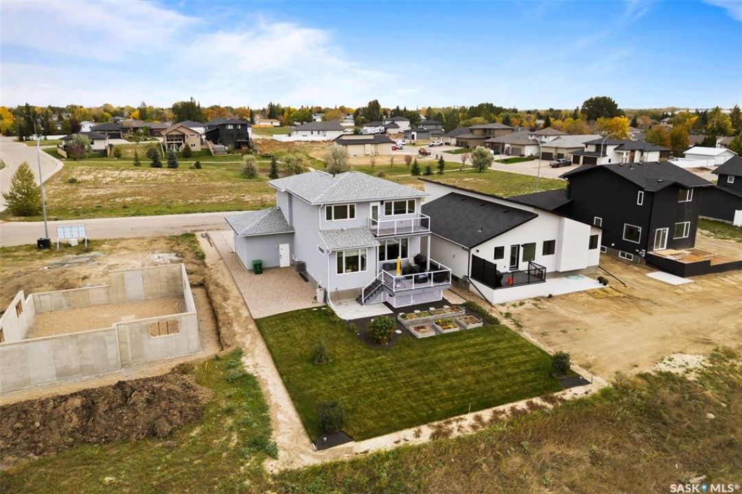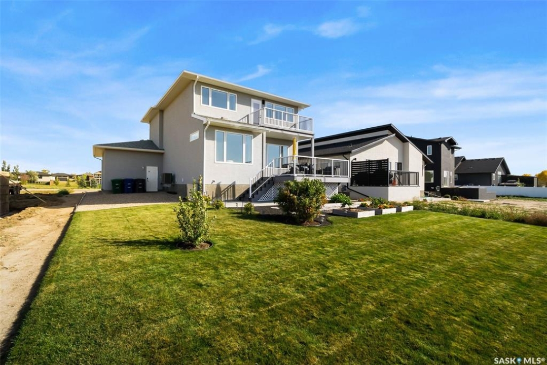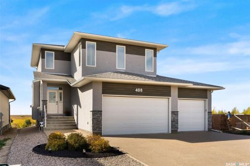 Welcome to 408 Hillside Drive in Pilot Butte! Built in 2020, this impressive 2-storey home offers over 1,700 sq. ft. of thoughtfully designed living space plus a triple attached garage. With modern finishes, premium upgrades, and a prairie backdrop, it's the perfect blend of style, comfort, and functionality. The main floor showcases an open-concept layout with engineered hardwood flooring and 2x6 construction on 16” centers. A bright living room centers around a remote-controlled gas fireplace with stone surround, while oversized windows fitted with Hunter Douglas top-down/bottom-up blinds capture expansive views. The chef's kitchen boasts quartz countertops, custom cabinetry with under-cabinet lighting, subway tile backsplash, stainless steel appliances including a granite sink, a large island, and walk-in pantry. The dining area opens onto a spacious deck, ideal for entertaining, while a powder room and mudroom with laundry complete this level. Upstairs, the primary suite impresses with 10' ceilings, a walk-in closet, and spa-inspired ensuite with dual sinks and custom tiled shower. Two additional bedrooms, a full bath, and a bonus room with balcony access offer versatility for family living. The basement is open for development, with exterior walls spray-foamed and drywalled—ready for your personal touch. Notable upgrades include a whole-home water filtration system, surge protection, central A/C, on-demand hot water, and hot/cold water taps in the garage. Curb appeal shines with a fully insulated triple garage, exposed aggregate driveway, and beautifully landscaped yard. The backyard retreat features underground sprinklers, raised garden beds, lush lawn, a composite deck, and tiled patio backing green space—perfect for enjoying Saskatchewan sunsets. This home combines quality construction, thoughtful upgrades, and an unbeatable Pilot Butte location. Truly move-in ready for its next proud owner. NOTE: 2 outdoor cameras are NOT included