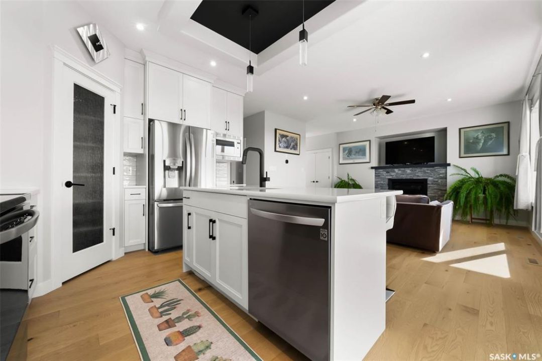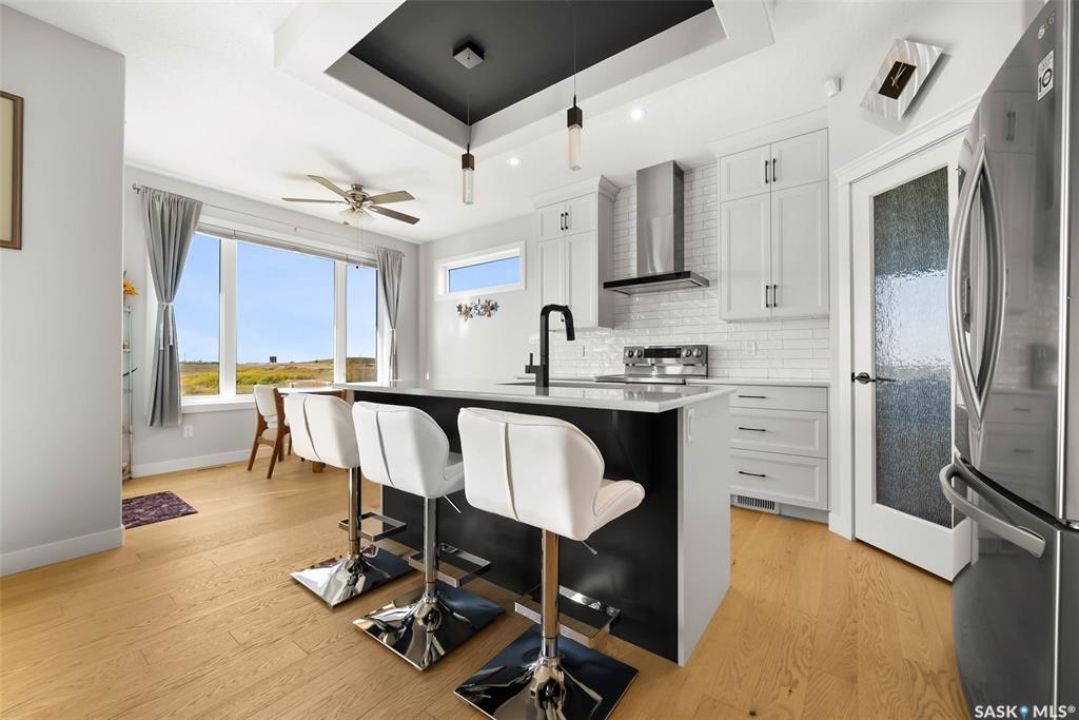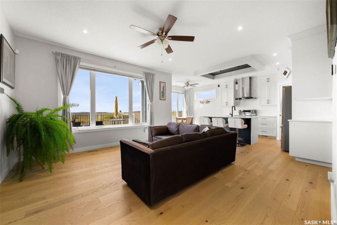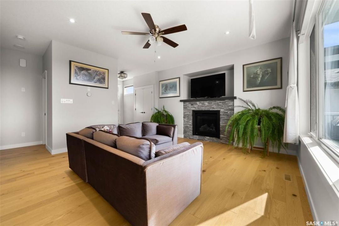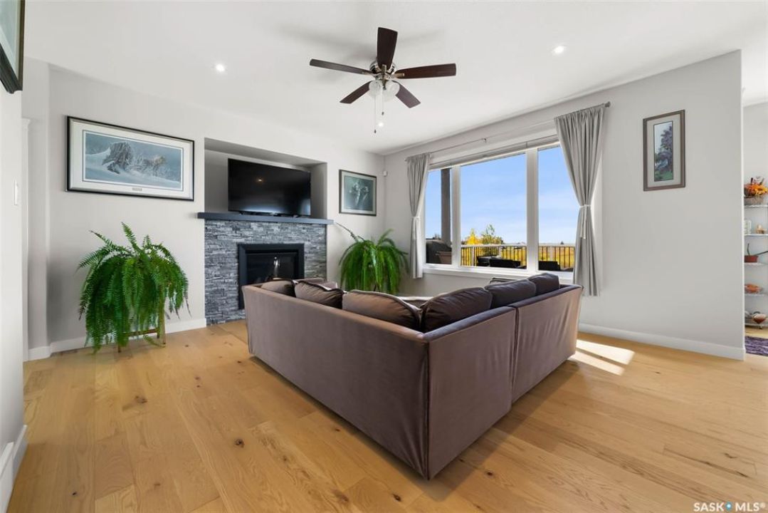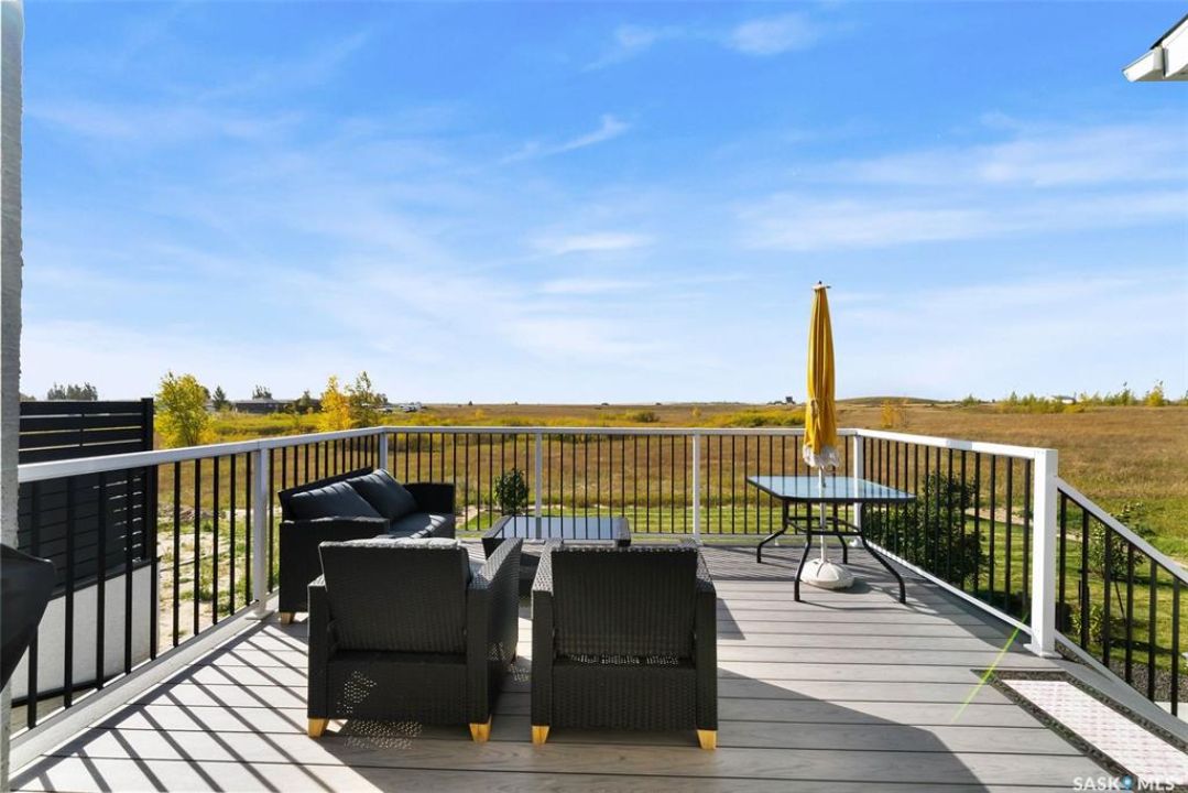 Welcome to 408 Hillside Drive in Pilot Butte! Built in 2020, this impressive 2-storey home offers over 1,700 sq. ft. of thoughtfully designed living space plus a triple attached garage. With modern finishes, premium upgrades, and a prairie backdrop, it's the perfect blend of style, comfort, and functionality. The main floor showcases an open-concept layout with engineered hardwood flooring and 2x6 construction on 16” centers. A bright living room centers around a remote-controlled gas fireplace with stone surround, while oversized windows fitted with Hunter Douglas top-down/bottom-up blinds capture expansive views. The chef's kitchen boasts quartz countertops, custom cabinetry with under-cabinet lighting, subway tile backsplash, stainless steel appliances including a granite sink, a large island, and walk-in pantry. The dining area opens onto a spacious deck, ideal for entertaining, while a powder room and mudroom with laundry complete this level. Upstairs, the primary suite impresses with 10' ceilings, a walk-in closet, and spa-inspired ensuite with dual sinks and custom tiled shower. Two additional bedrooms, a full bath, and a bonus room with balcony access offer versatility for family living. The basement is open for development, with exterior walls spray-foamed and drywalled—ready for your personal touch. Notable upgrades include a whole-home water filtration system, surge protection, central A/C, on-demand hot water, and hot/cold water taps in the garage. Curb appeal shines with a fully insulated triple garage, exposed aggregate driveway, and beautifully landscaped yard. The backyard retreat features underground sprinklers, raised garden beds, lush lawn, a composite deck, and tiled patio backing green space—perfect for enjoying Saskatchewan sunsets. This home combines quality construction, thoughtful upgrades, and an unbeatable Pilot Butte location. Truly move-in ready for its next proud owner. NOTE: 2 outdoor cameras are NOT included