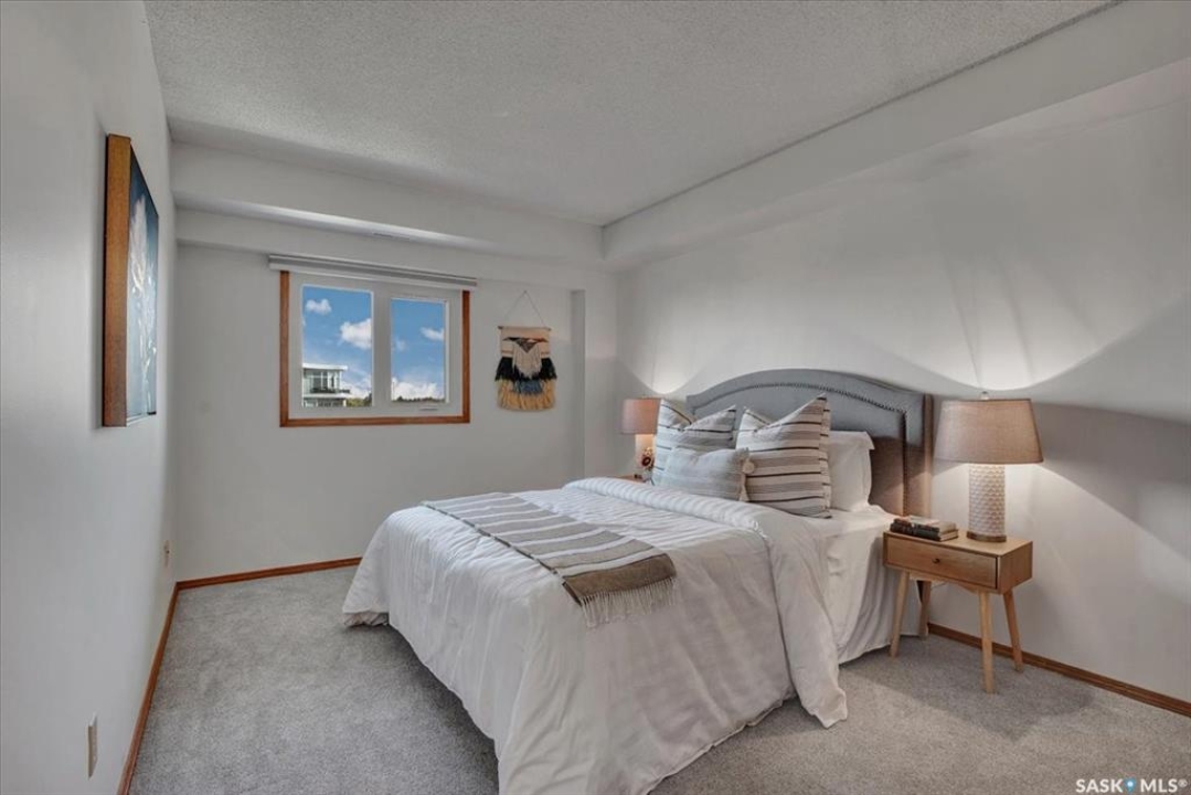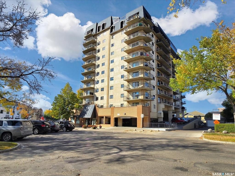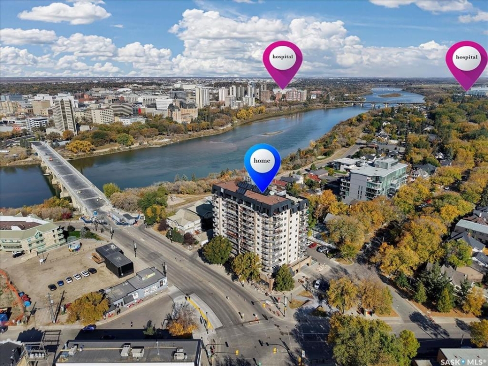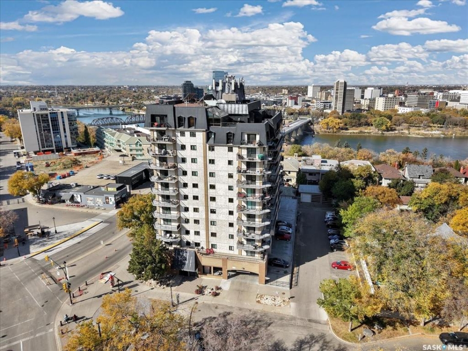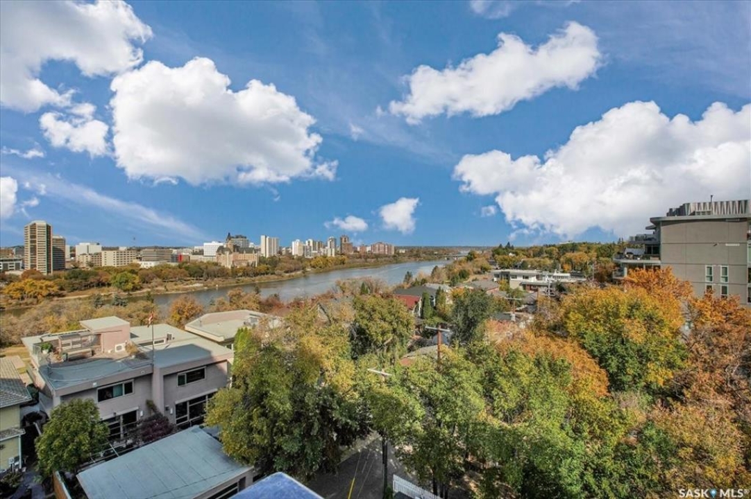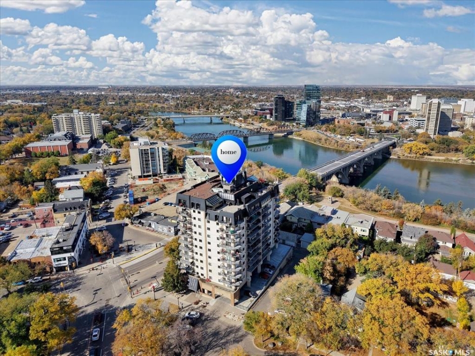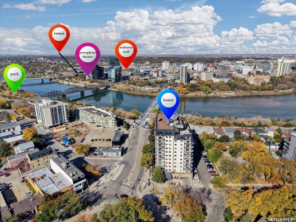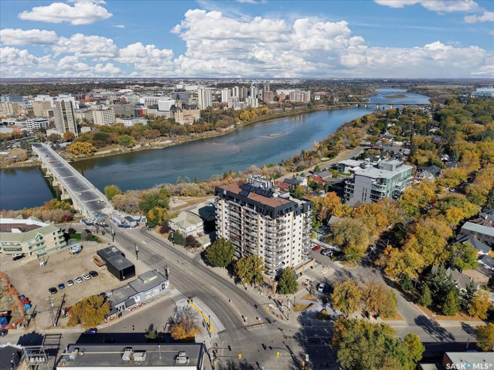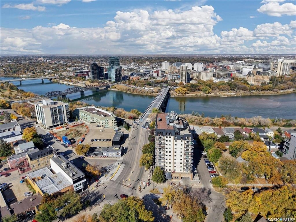 Perched on the 7th floor at the top of the iconic Broadway Bridge, this spacious 2-bedroom, 1-bathroom condo offers the ultimate blend of city living and riverside tranquility. Step out your door and you're moments away from the heart of downtown, where boutique shops, vibrant restaurants, and cozy cafes line the streets. Or head down Broadway itself, alive with pubs, live music, and eclectic local flair. Just beyond your balcony, the river glistens over the treetops—your own private view of Saskatoon's scenic riverbank and all its walking trails. Inside, the generous living space opens up to a balcony that lets you soak in sweeping views of the water and skyline. Whether you're hosting a dinner in the dedicated dining room, unwinding in the large primary bedroom, or settling guests into the second bedroom, there's room to relax and recharge. The 4-piece bathroom offers both comfort and convenience, while the well-equipped kitchen is ready for your morning coffee or evening culinary adventures. When you're not enjoying the festivals and fairs just steps from your building, take advantage of the condo's amenities room—a great spot for gathering with friends, family, or fellow residents. Your unit also comes with one secure underground parking space, complete with a handy storage locker right in front. This is more than just a condo—it's a lifestyle at the center of everything.