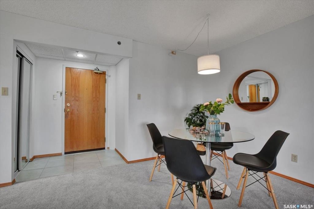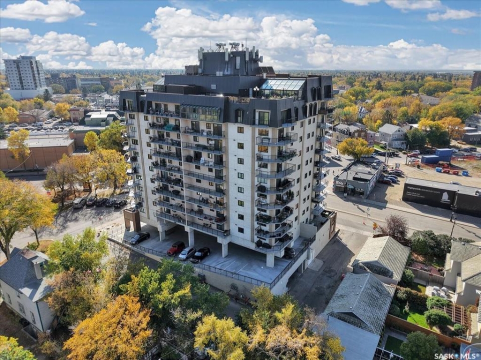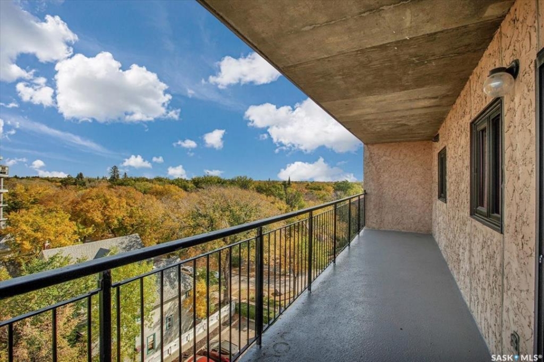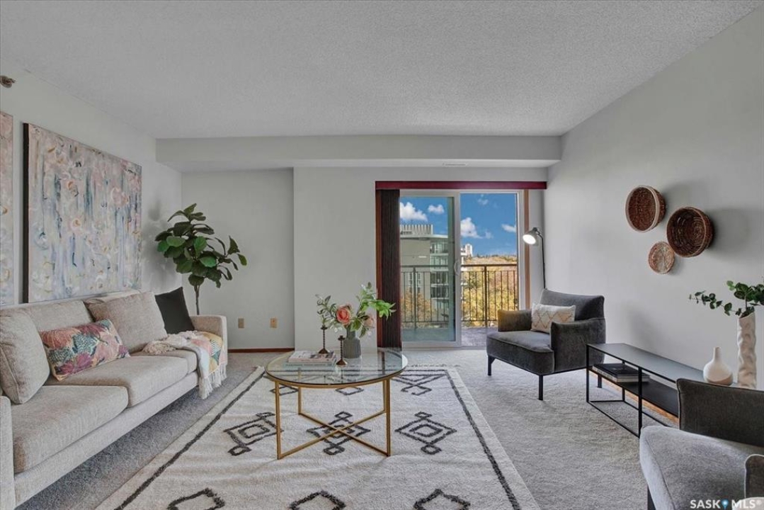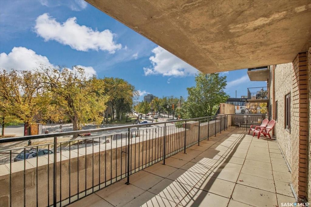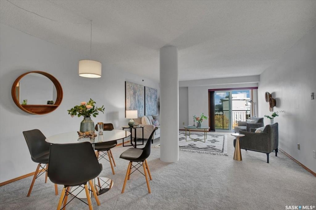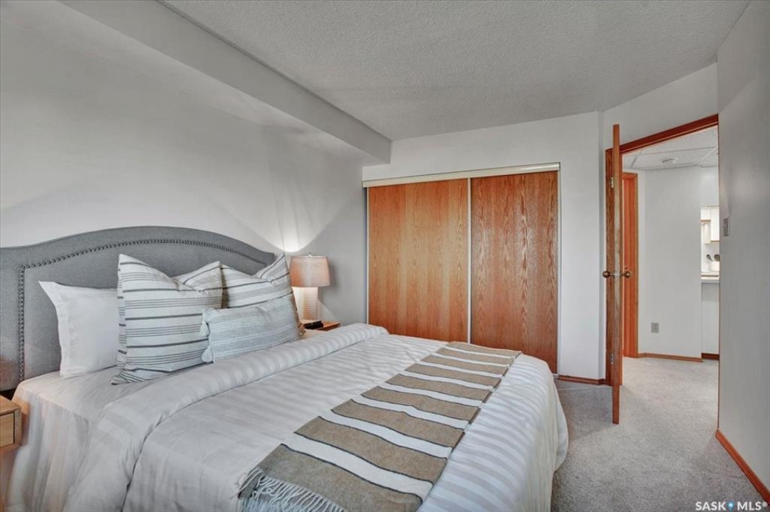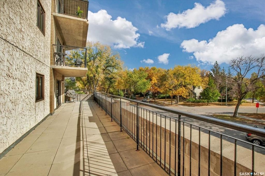 Perched on the 7th floor at the top of the iconic Broadway Bridge, this spacious 2-bedroom, 1-bathroom condo offers the ultimate blend of city living and riverside tranquility. Step out your door and you're moments away from the heart of downtown, where boutique shops, vibrant restaurants, and cozy cafes line the streets. Or head down Broadway itself, alive with pubs, live music, and eclectic local flair. Just beyond your balcony, the river glistens over the treetops—your own private view of Saskatoon's scenic riverbank and all its walking trails. Inside, the generous living space opens up to a balcony that lets you soak in sweeping views of the water and skyline. Whether you're hosting a dinner in the dedicated dining room, unwinding in the large primary bedroom, or settling guests into the second bedroom, there's room to relax and recharge. The 4-piece bathroom offers both comfort and convenience, while the well-equipped kitchen is ready for your morning coffee or evening culinary adventures. When you're not enjoying the festivals and fairs just steps from your building, take advantage of the condo's amenities room—a great spot for gathering with friends, family, or fellow residents. Your unit also comes with one secure underground parking space, complete with a handy storage locker right in front. This is more than just a condo—it's a lifestyle at the center of everything.