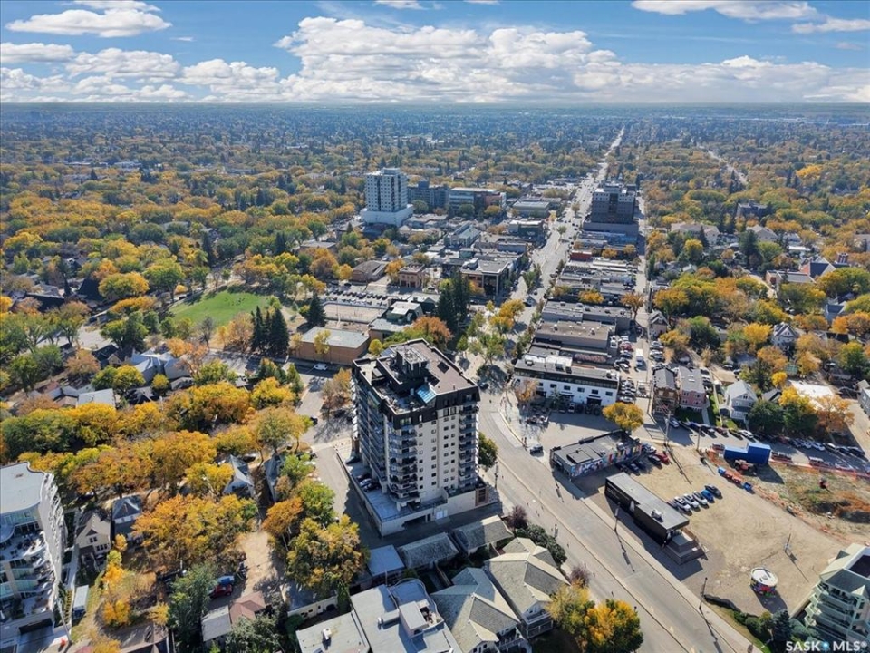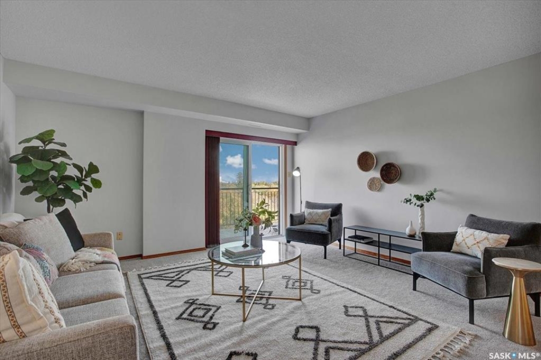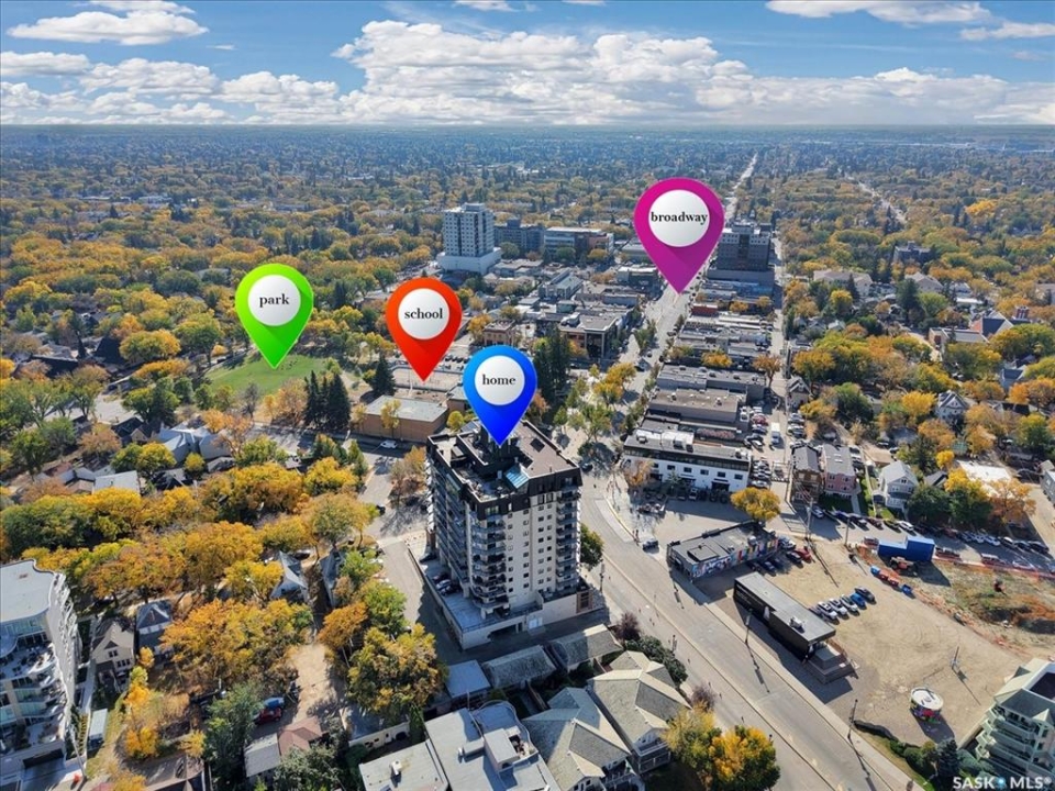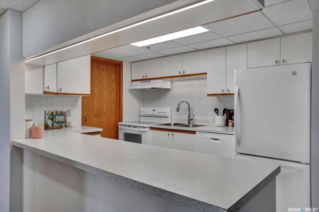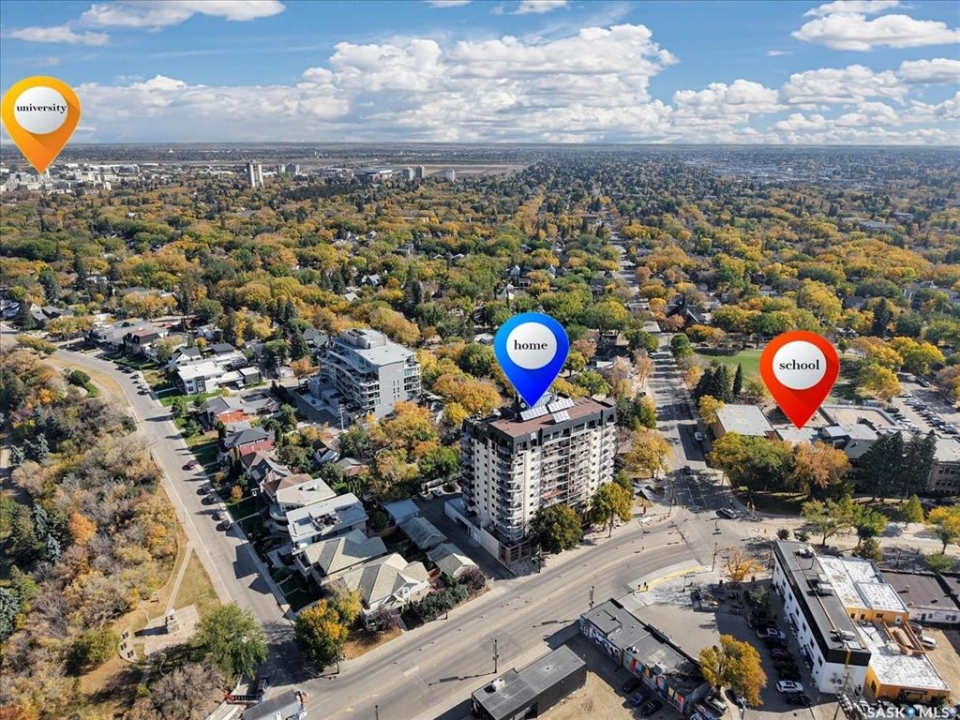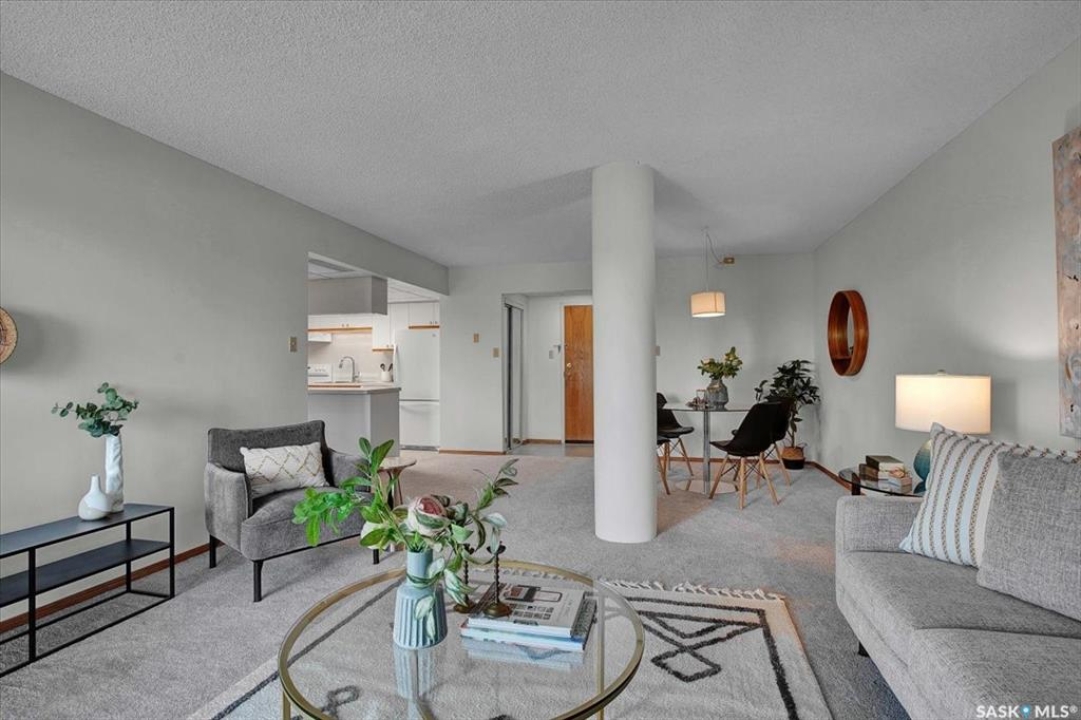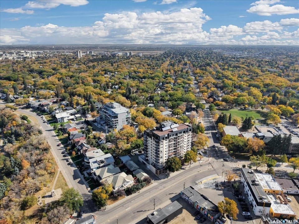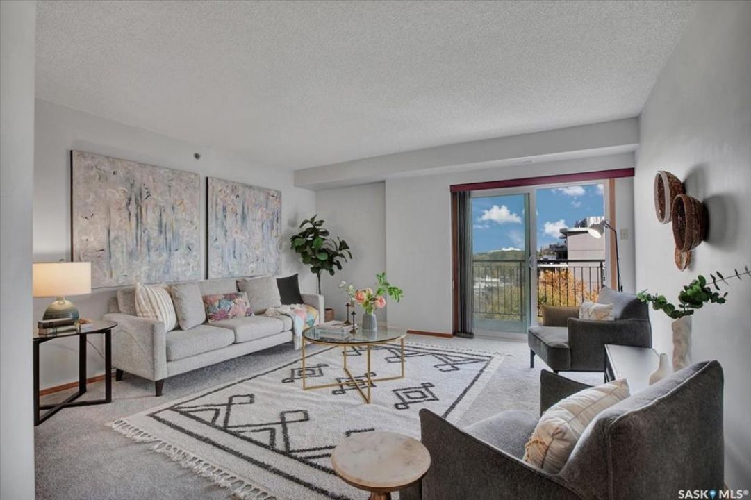 Perched on the 7th floor at the top of the iconic Broadway Bridge, this spacious 2-bedroom, 1-bathroom condo offers the ultimate blend of city living and riverside tranquility. Step out your door and you're moments away from the heart of downtown, where boutique shops, vibrant restaurants, and cozy cafes line the streets. Or head down Broadway itself, alive with pubs, live music, and eclectic local flair. Just beyond your balcony, the river glistens over the treetops—your own private view of Saskatoon's scenic riverbank and all its walking trails. Inside, the generous living space opens up to a balcony that lets you soak in sweeping views of the water and skyline. Whether you're hosting a dinner in the dedicated dining room, unwinding in the large primary bedroom, or settling guests into the second bedroom, there's room to relax and recharge. The 4-piece bathroom offers both comfort and convenience, while the well-equipped kitchen is ready for your morning coffee or evening culinary adventures. When you're not enjoying the festivals and fairs just steps from your building, take advantage of the condo's amenities room—a great spot for gathering with friends, family, or fellow residents. Your unit also comes with one secure underground parking space, complete with a handy storage locker right in front. This is more than just a condo—it's a lifestyle at the center of everything.