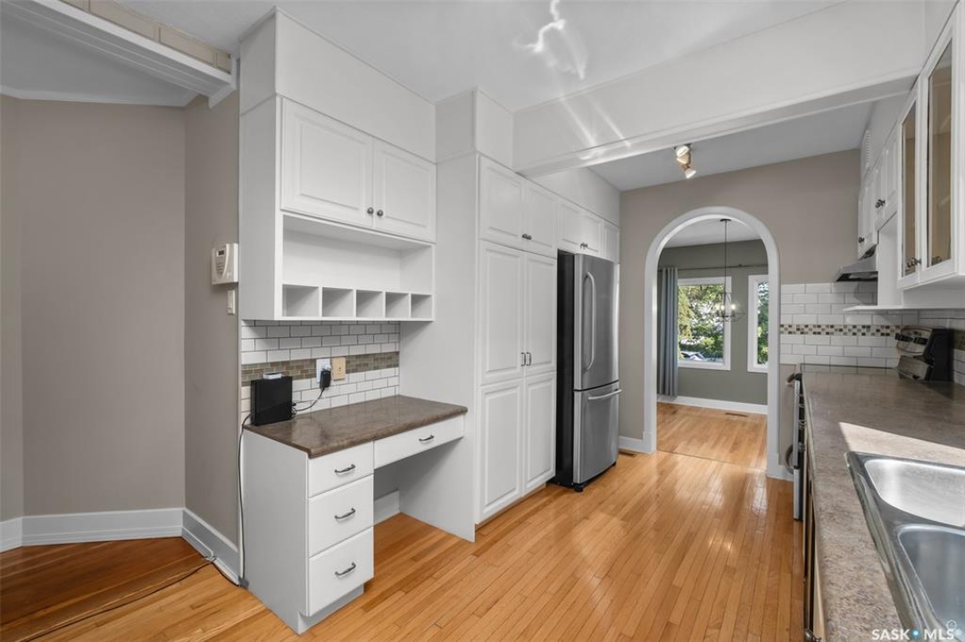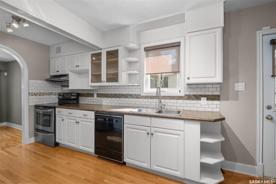 Inviting 4 bedroom and 2 bathroom bungalow located in the desirable West Hill neighbourhood! The main floor offers a large living room filled with natural light that is connected by an arched entryway to the dining area where large windows and a modern light fixture create a bright and welcoming space for family meals. Another arched entryway leads to the galleyway kitchen featuring white cabinetry, ample storage, a stylish backsplash and access to the south facing deck which is perfect for morning coffee in the sun. The main floor also includes a 4 piece bathroom with a beautifully tiled tub surround and 3 comfortable bedrooms. The fully finished basement offers a generous family room, a 4th bedroom, a 3-piece bathroom with a stand-up shower and a combined laundry/utility room. The backyard is surrounded by mature trees and has a large deck which is ideal for summer gatherings and a single detached garage adds extra convenience. Within walking distance to Shananigan's Bistro Coffee Shop, the West Hill Community Club, parks and both École St. Anne School and Arthur Pechey School. Act now and make this your next home!