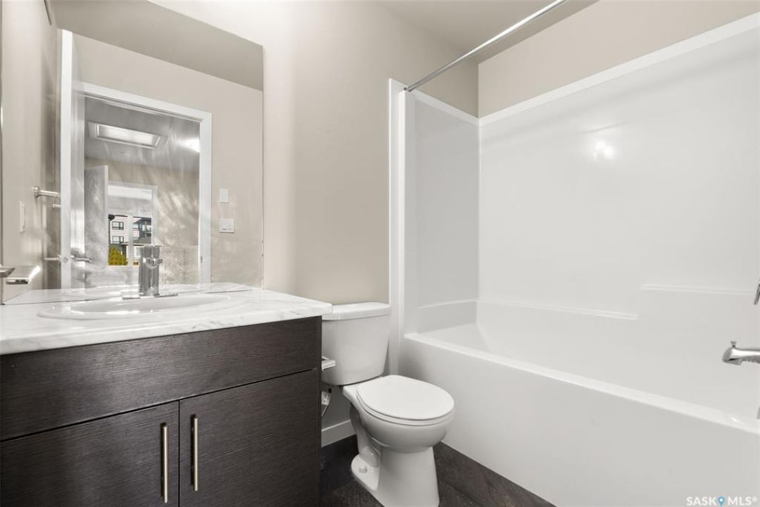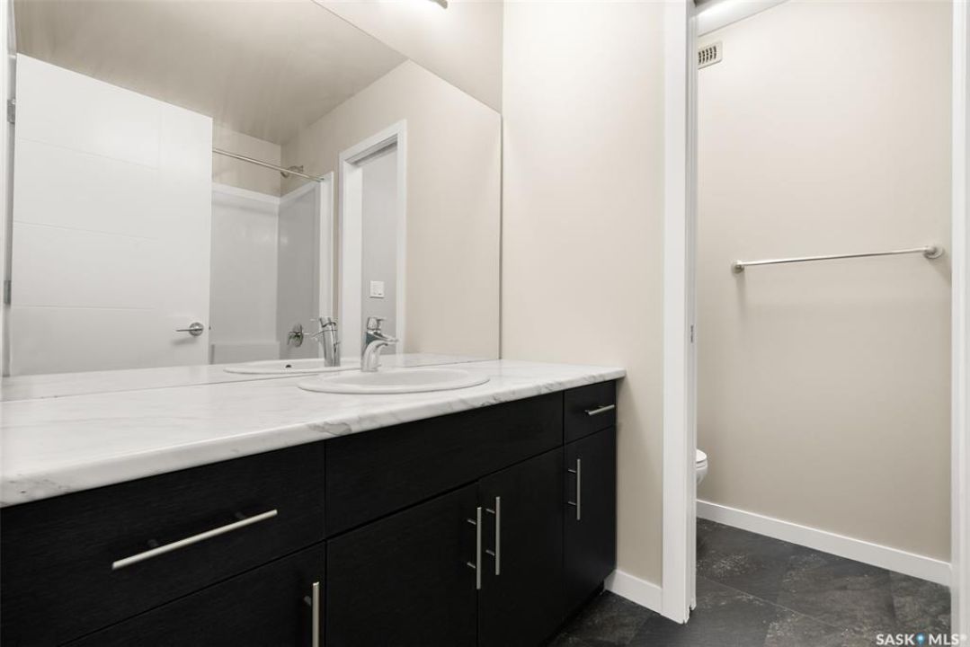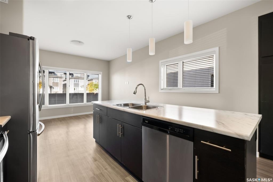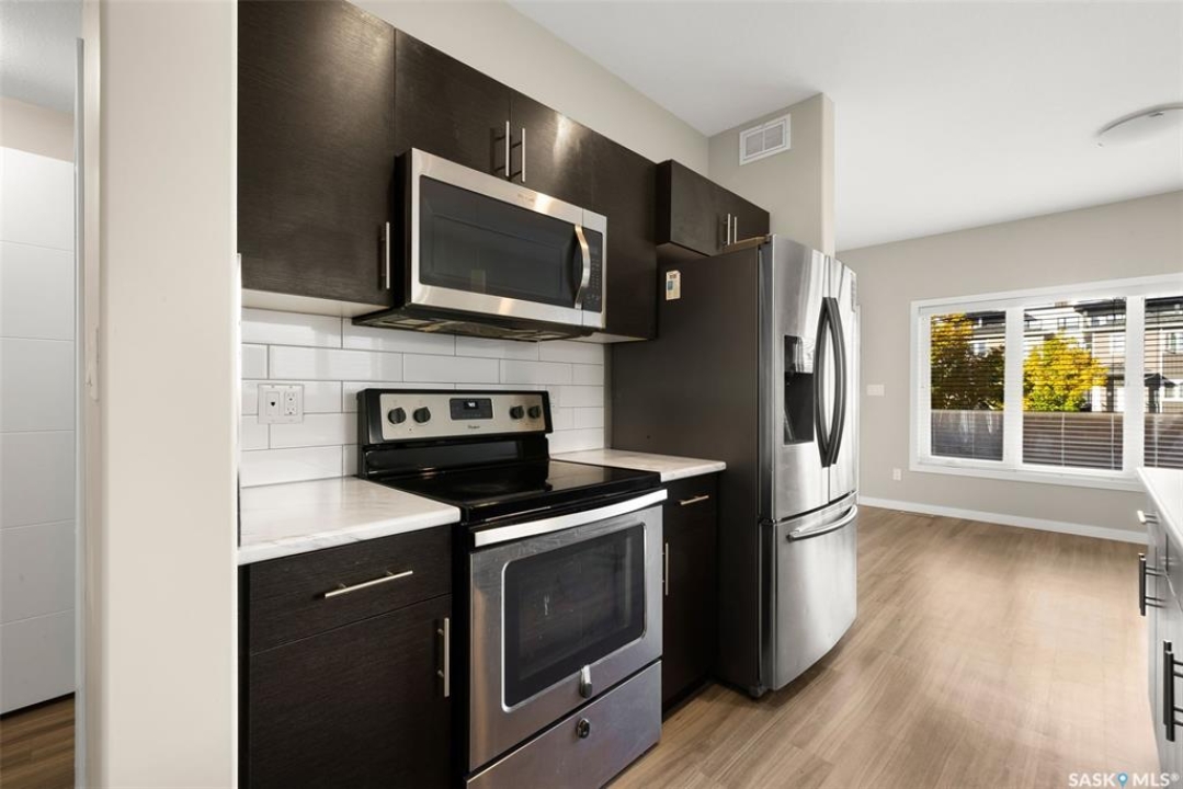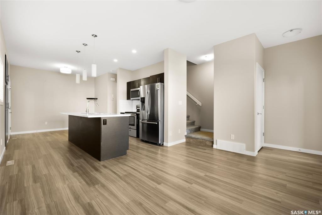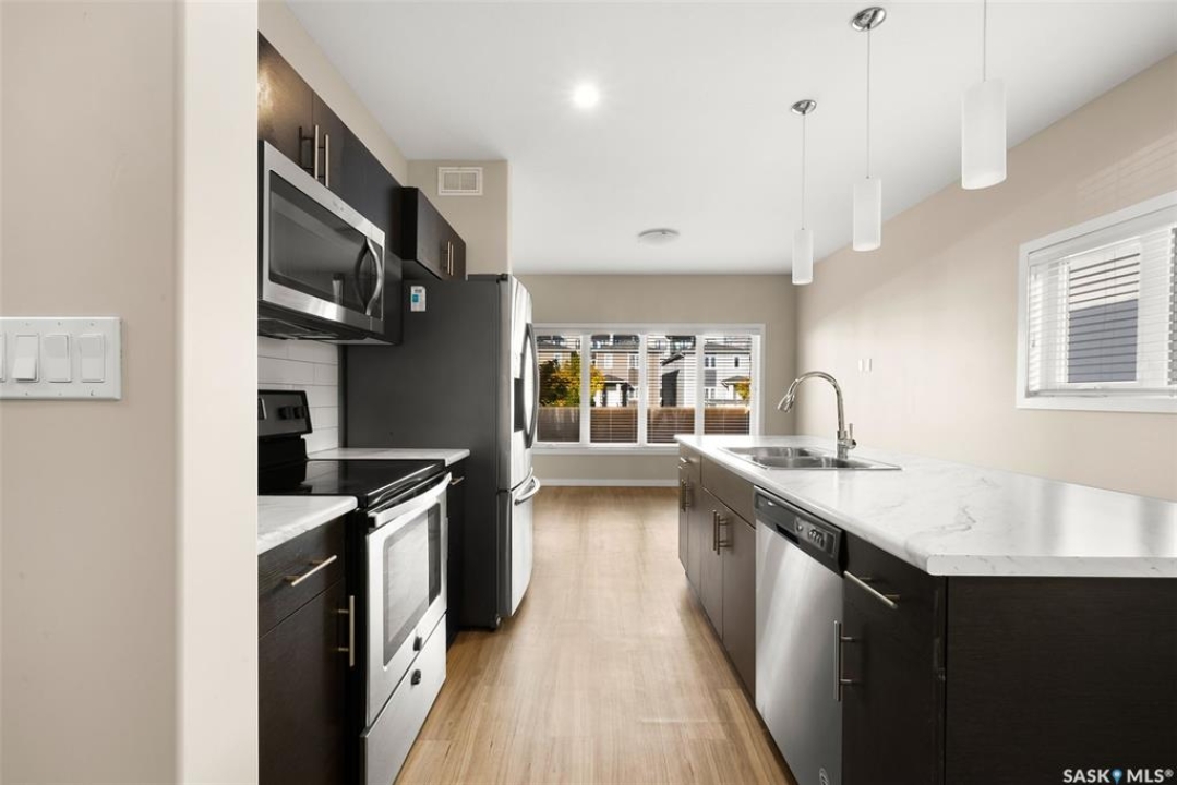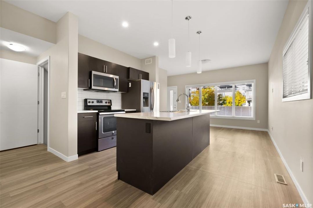 Welcome to 3917 James Hill Road, a modern and inviting two-storey townhouse located in the heart of Harbour Landing. This well-maintained home offers a functional and stylish layout with contemporary finishes throughout. The open concept main floor features a bright living room with large windows, a dining area, and a well-appointed kitchen complete with stainless steel appliances, rich cabinetry, tiled backsplash, and convenient island. Upstairs, the primary bedroom includes a walk-in closet and direct access to a spacious 4-piece ensuite bathroom. A dedicated laundry area add convenience for busy households. The fully finished basement provides a versatile rec room and a 4-piece bathroom. Outdoor living is easy with a private front patio and access to nearby parks, schools, and shopping in one of Regina's most desirable family-friendly neighborhoods. Parking is located in the shared detached garage. This property is part of a self-managed condominium. While there are no monthly condo fees, each unit owner contributes annually to condominium insurance (typically $1,000–$1,200 per year). In addition, the monthly SaskPower bill for the shared garage is approximately $10 per unit. A beautiful move-in ready option with excellent value in Harbour Landing!