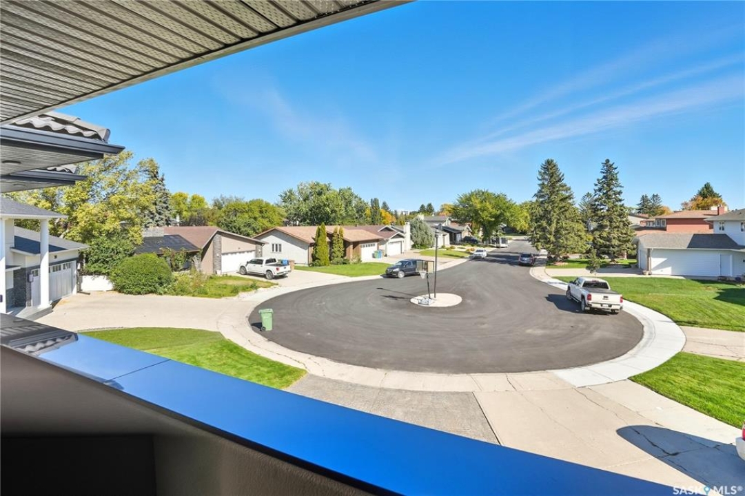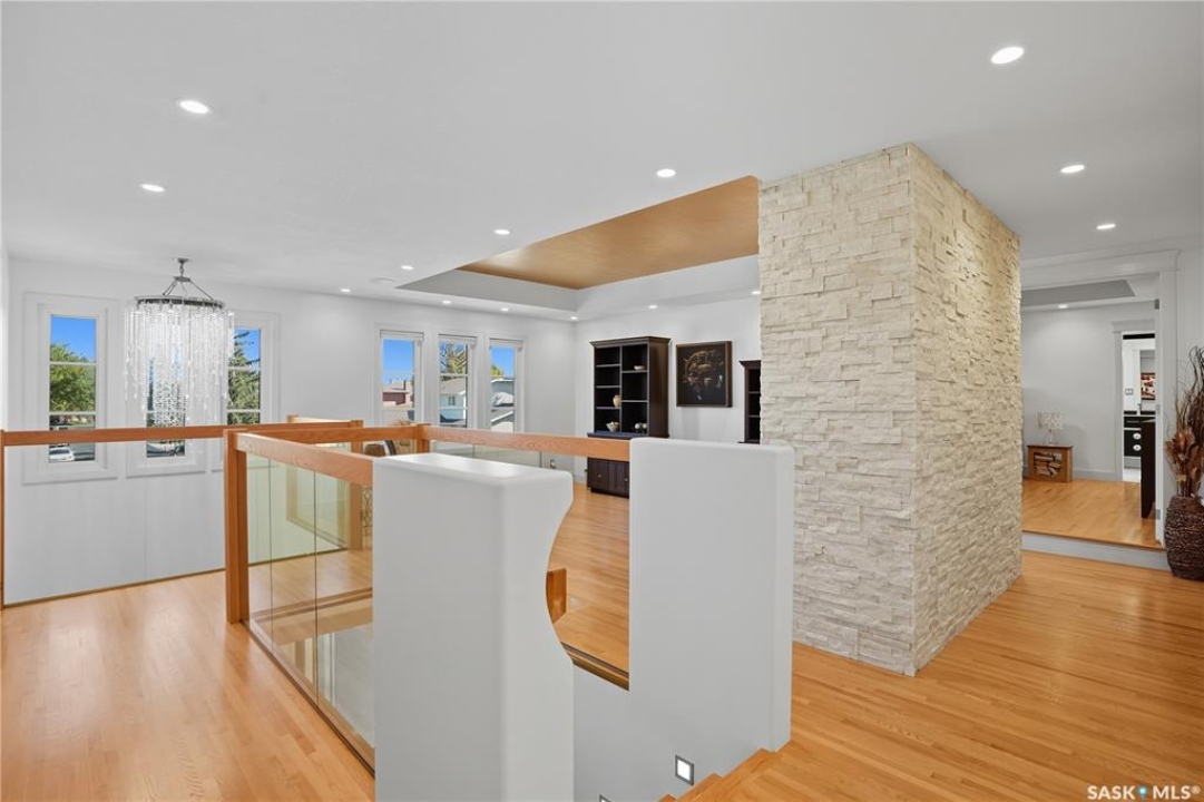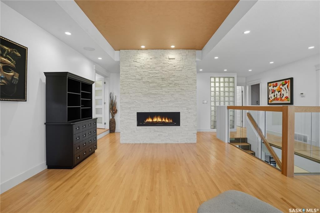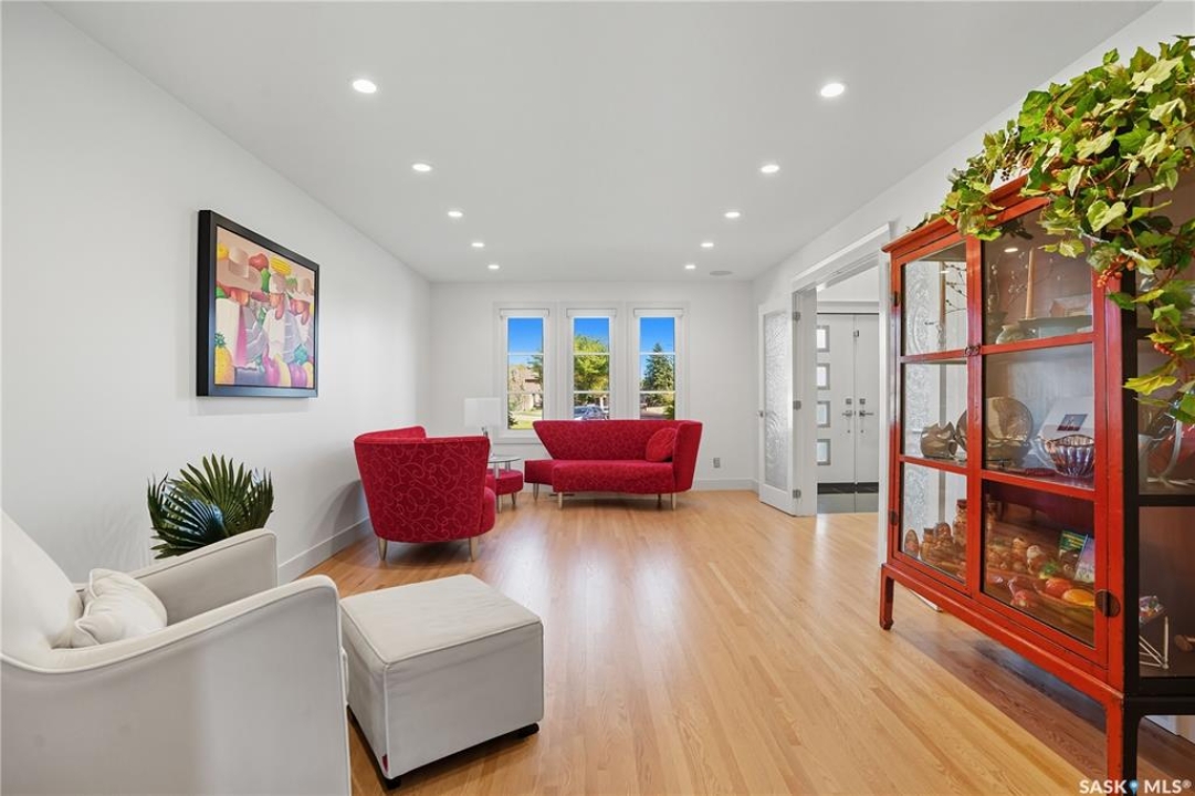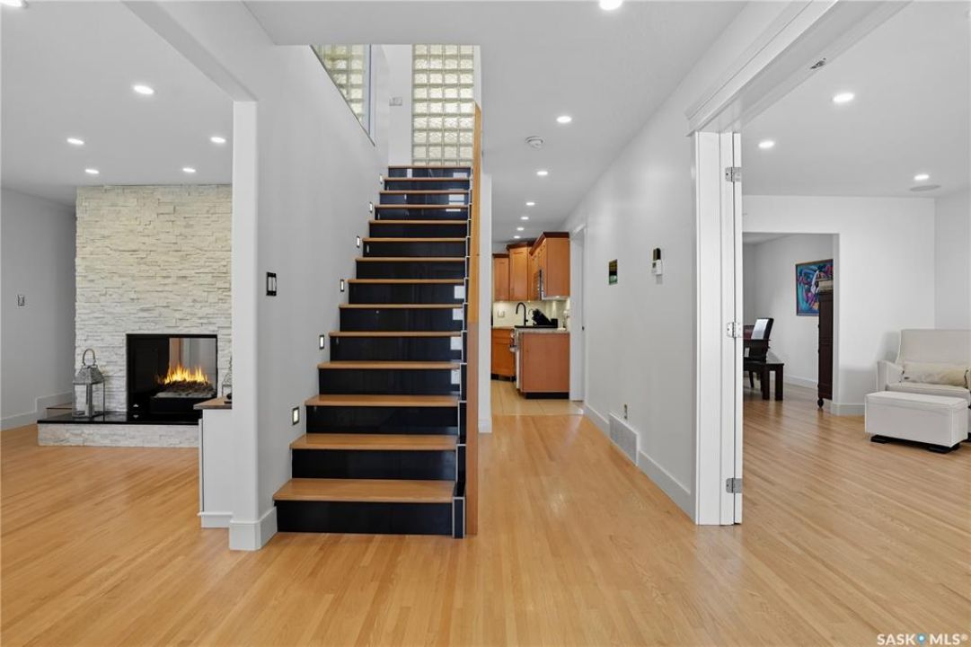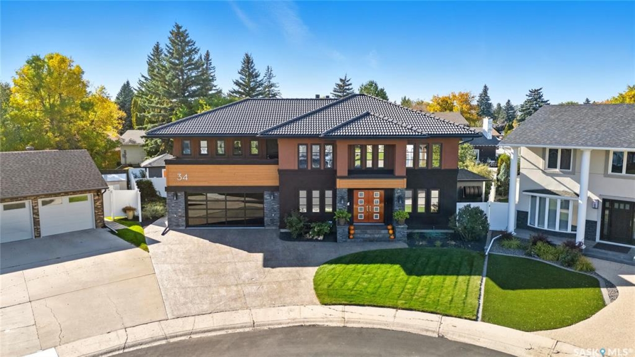 Welcome to 34 Leslie Place, a quiet bay in Regina's desirable Albert Park. This extensively renovated home blends elegance, comfort, and functionality—ready for immediate enjoyment. The grand entryway opens to a sunken living room with a 2-way gas fireplace and white quartz surround, a central wood-tile staircase, family room, and formal dining area overlooking the backyard. Custom hardwood floors flow throughout. The kitchen features warm wood cabinetry, granite countertops, tile flooring, double stainless sinks, a fireplace, and a cozy breakfast nook. A 2-piece bath and office/den with private entrance—currently a salon—complete the main floor. Upstairs, a bonus room overlooks a crystal chandelier and highlights custom woodwork, a gas fireplace, coffered ceiling, pot lights, and built-in sound. The luxurious 5-piece bath offers double sinks, glass block accents, and a seating area. The spacious primary suite includes two private balconies, dual closets (including built-in shoe storage), and a spa-like ensuite with soaker tub, walk-in shower, and water closet. Three additional bedrooms complete the upper level. The finished basement features a soundproof entertainment room, bedroom, 3-piece bath, and laundry with sink and cabinetry. Outside, enjoy a fully landscaped corner lot with stone/stucco exterior, wood accents, custom lighting, and double drive. The attached heated double garage features epoxy flooring, a custom aluminum and glass overhead door, and ample storage space. The PVC-fenced backyard includes a private, covered deck with lighting, and a stone patio. Value-added features: built on piles, exterior EIFS envelope, tile roofing system, natural gas BBQ hookup, central A/C, Control4 system, alarm, 200-amp panel, sewer backflow valve, HRV, hi-eff furnaces with humidifiers, and more. All drawings and improvement details available. A rare find in a prime location—call your agent today.
