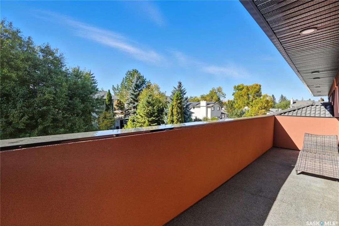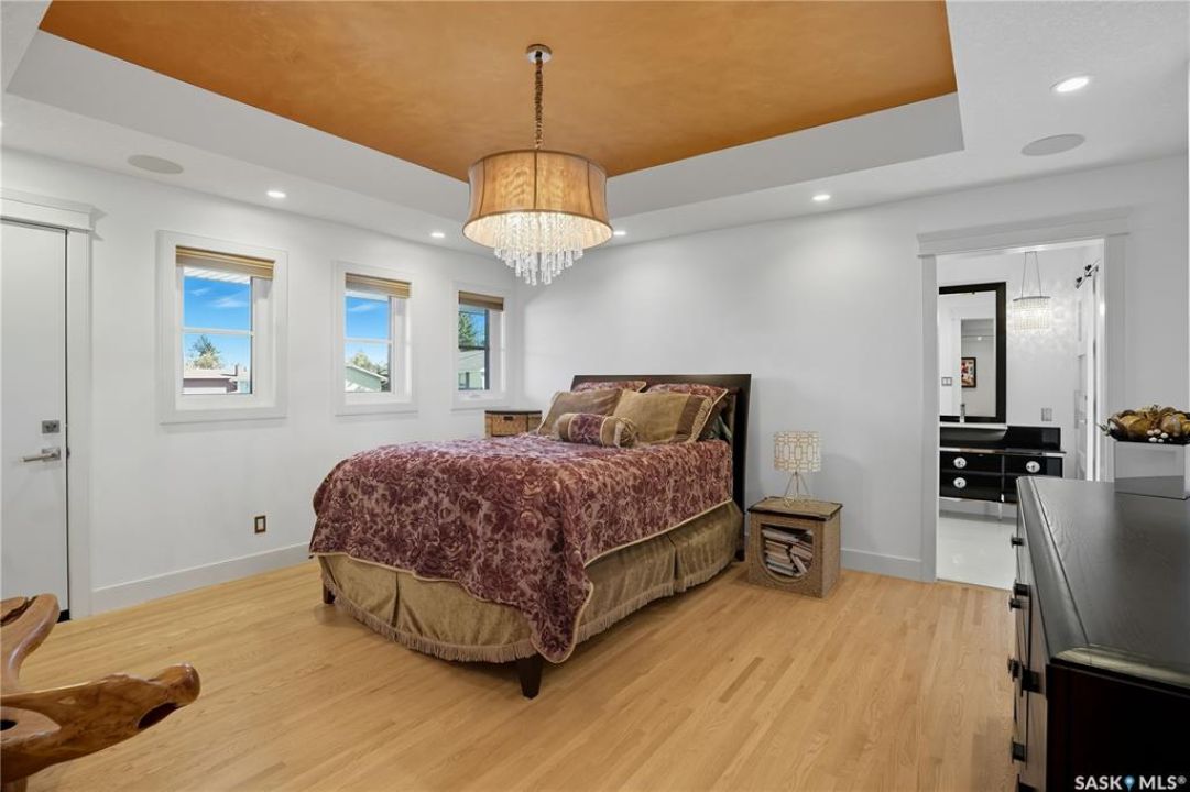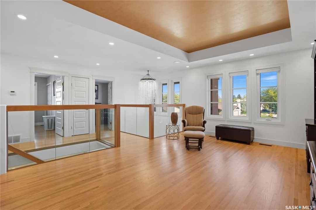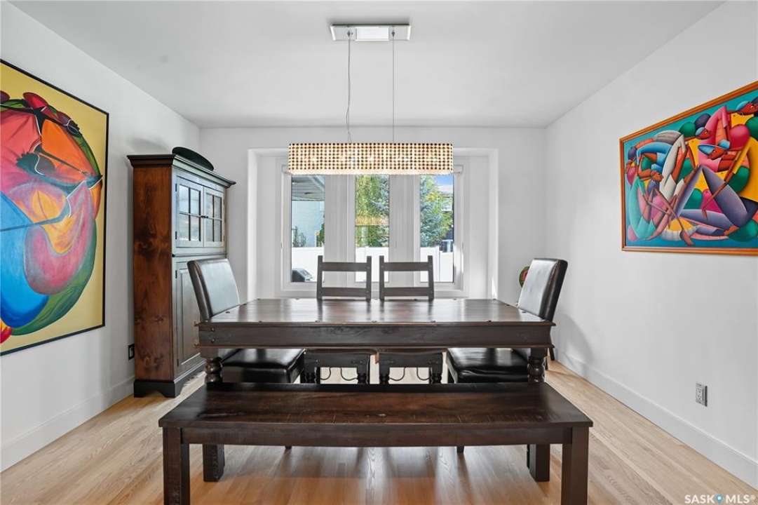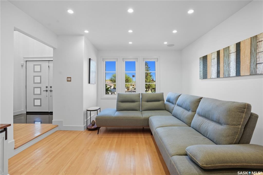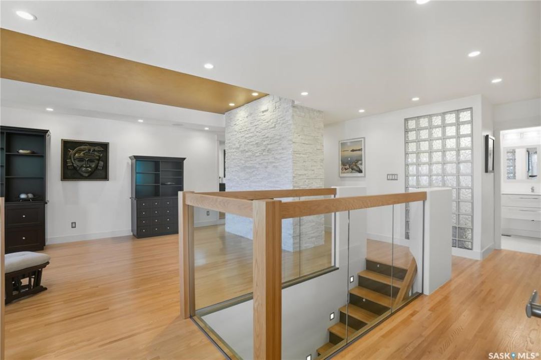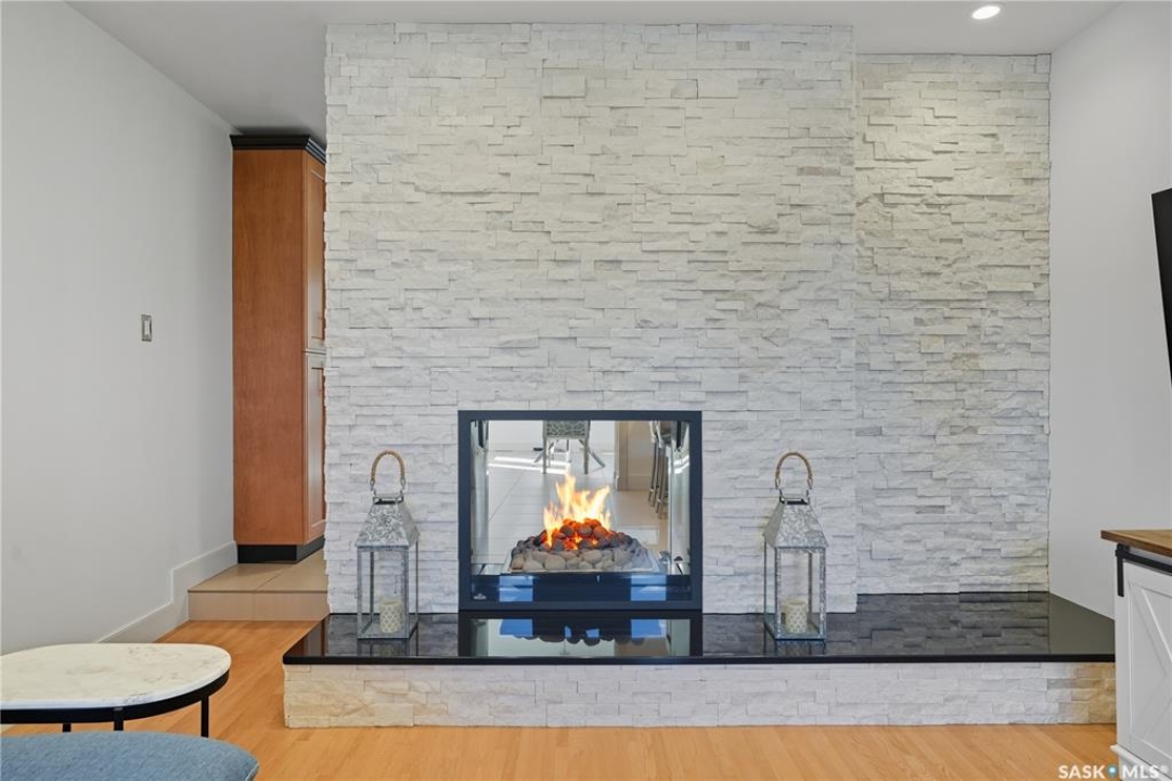 Welcome to 34 Leslie Place, a quiet bay in Regina's desirable Albert Park. This extensively renovated home blends elegance, comfort, and functionality—ready for immediate enjoyment. The grand entryway opens to a sunken living room with a 2-way gas fireplace and white quartz surround, a central wood-tile staircase, family room, and formal dining area overlooking the backyard. Custom hardwood floors flow throughout. The kitchen features warm wood cabinetry, granite countertops, tile flooring, double stainless sinks, a fireplace, and a cozy breakfast nook. A 2-piece bath and office/den with private entrance—currently a salon—complete the main floor. Upstairs, a bonus room overlooks a crystal chandelier and highlights custom woodwork, a gas fireplace, coffered ceiling, pot lights, and built-in sound. The luxurious 5-piece bath offers double sinks, glass block accents, and a seating area. The spacious primary suite includes two private balconies, dual closets (including built-in shoe storage), and a spa-like ensuite with soaker tub, walk-in shower, and water closet. Three additional bedrooms complete the upper level. The finished basement features a soundproof entertainment room, bedroom, 3-piece bath, and laundry with sink and cabinetry. Outside, enjoy a fully landscaped corner lot with stone/stucco exterior, wood accents, custom lighting, and double drive. The attached heated double garage features epoxy flooring, a custom aluminum and glass overhead door, and ample storage space. The PVC-fenced backyard includes a private, covered deck with lighting, and a stone patio. Value-added features: built on piles, exterior EIFS envelope, tile roofing system, natural gas BBQ hookup, central A/C, Control4 system, alarm, 200-amp panel, sewer backflow valve, HRV, hi-eff furnaces with humidifiers, and more. All drawings and improvement details available. A rare find in a prime location—call your agent today.