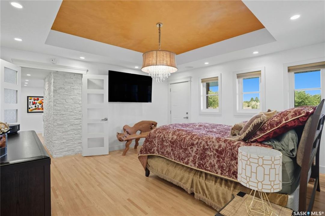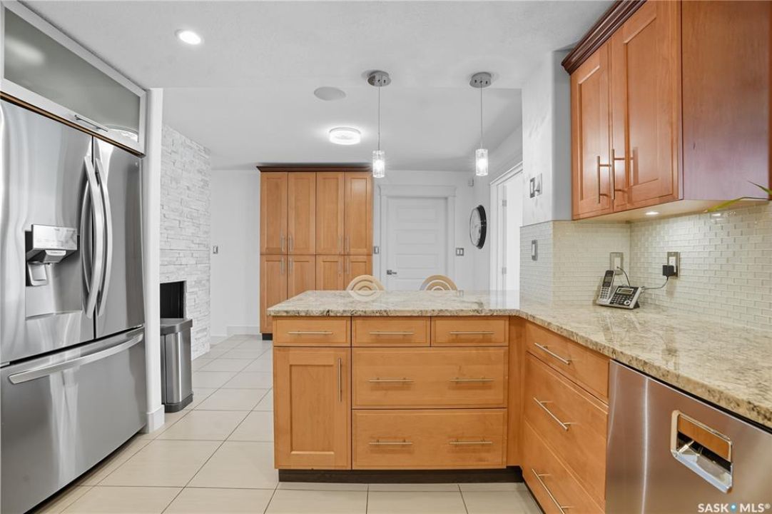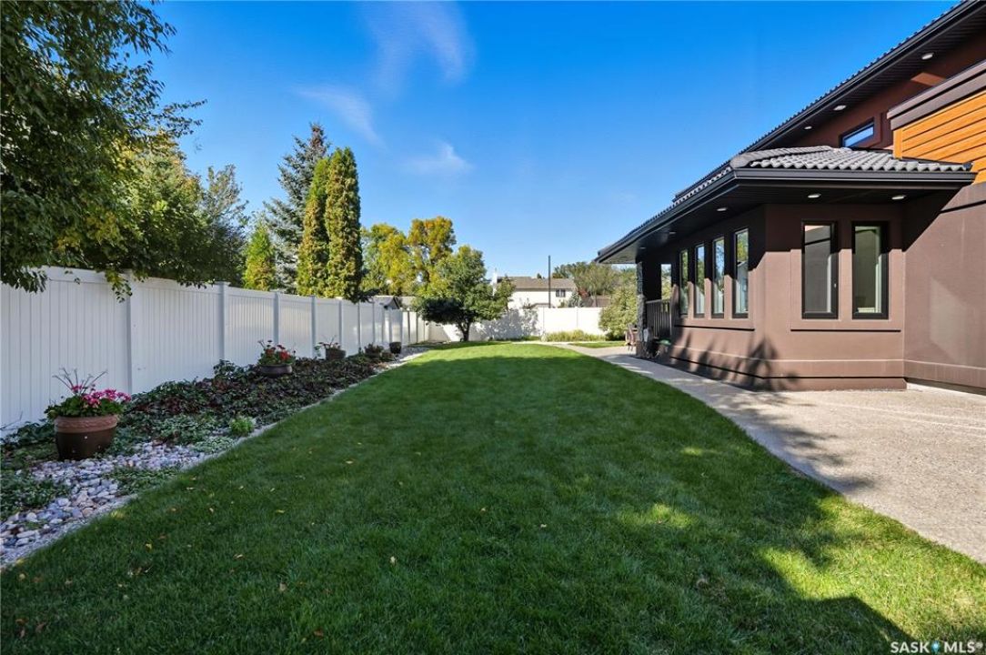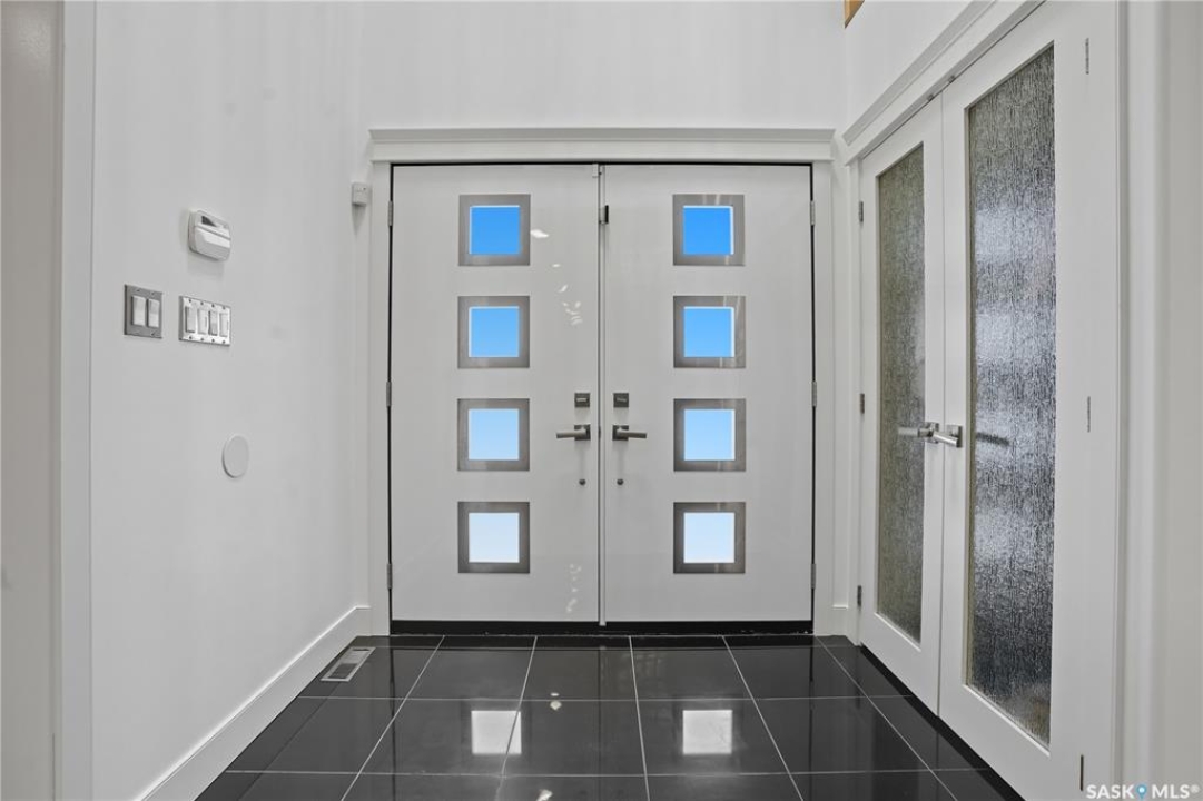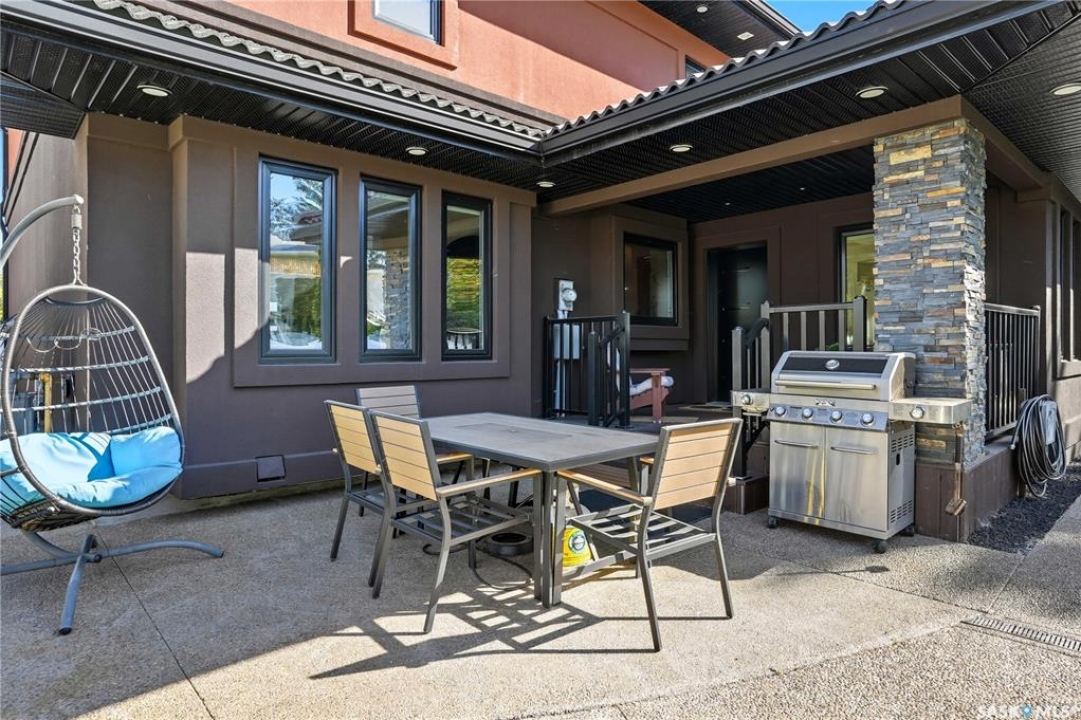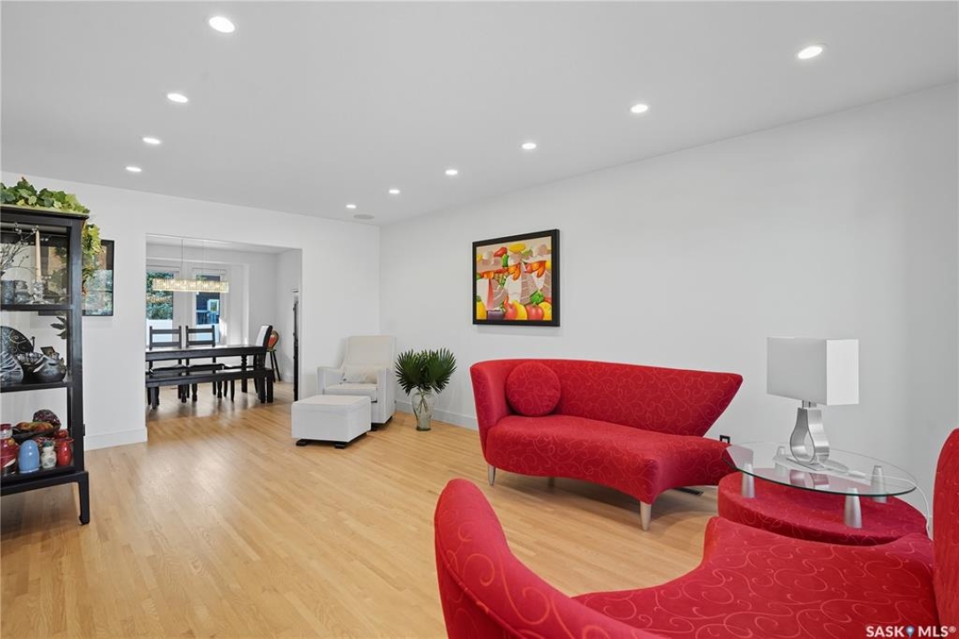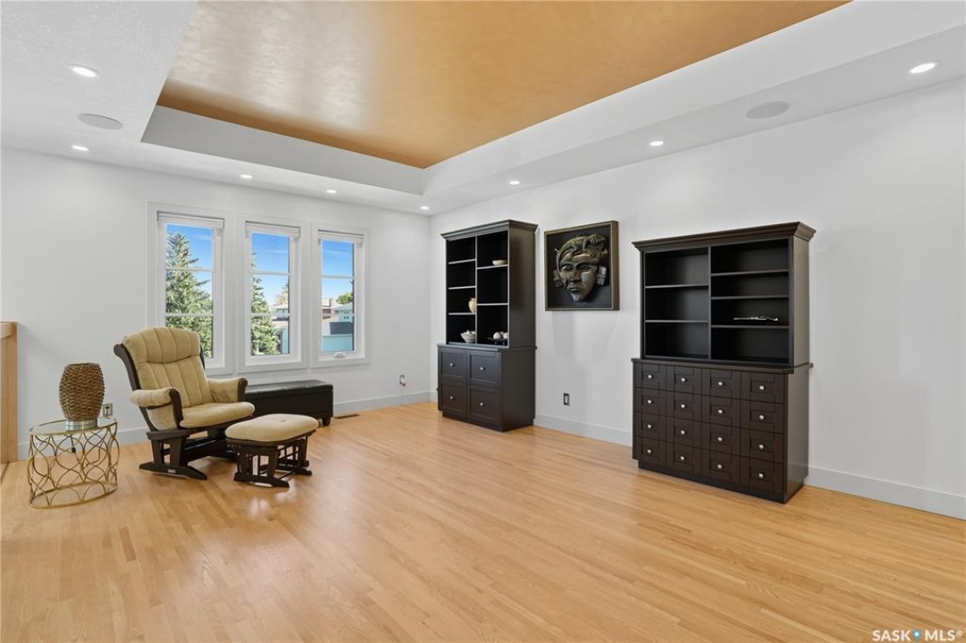 Welcome to 34 Leslie Place, a quiet bay in Regina's desirable Albert Park. This extensively renovated home blends elegance, comfort, and functionality—ready for immediate enjoyment. The grand entryway opens to a sunken living room with a 2-way gas fireplace and white quartz surround, a central wood-tile staircase, family room, and formal dining area overlooking the backyard. Custom hardwood floors flow throughout. The kitchen features warm wood cabinetry, granite countertops, tile flooring, double stainless sinks, a fireplace, and a cozy breakfast nook. A 2-piece bath and office/den with private entrance—currently a salon—complete the main floor. Upstairs, a bonus room overlooks a crystal chandelier and highlights custom woodwork, a gas fireplace, coffered ceiling, pot lights, and built-in sound. The luxurious 5-piece bath offers double sinks, glass block accents, and a seating area. The spacious primary suite includes two private balconies, dual closets (including built-in shoe storage), and a spa-like ensuite with soaker tub, walk-in shower, and water closet. Three additional bedrooms complete the upper level. The finished basement features a soundproof entertainment room, bedroom, 3-piece bath, and laundry with sink and cabinetry. Outside, enjoy a fully landscaped corner lot with stone/stucco exterior, wood accents, custom lighting, and double drive. The attached heated double garage features epoxy flooring, a custom aluminum and glass overhead door, and ample storage space. The PVC-fenced backyard includes a private, covered deck with lighting, and a stone patio. Value-added features: built on piles, exterior EIFS envelope, tile roofing system, natural gas BBQ hookup, central A/C, Control4 system, alarm, 200-amp panel, sewer backflow valve, HRV, hi-eff furnaces with humidifiers, and more. All drawings and improvement details available. A rare find in a prime location—call your agent today.
