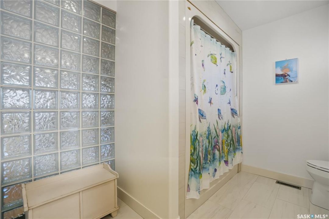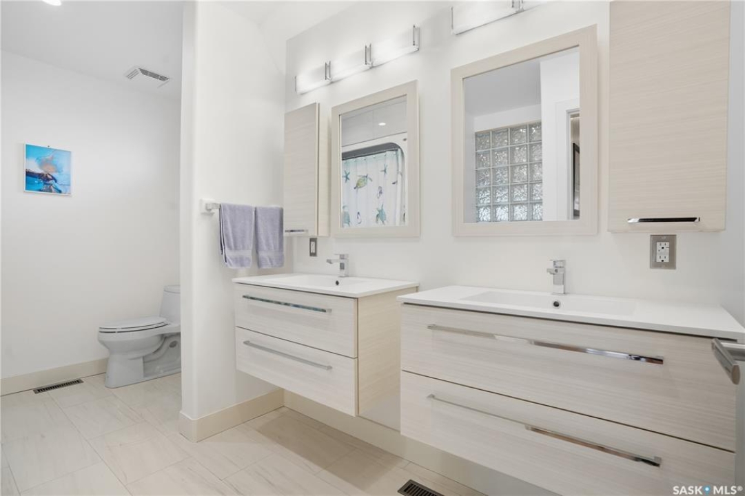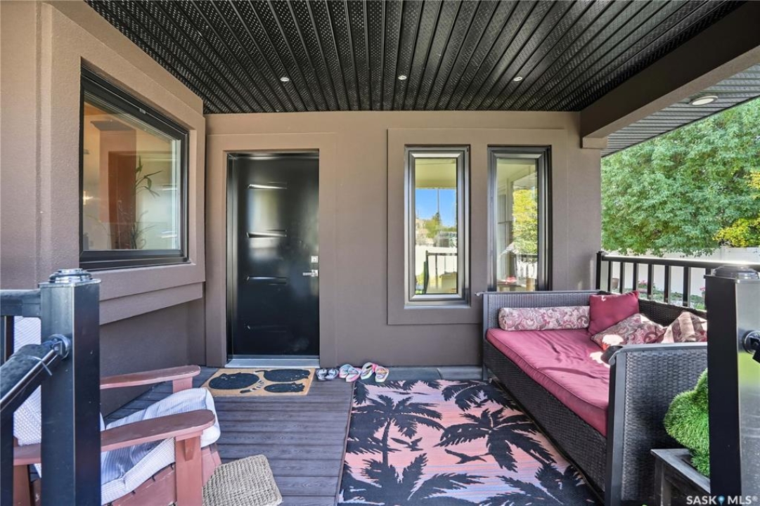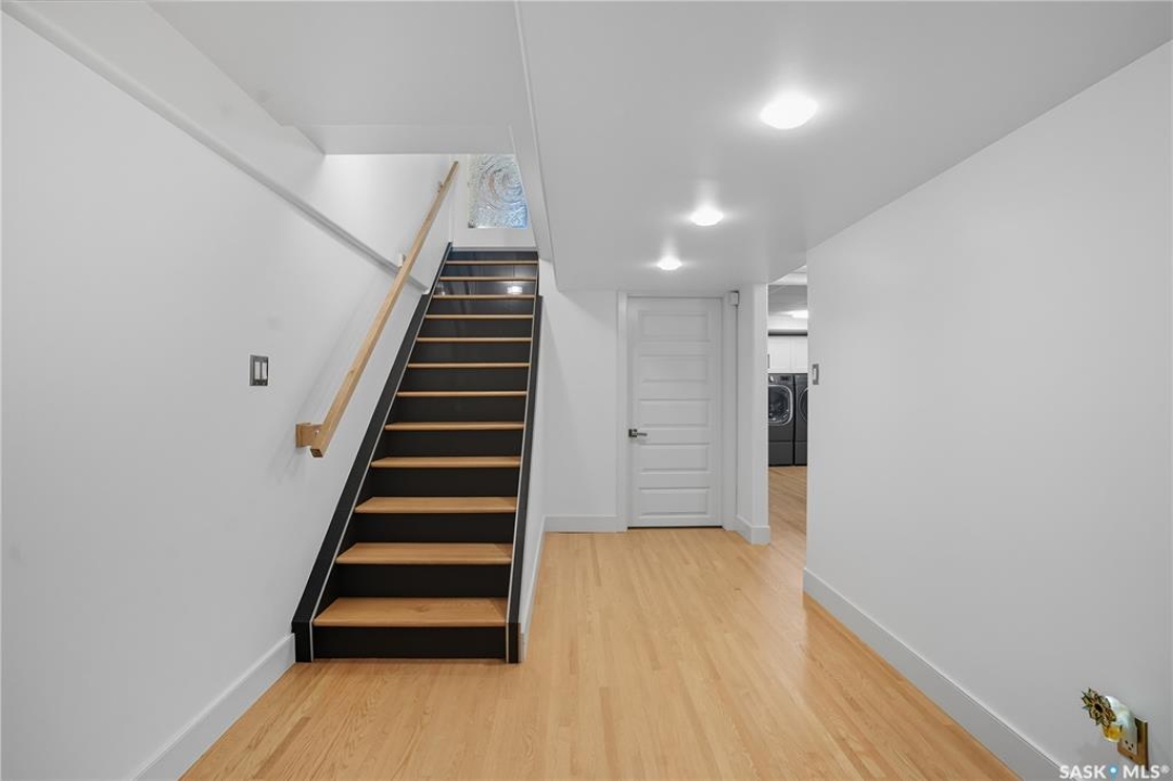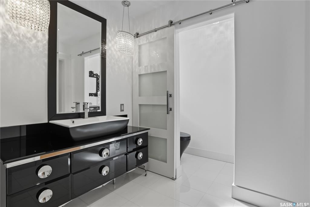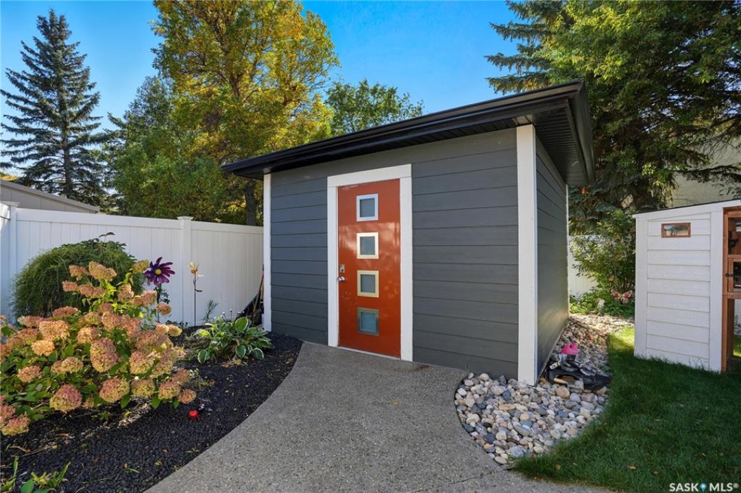 Welcome to 34 Leslie Place, a quiet bay in Regina's desirable Albert Park. This extensively renovated home blends elegance, comfort, and functionality—ready for immediate enjoyment. The grand entryway opens to a sunken living room with a 2-way gas fireplace and white quartz surround, a central wood-tile staircase, family room, and formal dining area overlooking the backyard. Custom hardwood floors flow throughout. The kitchen features warm wood cabinetry, granite countertops, tile flooring, double stainless sinks, a fireplace, and a cozy breakfast nook. A 2-piece bath and office/den with private entrance—currently a salon—complete the main floor. Upstairs, a bonus room overlooks a crystal chandelier and highlights custom woodwork, a gas fireplace, coffered ceiling, pot lights, and built-in sound. The luxurious 5-piece bath offers double sinks, glass block accents, and a seating area. The spacious primary suite includes two private balconies, dual closets (including built-in shoe storage), and a spa-like ensuite with soaker tub, walk-in shower, and water closet. Three additional bedrooms complete the upper level. The finished basement features a soundproof entertainment room, bedroom, 3-piece bath, and laundry with sink and cabinetry. Outside, enjoy a fully landscaped corner lot with stone/stucco exterior, wood accents, custom lighting, and double drive. The attached heated double garage features epoxy flooring, a custom aluminum and glass overhead door, and ample storage space. The PVC-fenced backyard includes a private, covered deck with lighting, and a stone patio. Value-added features: built on piles, exterior EIFS envelope, tile roofing system, natural gas BBQ hookup, central A/C, Control4 system, alarm, 200-amp panel, sewer backflow valve, HRV, hi-eff furnaces with humidifiers, and more. All drawings and improvement details available. A rare find in a prime location—call your agent today.