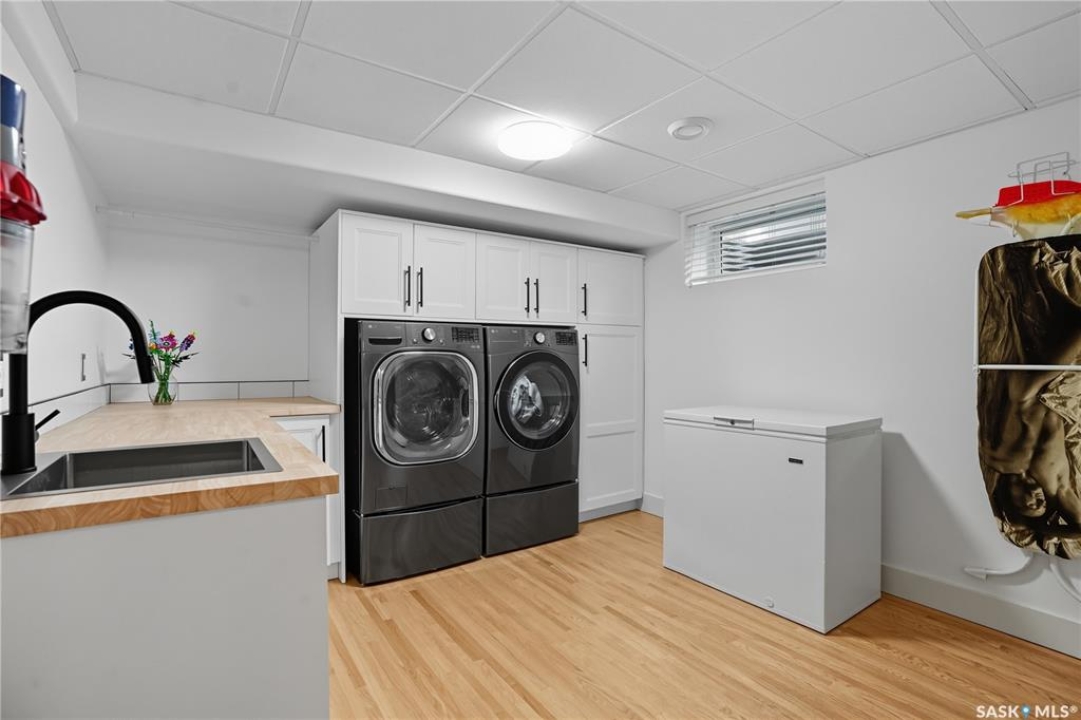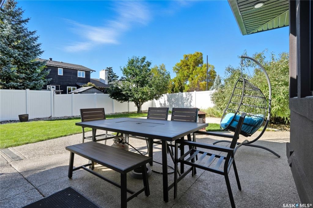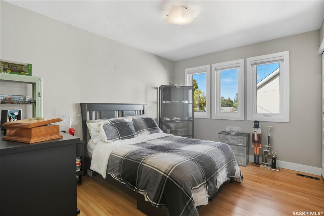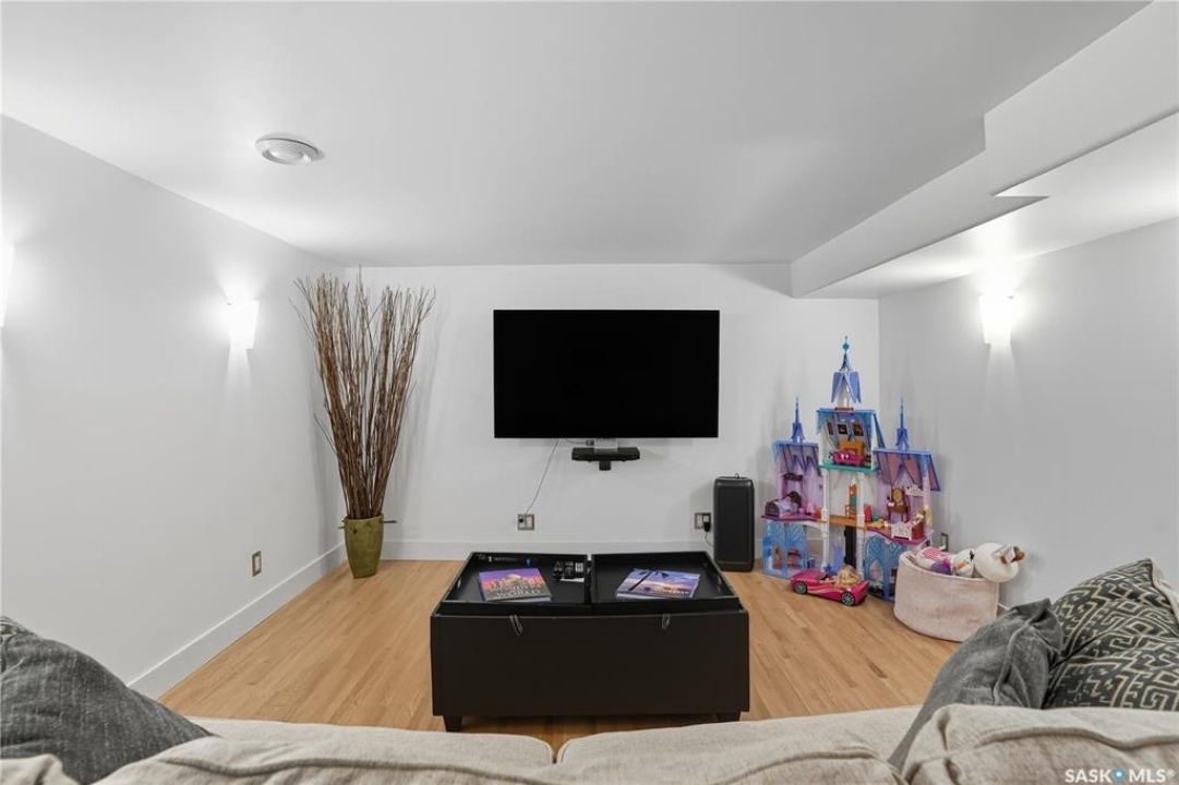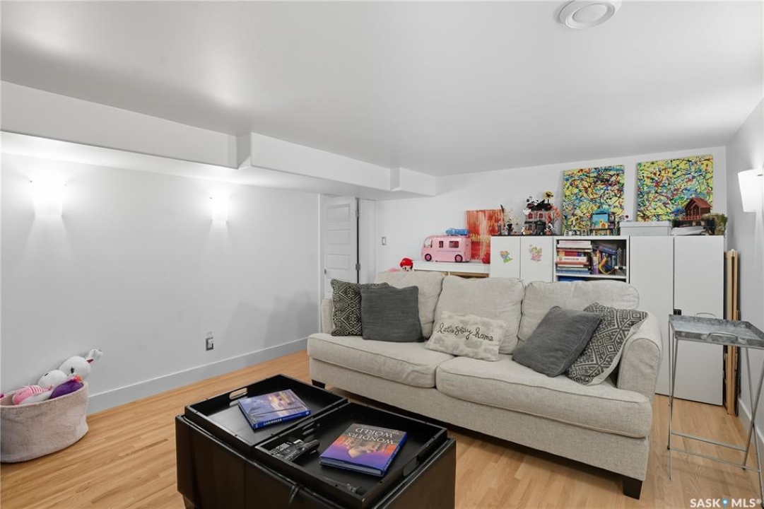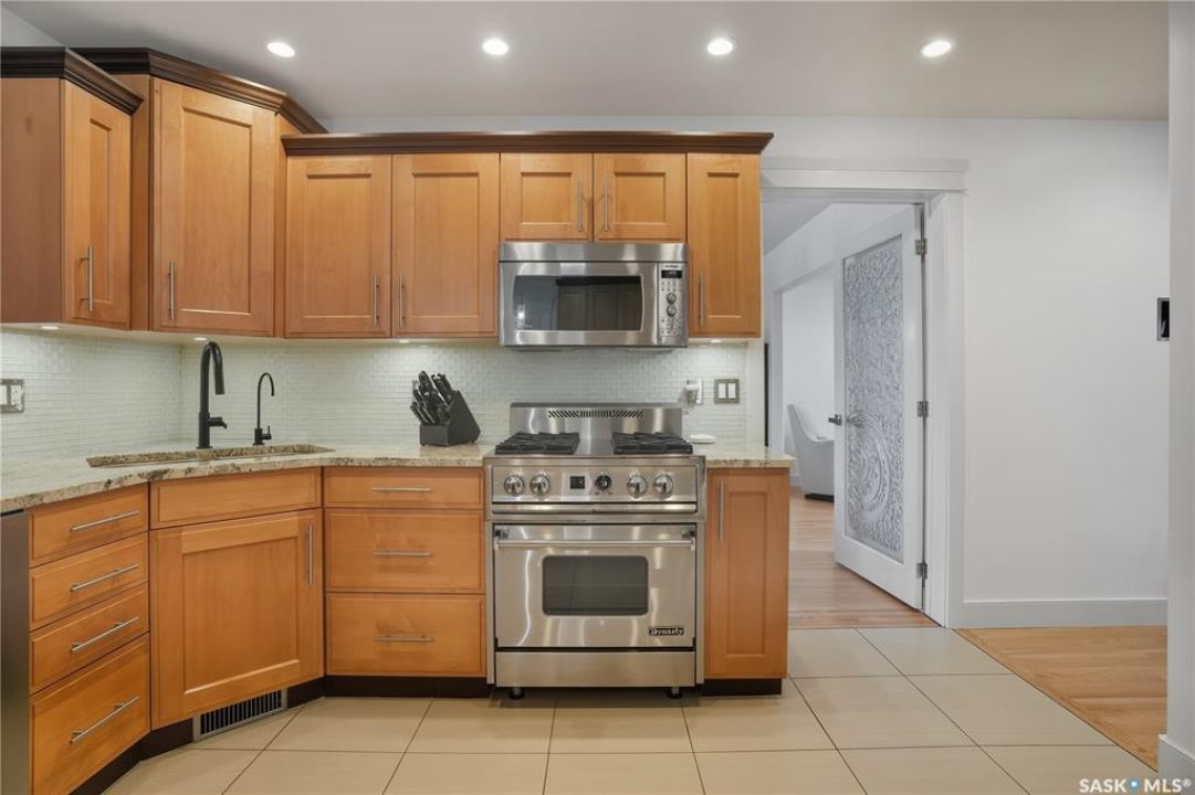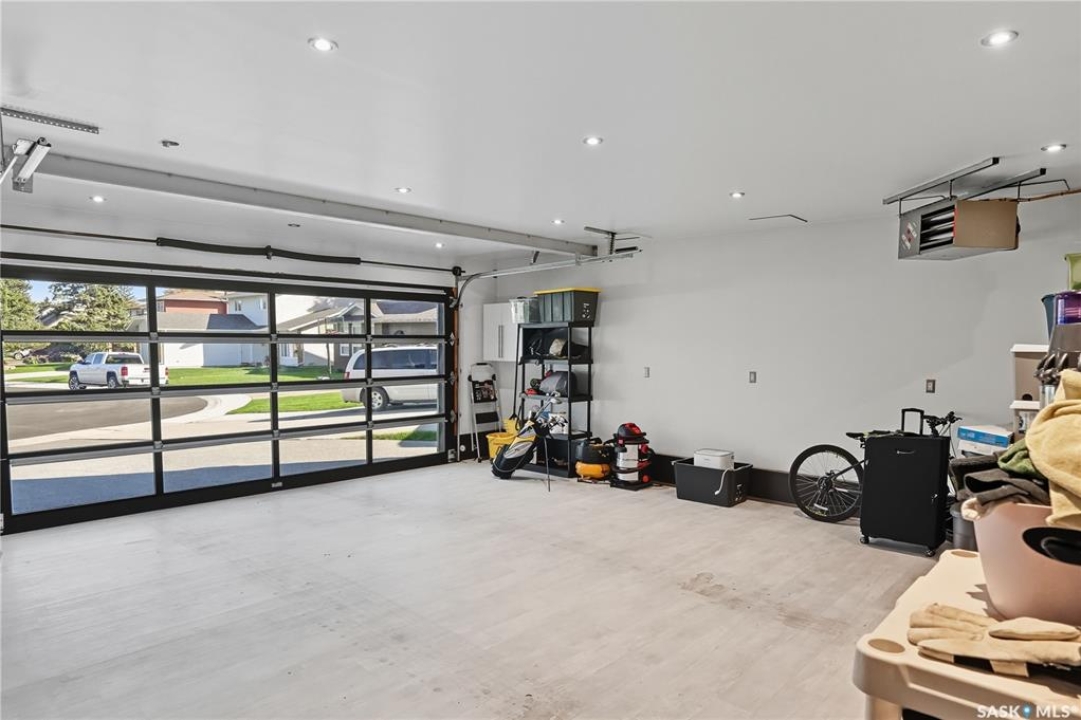 Welcome to 34 Leslie Place, a quiet bay in Regina's desirable Albert Park. This extensively renovated home blends elegance, comfort, and functionality—ready for immediate enjoyment. The grand entryway opens to a sunken living room with a 2-way gas fireplace and white quartz surround, a central wood-tile staircase, family room, and formal dining area overlooking the backyard. Custom hardwood floors flow throughout. The kitchen features warm wood cabinetry, granite countertops, tile flooring, double stainless sinks, a fireplace, and a cozy breakfast nook. A 2-piece bath and office/den with private entrance—currently a salon—complete the main floor. Upstairs, a bonus room overlooks a crystal chandelier and highlights custom woodwork, a gas fireplace, coffered ceiling, pot lights, and built-in sound. The luxurious 5-piece bath offers double sinks, glass block accents, and a seating area. The spacious primary suite includes two private balconies, dual closets (including built-in shoe storage), and a spa-like ensuite with soaker tub, walk-in shower, and water closet. Three additional bedrooms complete the upper level. The finished basement features a soundproof entertainment room, bedroom, 3-piece bath, and laundry with sink and cabinetry. Outside, enjoy a fully landscaped corner lot with stone/stucco exterior, wood accents, custom lighting, and double drive. The attached heated double garage features epoxy flooring, a custom aluminum and glass overhead door, and ample storage space. The PVC-fenced backyard includes a private, covered deck with lighting, and a stone patio. Value-added features: built on piles, exterior EIFS envelope, tile roofing system, natural gas BBQ hookup, central A/C, Control4 system, alarm, 200-amp panel, sewer backflow valve, HRV, hi-eff furnaces with humidifiers, and more. All drawings and improvement details available. A rare find in a prime location—call your agent today.