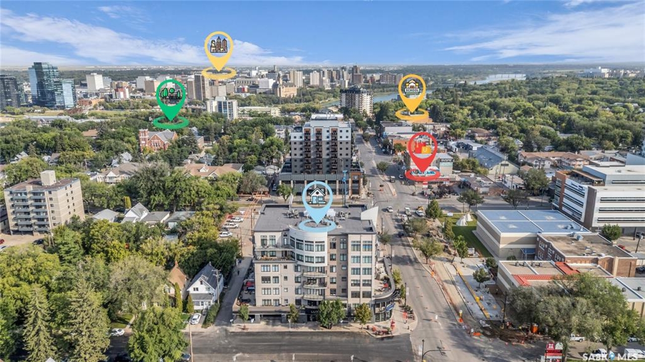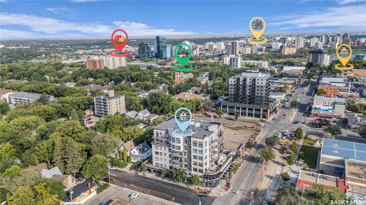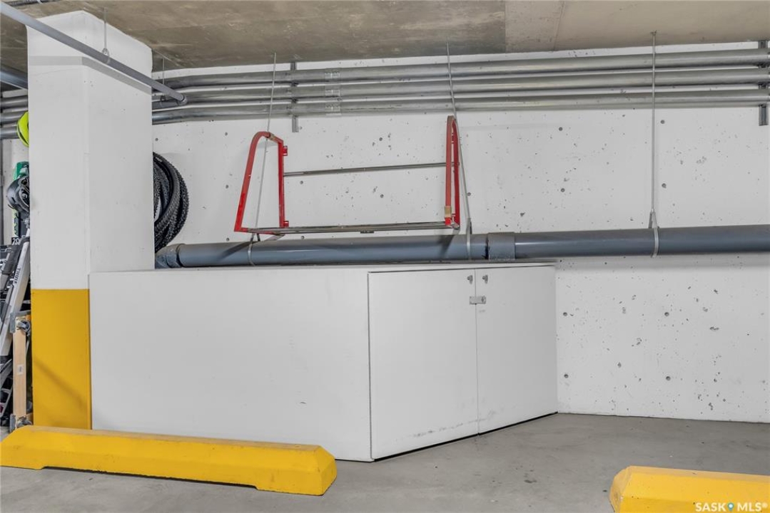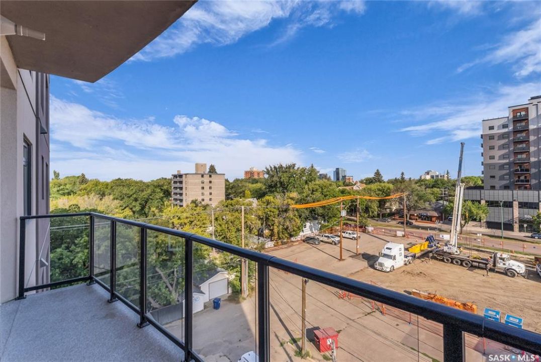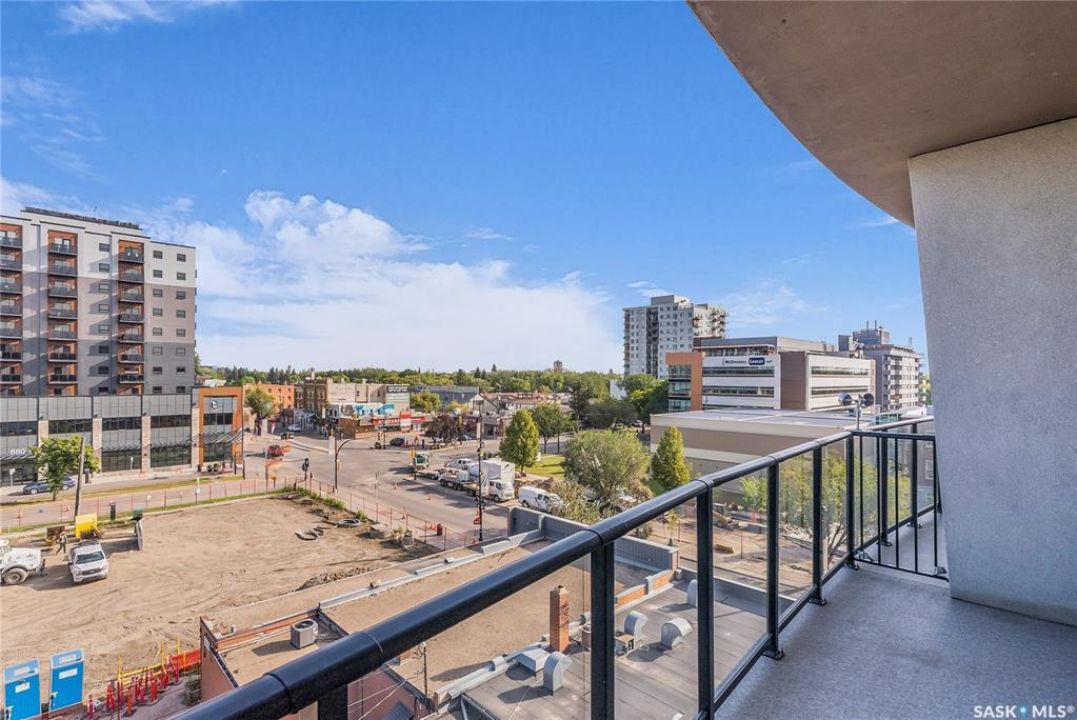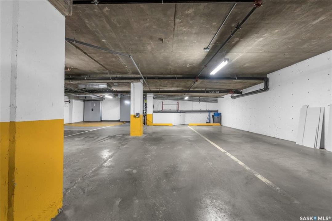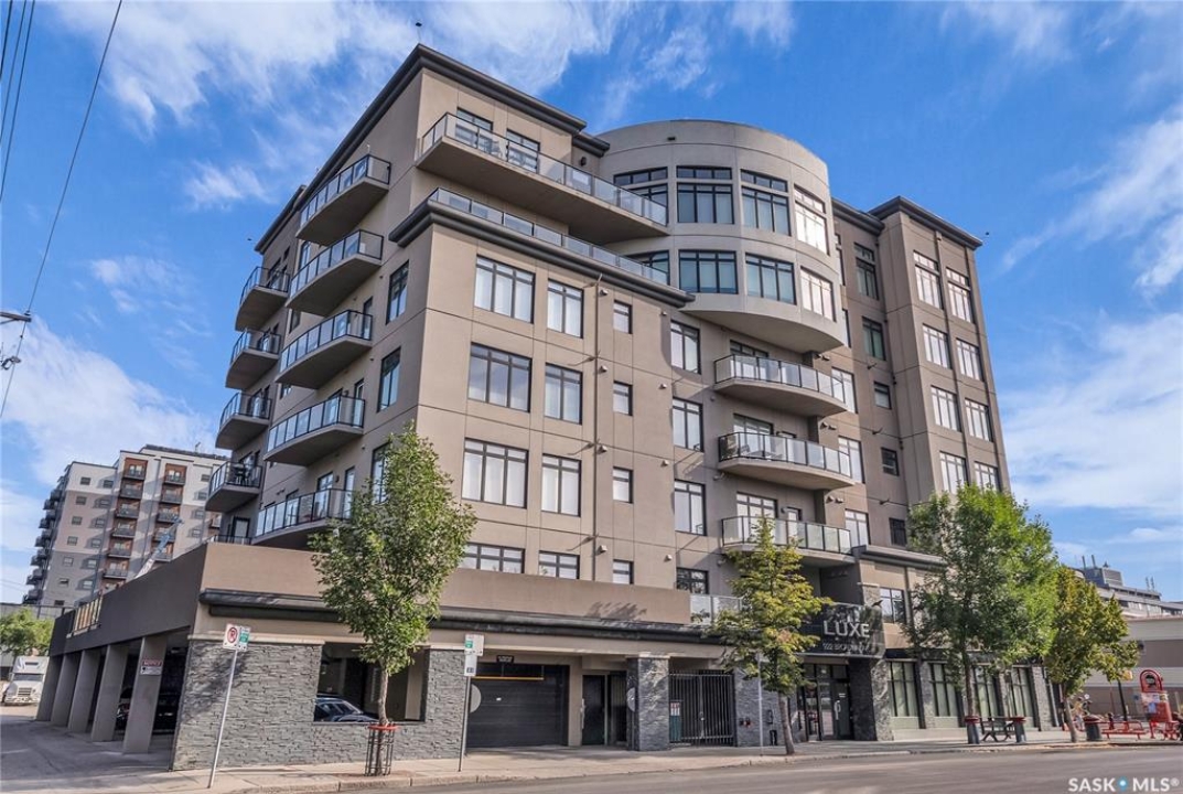 Welcome to the prestigious Luxe offering an exceptional combination of sophistication, comfort, and thoughtful upgrades. The suite features two spacious bedrooms, two beautifully appointed bathrooms, the rare luxury of two balconies, two underground parking stalls, and two external storage areas. The open concept main area is bright and inviting, with ceiling lighting added in 2018 to enhance the living and dining spaces. The kitchen is both stylish and functional, boasting a new dishwasher and smart renovations that introduced custom cabinets to the island, a built-in desk with wine storage, and striking display shelving. Additional upgrades include Hunter Douglas PowerView blinds on seven openings, triple-glazed balcony doors, and west-facing upgraded windows (2022). A true rarity in the condo market, the primary suite was redesigned with both elegance and accessibility in mind. It offers closet organizers and a spa-inspired ensuite that is perfectly suited for people with physical limitations. Features include heated non-glare tile floors, a Toto washlet, a double shower, an accessible sink unit, reinforced walls with integrated towel/assist rails, custom display shelving, thoughtful lighting and convenient laundry bins concealed within cabinetry. The second bathroom was also enhanced with new tile floors and walls, while the laundry room was outfitted with cabinets and a collapsible folding table. Throughout the condo, hardwood floors were refinished, and every detail was carefully considered, from art and office storage solutions to built-in cabinetry that maximizes both form and function. Broadway offers an array of amenities within walking distance and is home to Saskatoon's beloved Fringe Festival, Broadway Street Fair, and some of the city's finest pubs and restaurants, also you are just a short walk to the downtown core and the South Saskatchewan River.