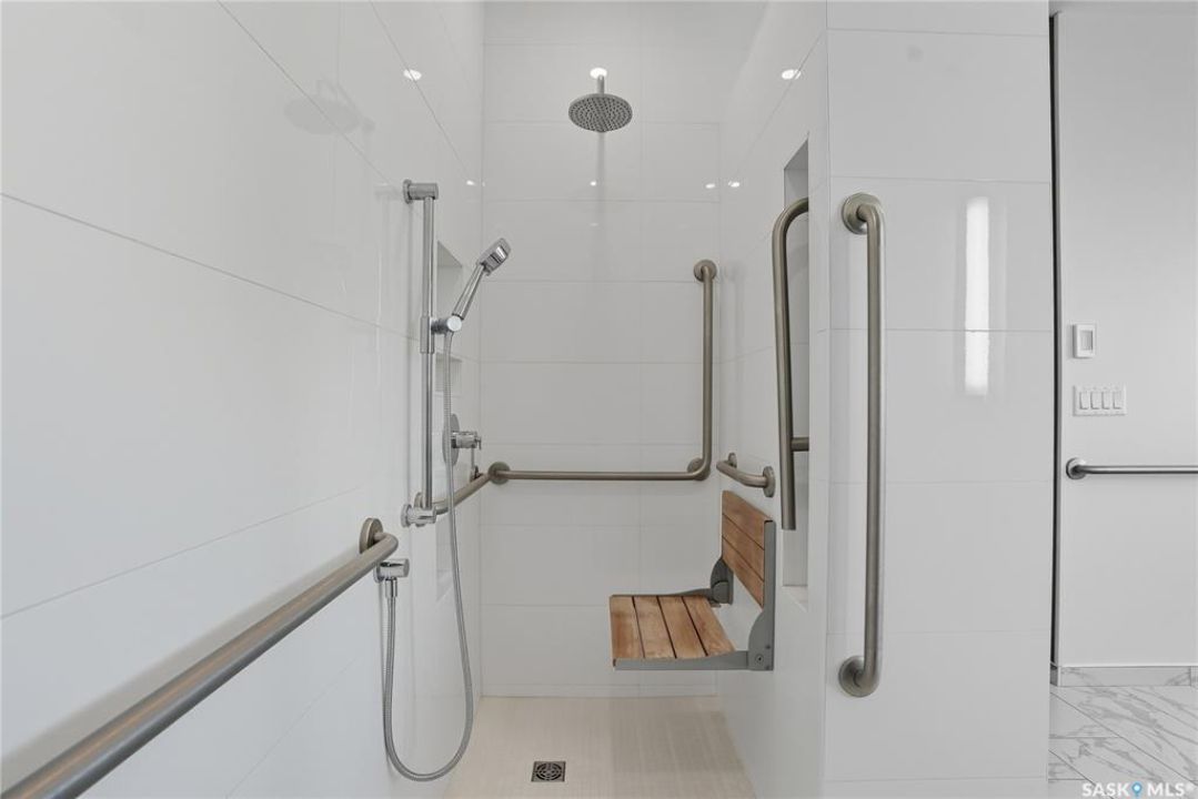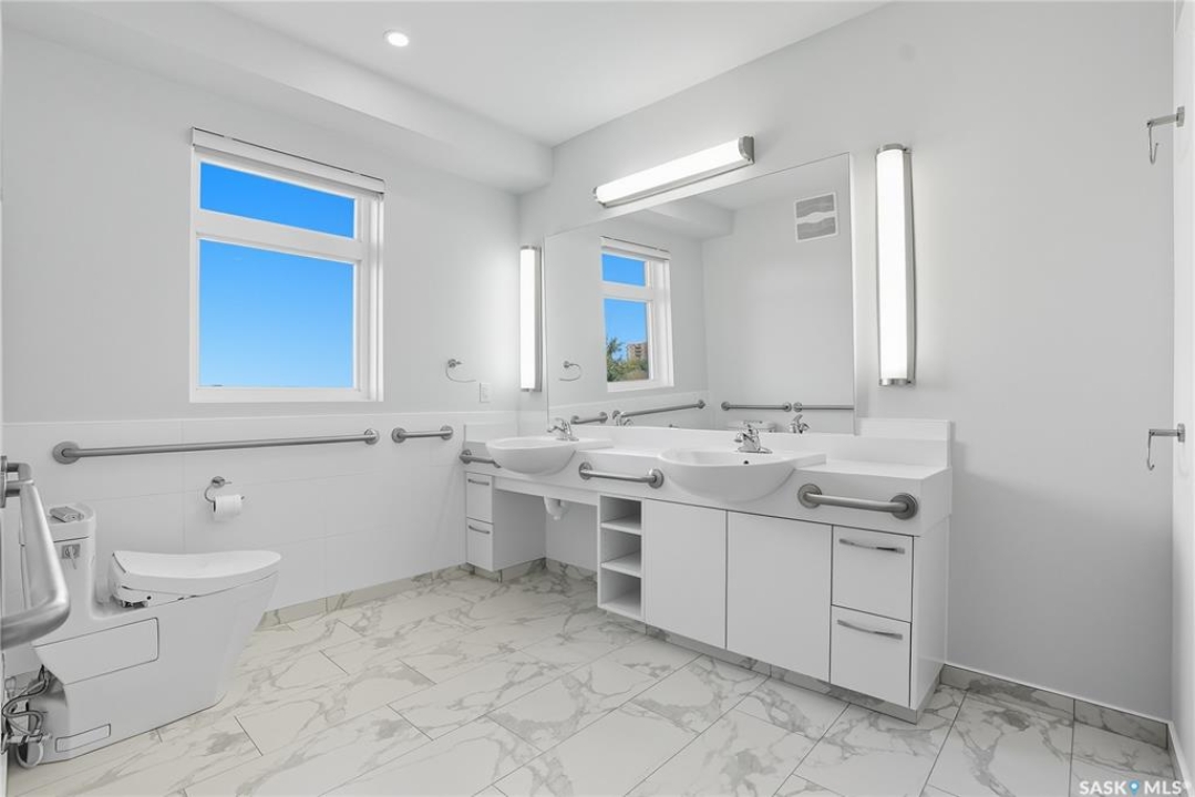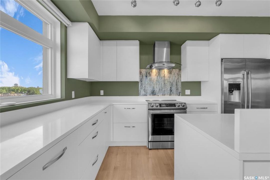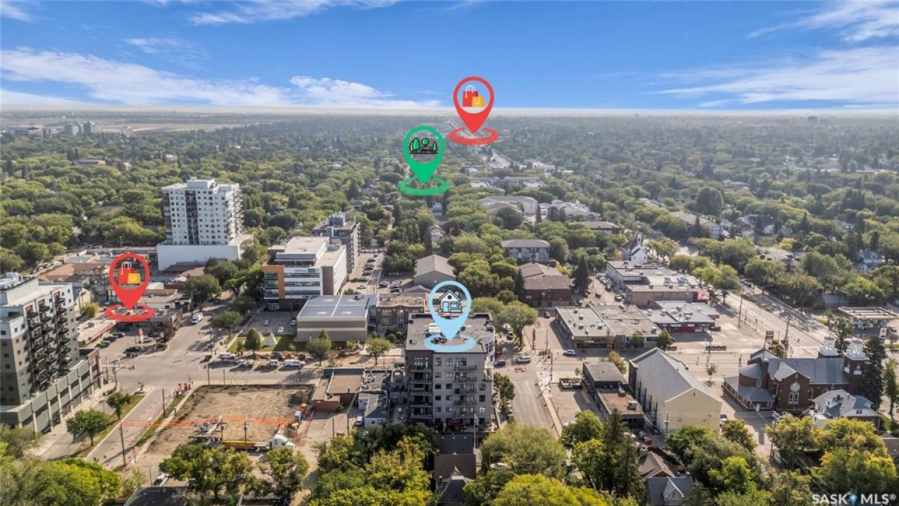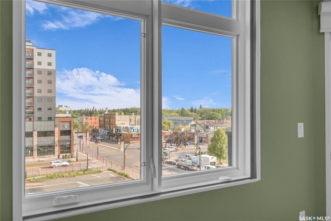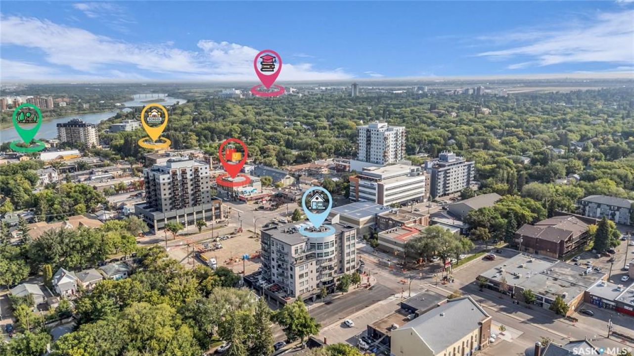 Welcome to the prestigious Luxe offering an exceptional combination of sophistication, comfort, and thoughtful upgrades. The suite features two spacious bedrooms, two beautifully appointed bathrooms, the rare luxury of two balconies, two underground parking stalls, and two external storage areas. The open concept main area is bright and inviting, with ceiling lighting added in 2018 to enhance the living and dining spaces. The kitchen is both stylish and functional, boasting a new dishwasher and smart renovations that introduced custom cabinets to the island, a built-in desk with wine storage, and striking display shelving. Additional upgrades include Hunter Douglas PowerView blinds on seven openings, triple-glazed balcony doors, and west-facing upgraded windows (2022). A true rarity in the condo market, the primary suite was redesigned with both elegance and accessibility in mind. It offers closet organizers and a spa-inspired ensuite that is perfectly suited for people with physical limitations. Features include heated non-glare tile floors, a Toto washlet, a double shower, an accessible sink unit, reinforced walls with integrated towel/assist rails, custom display shelving, thoughtful lighting and convenient laundry bins concealed within cabinetry. The second bathroom was also enhanced with new tile floors and walls, while the laundry room was outfitted with cabinets and a collapsible folding table. Throughout the condo, hardwood floors were refinished, and every detail was carefully considered, from art and office storage solutions to built-in cabinetry that maximizes both form and function. Broadway offers an array of amenities within walking distance and is home to Saskatoon's beloved Fringe Festival, Broadway Street Fair, and some of the city's finest pubs and restaurants, also you are just a short walk to the downtown core and the South Saskatchewan River.