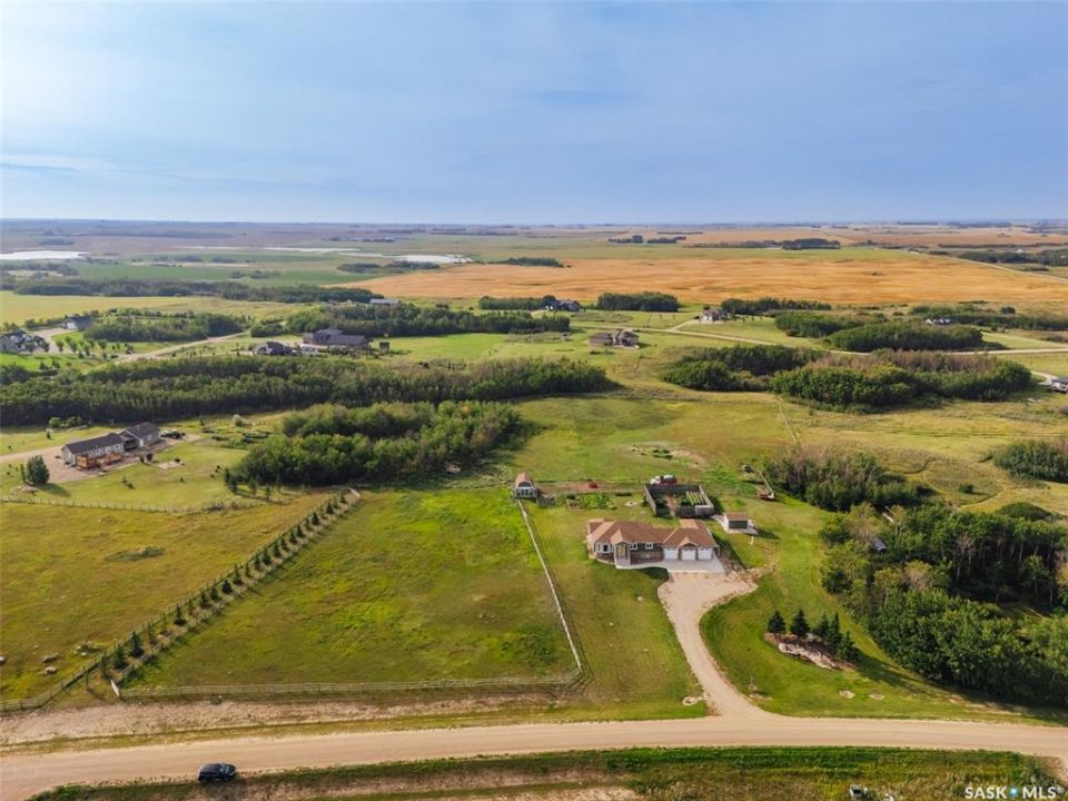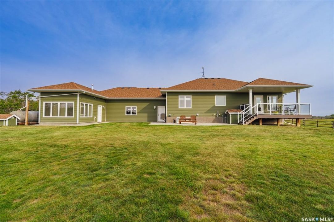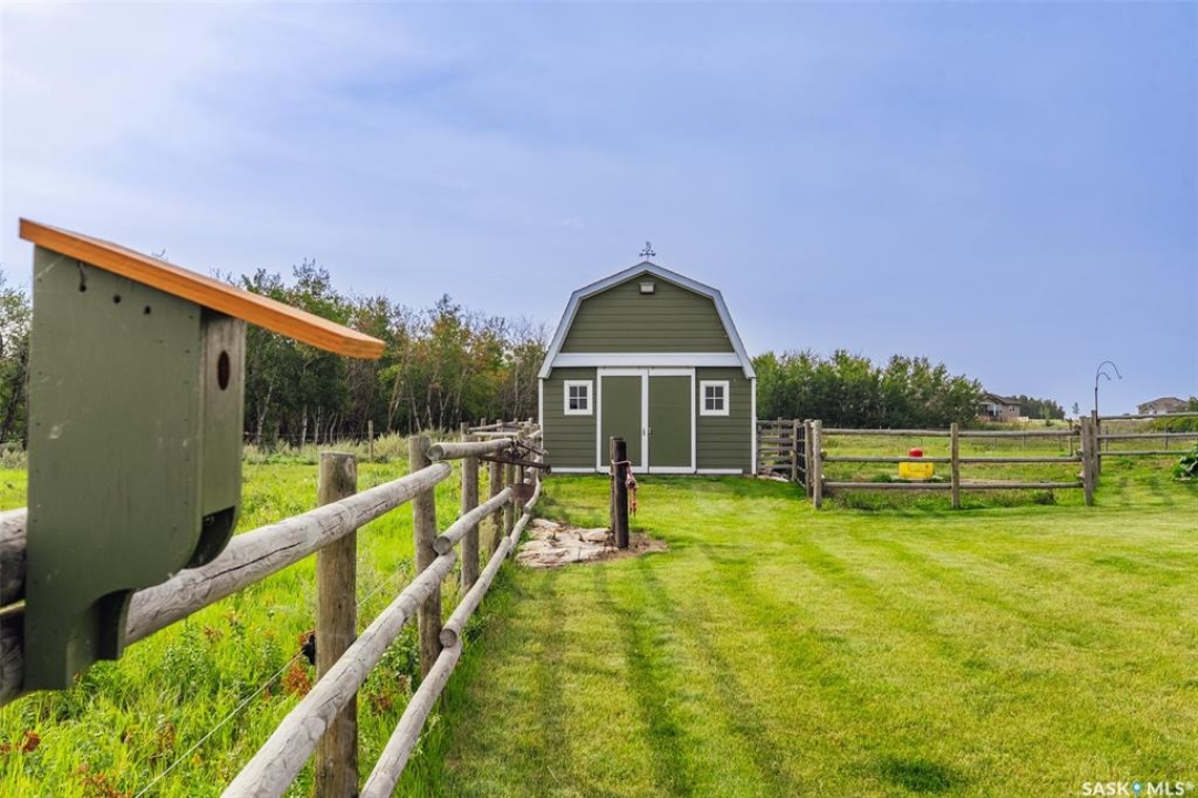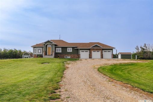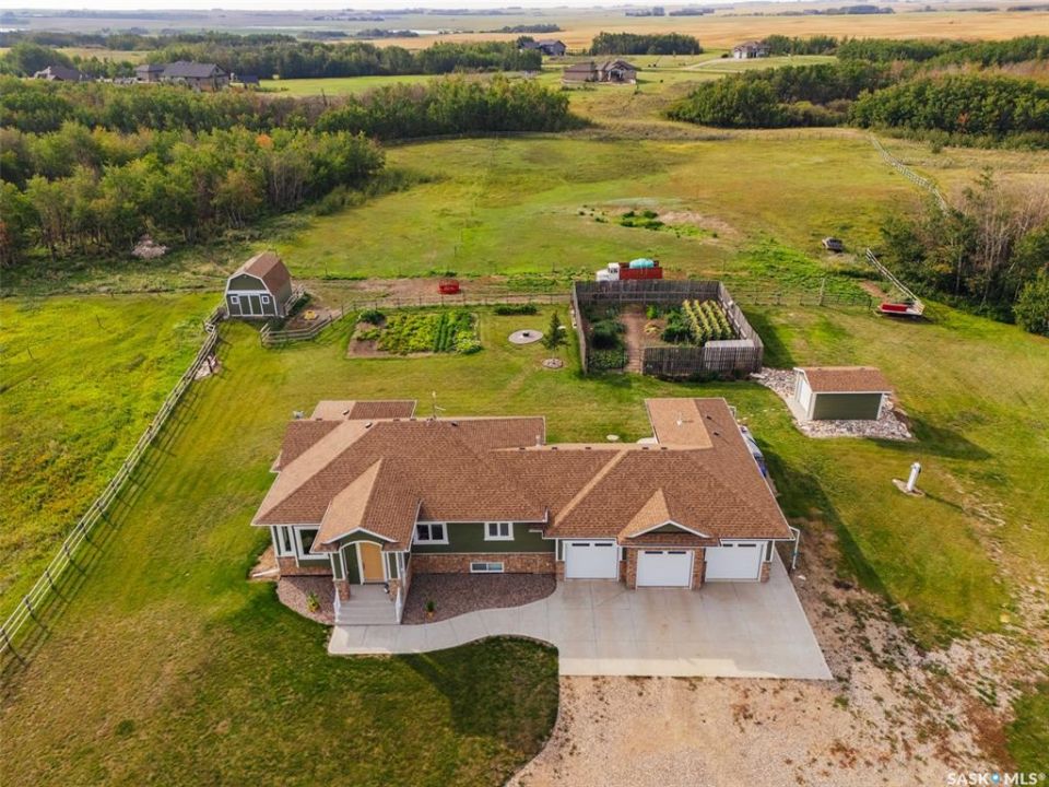 Welcome to 118 Louise Crescent in the coveted acreage community of Cherry Hills — just 15 minutes from Saskatoon's edge. This 1,502 sq. ft. executive bungalow is a stunning blend of modern design, smart functionality, and country charm. Step inside to discover a bright, open-concept main floor with an exceptional window package that floods the home with natural light. The spacious living room, dining area, and kitchen flow seamlessly under a vaulted ceiling, creating the perfect setting for entertaining or relaxing. The kitchen features quartz countertops, a corner pantry, roll-out drawers, stainless steal appliances. The dining room can easily seat a large extended family for holiday meals and the gas fireplace in the adjoining living room makes for cozy evenings. Hardwood runs throughout the main level, and a covered deck off the dining area allows for year-round BBQ. The primary suite is a lovely retreat, offering a large walk-in closet and an ensuite with a soaker tub beneath a privacy rain-glass window, heated floors, and a walk-in shower. A 2nd large bedroom (or office), another 4-piece bath, and a spacious mudroom/laundry room with built-in cabinetry, quartz countertops, and deep utility sink complete the main floor — all leading to an oversized triple-car garage with a separate workshop bay and a sunlit all-season greenhouse.The fully finished basement features a large family and games area, 2 more bedrooms, 4-piece bath, and a vented cold storage room perfect for preserves or wine. Outside, the 7.14 acre property is 3/4 fenced with treated rail fencing, hotwired, & divided into five paddocks with a 4-season watering bowl sourced by underground lines. Mature spruce trees border the property, and there's a drive-in garden shed, an adorable matching horse barn, and 2 fully developed gardens with direct waterlines. Complete with central air, central vac, and window coverings, this Cherry Hills acreage offers comfort with country serenity — a truly rare find.