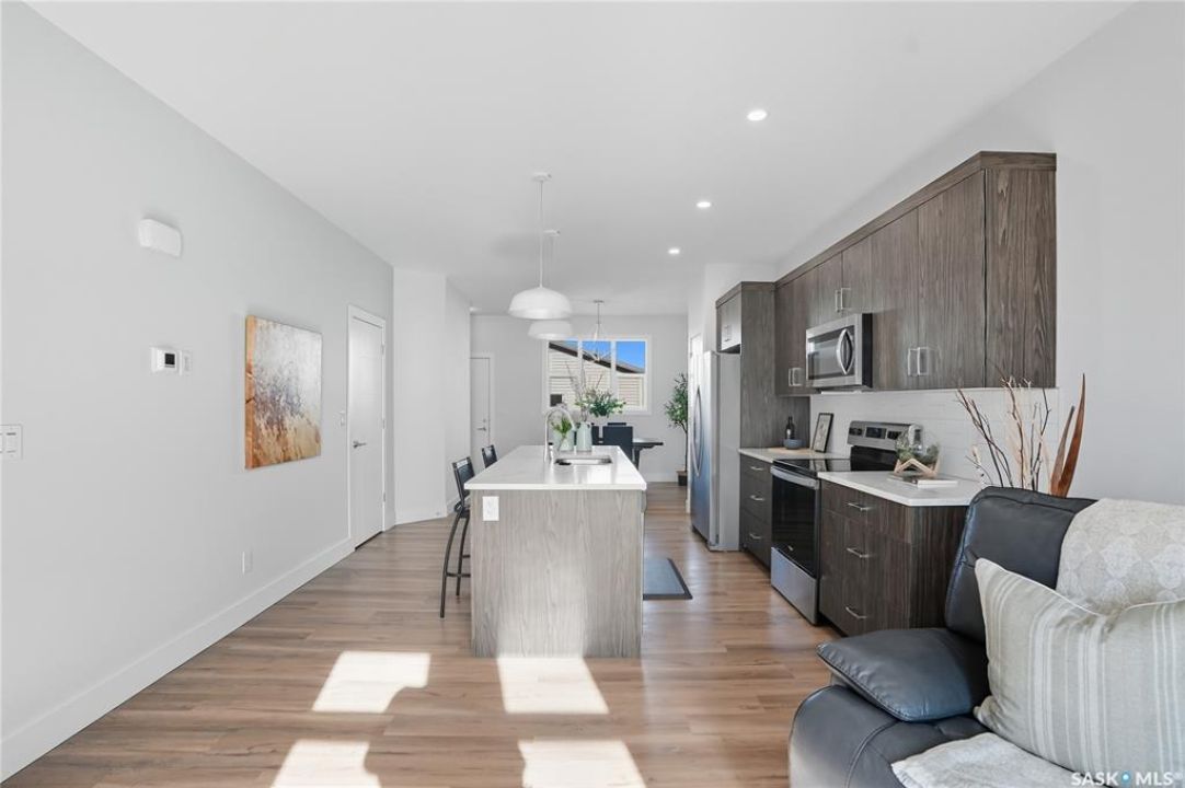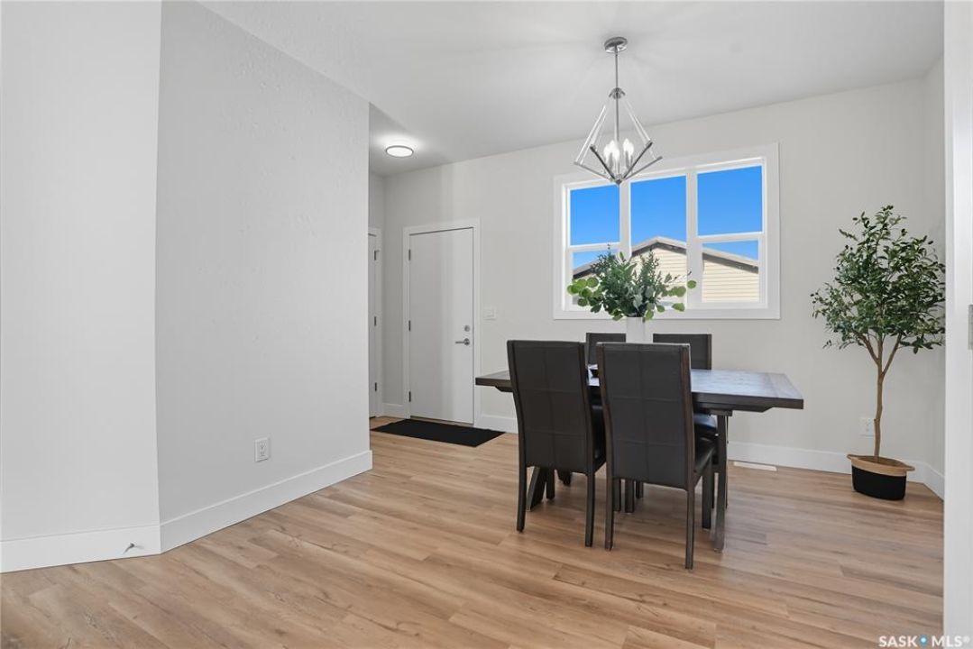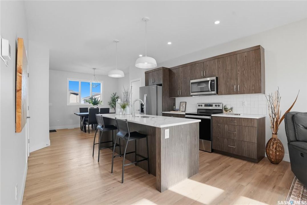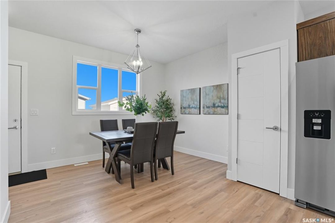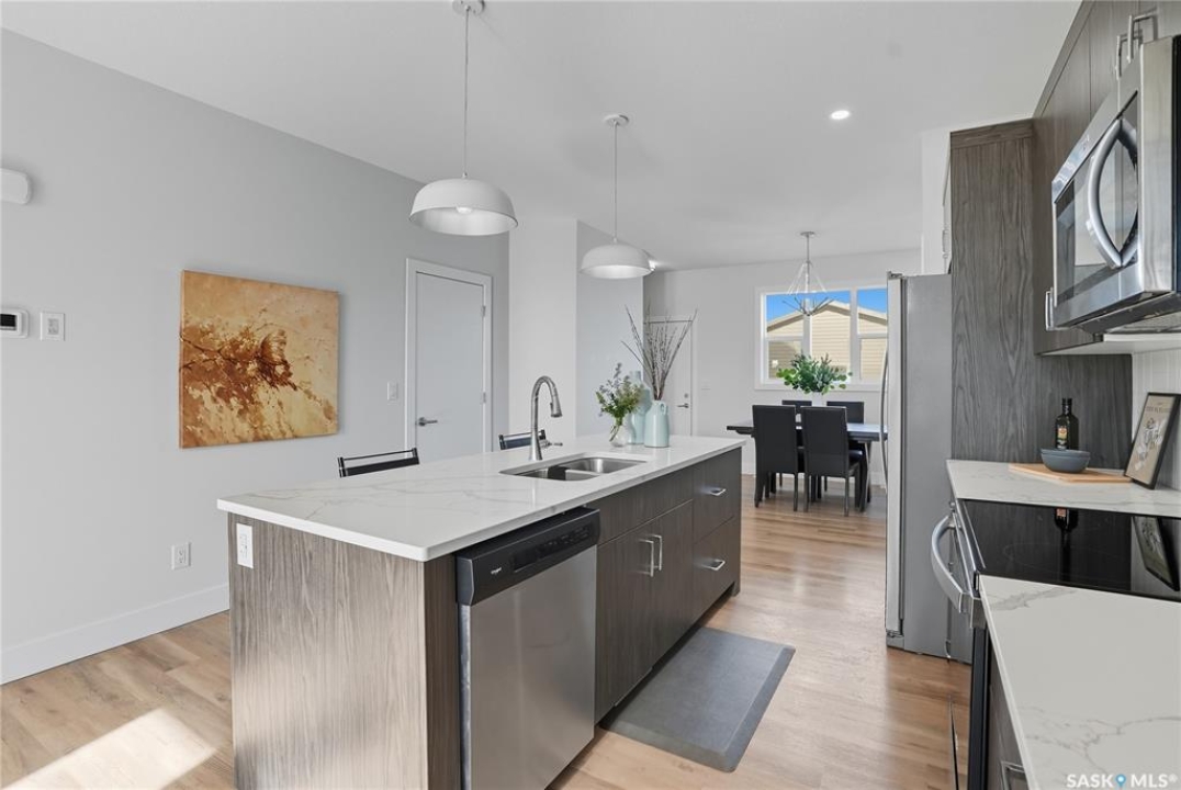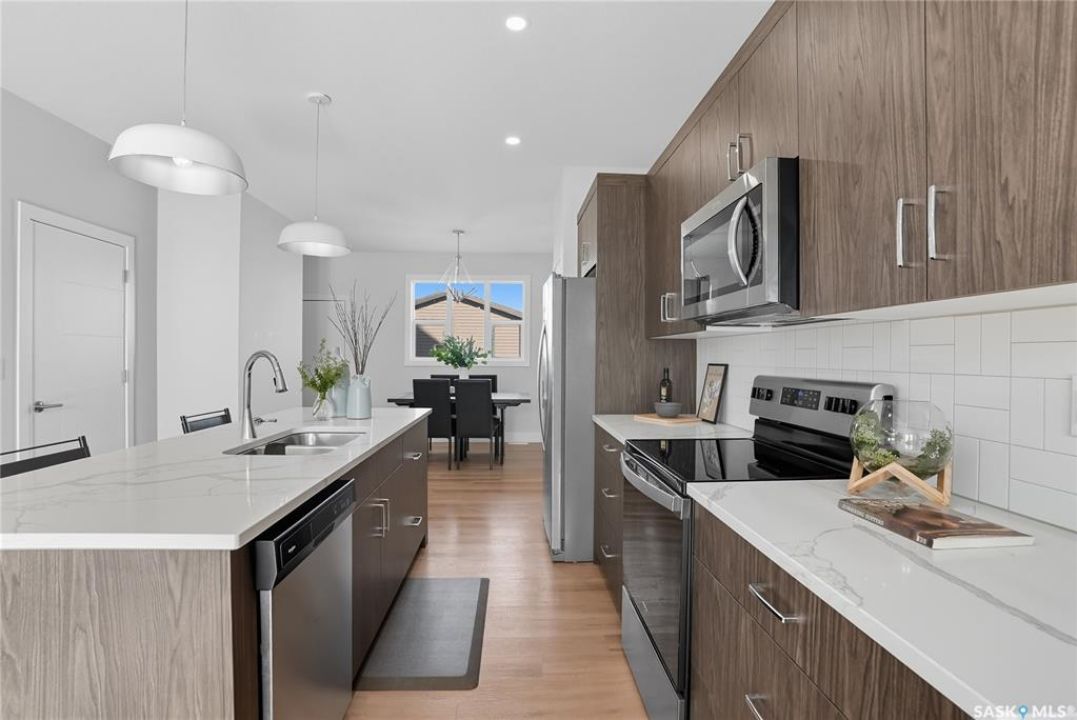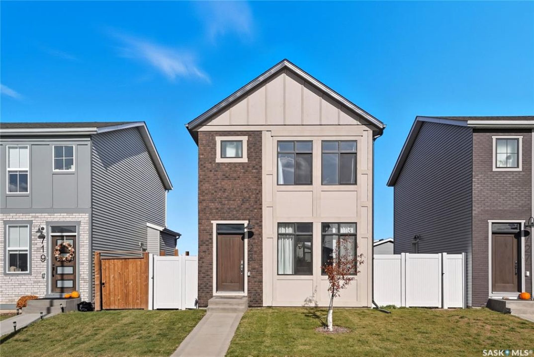Welcome to 723 Henry Dayday Road, a stunning two-storey home that blends modern design with everyday comfort. Flooded with natural light, this home offers an inviting open-concept layout perfect for both family living and entertaining. Step inside to a stylish foyer with built-in bench seating that leads into the bright living room and contemporary kitchen, featuring quartz countertops, soft-close cabinetry, stainless steel appliances, and a large island with seating. The adjoining dining area offers the perfect gathering space, while a convenient two-piece powder room completes the main floor. Upstairs, you'll find three spacious bedrooms, a full bathroom, and laundry for added convenience. The primary suite is a true retreat with a generous walk-in closet and an ensuite boasting dual vanities and a walk-in shower. A separate side entrance offers excellent potential for a future basement suite, ideal for guests or added income. Outside, enjoy a fully landscaped front yard with underground sprinklers, a fenced backyard, a back deck with natural gas BBQ hookup, and two car detached garage. Located in Aspen Ridge, one of Saskatoon's most desirable new communities with quick access to amenities and the Chief Mistawasis Bridge.