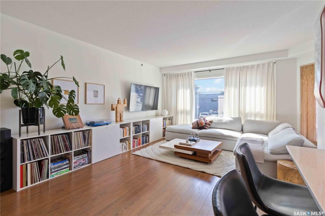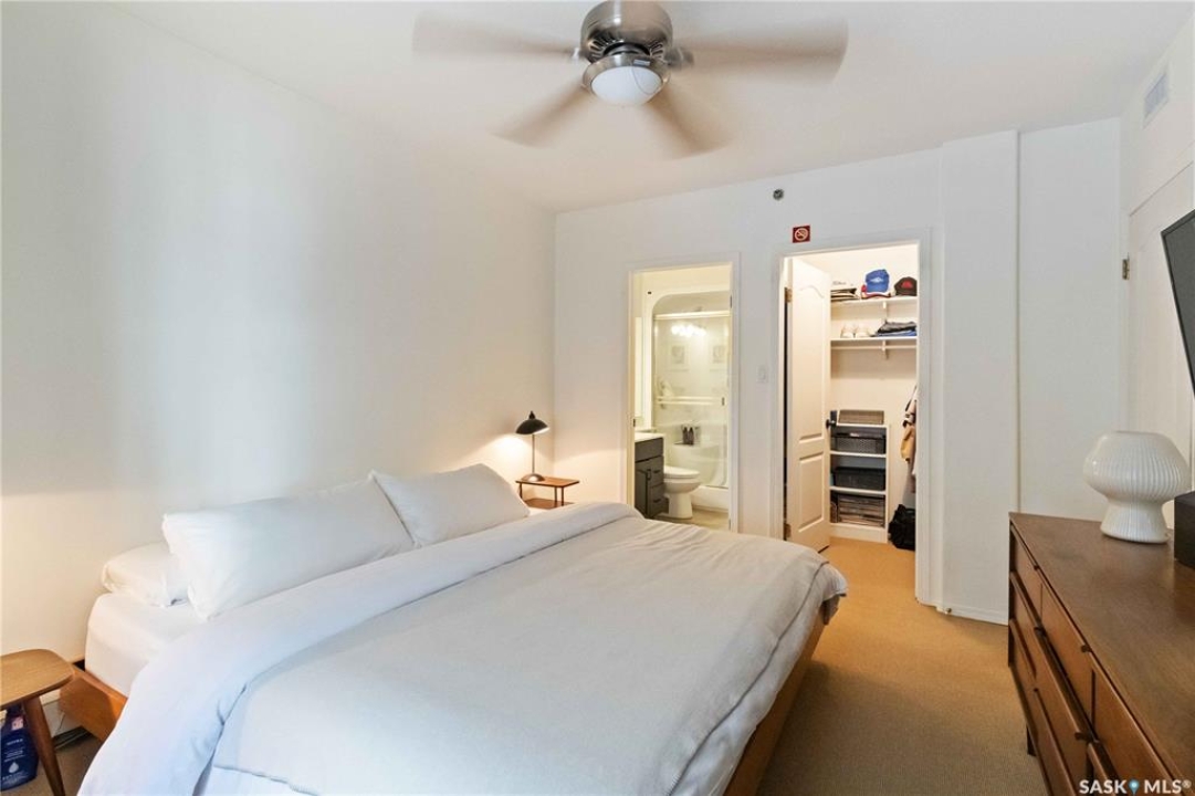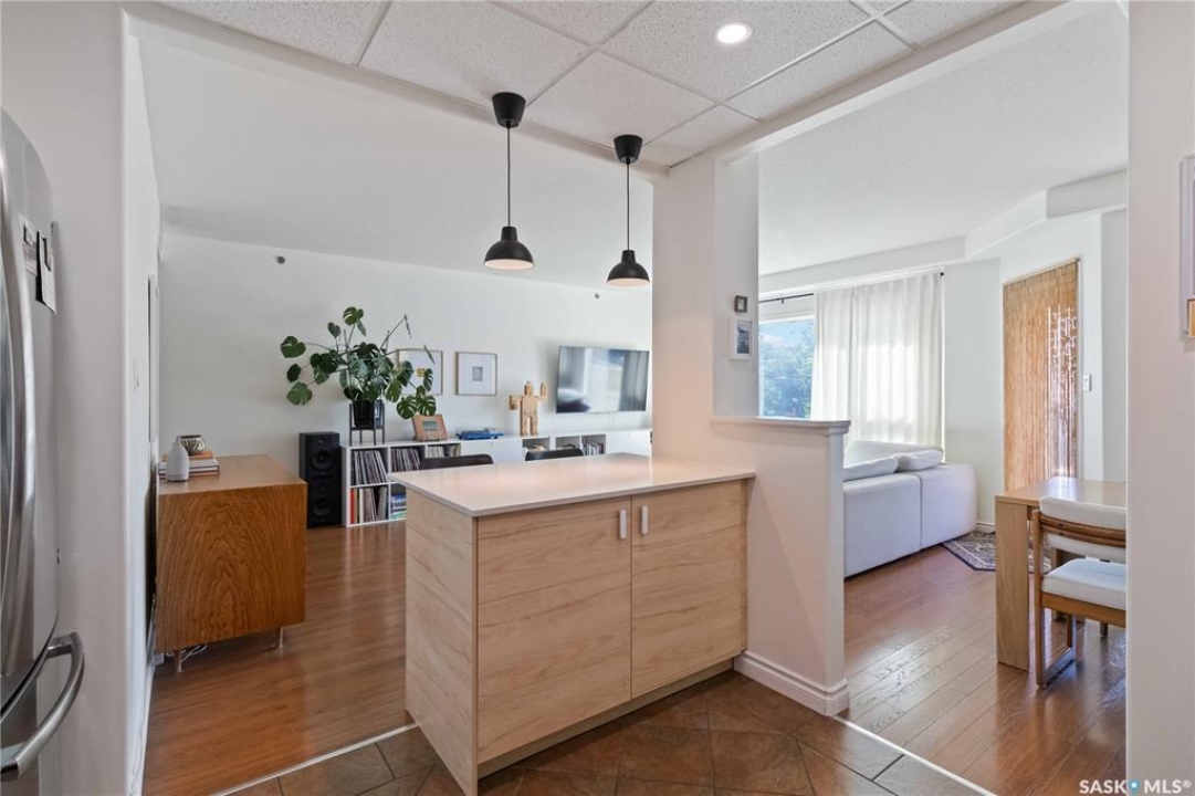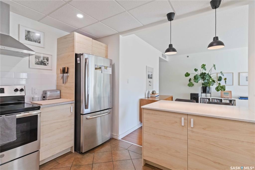 This condo is located on the first floor, with easy elevator access. Inside, you're greeted by a bright and spacious entryway. The unit offers an open-concept living and kitchen area. The kitchen stands out with its quartz-topped island, modern Scandinavian-inspired cabinetry, tiled backsplash, sleek pot lighting, stainless steel appliances. Just off the dining space, you'll find a private west-facing balcony with a BBQ hookup—perfect for enjoying sunny afternoons and glowing evening sunsets. The living room is generously sized, featuring large windows that fill the space with natural light. The primary bedroom includes a full ensuite with a walk-in shower, while the second bedroom (currently used as an office) sits adjacent to the main bath with tub/shower combo. Additional highlights include in-suite laundry, central air conditioning, and the convenience of having the laundry room tucked away near the entry. Recent Chg: 09/22/2025 : NEW : ->A