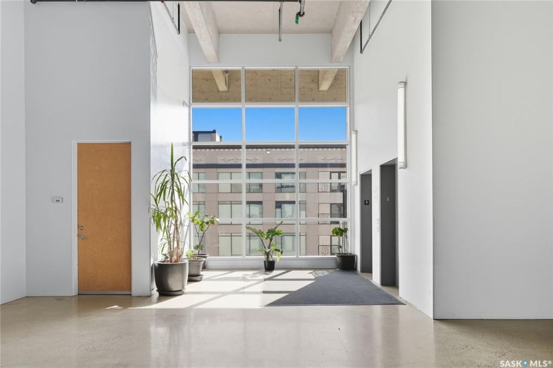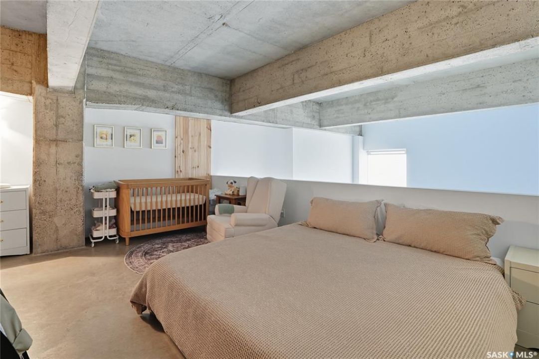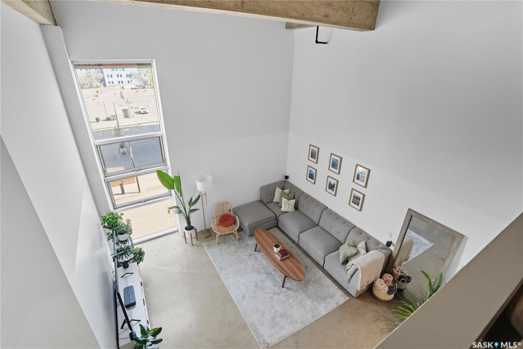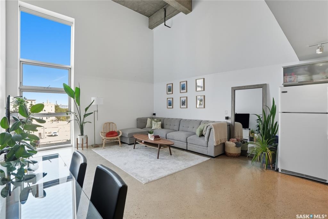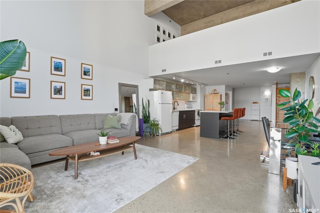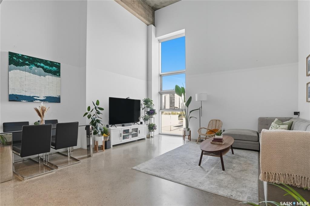 Welcome to this stunning East-facing loft located in the heart of Saskatoon's Central Business District. With 1,100 square feet of free-flowing living space, this 1-bedroom, 1.5-bath unit combines industrial charm with modern finishes, offering the perfect balance of comfort, style, and urban convenience. Soaring ceilings and a large window floods the space with natural light, enhancing the airy, open-concept layout. The kitchen has been beautifully upgraded with new quartz countertops and an oversized island—ideal for both entertaining and everyday living. The spacious living and dining areas flow effortlessly, creating a versatile space for relaxing or hosting. The large bedroom features a 4-piece ensuite, while a separate half-bath adds convenience for guests. Located directly across from the buildings fitness centre and rooftop terrace access, this unit offers unmatched access to some of the building's best amenities. The building itself is a standout in downtown living, with a modern lobby, rooftop terrace complete with a pergola-covered BBQ area, fitness centre, elevator, and heated underground parking. Live just steps from some of Saskatoon's best restaurants, coffee shops, shopping, nightlife, and the riverbank. Whether you're a professional looking for a stylish downtown home or an investor seeking a high-demand location, this loft offers exceptional value and a lifestyle that's hard to beat.
