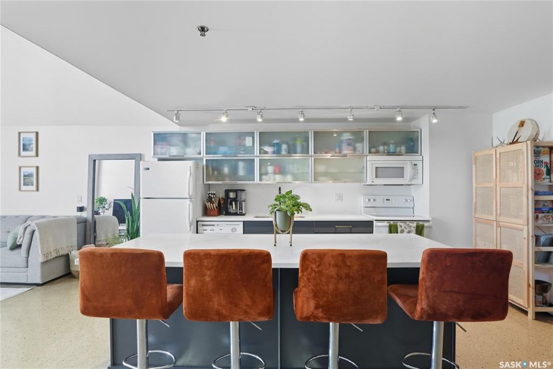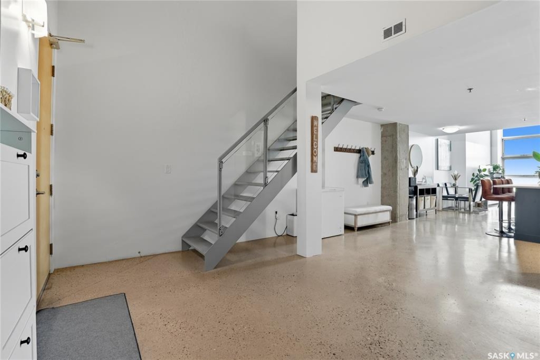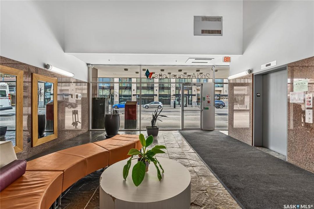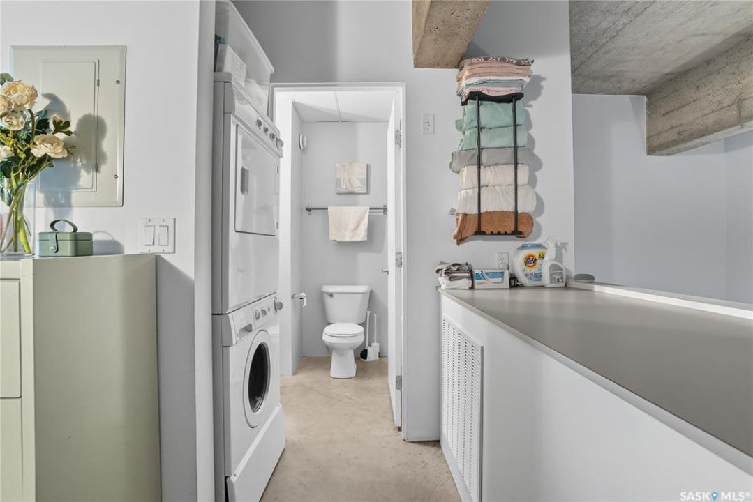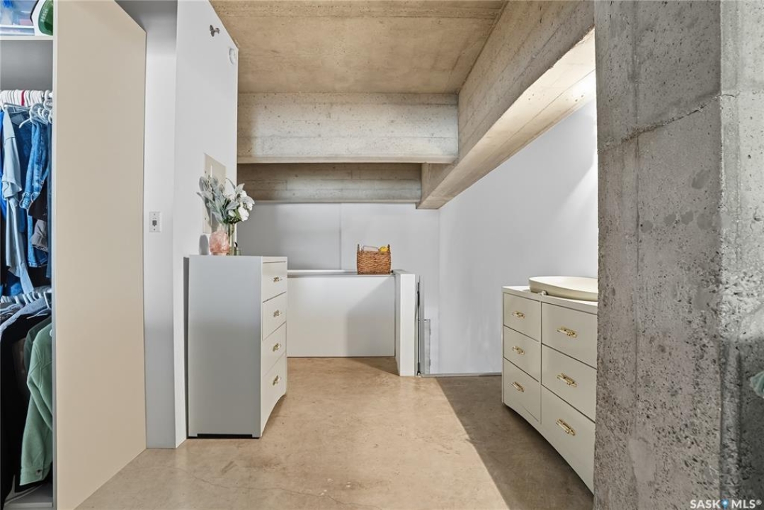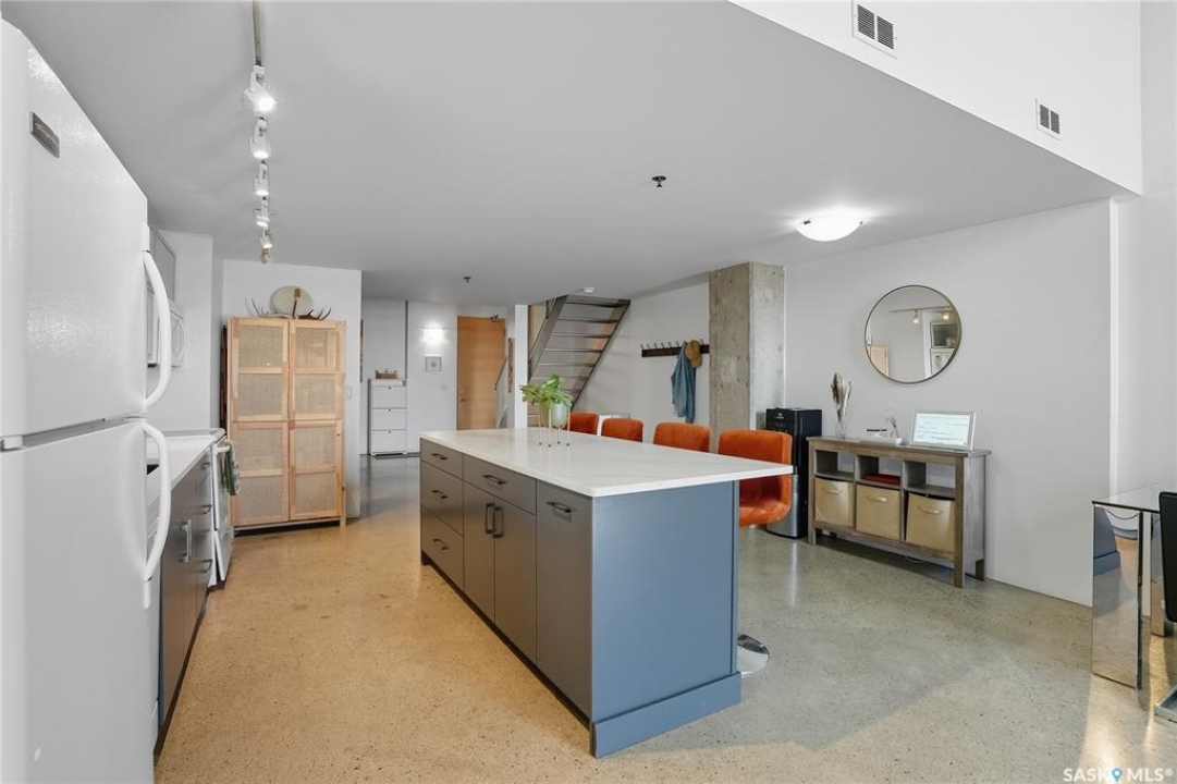 Welcome to this stunning East-facing loft located in the heart of Saskatoon's Central Business District. With 1,100 square feet of free-flowing living space, this 1-bedroom, 1.5-bath unit combines industrial charm with modern finishes, offering the perfect balance of comfort, style, and urban convenience. Soaring ceilings and a large window floods the space with natural light, enhancing the airy, open-concept layout. The kitchen has been beautifully upgraded with new quartz countertops and an oversized island—ideal for both entertaining and everyday living. The spacious living and dining areas flow effortlessly, creating a versatile space for relaxing or hosting. The large bedroom features a 4-piece ensuite, while a separate half-bath adds convenience for guests. Located directly across from the buildings fitness centre and rooftop terrace access, this unit offers unmatched access to some of the building's best amenities. The building itself is a standout in downtown living, with a modern lobby, rooftop terrace complete with a pergola-covered BBQ area, fitness centre, elevator, and heated underground parking. Live just steps from some of Saskatoon's best restaurants, coffee shops, shopping, nightlife, and the riverbank. Whether you're a professional looking for a stylish downtown home or an investor seeking a high-demand location, this loft offers exceptional value and a lifestyle that's hard to beat.