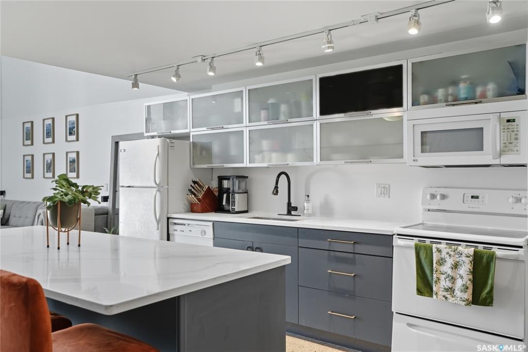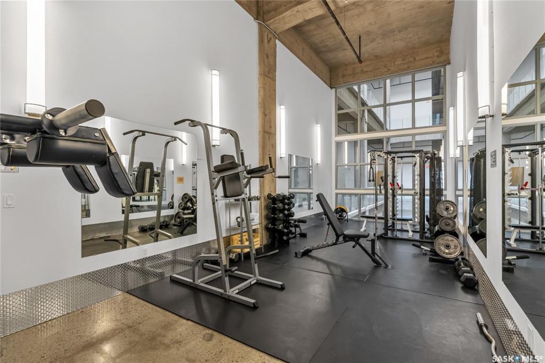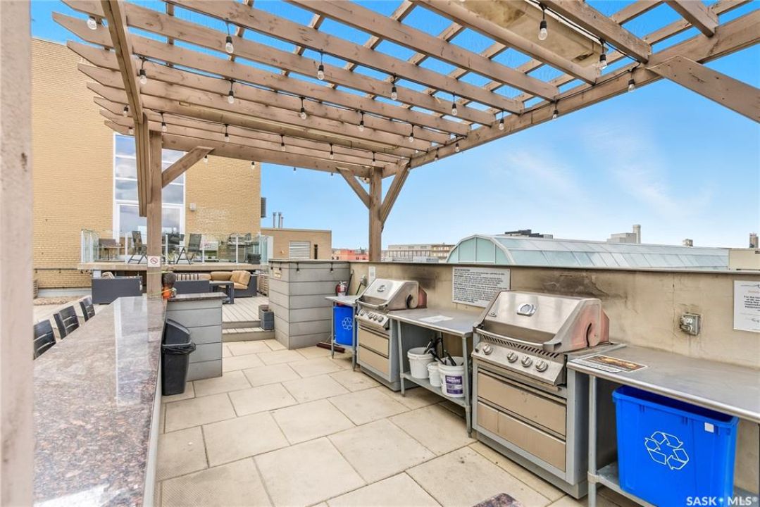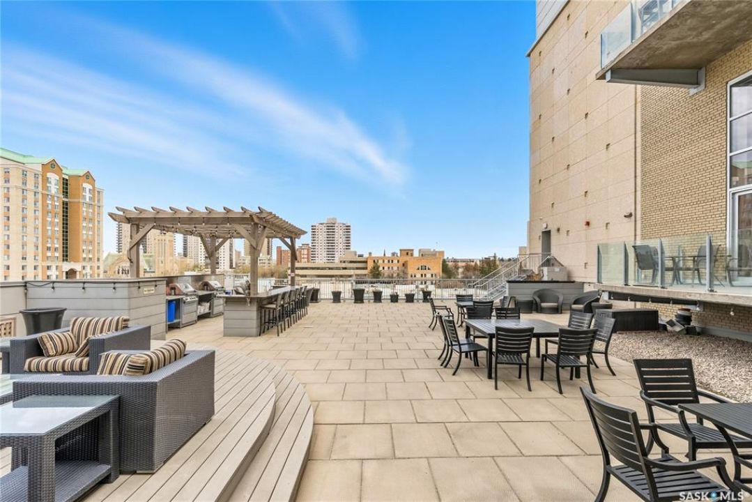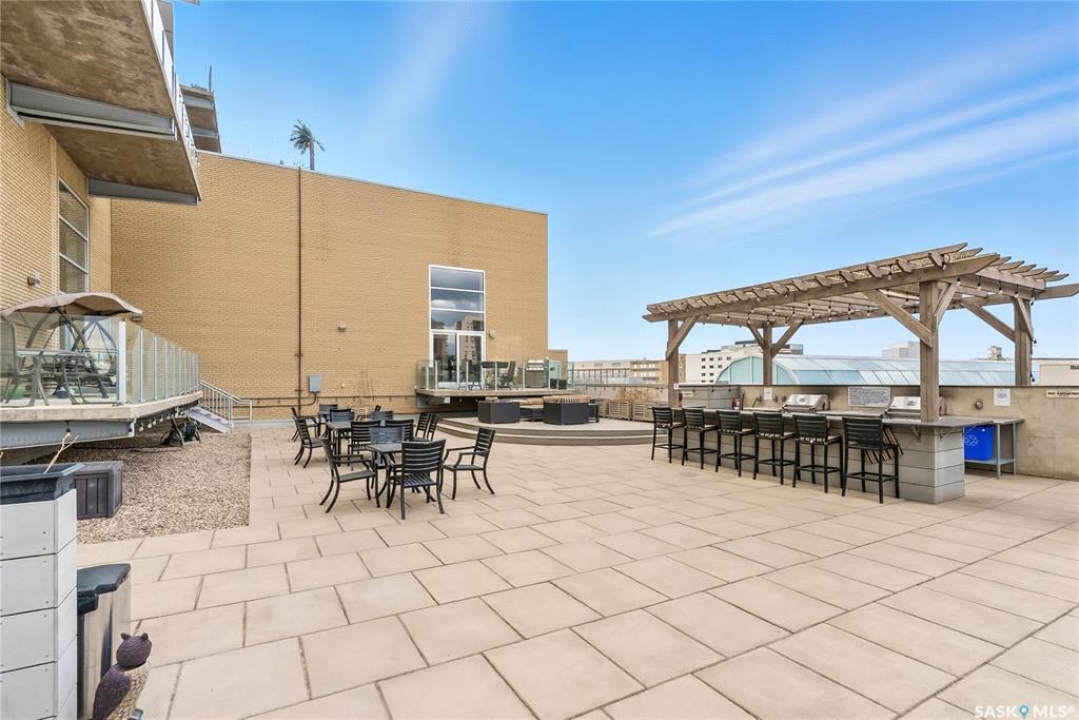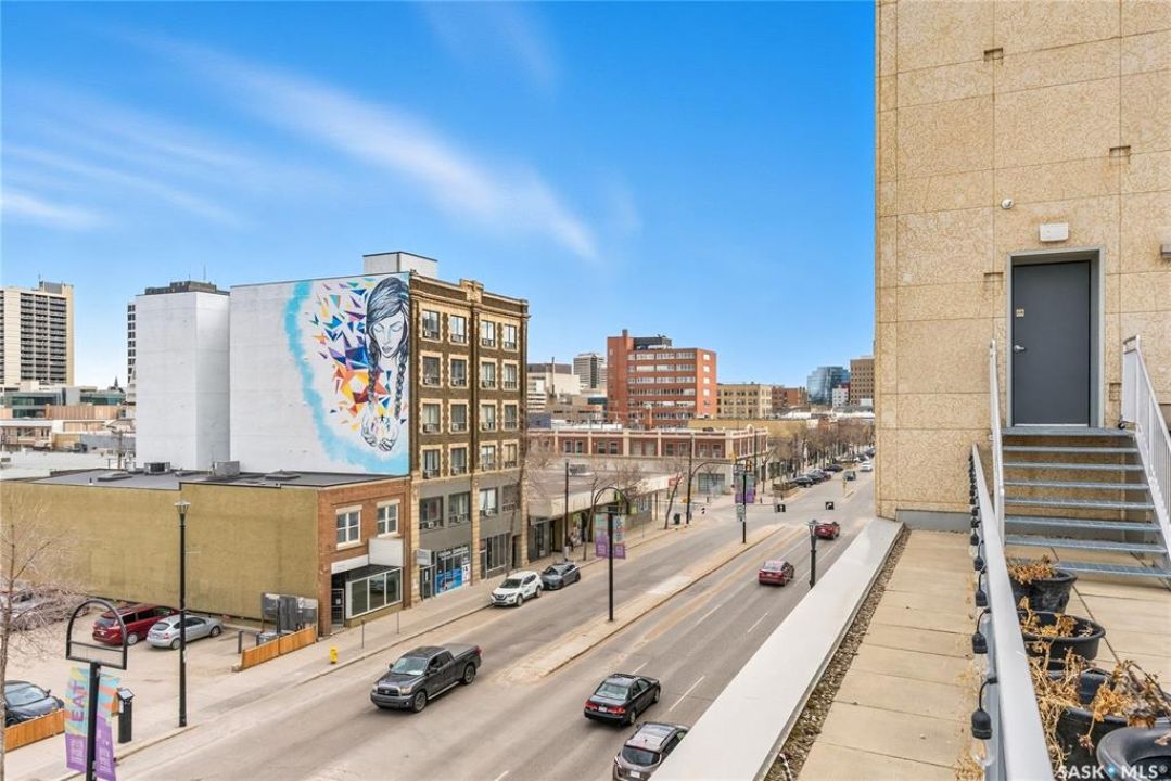 Welcome to this stunning East-facing loft located in the heart of Saskatoon's Central Business District. With 1,100 square feet of free-flowing living space, this 1-bedroom, 1.5-bath unit combines industrial charm with modern finishes, offering the perfect balance of comfort, style, and urban convenience. Soaring ceilings and a large window floods the space with natural light, enhancing the airy, open-concept layout. The kitchen has been beautifully upgraded with new quartz countertops and an oversized island—ideal for both entertaining and everyday living. The spacious living and dining areas flow effortlessly, creating a versatile space for relaxing or hosting. The large bedroom features a 4-piece ensuite, while a separate half-bath adds convenience for guests. Located directly across from the buildings fitness centre and rooftop terrace access, this unit offers unmatched access to some of the building's best amenities. The building itself is a standout in downtown living, with a modern lobby, rooftop terrace complete with a pergola-covered BBQ area, fitness centre, elevator, and heated underground parking. Live just steps from some of Saskatoon's best restaurants, coffee shops, shopping, nightlife, and the riverbank. Whether you're a professional looking for a stylish downtown home or an investor seeking a high-demand location, this loft offers exceptional value and a lifestyle that's hard to beat.