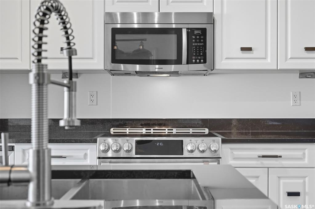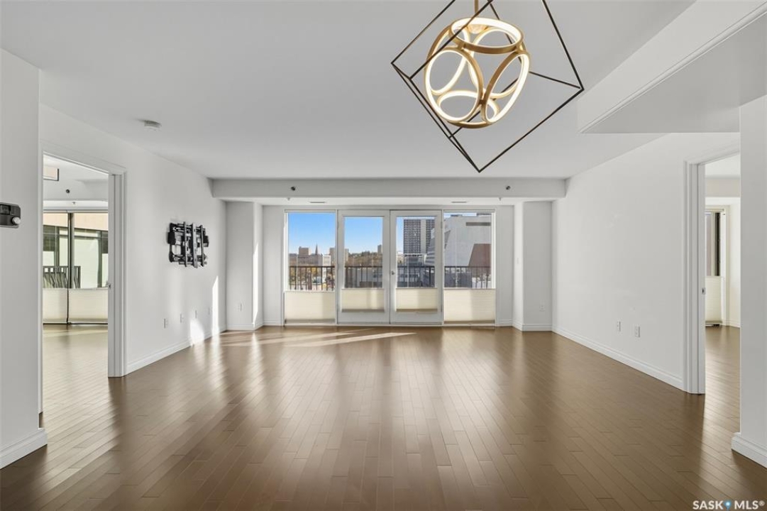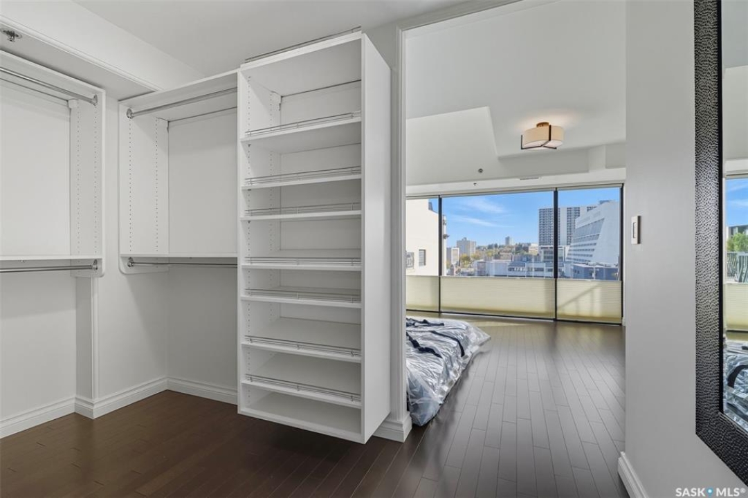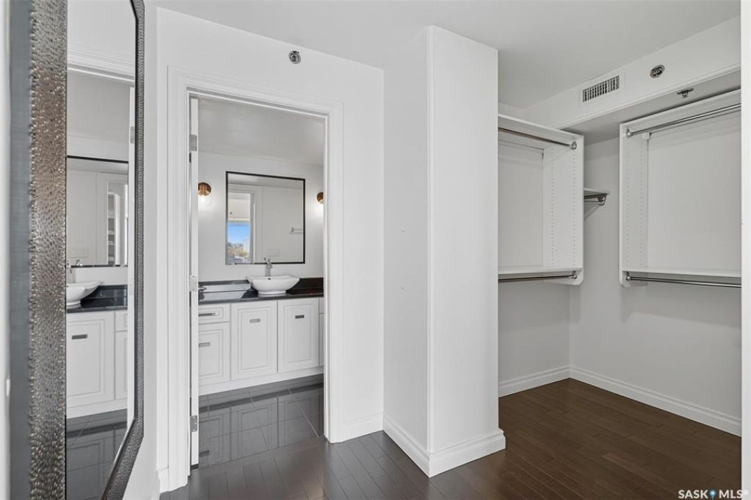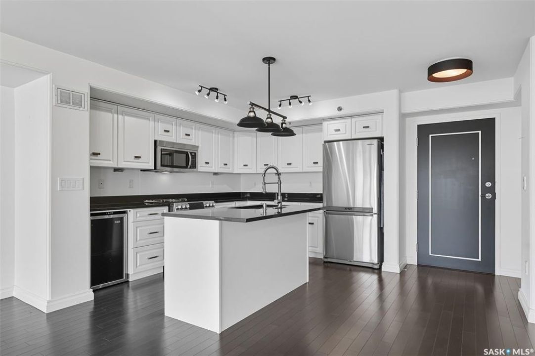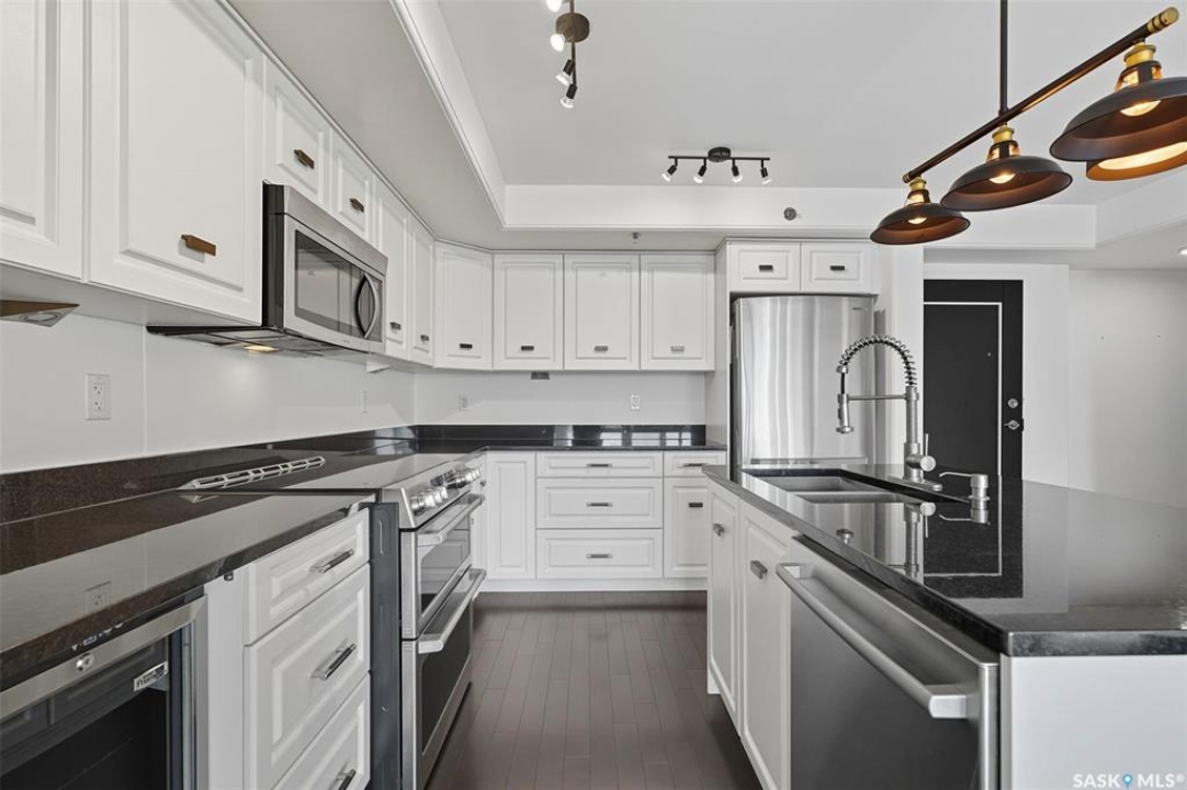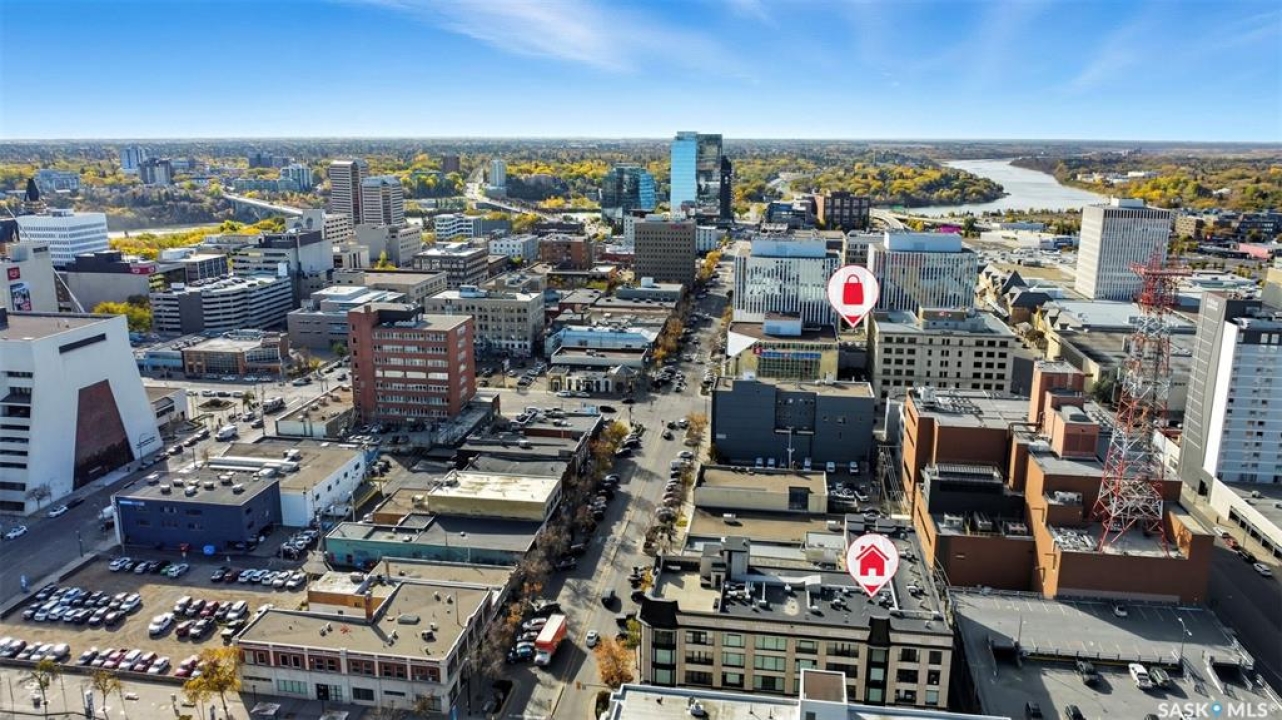 A Rare Opportunity to Own a Piece of Saskatoon's History! Welcome to The Residences at the King George — an iconic landmark originally built in 1911 and fully restored by Meridian Development in 2010. Reconstructed from its original concrete frame with all modern materials and mechanical systems, this award-winning building showcases a transitional French design that blends heritage and modern luxury. Historic details such as the original chandeliers, lobby monogrammed keystone, and ornate black powder-coated stair railings have been beautifully preserved. This stunning top floor corner unit offers a perfect mix of elegance, comfort, and security in the heart of downtown Saskatoon — steps from restaurants, shops, services, and nightlife. The high-security building features video surveillance and coded/fob access at all entry points. Inside, enjoy newer engineered hardwood flooring, floor-to-ceiling windows, and an East-facing balcony with city views. The designer kitchen includes granite countertops, ceiling-height cabinetry, large island with seating, dual undermount sinks, wine fridge, under-cabinet lighting, garburator, and premium appliances — including a GE Café induction range and Bosch dishwasher. Additional upgrades include modern lighting and hardware, Hunter Douglas blinds, Lutron Caseta smart lighting and smart thermostat.The luxurious bathrooms feature black granite tile flooring and oversized vanities. The spacious primary bedroom offers vaulted ceilings, a skylight, and custom built-in closets. Other highlights include in-suite laundry, central air, two heated underground parking stalls, and an 11' x 7' storage unit with street-style bike racks. Residents enjoy access to a beautiful rooftop patio with elevator service to the fifth floor and parkade — perfect for entertaining. All of this, just four blocks from the river!