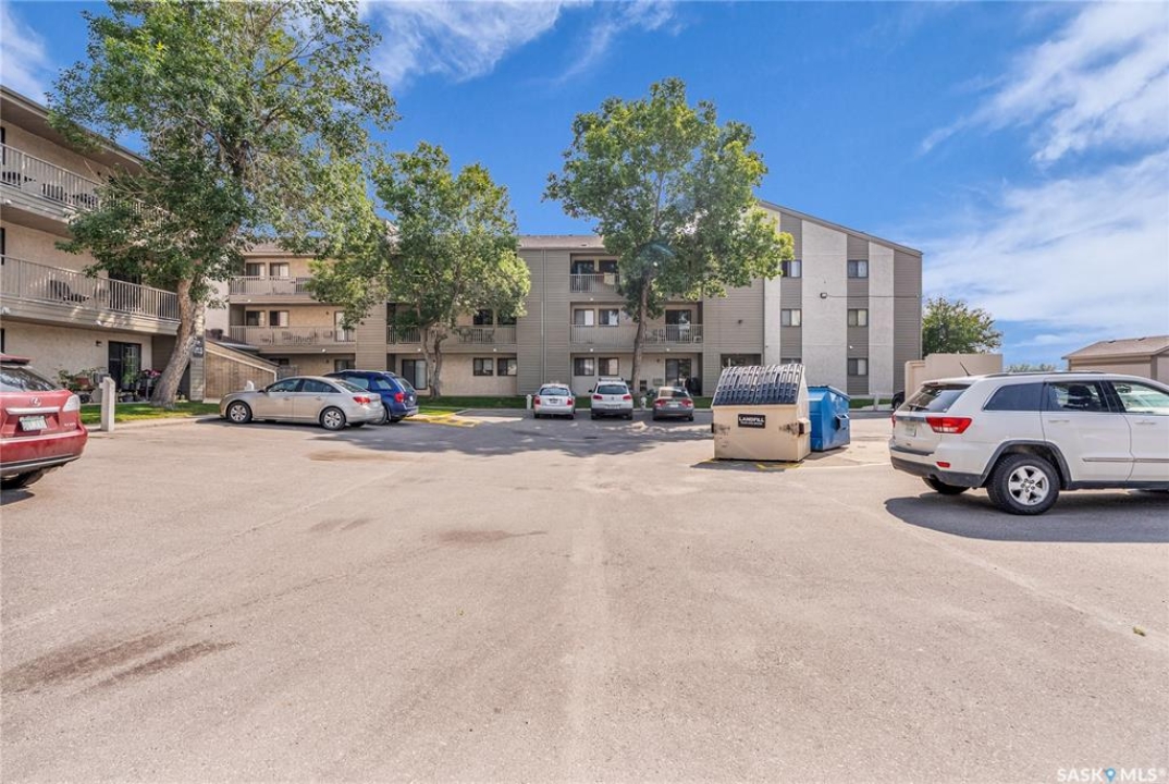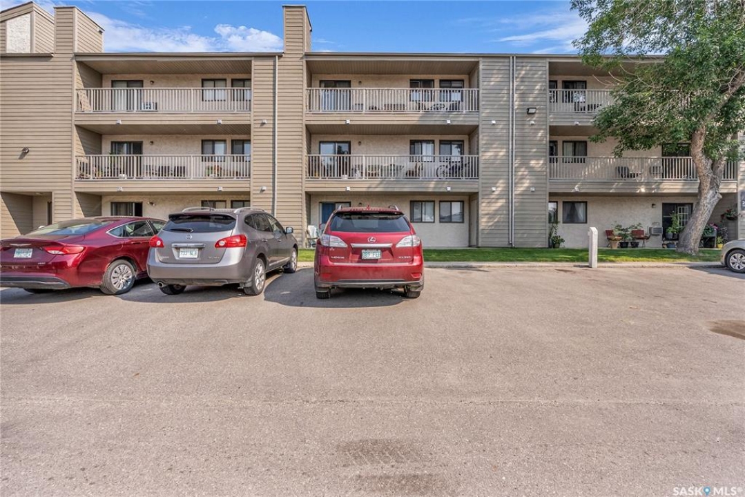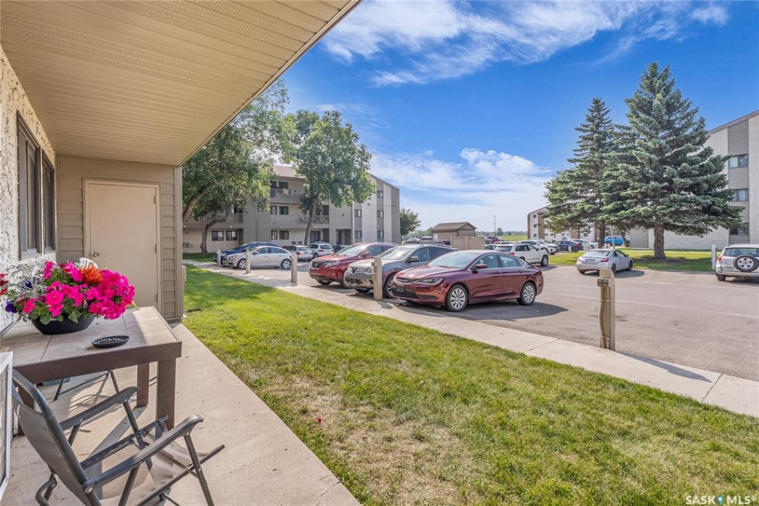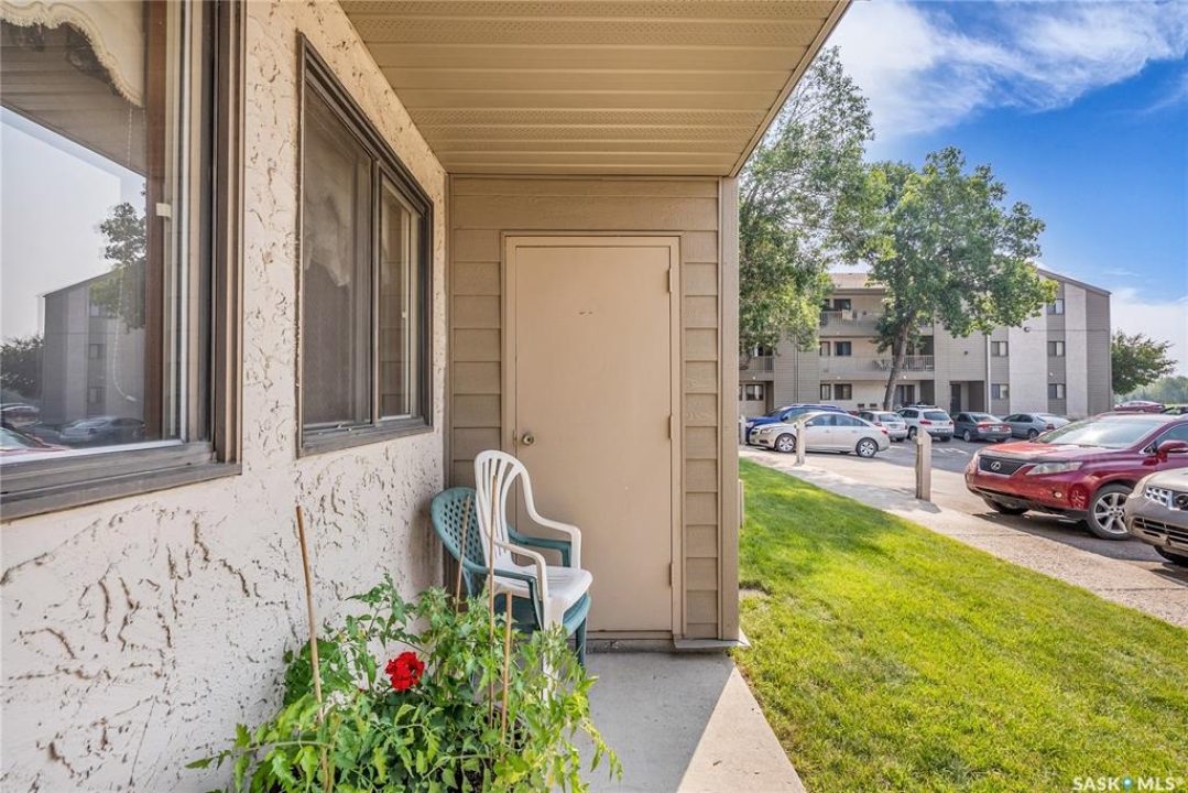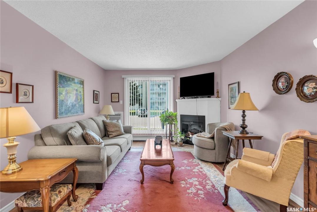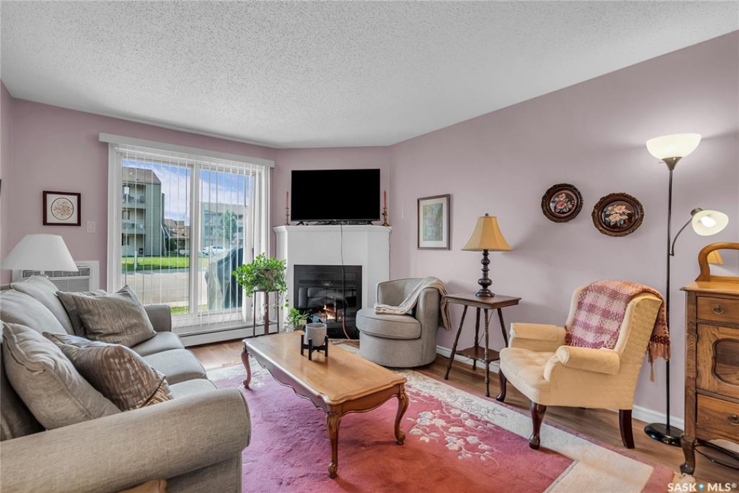 Beautifully maintained 2 bedroom corner unit located in a quiet complex. This bright and inviting condo features upgraded flooring and is conveniently located on the main floor. The functional layout offers two generously sized bedrooms and a full bathroom. There is a cozy living room with electric fireplace and the parking stall is right outside the door. Centrally located and close to grocery stores, parks, amenities and easy access to the U of S. Great value and move-in ready.