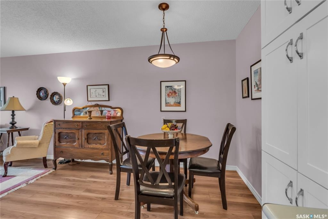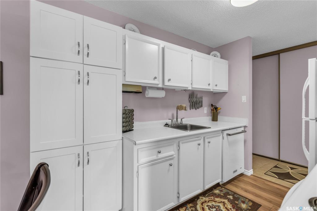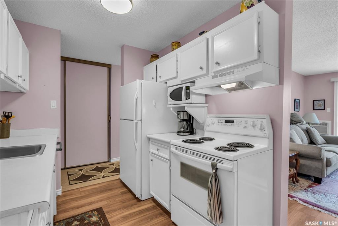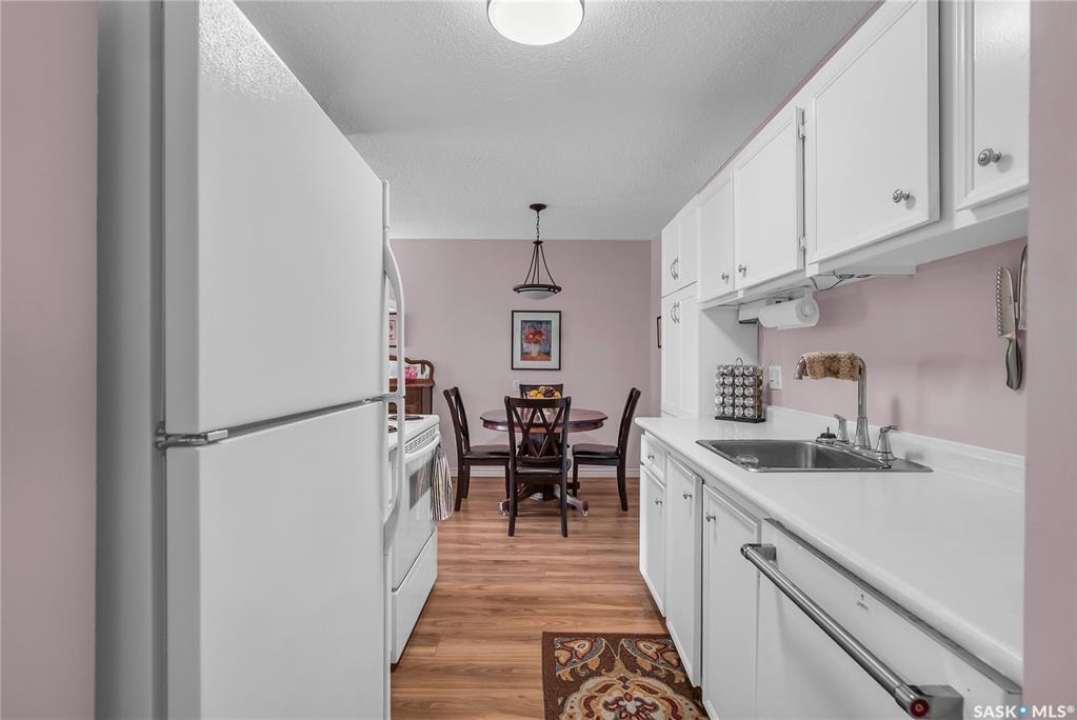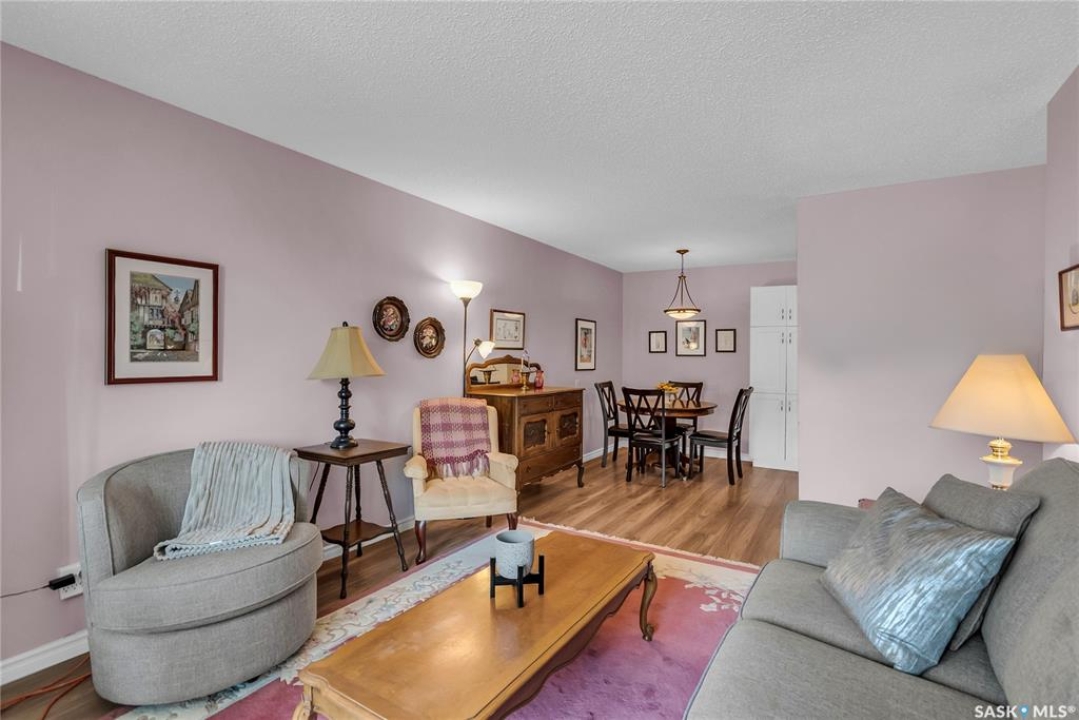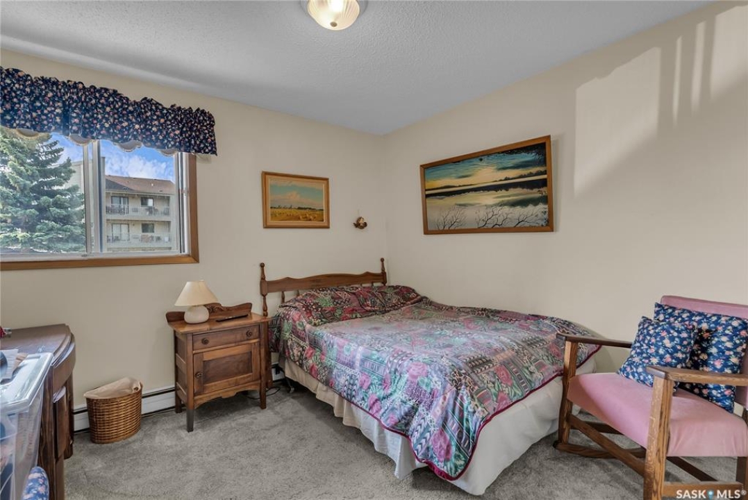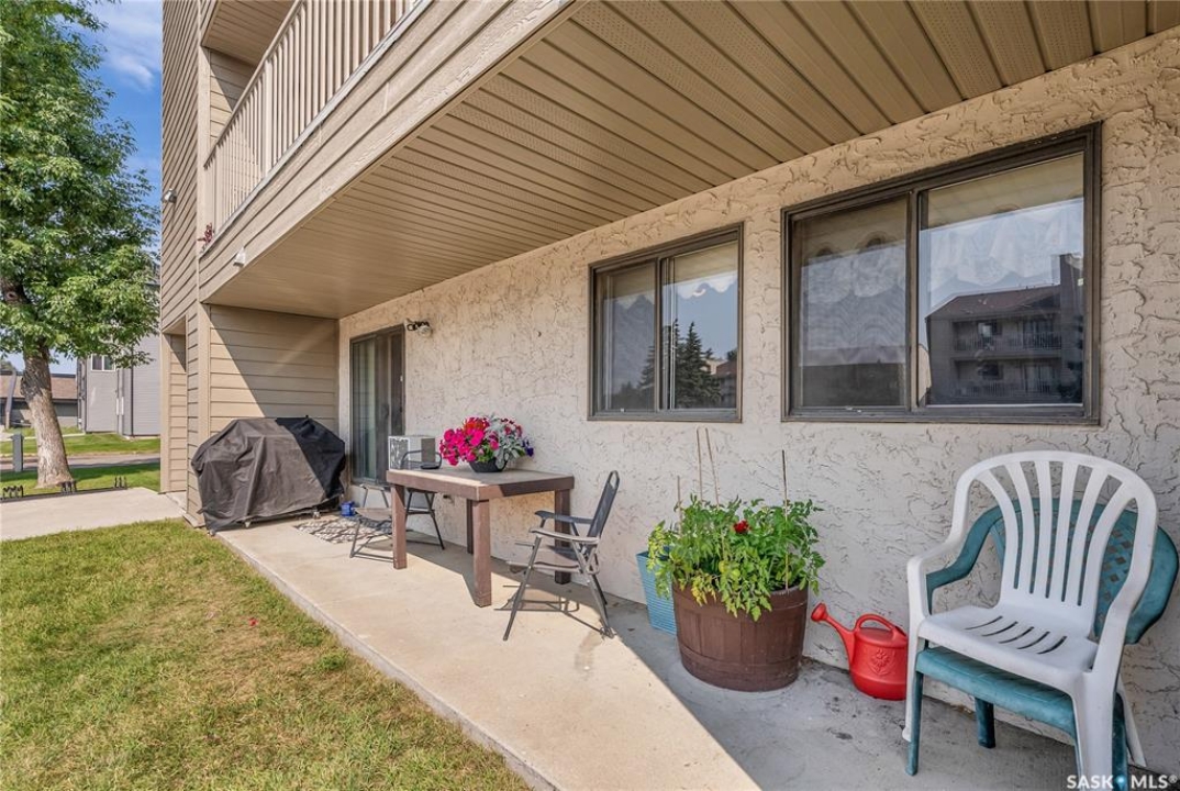 Beautifully maintained 2 bedroom corner unit located in a quiet complex. This bright and inviting condo features upgraded flooring and is conveniently located on the main floor. The functional layout offers two generously sized bedrooms and a full bathroom. There is a cozy living room with electric fireplace and the parking stall is right outside the door. Centrally located and close to grocery stores, parks, amenities and easy access to the U of S. Great value and move-in ready.