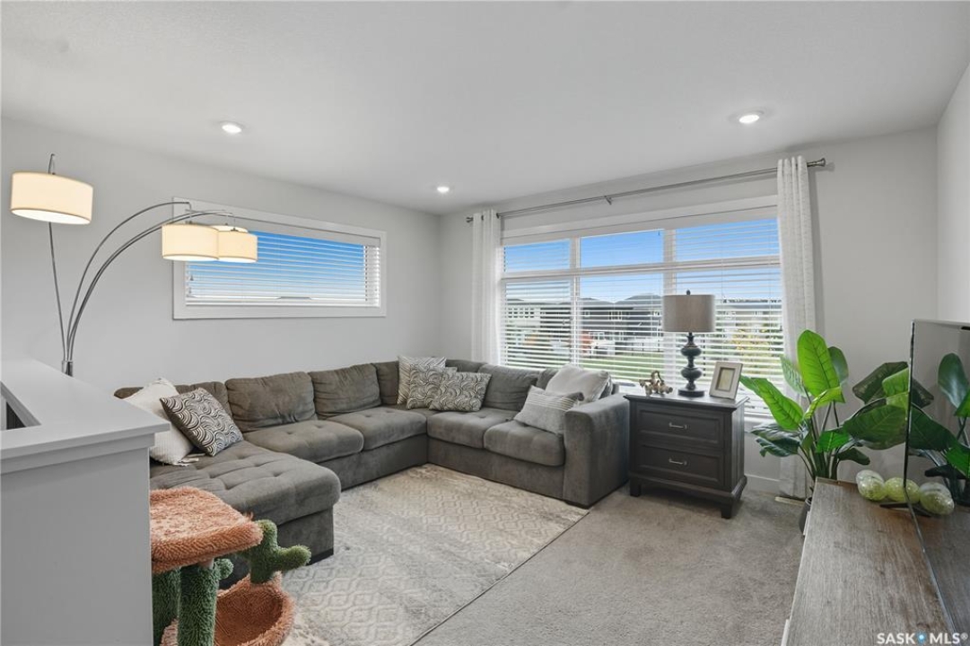 Welcome to 303 Dagnone Crescent—an exceptional former Daytona show home in the highly sought-after Brighton community. This stunning 2-storey residence offers 2,287 sq. ft. of thoughtfully designed living space on a desirable corner lot, facing a beautiful walking trail and steps from parks, the Brighton Child Care Centre, and the vibrant community shopping hub. Its modern exterior features vinyl siding with stone accents and a fully finished triple-staggered garage, complete with in-floor heat, built-in speakers, a home gym with mirror, and included TVs—perfect for both hobbyists and fitness enthusiasts. Inside, the 9-ft main floor impresses with a spacious foyer, open-concept living and dining areas, and a chef's kitchen boasting quartz countertops, soft-close cabinetry, stainless steel Samsung appliances, a walk-through pantry, and a wet bar with wine cooler. Upstairs, enjoy a bright bonus room with trail views, a luxurious primary suite featuring an electric fireplace, a spa-like 5-pc ensuite with double vanity, soaker tub, and tiled shower, plus two generous bedrooms and a convenient laundry room with cabinetry. The professionally finished basement continues the show-home standard with a versatile glass-walled office/bedroom and an entertainment-ready theatre room complete with three TVs, speakers, projector, and screen. A second wet bar, full bathroom, and ample utility upgrades ensure comfort and convenience year-round. With nearly every detail considered—from high-end finishes to abundant natural light and scenic surroundings—this home perfectly combines style, functionality, and location. All furniture is negotiable, and all wall decorative artworks are included. Most items are available for purchase. Don't miss the opportunity to own one of Brighton's finest properties, where every feature reflects quality craftsmanship and modern living at its best.